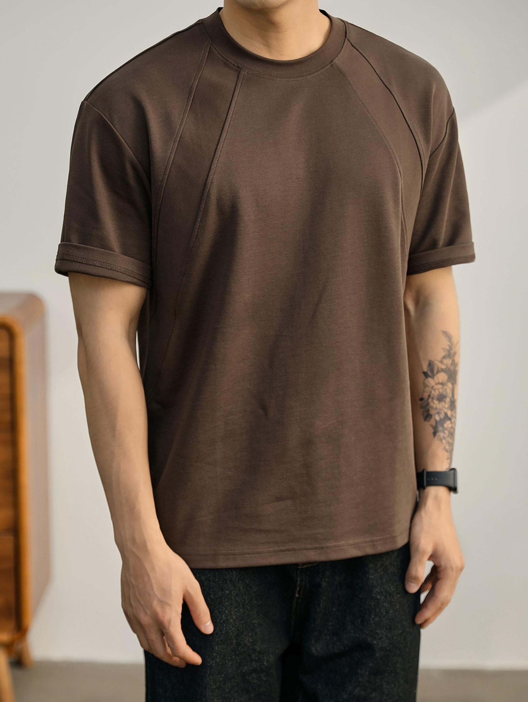 男夏季休閒款T恤上衣撞色捲袖解構分割線設計圓領短袖