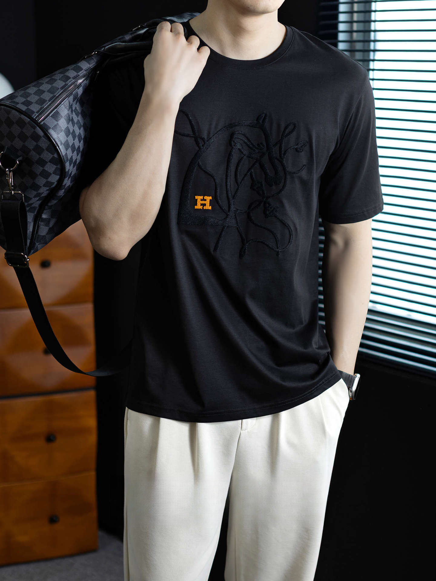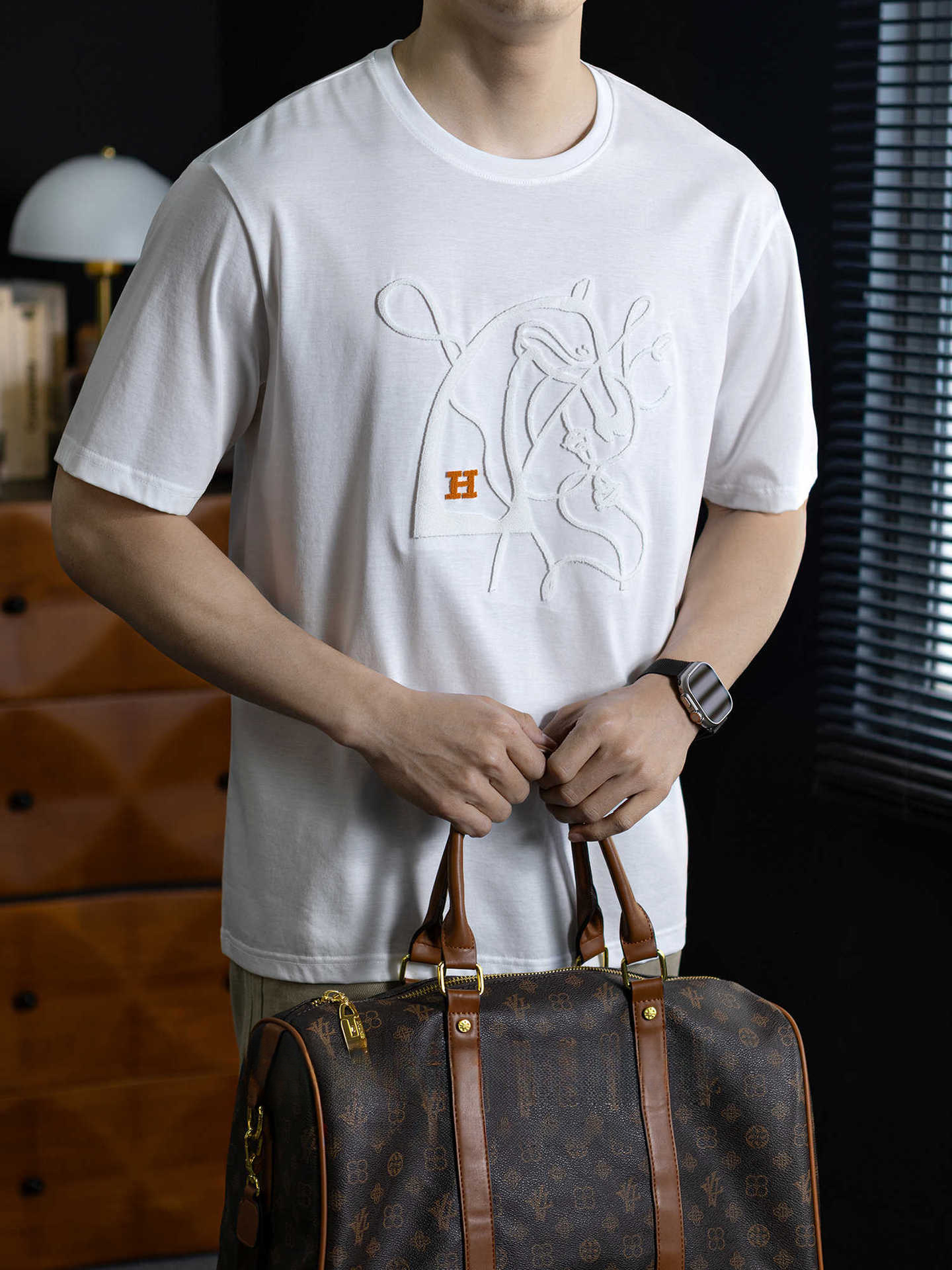 【桑蠶絲&長絨棉】馬頭燙花設計涼感短袖t桖男夏季輕薄透氣體恤衫