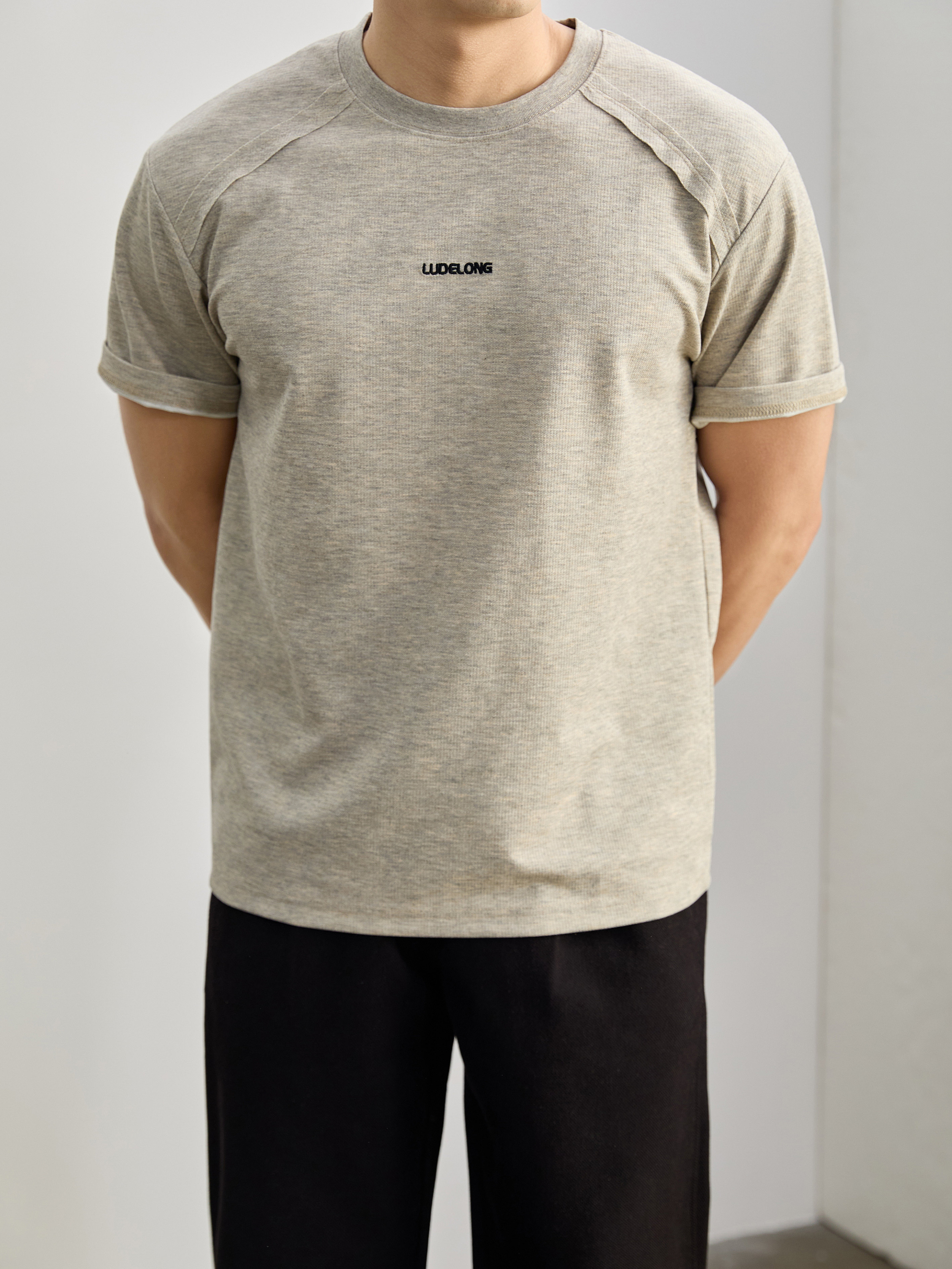 男夏季休閒款T恤上衣撞色捲袖解構分割線設計圓領短袖