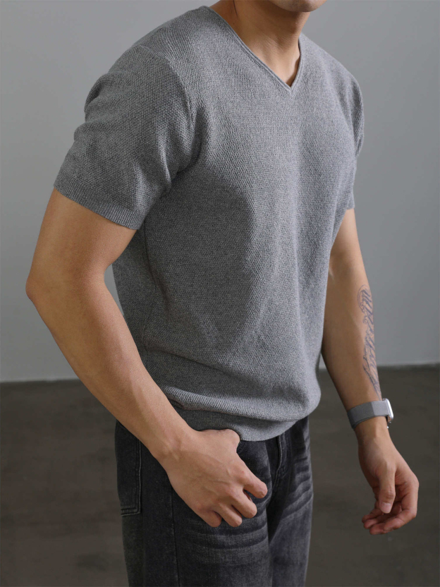 新款韓版氣質感V領體恤衫夏季針織短袖透氣潮流簡約T恤男款