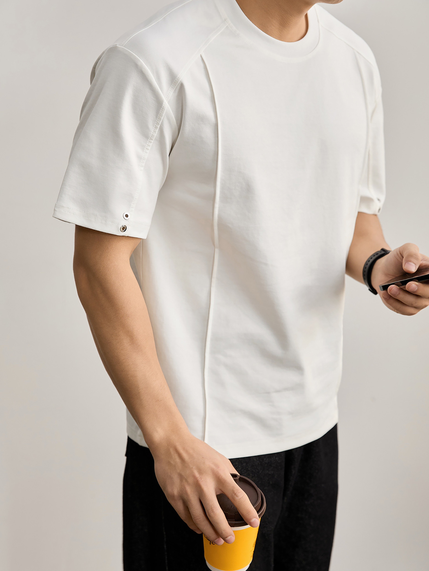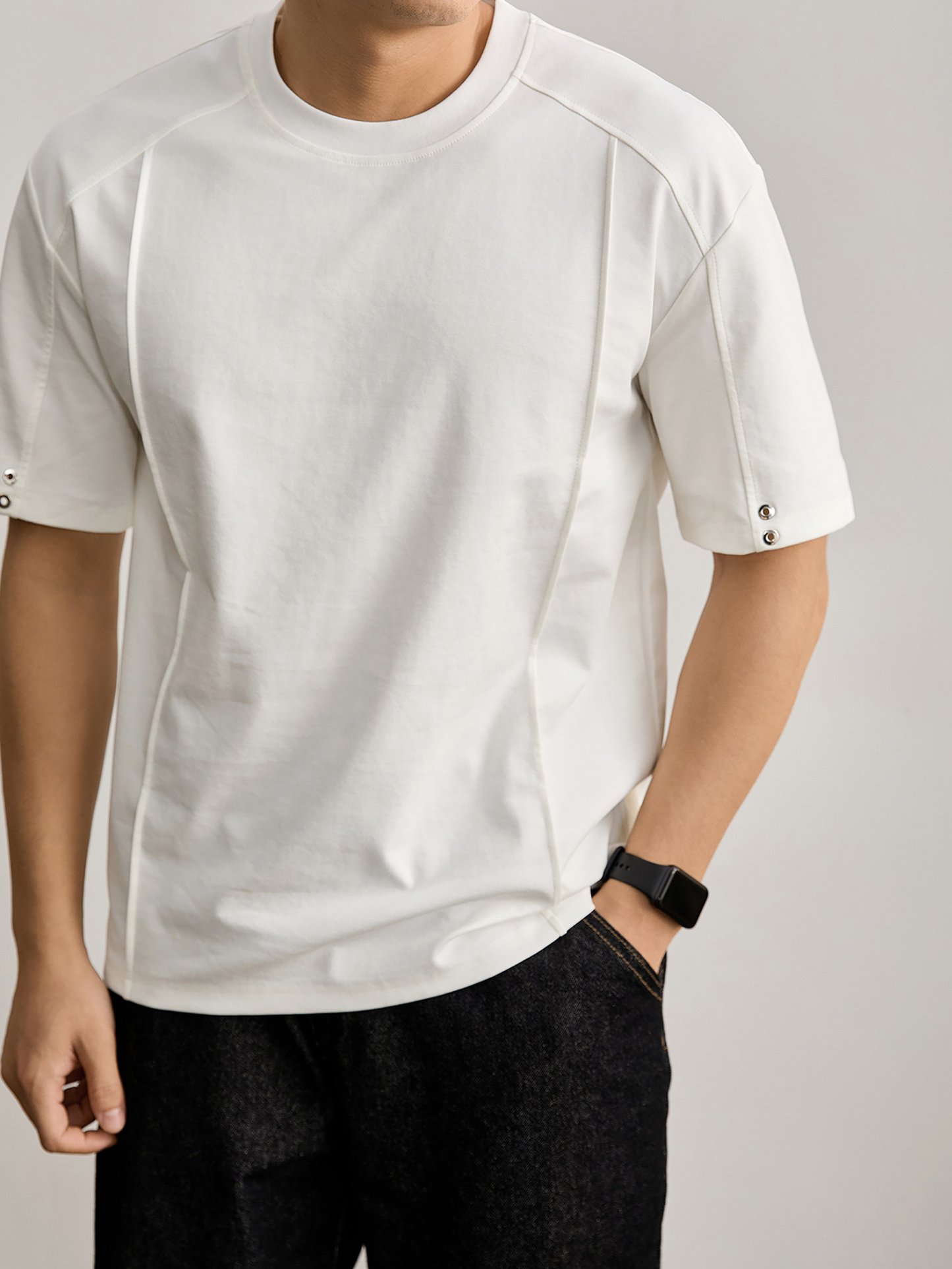Stylish and versatile deconstructed design crew neck short-sleeved T-shirt for men, summer style, studded embellished slightly oversized pullover top.