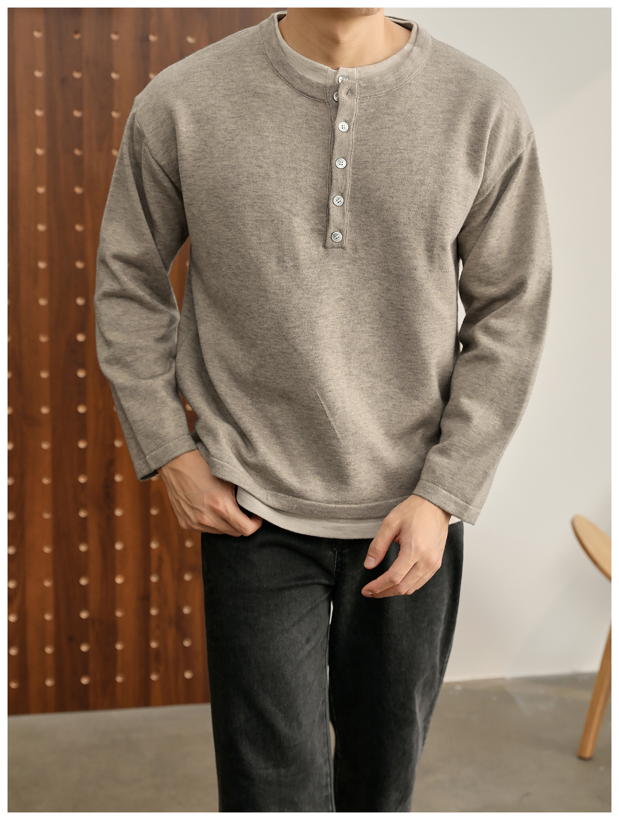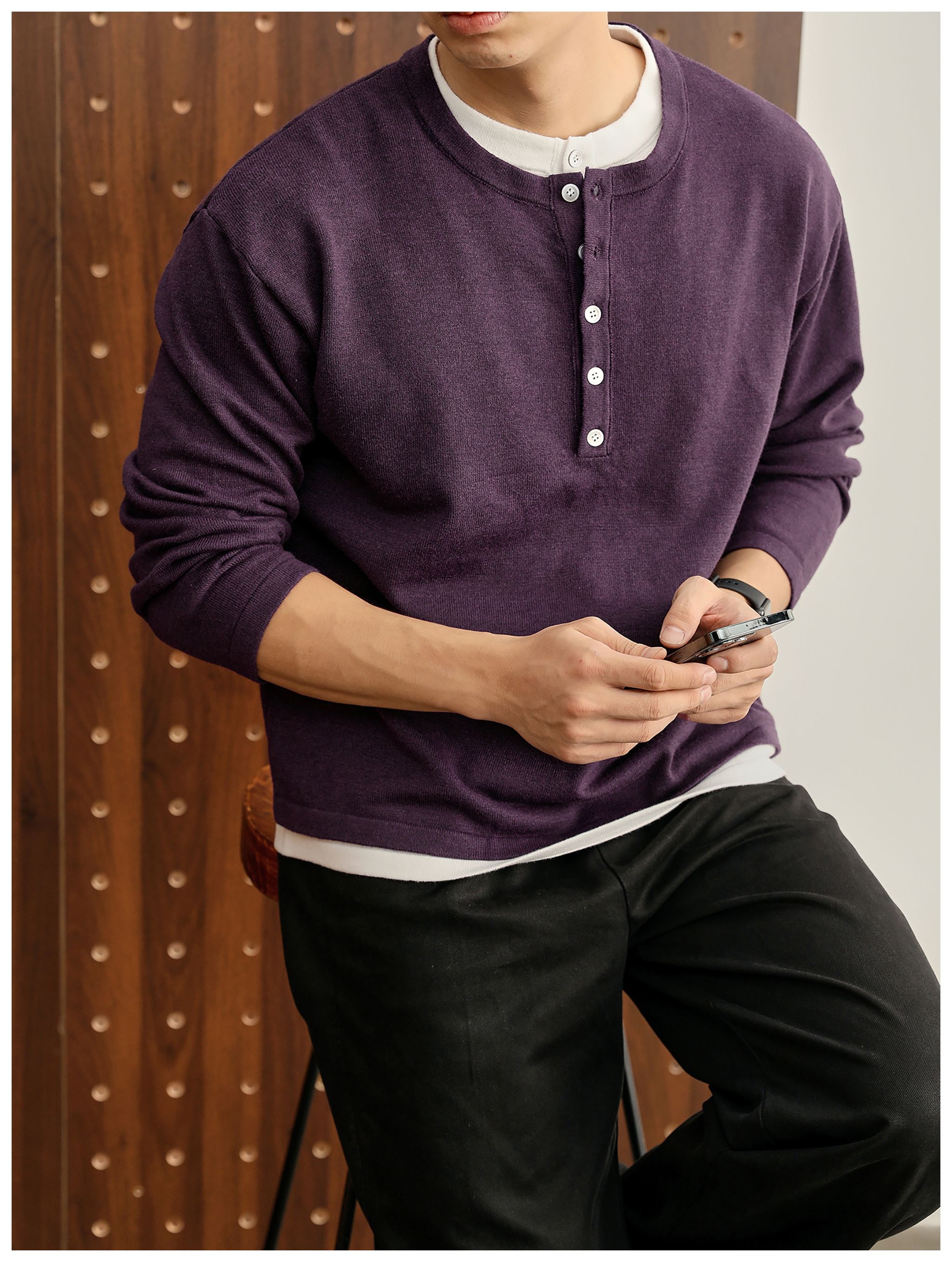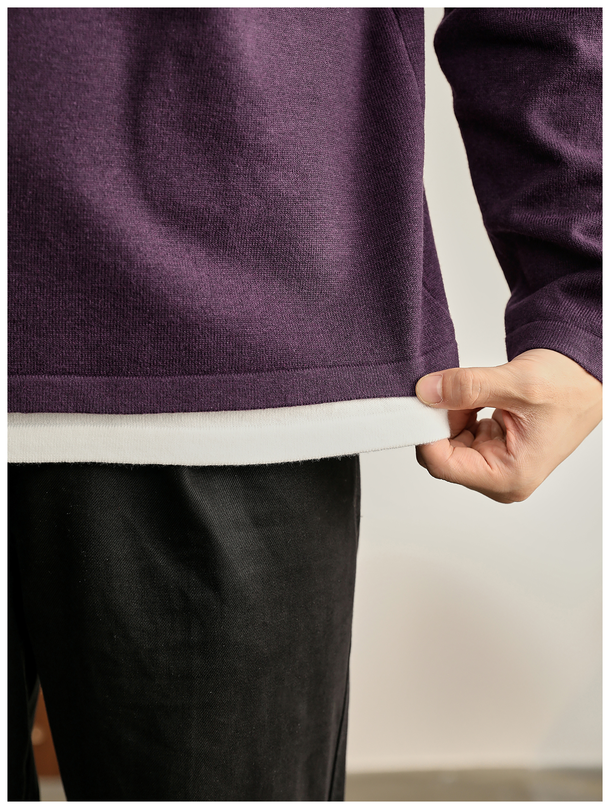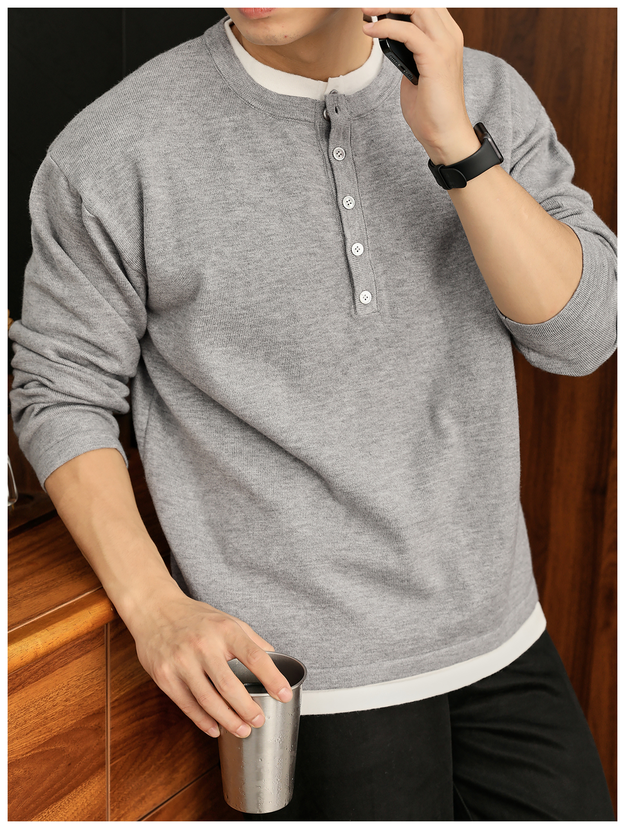 時髦高智感假兩件撞色亨利領針織衫男士秋季休閒百搭長袖T恤