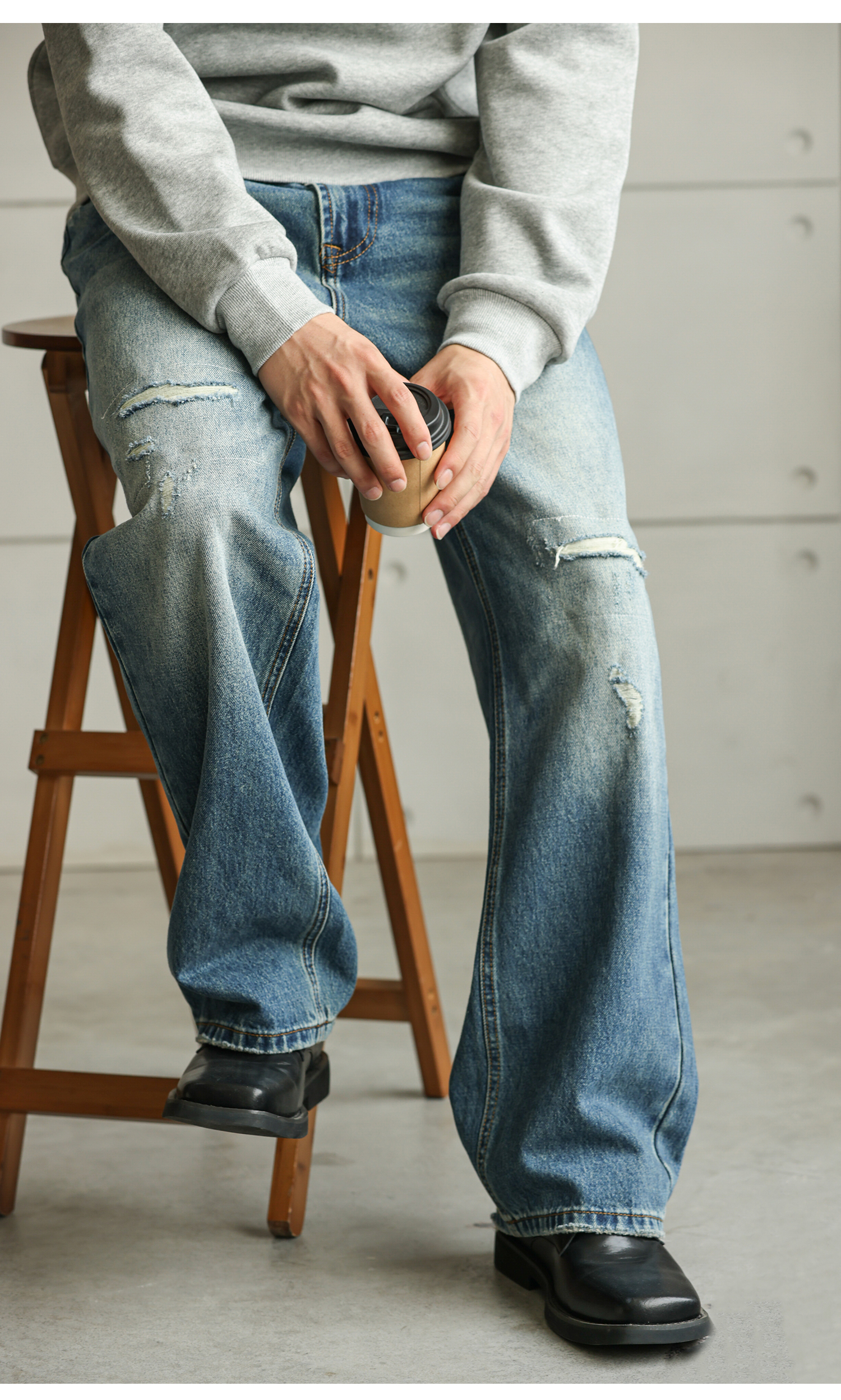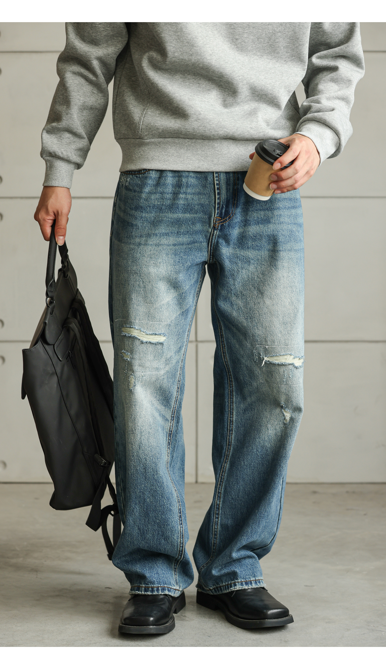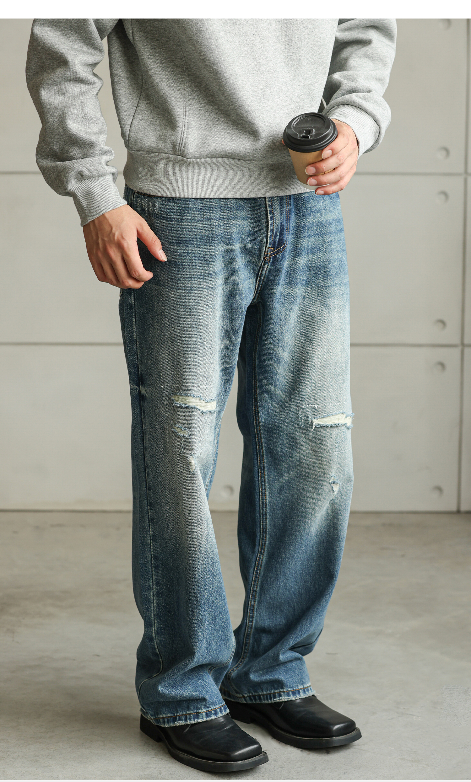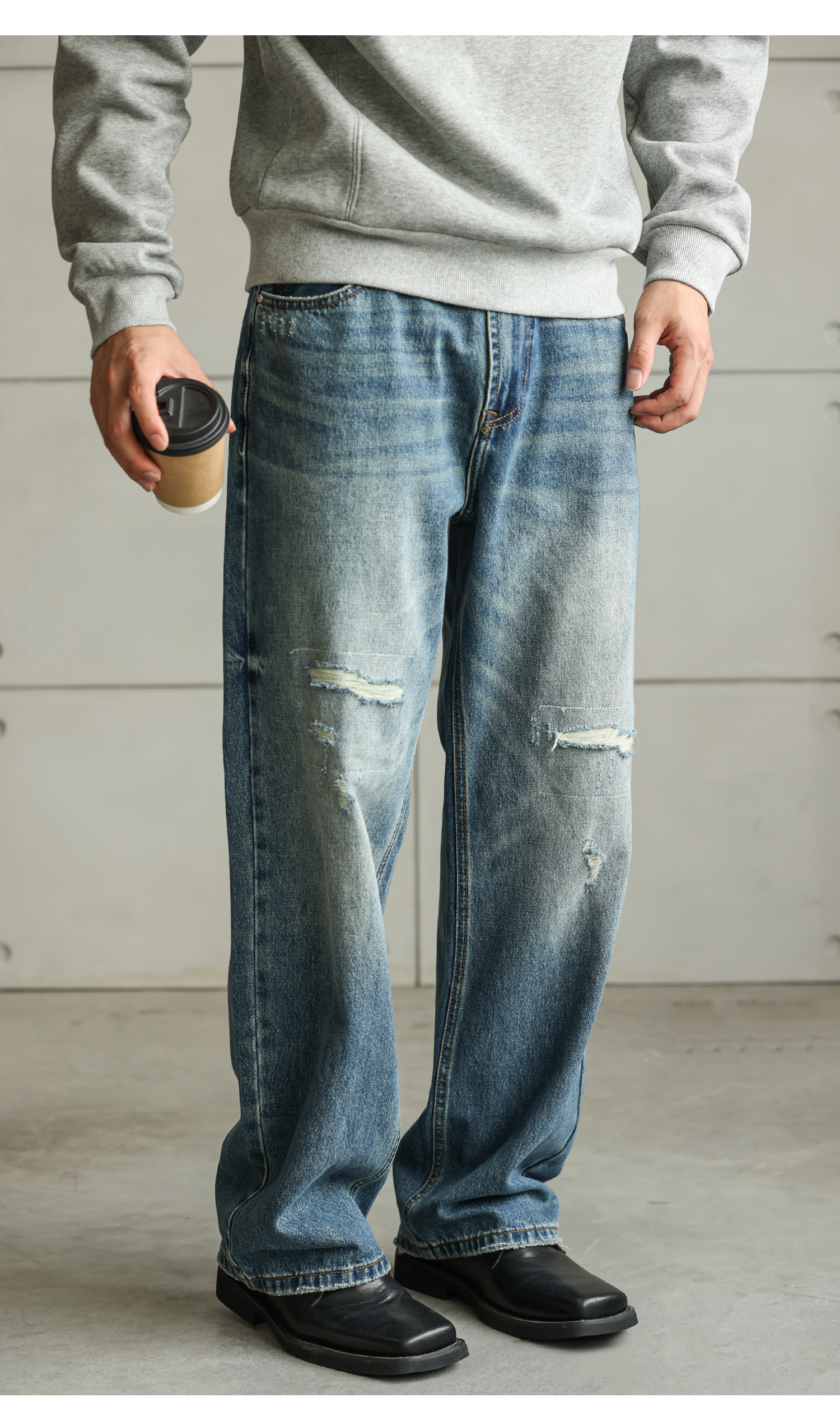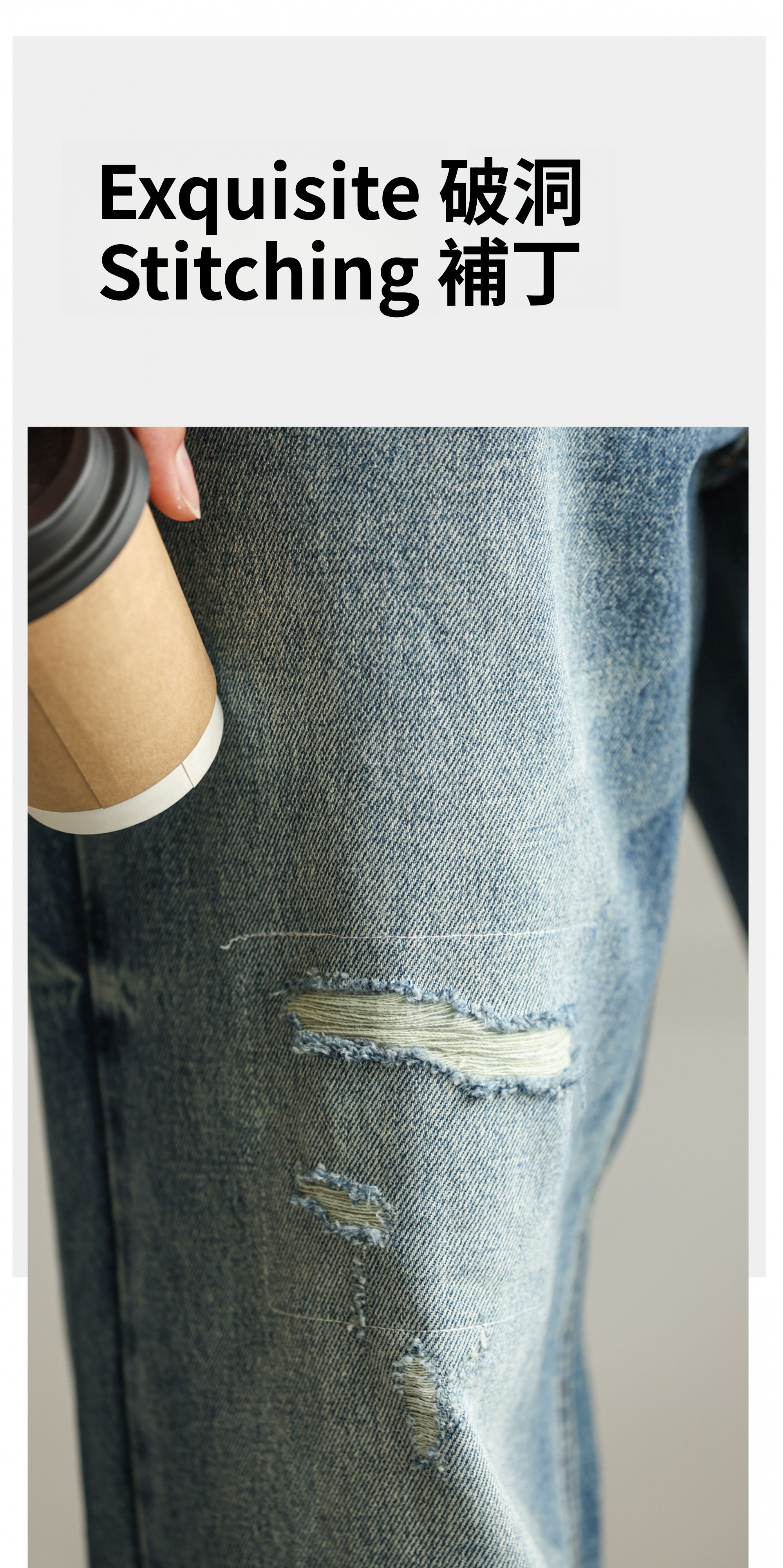【不羈態度】12.39OZ做舊破洞補丁水洗藍牛仔褲男士長褲