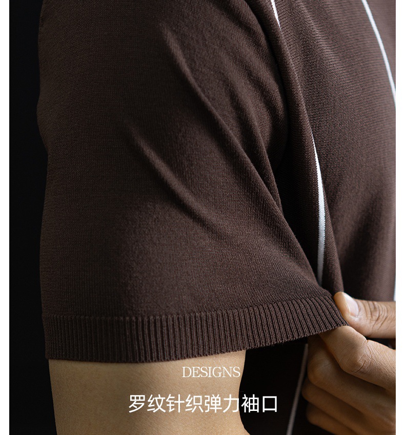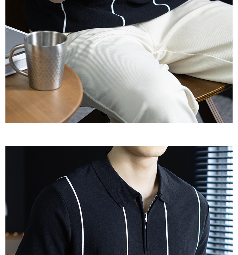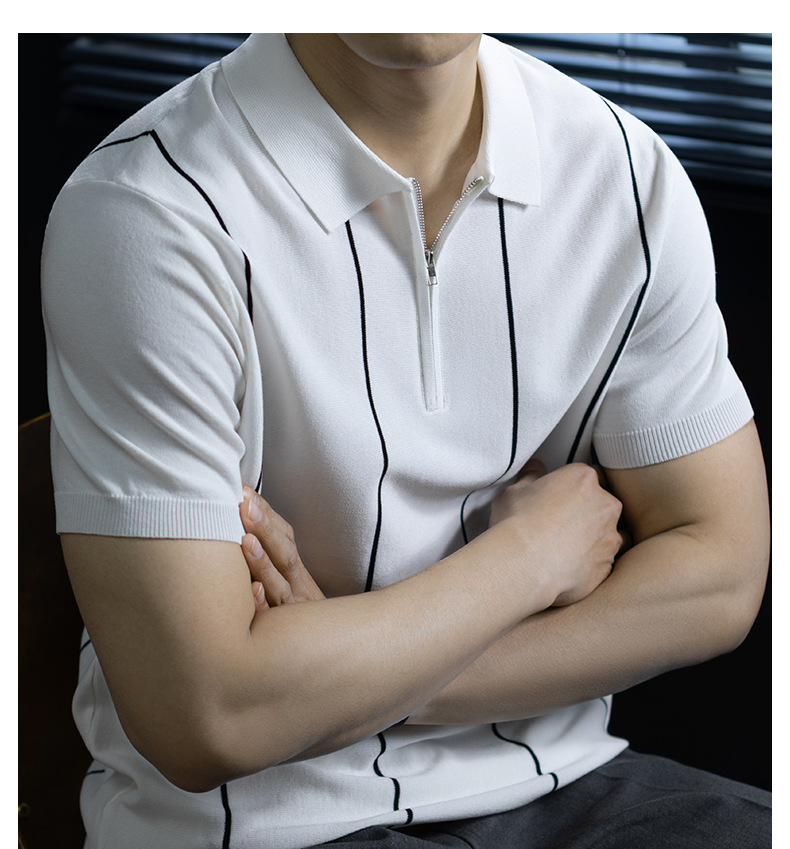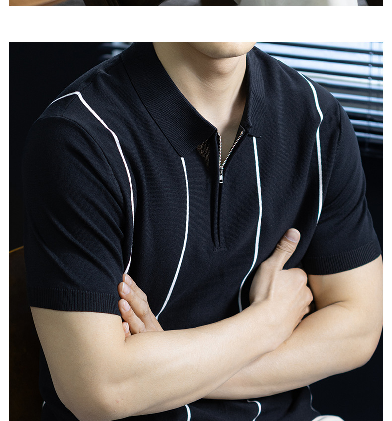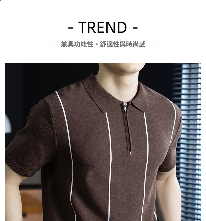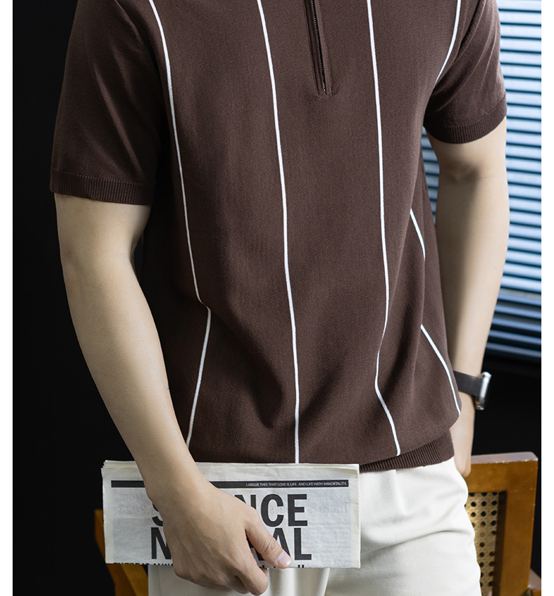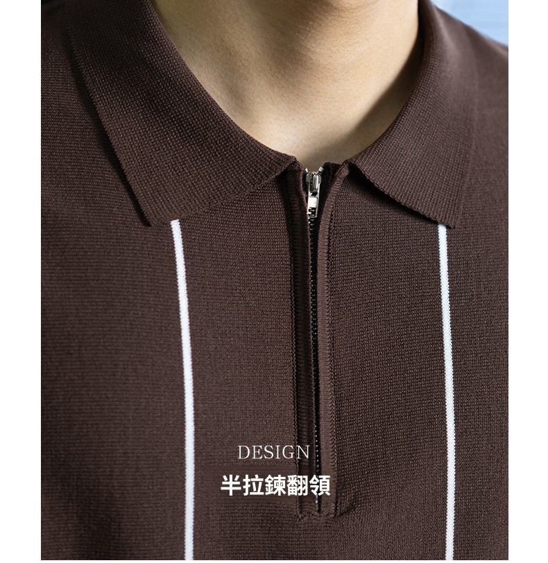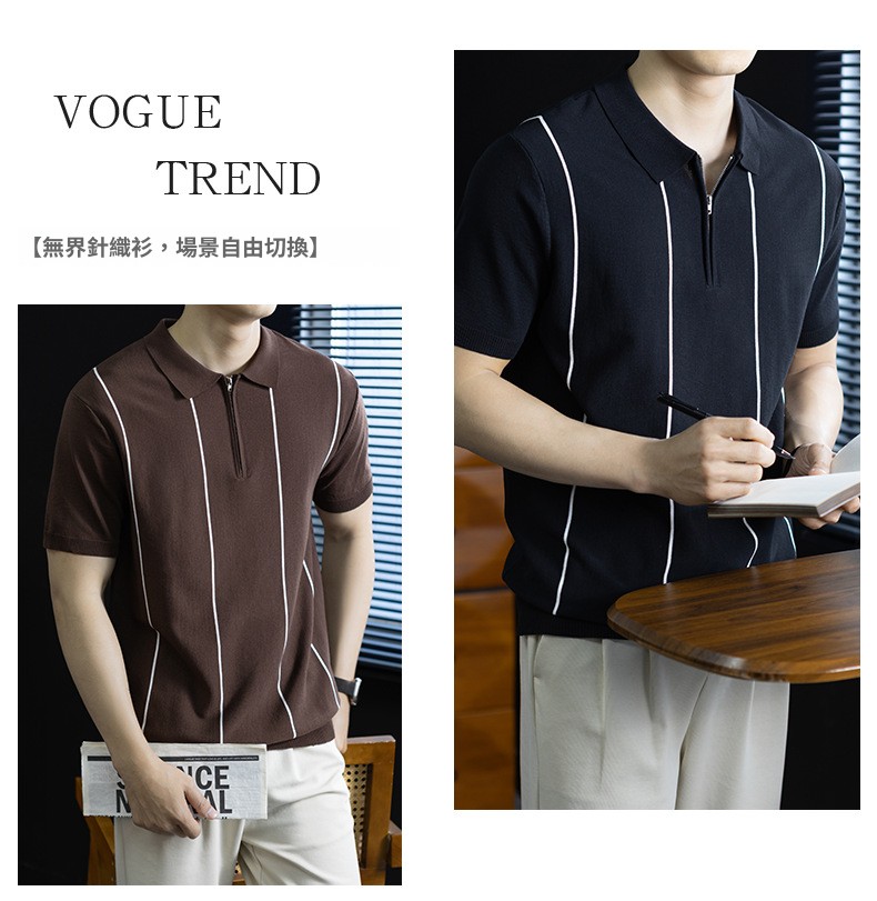 【細條紋撞色】夏季冰爽絲透氣針織T桖老錢風半拉鍊短袖POLO衫男