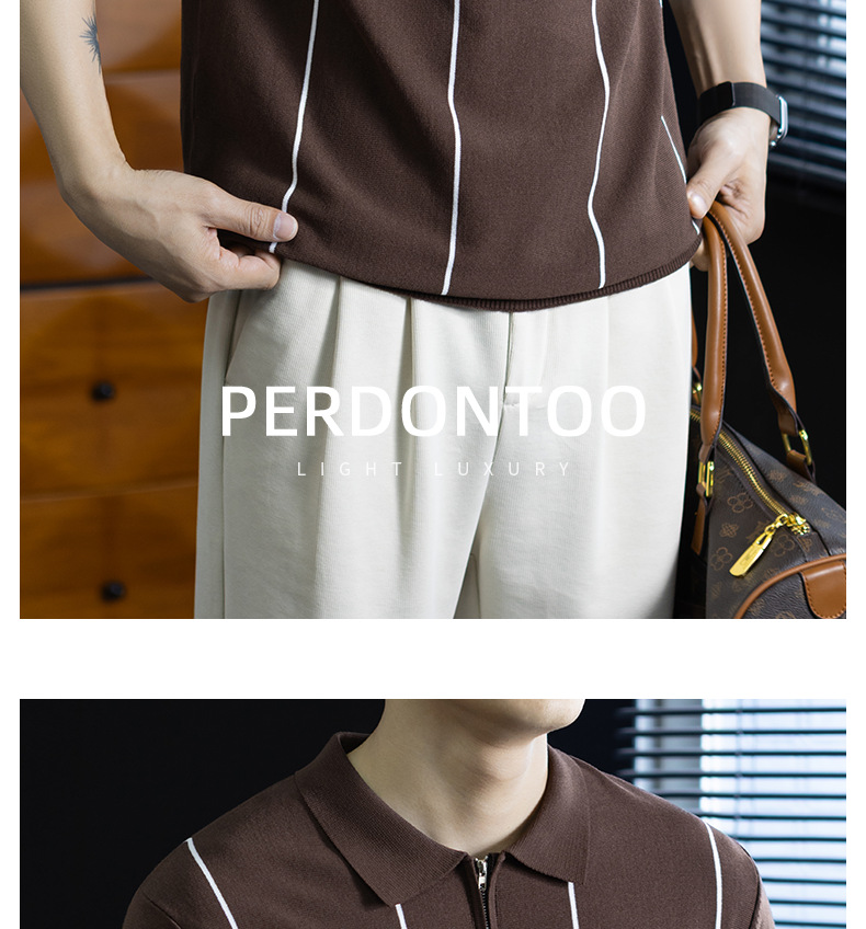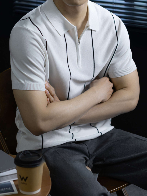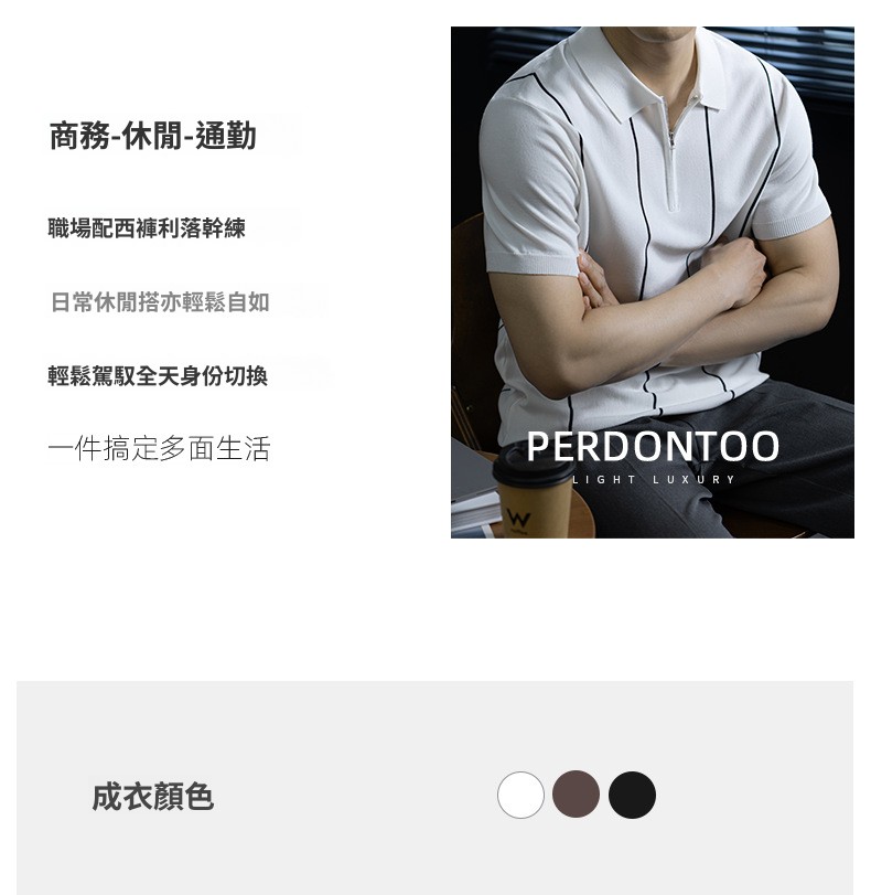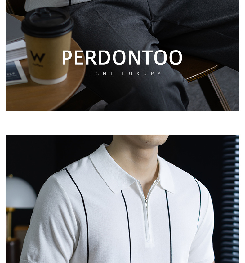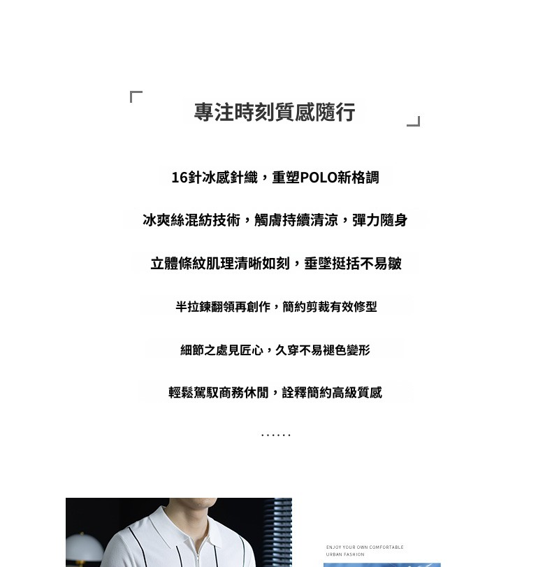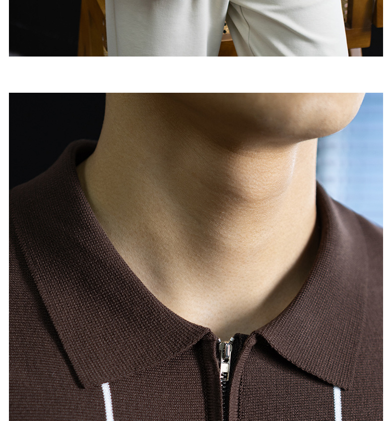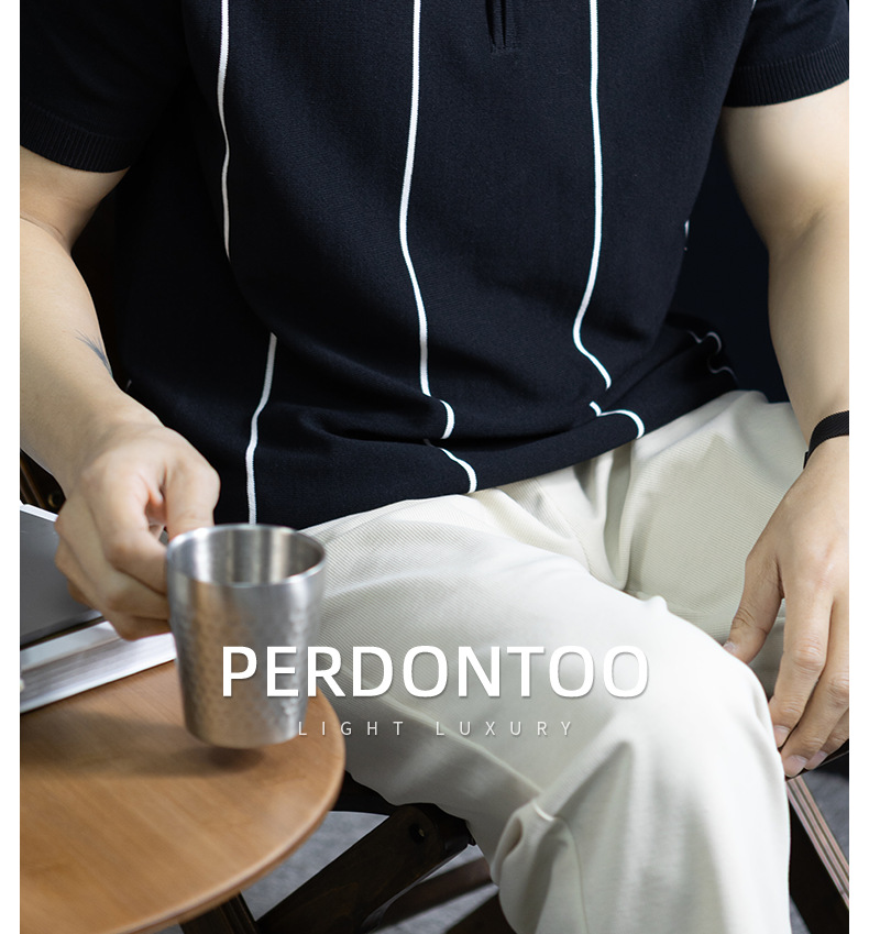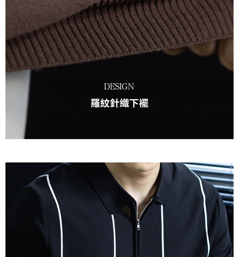 【細條紋撞色】夏季冰爽絲透氣針織T桖老錢風半拉鍊短袖POLO衫男