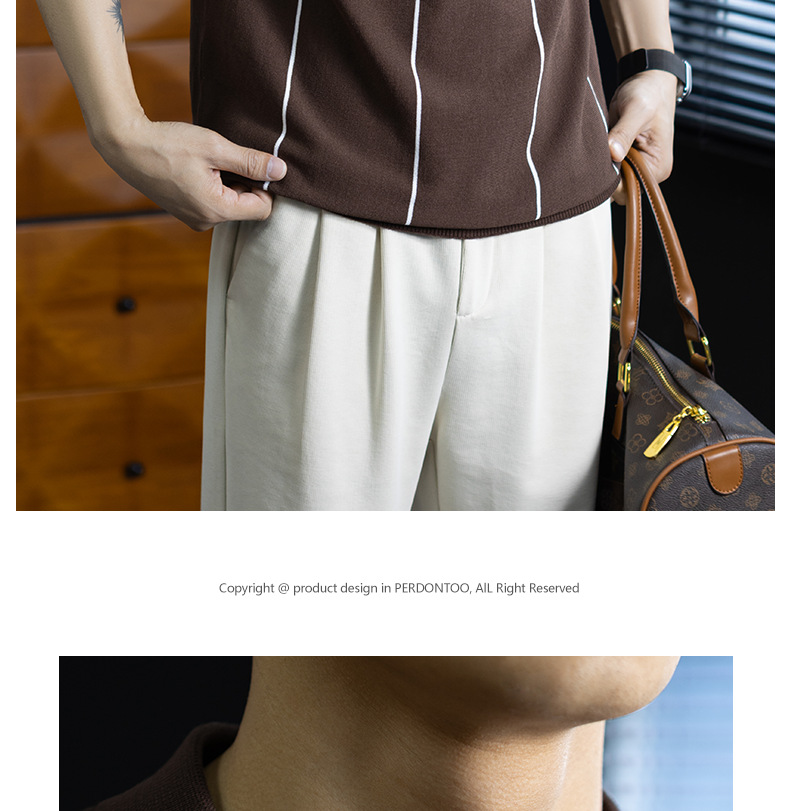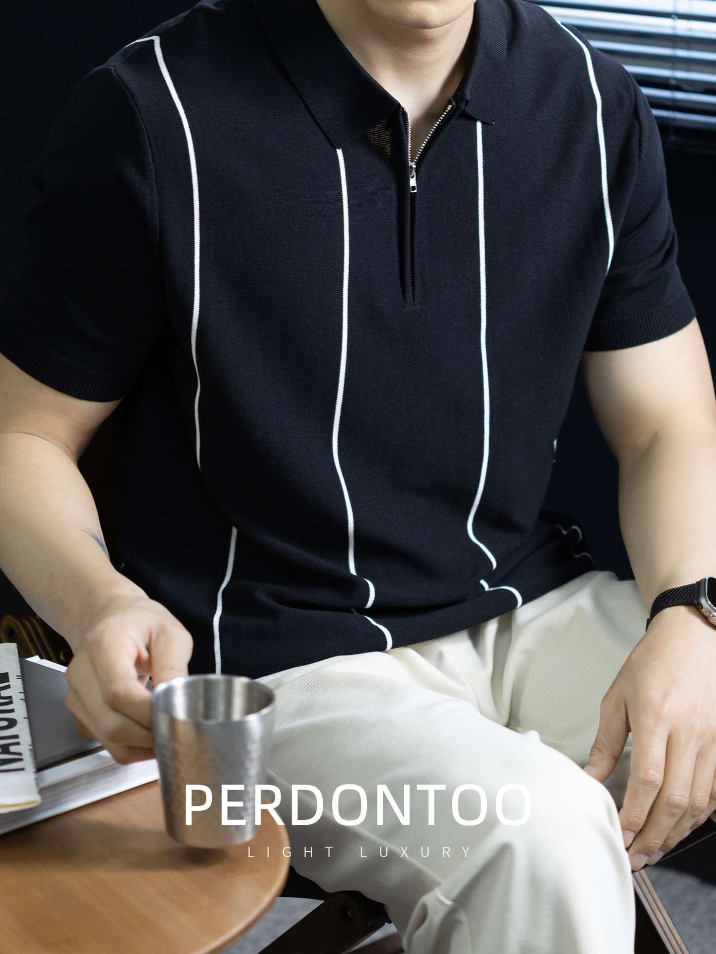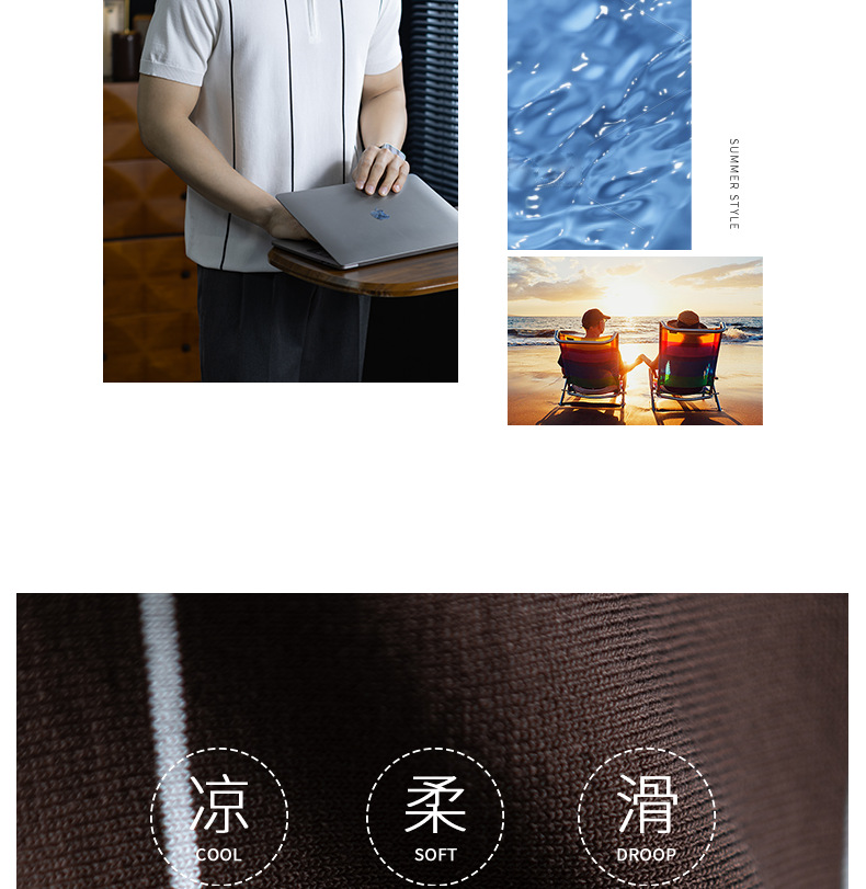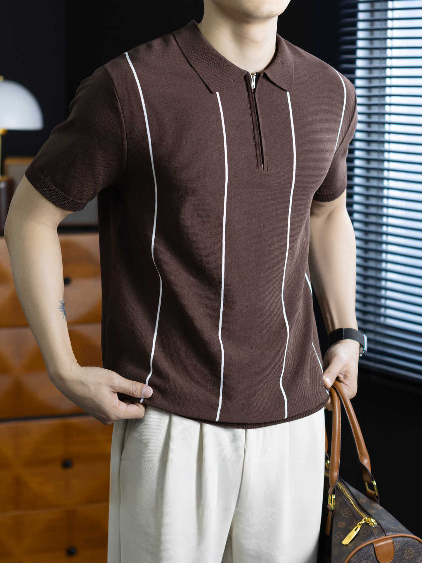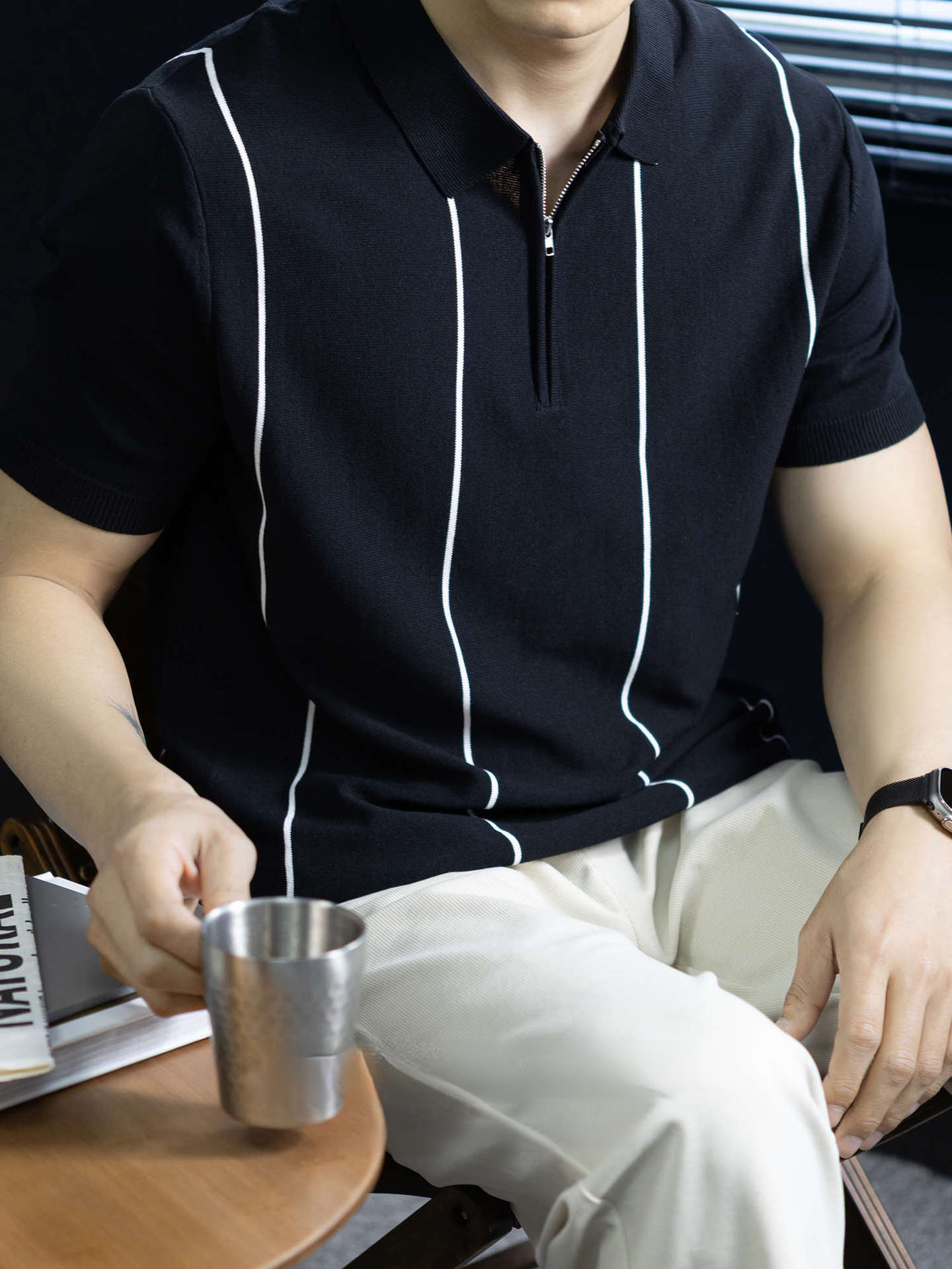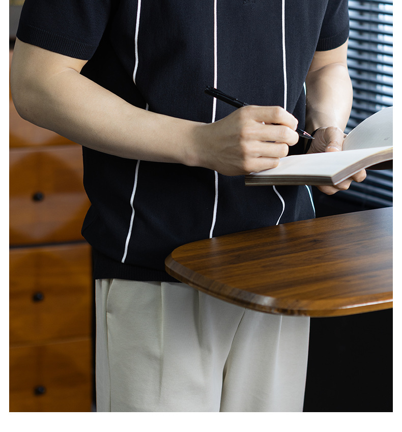 【細條紋撞色】夏季冰爽絲透氣針織T桖老錢風半拉鍊短袖POLO衫男