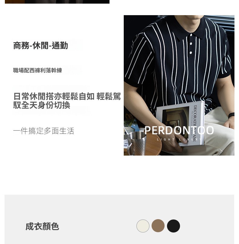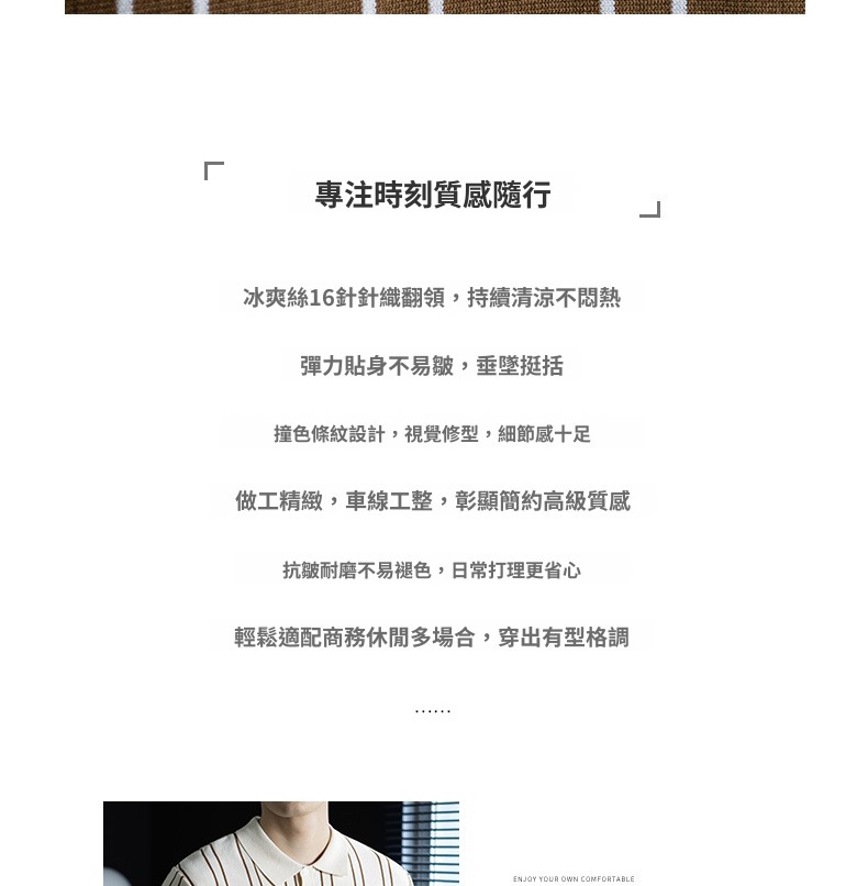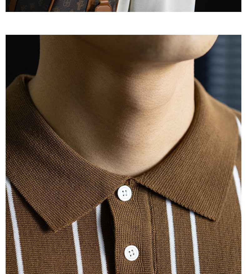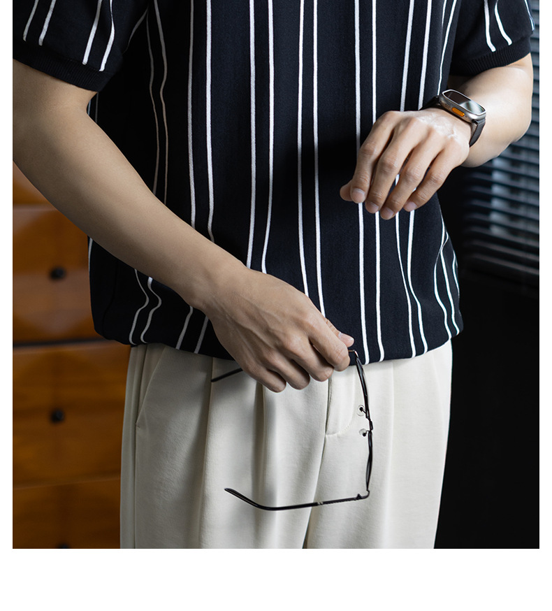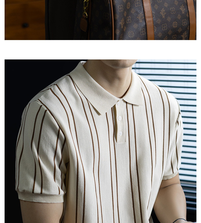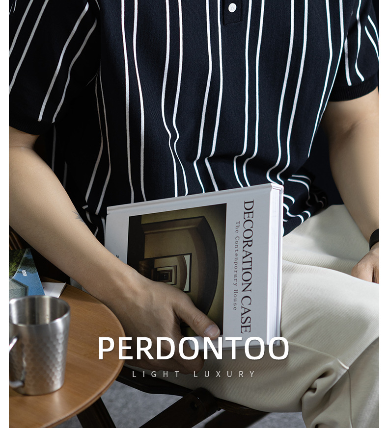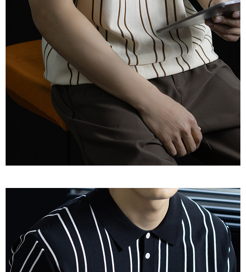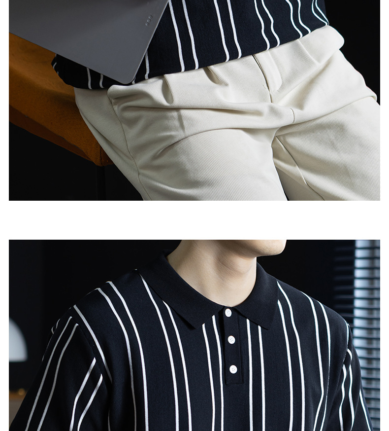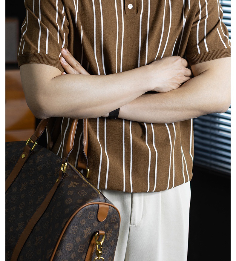 【親膚乾爽】復古簡約細直紋polo針織T恤男款通勤高級感短袖上衣