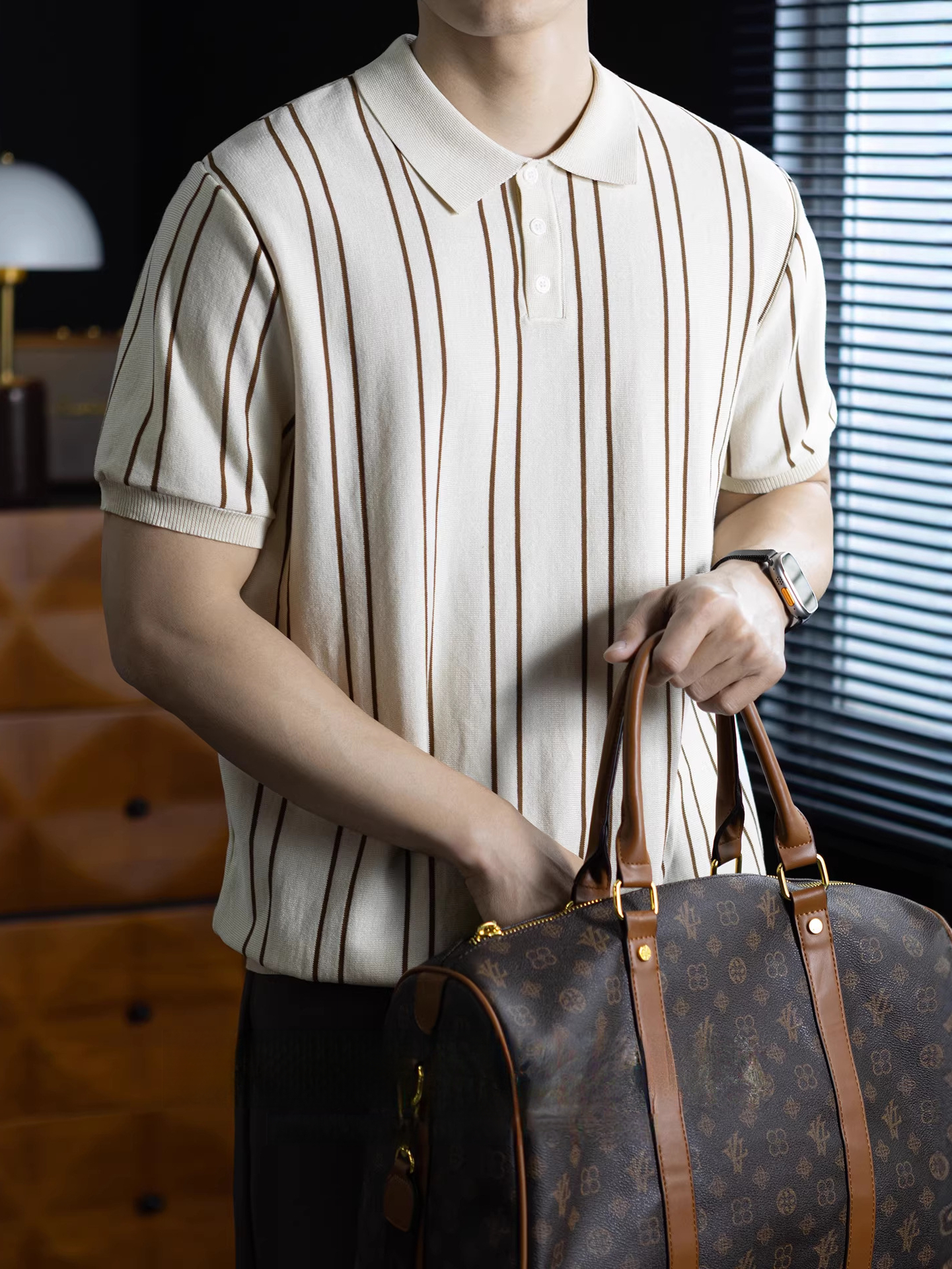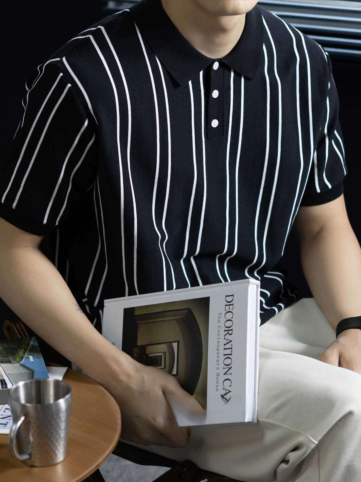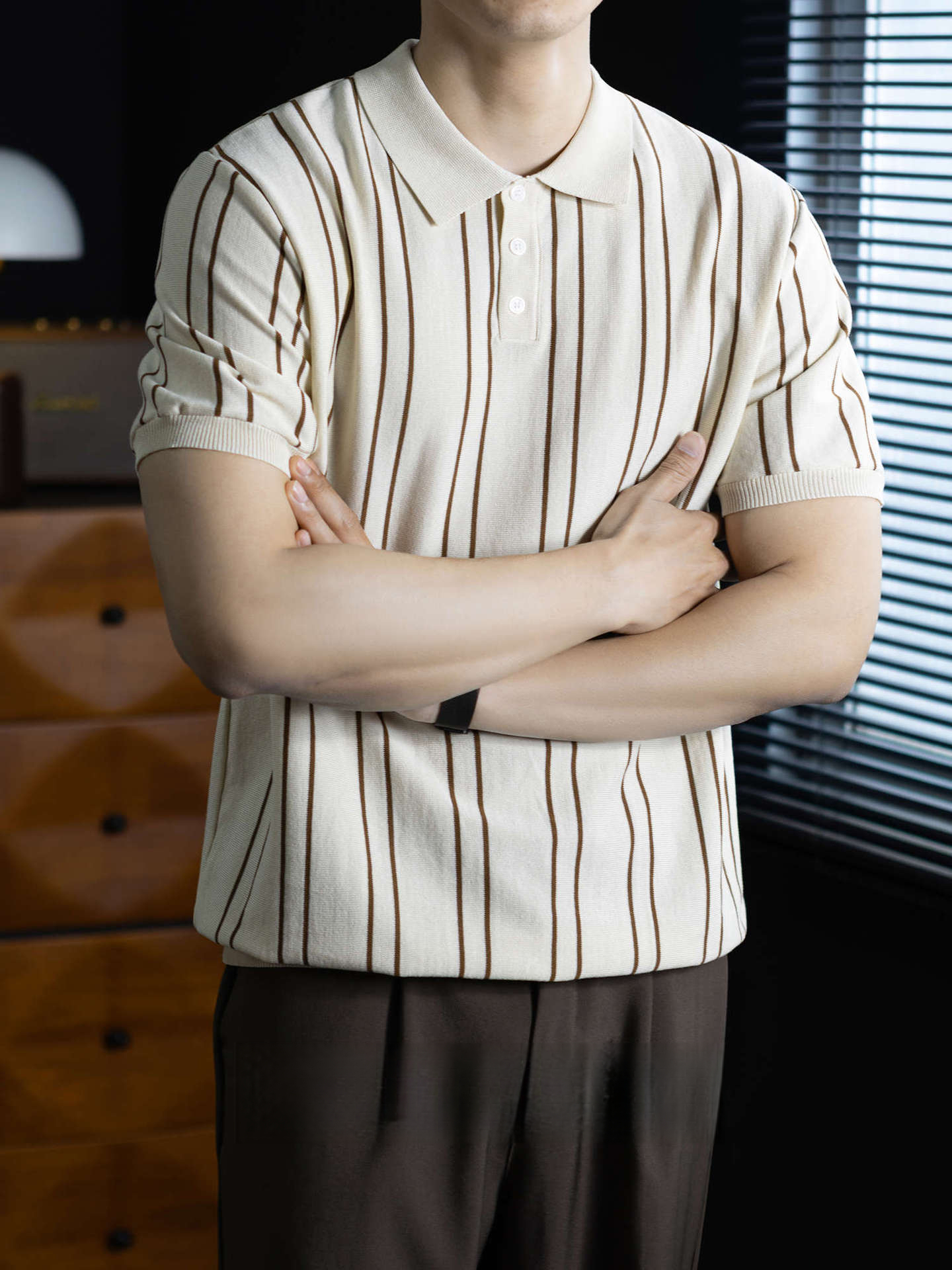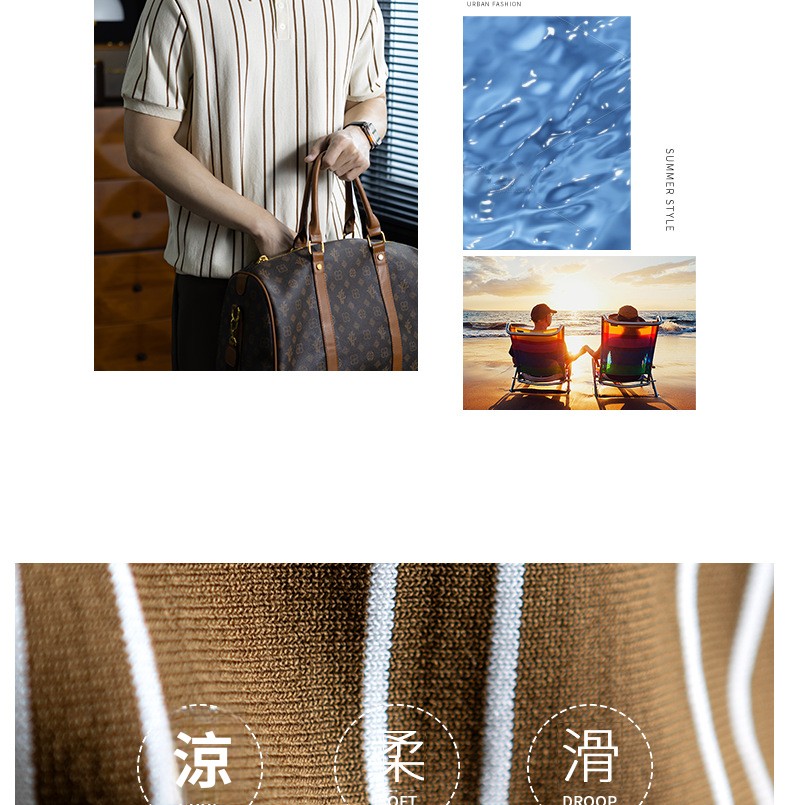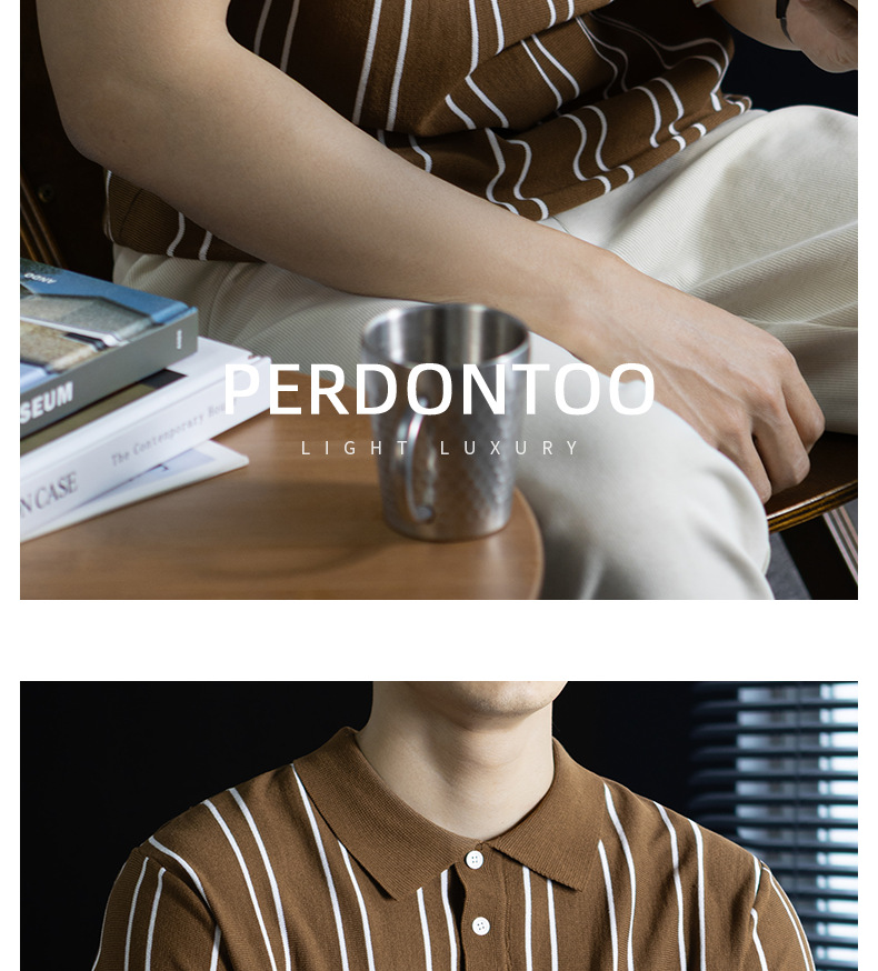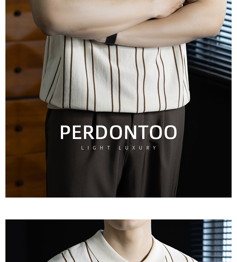 【親膚乾爽】復古簡約細直紋polo針織T恤男款通勤高級感短袖上衣