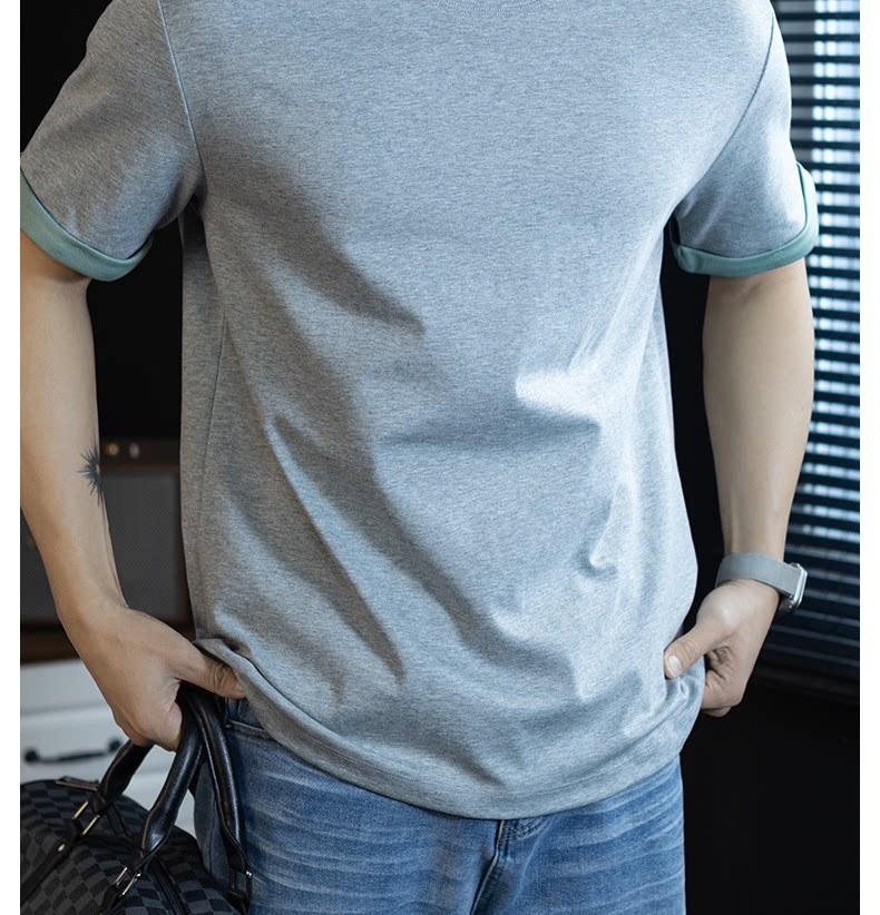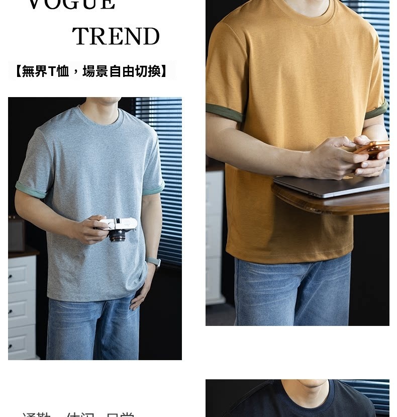 【高階復古】雙紗絲光棉撞色短袖T恤男260G重磅夏季涼感透氣速幹T恤