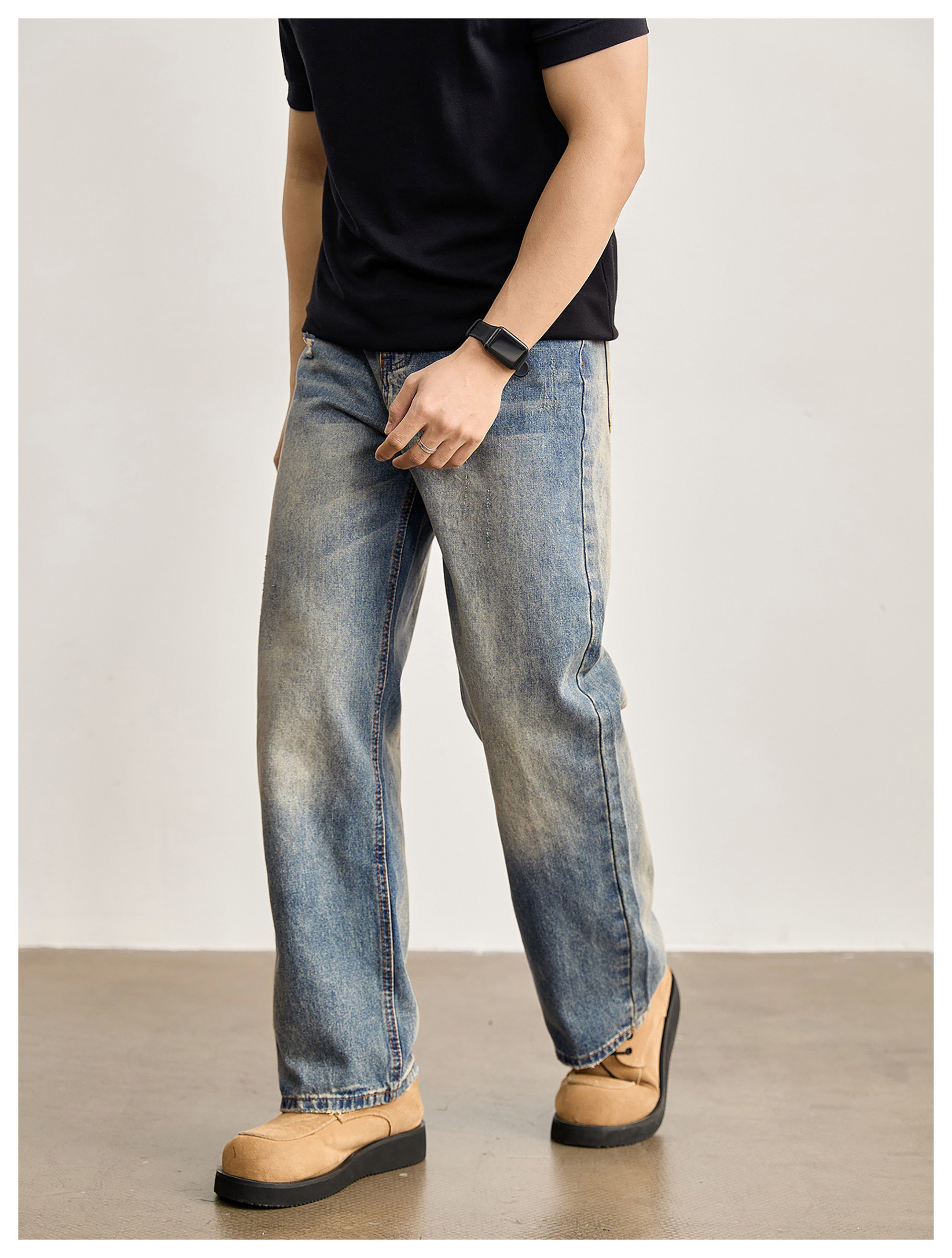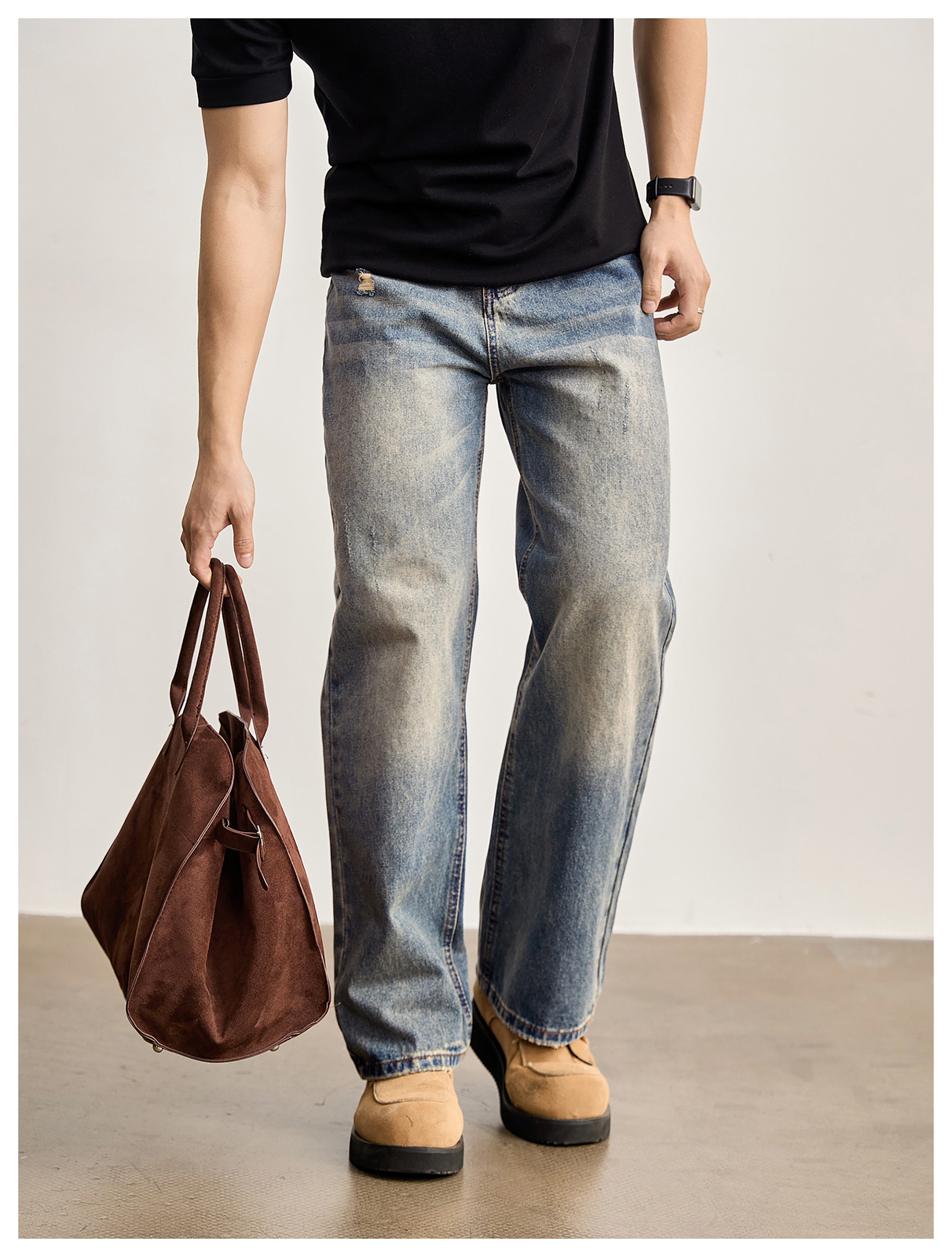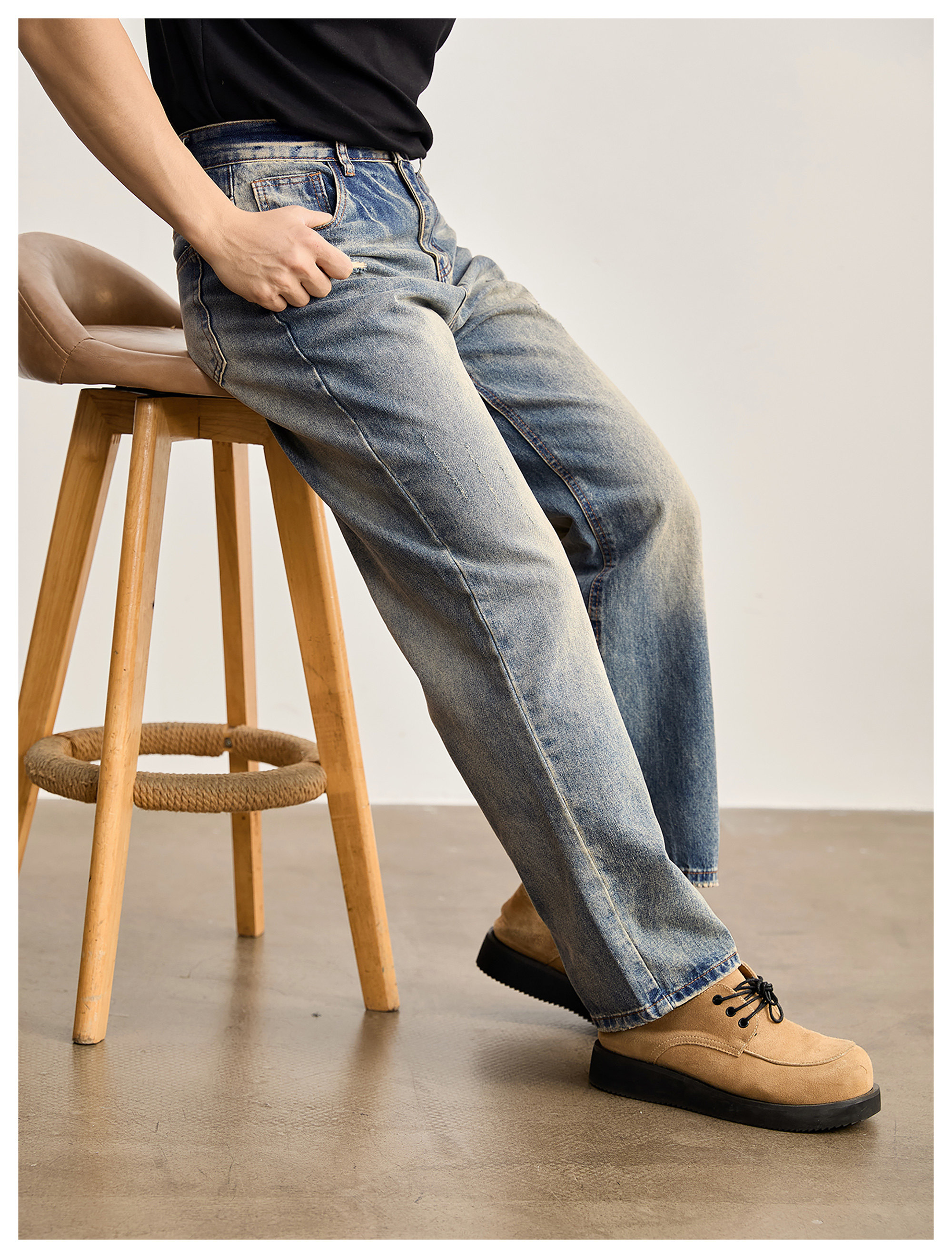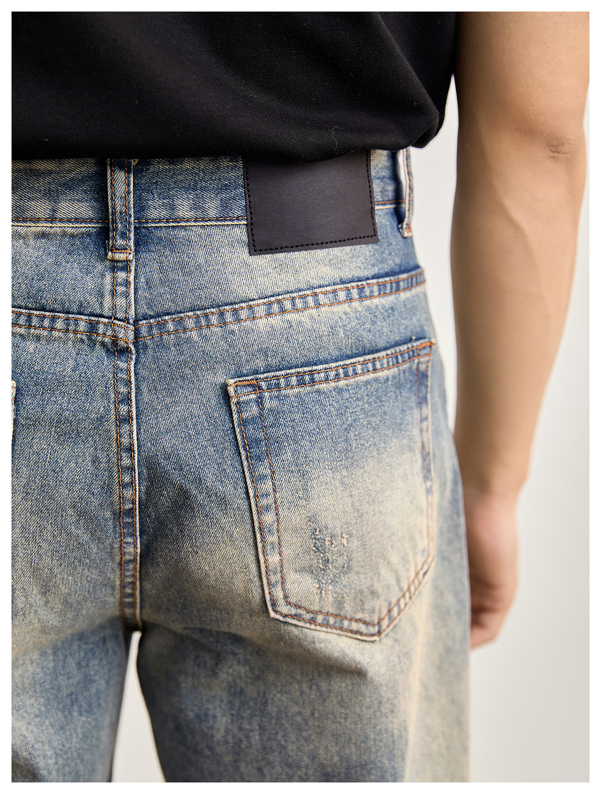 做舊水洗磨白貓須刮破牛仔褲男直筒微錐版型cleanfit長褲子