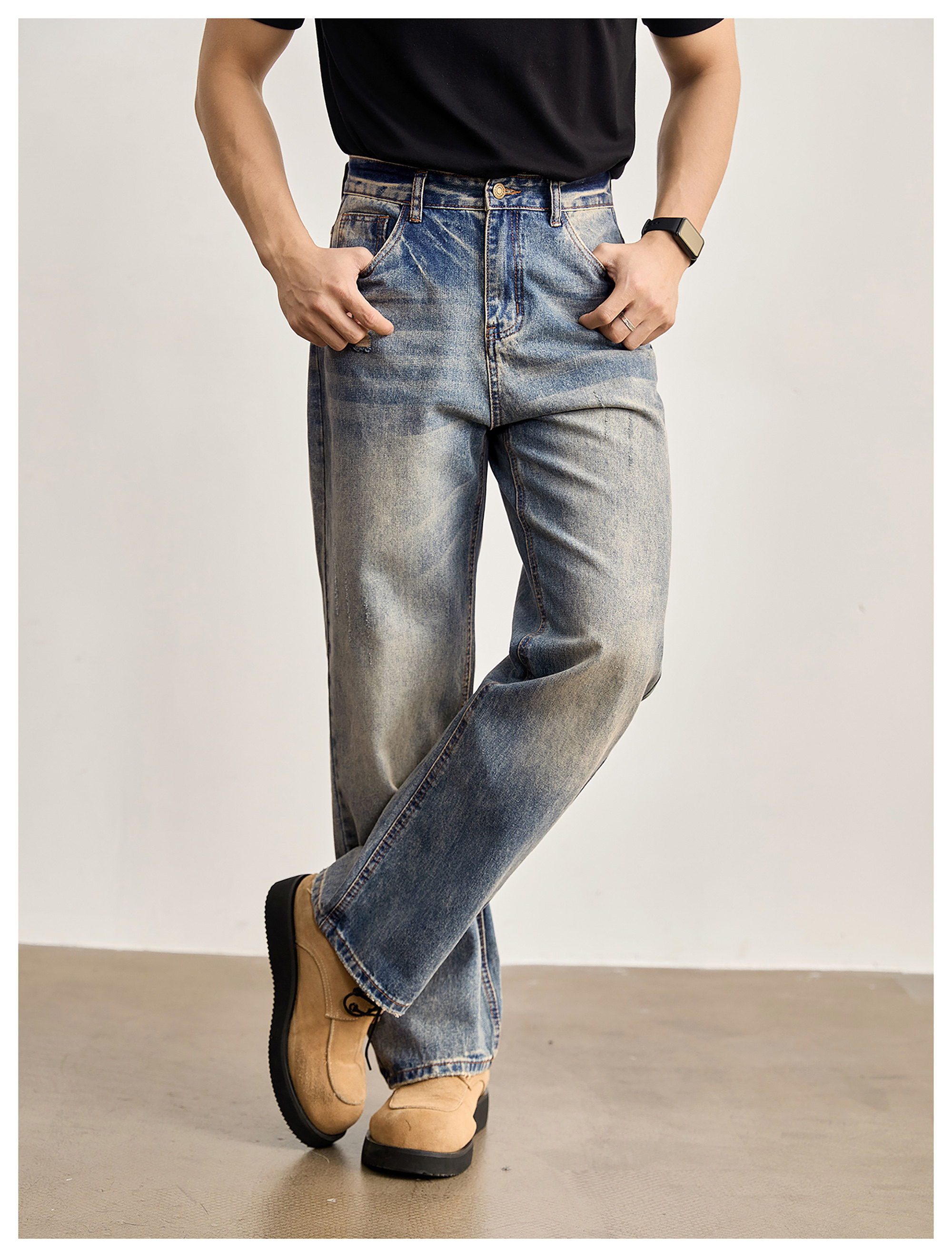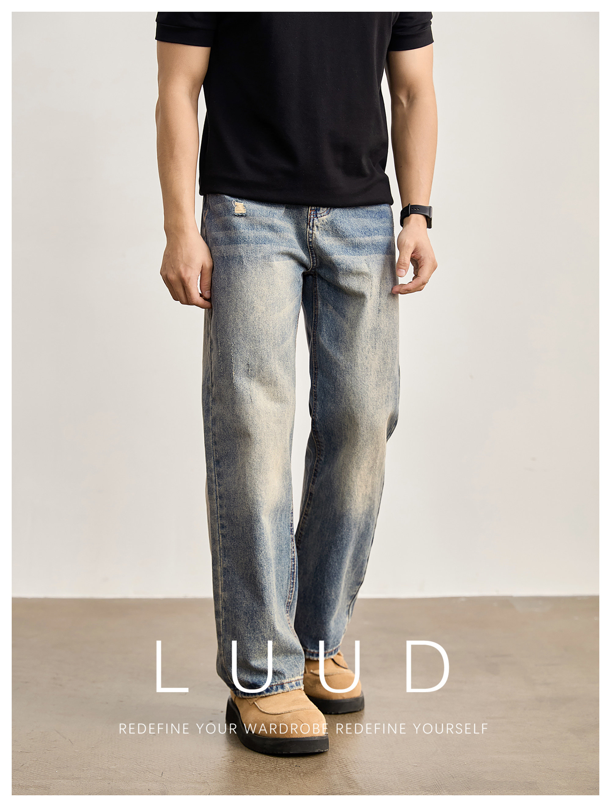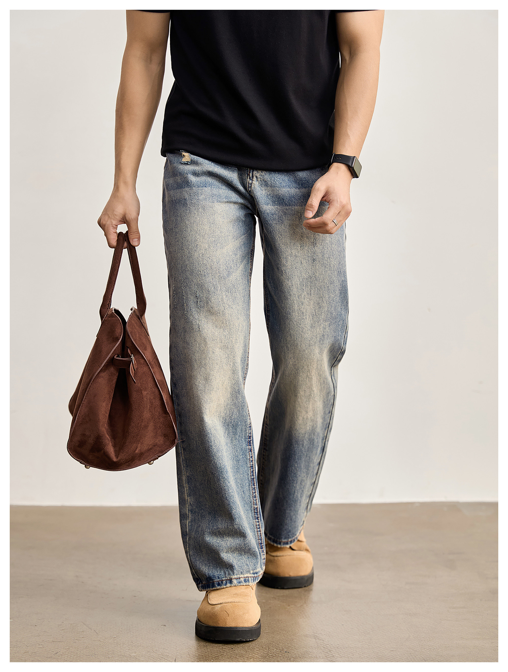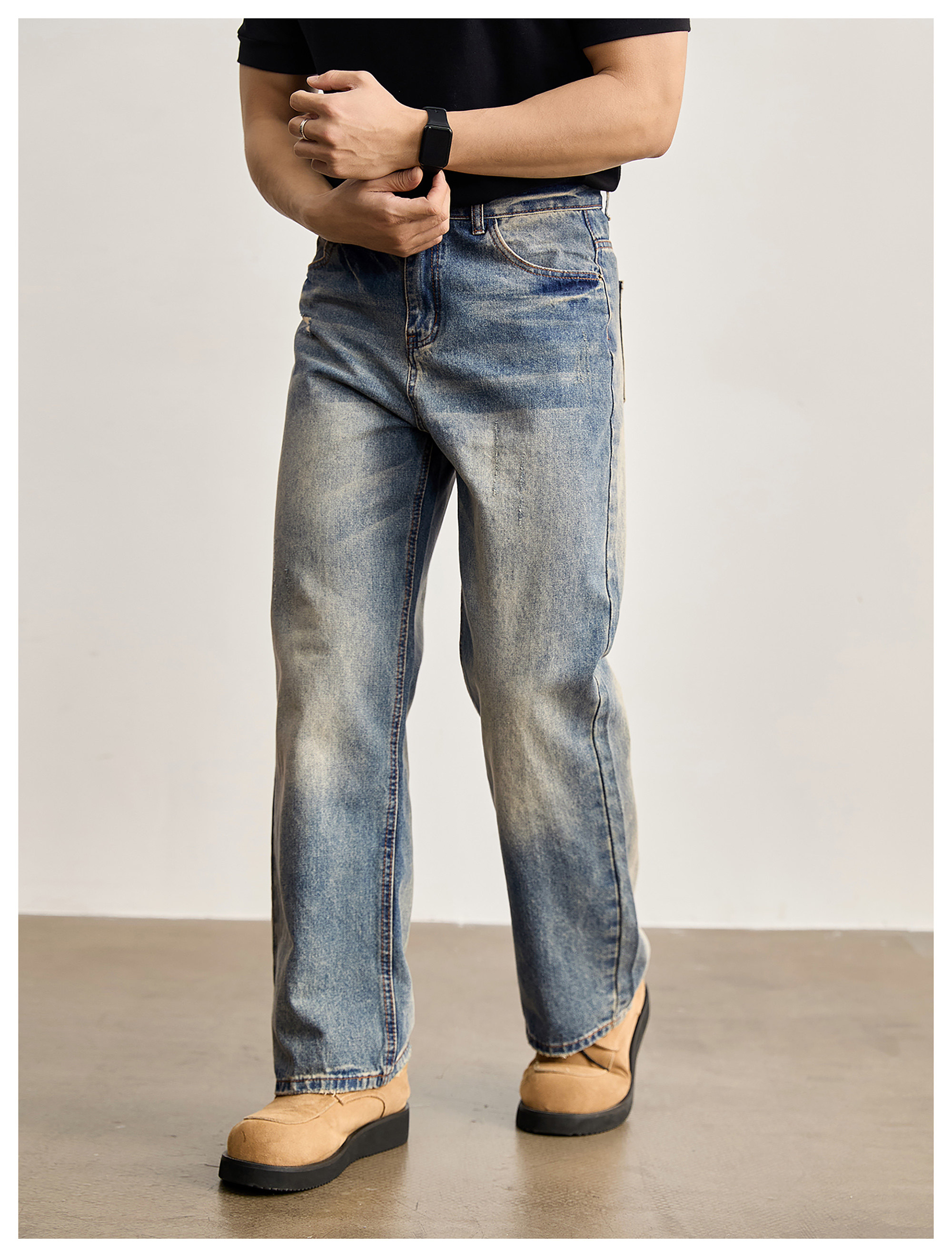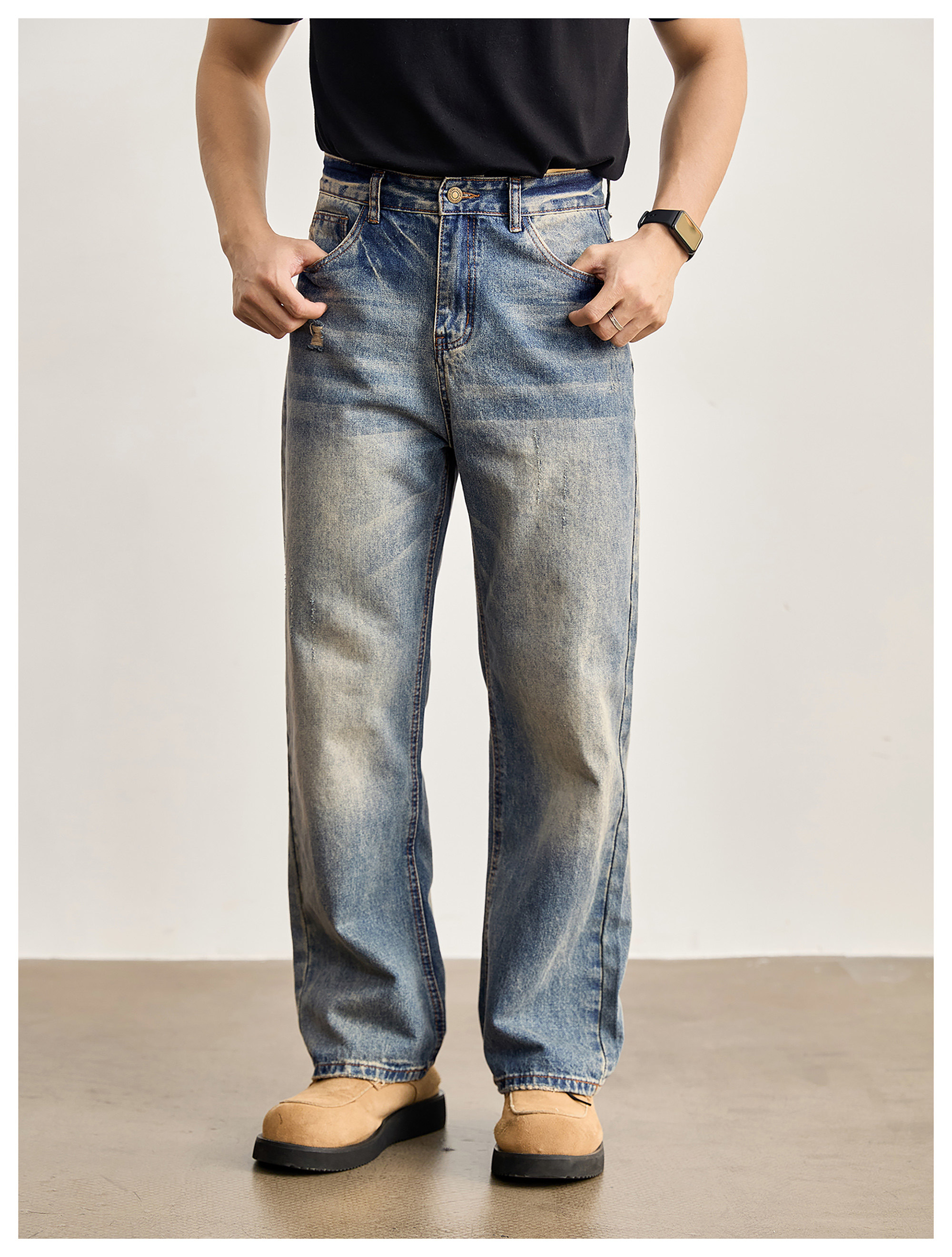 做舊水洗磨白貓須刮破牛仔褲男直筒微錐版型cleanfit長褲子