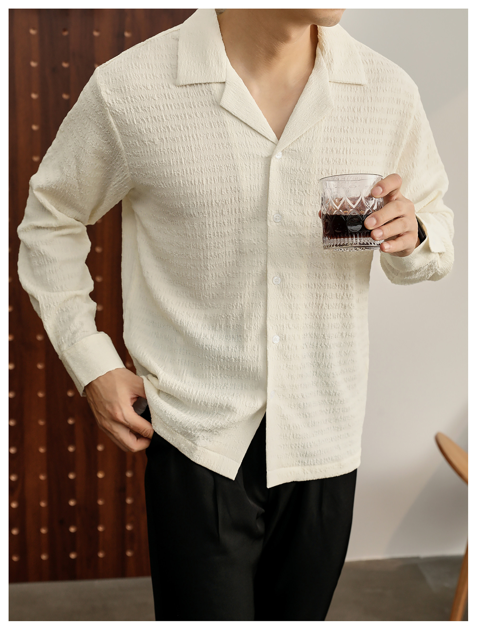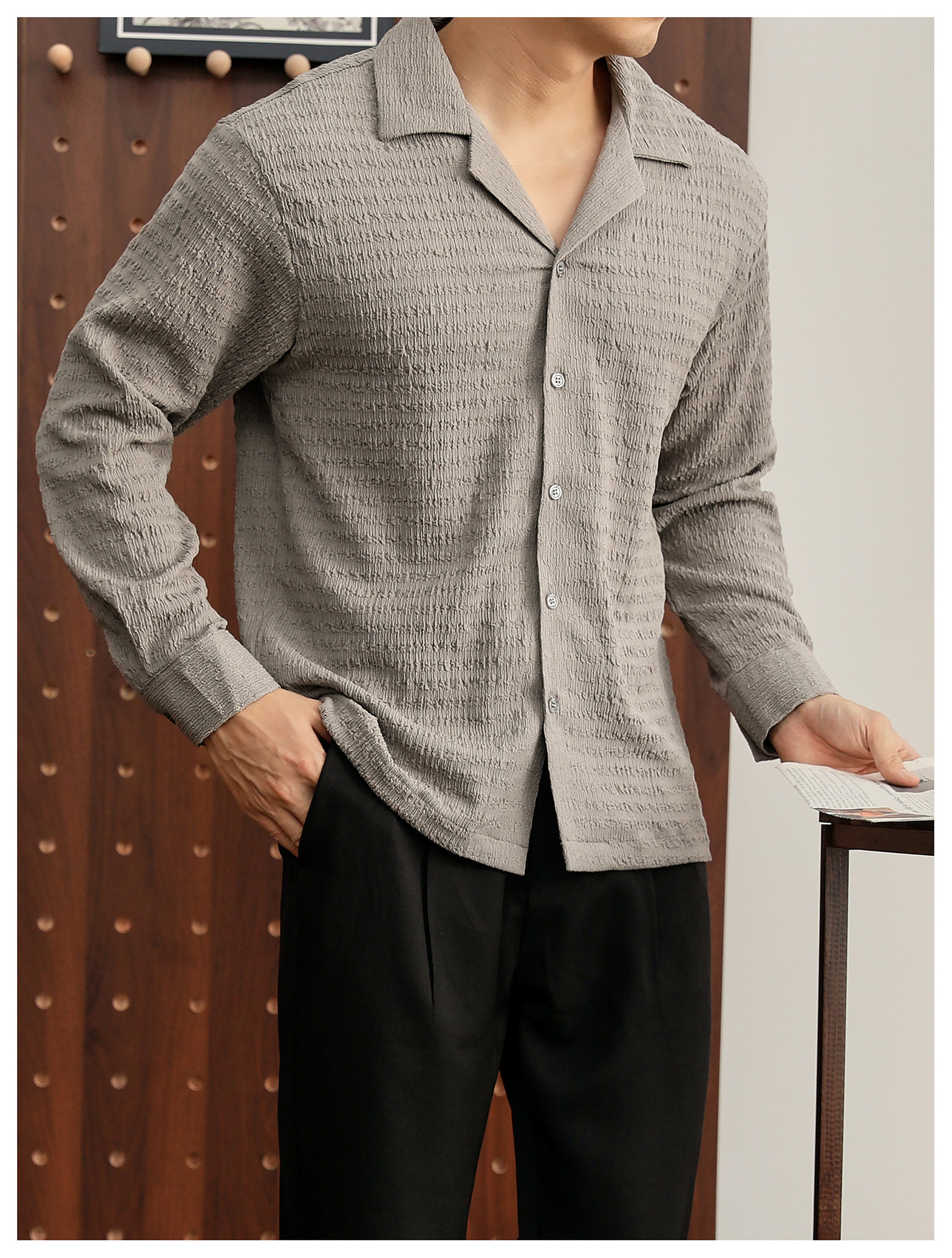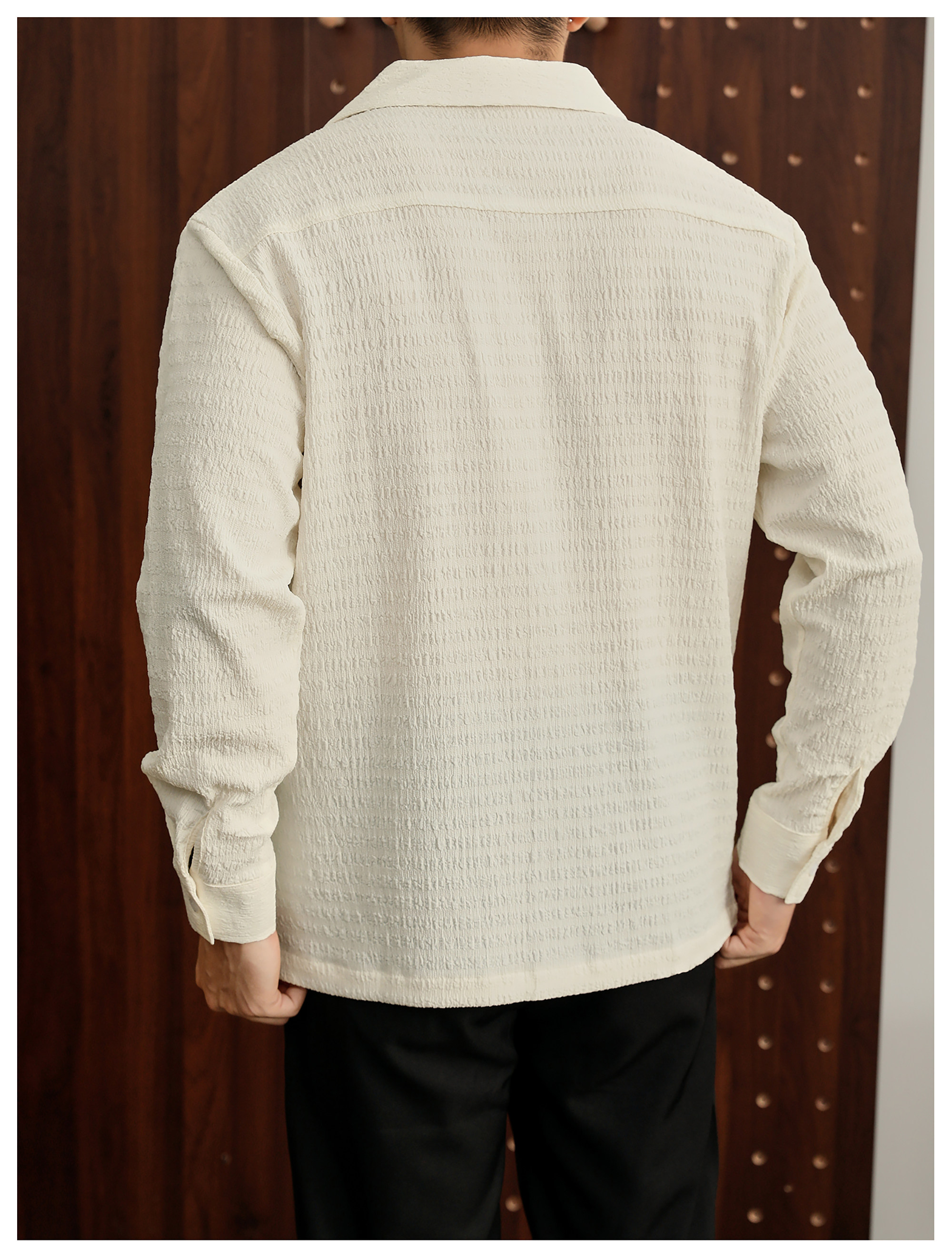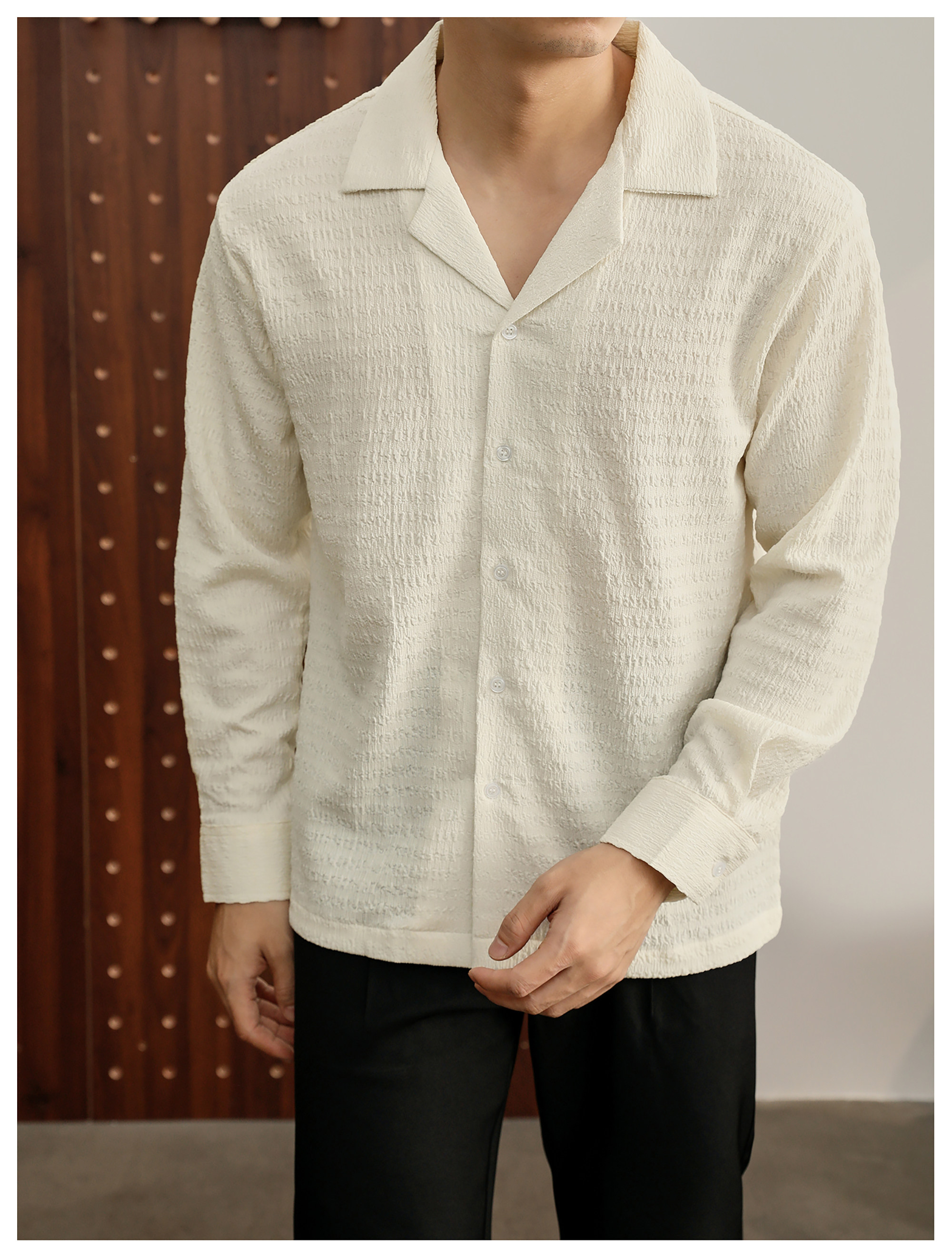 儒雅老錢風提花皺感古巴領長袖襯衫男泡泡紗肌理感襯衣