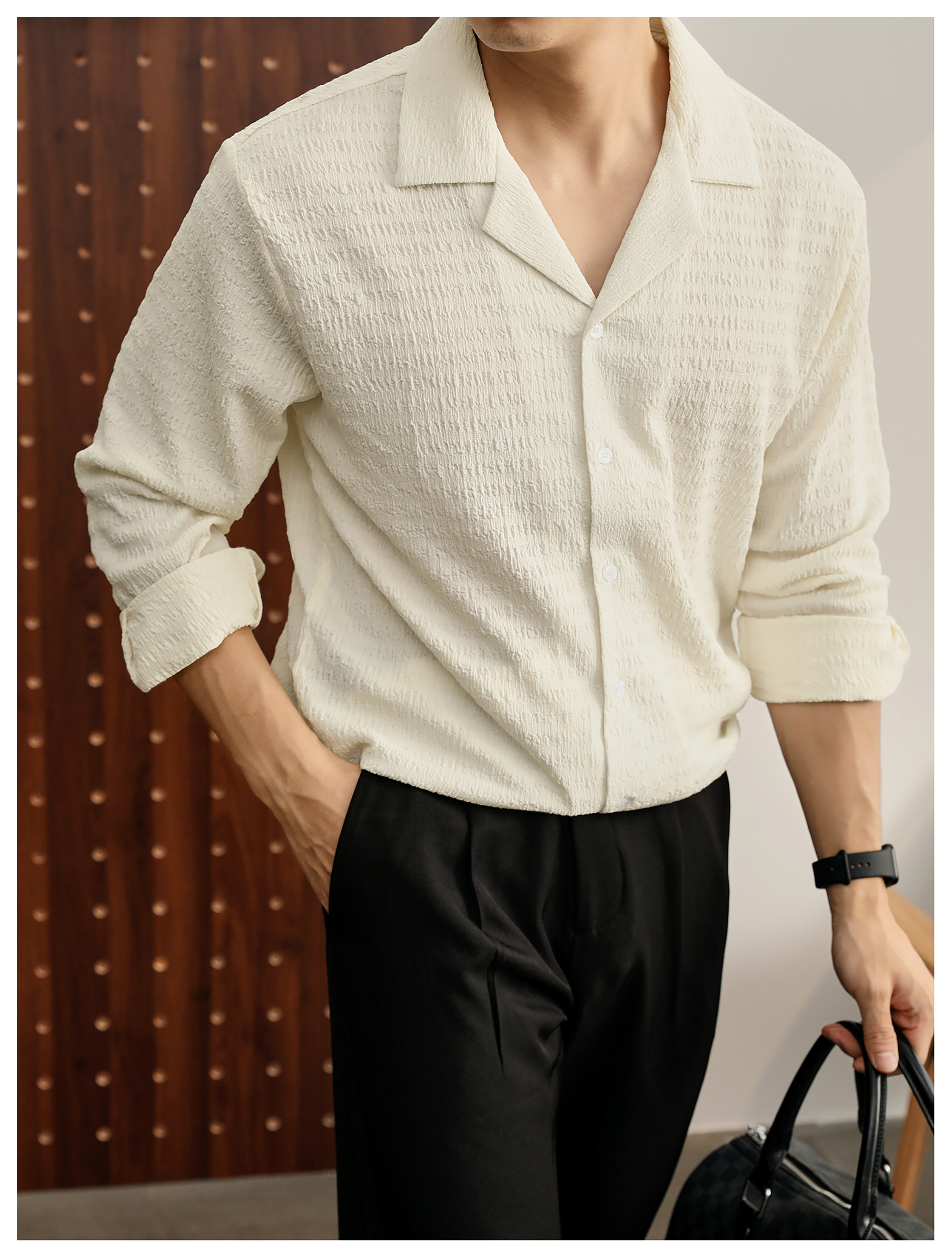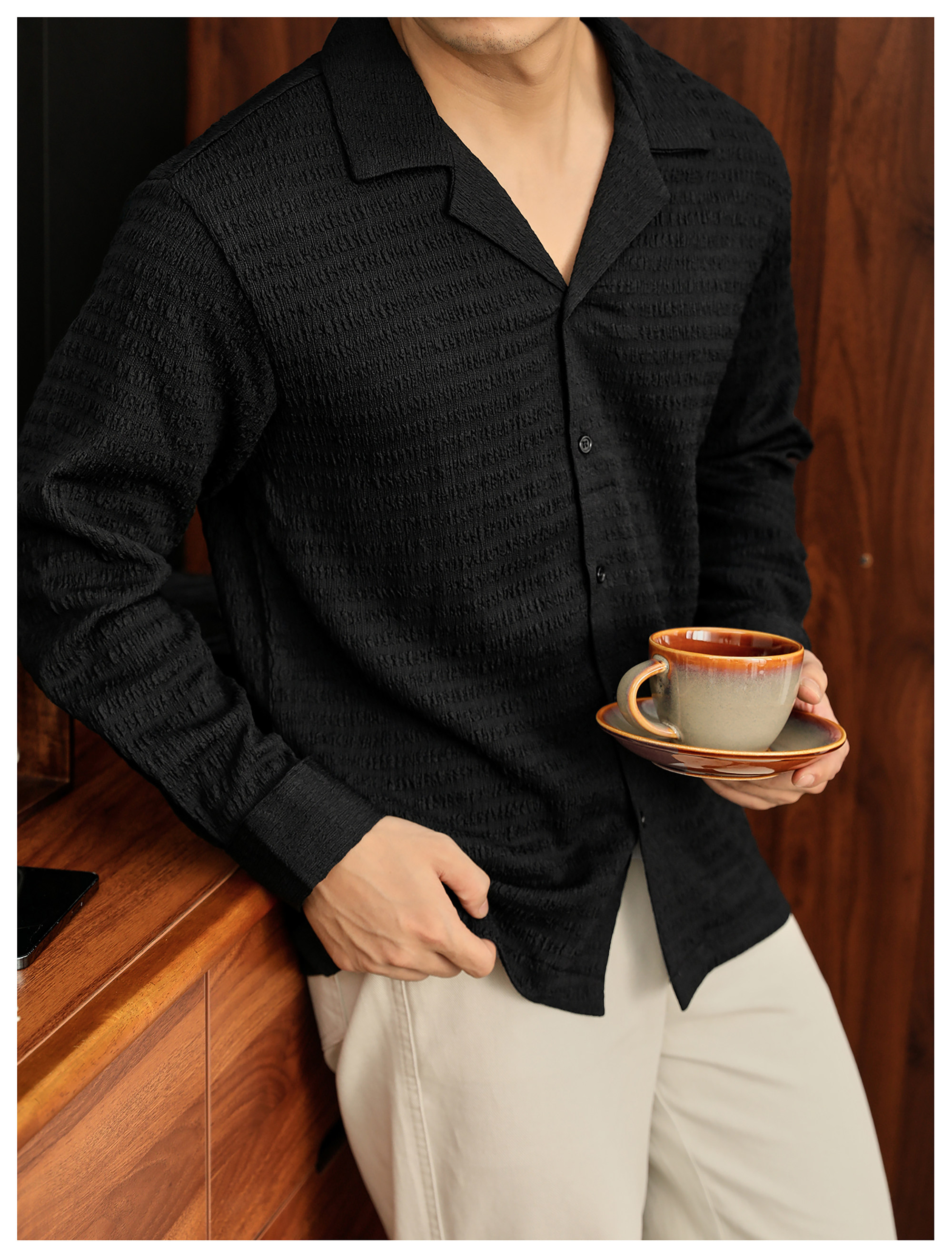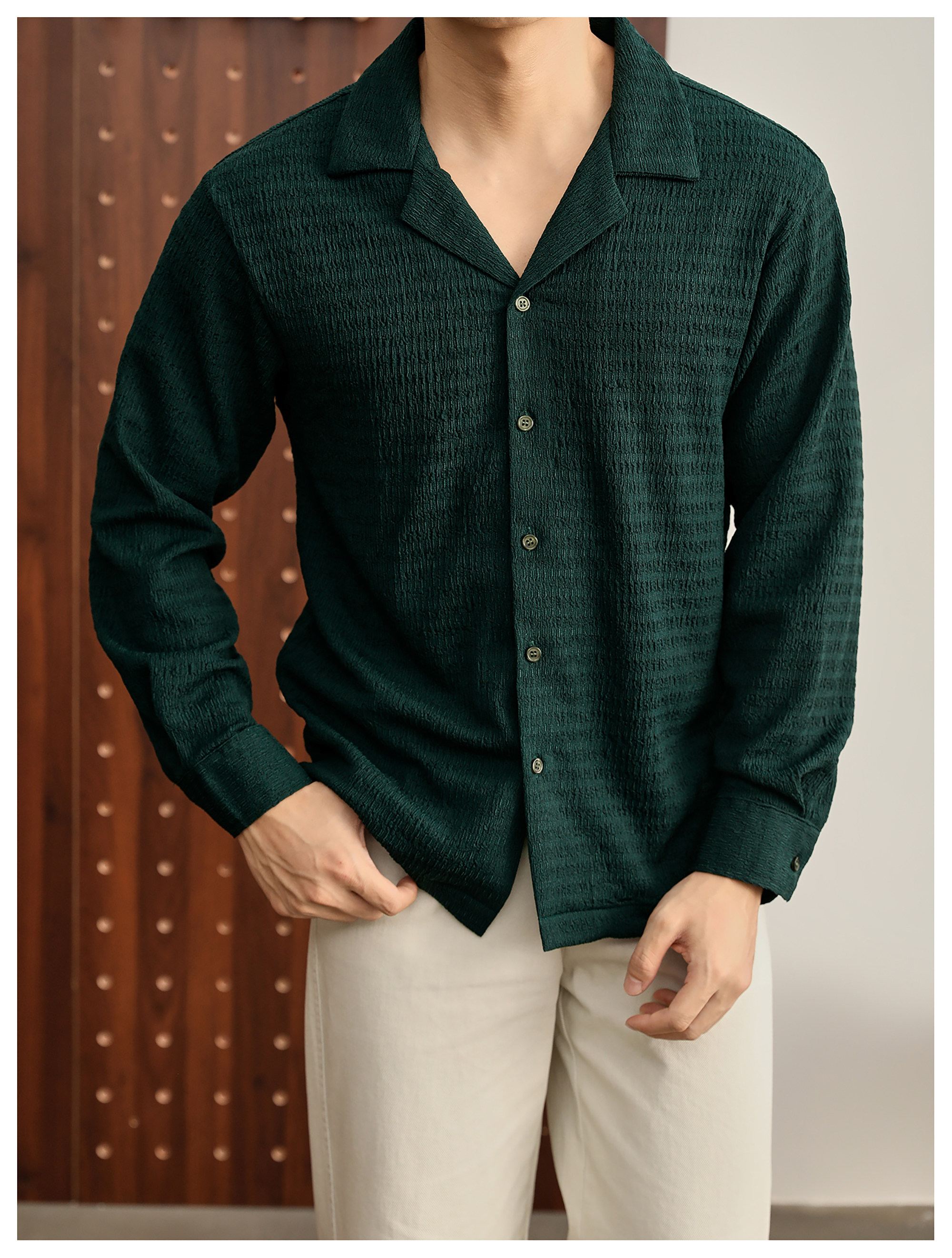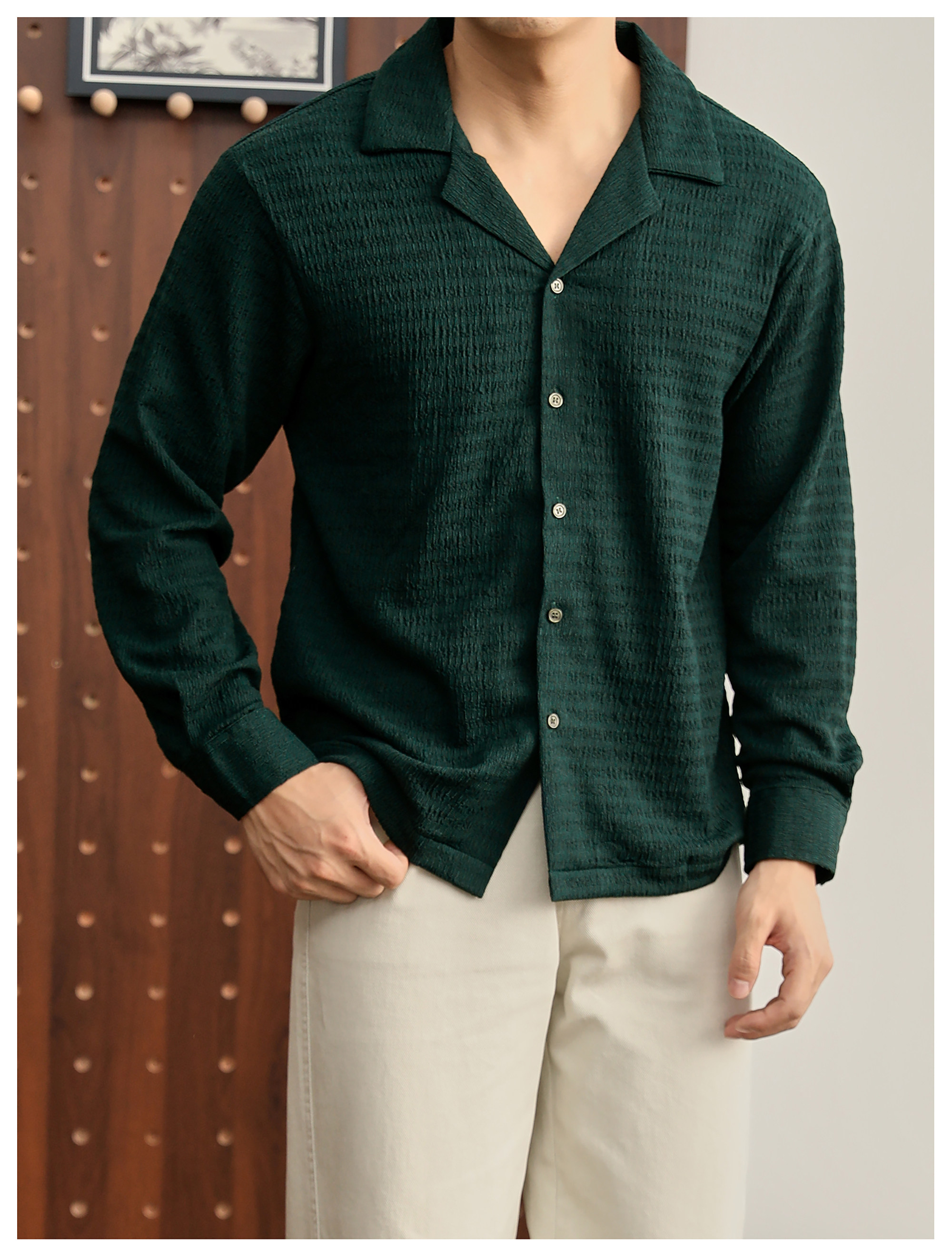 儒雅老錢風提花皺感古巴領長袖襯衫男泡泡紗肌理感襯衣