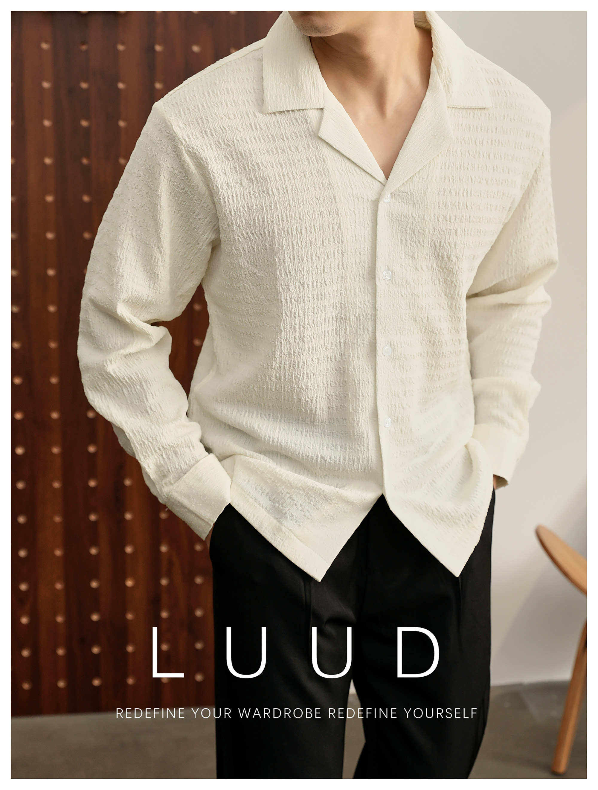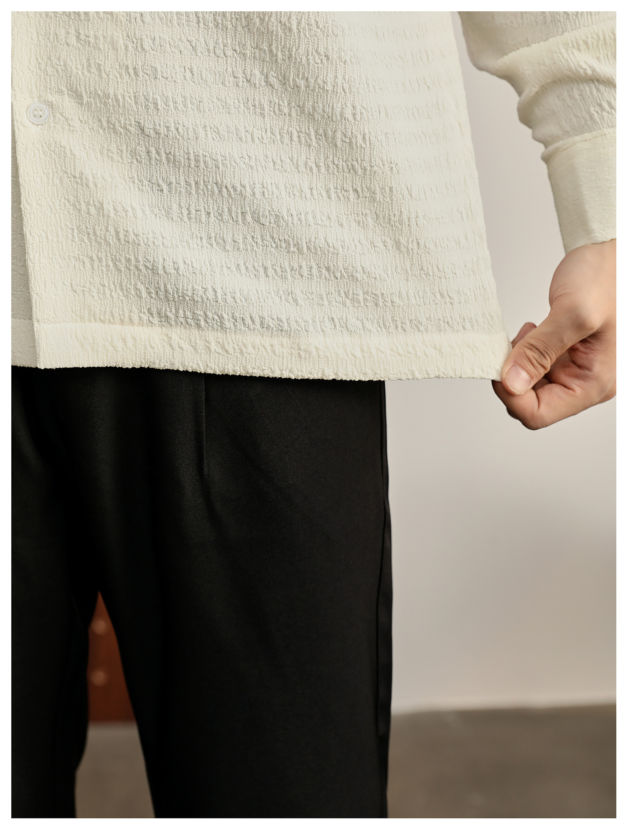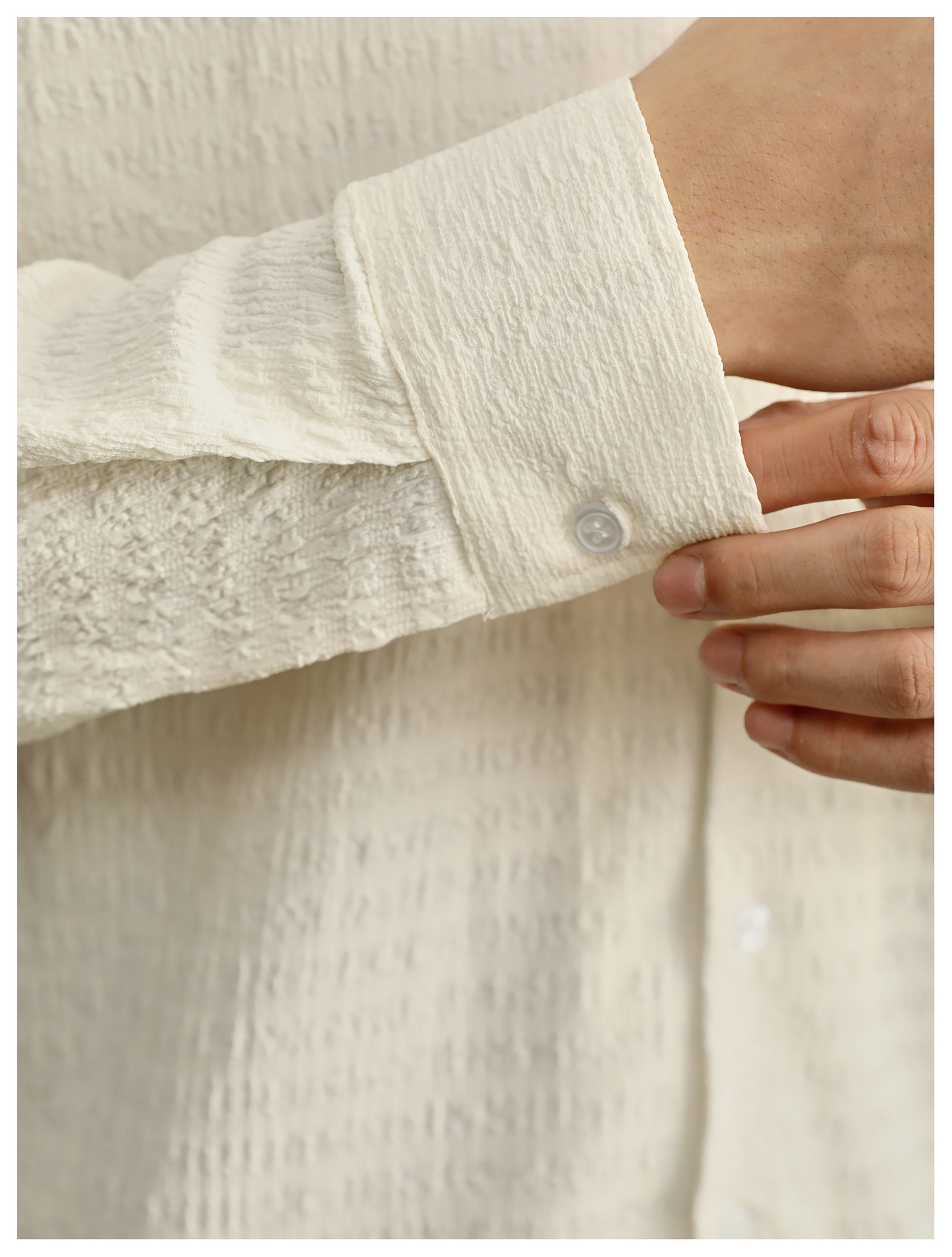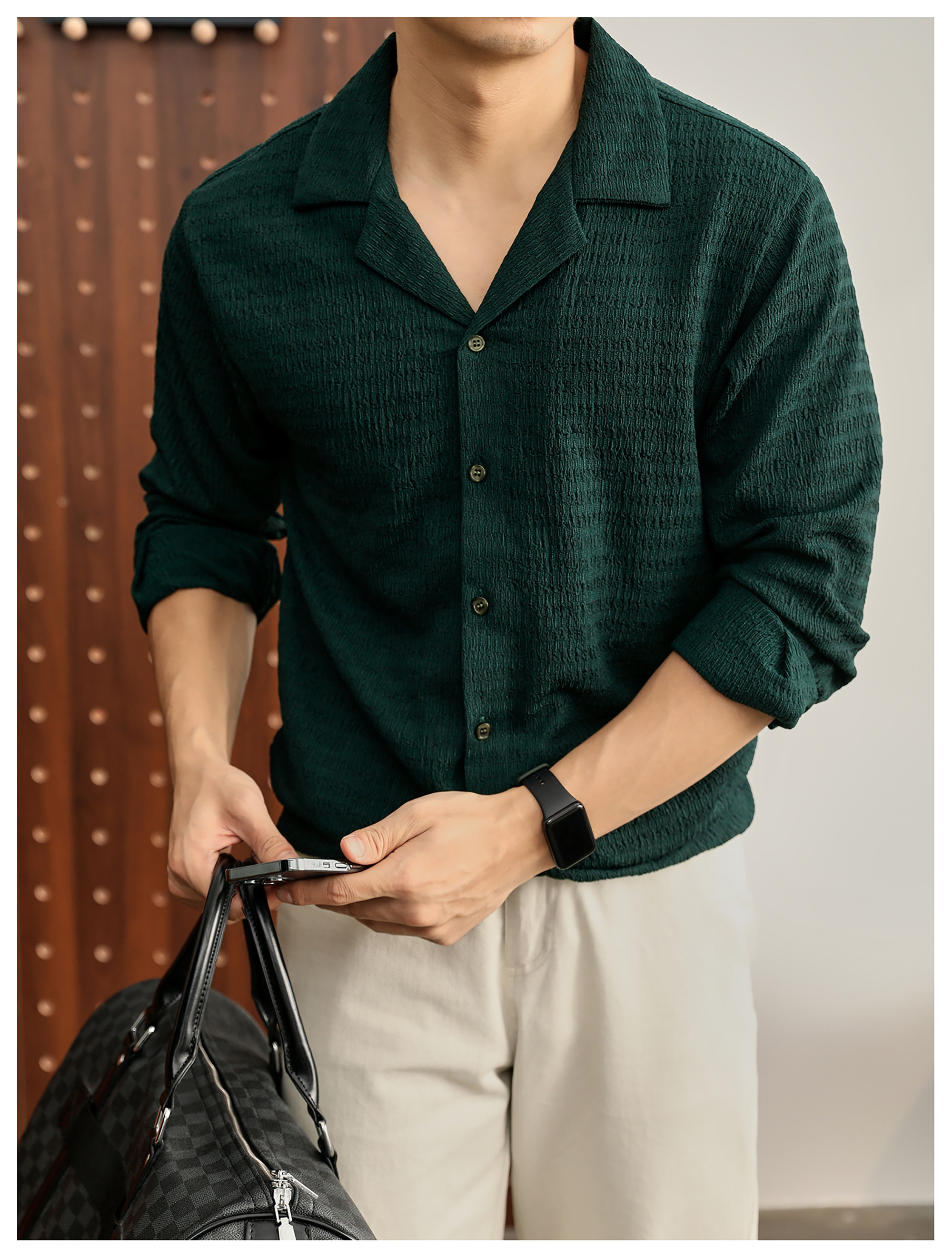 儒雅老錢風提花皺感古巴領長袖襯衫男泡泡紗肌理感襯衣