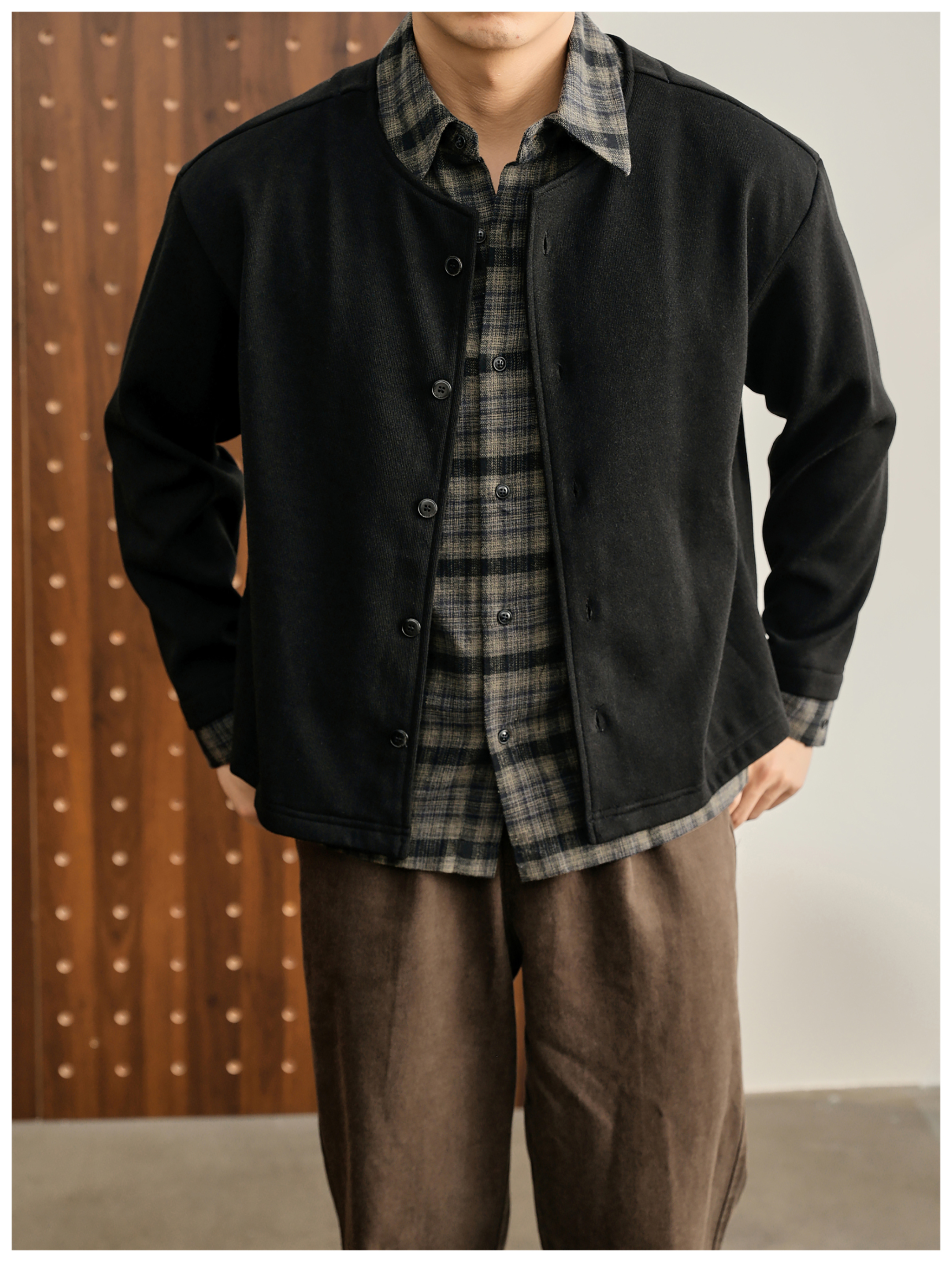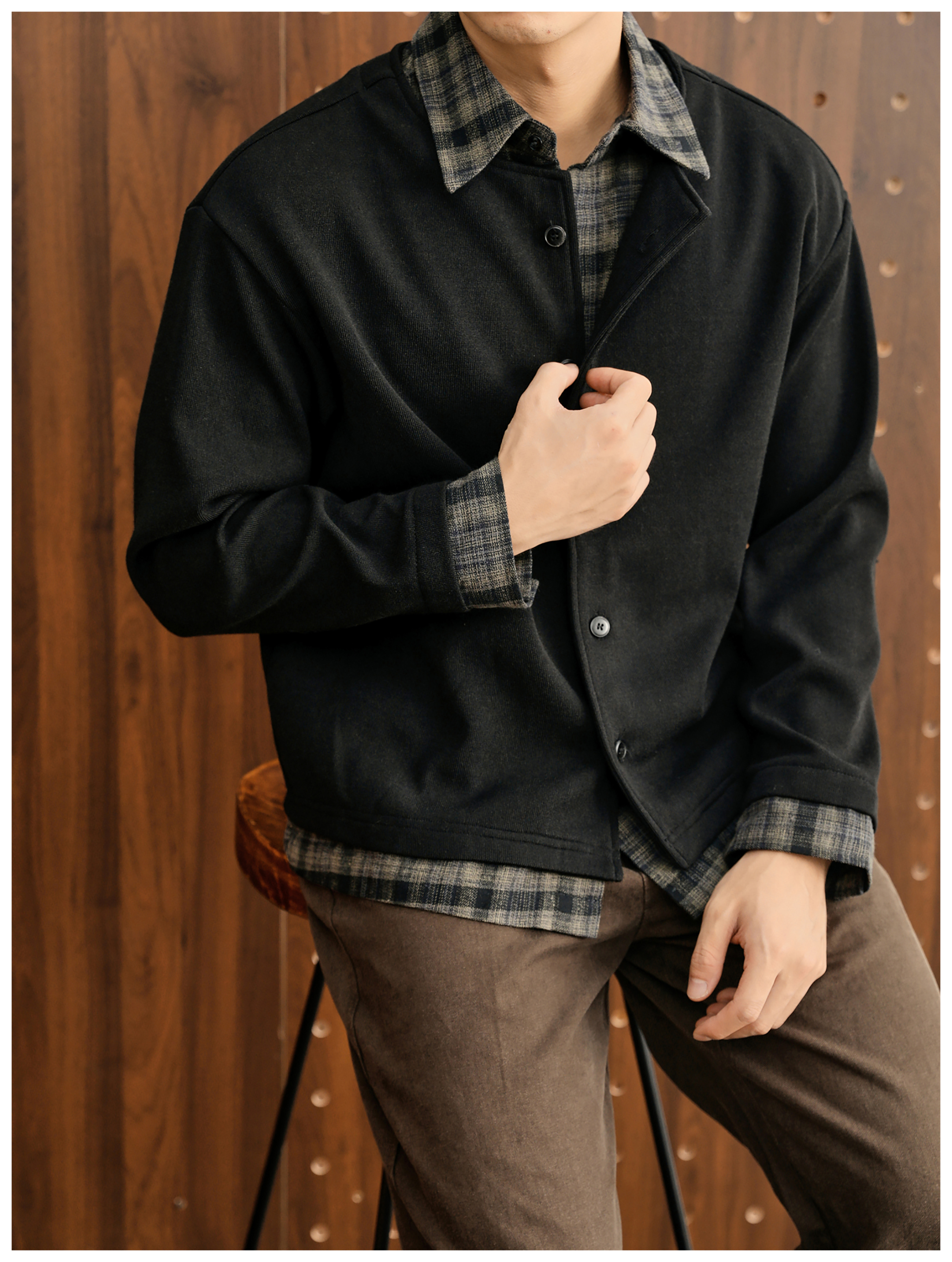 巴恩風假兩件格紋翻領針織外套開衫男100%純棉拼接雙領襯衫