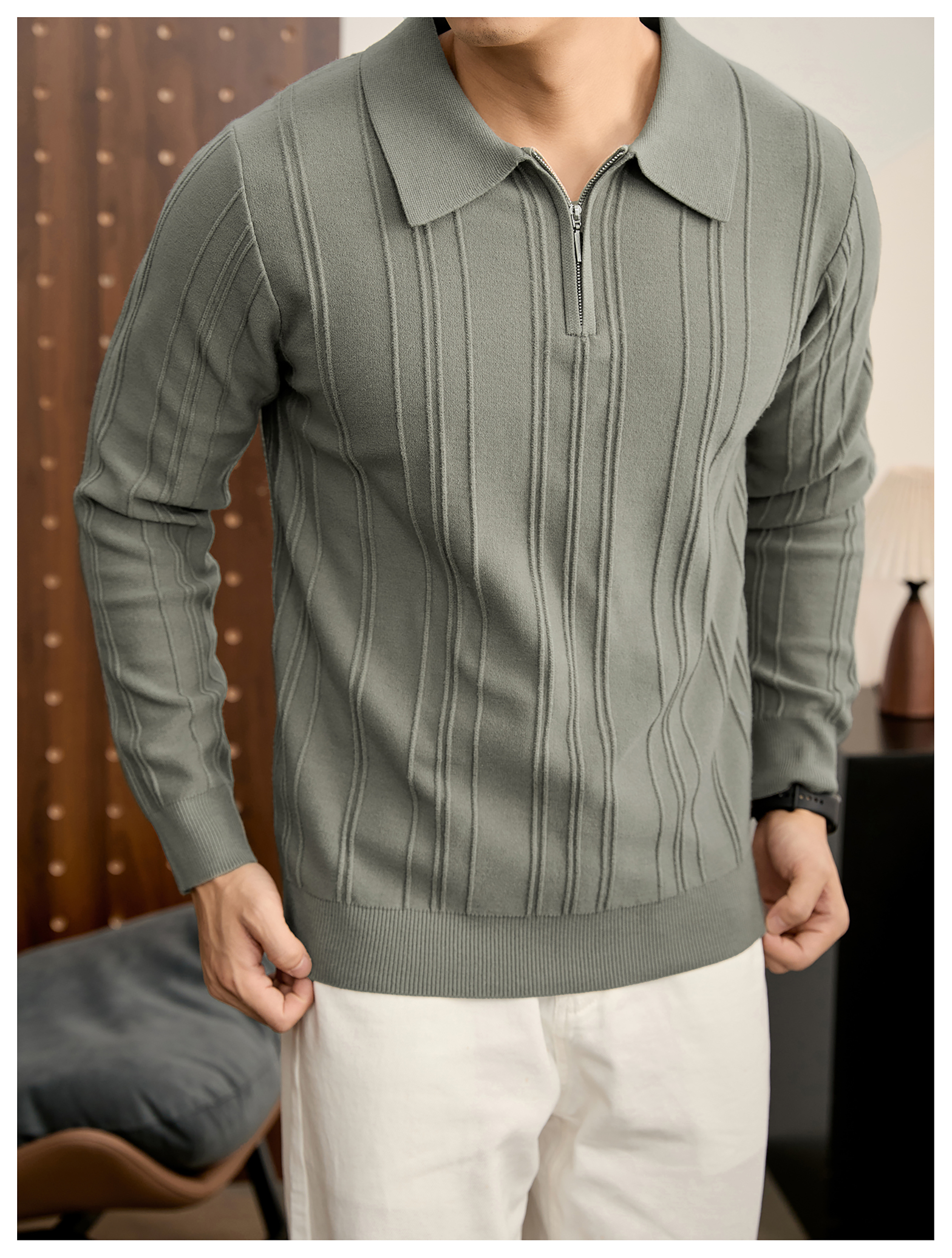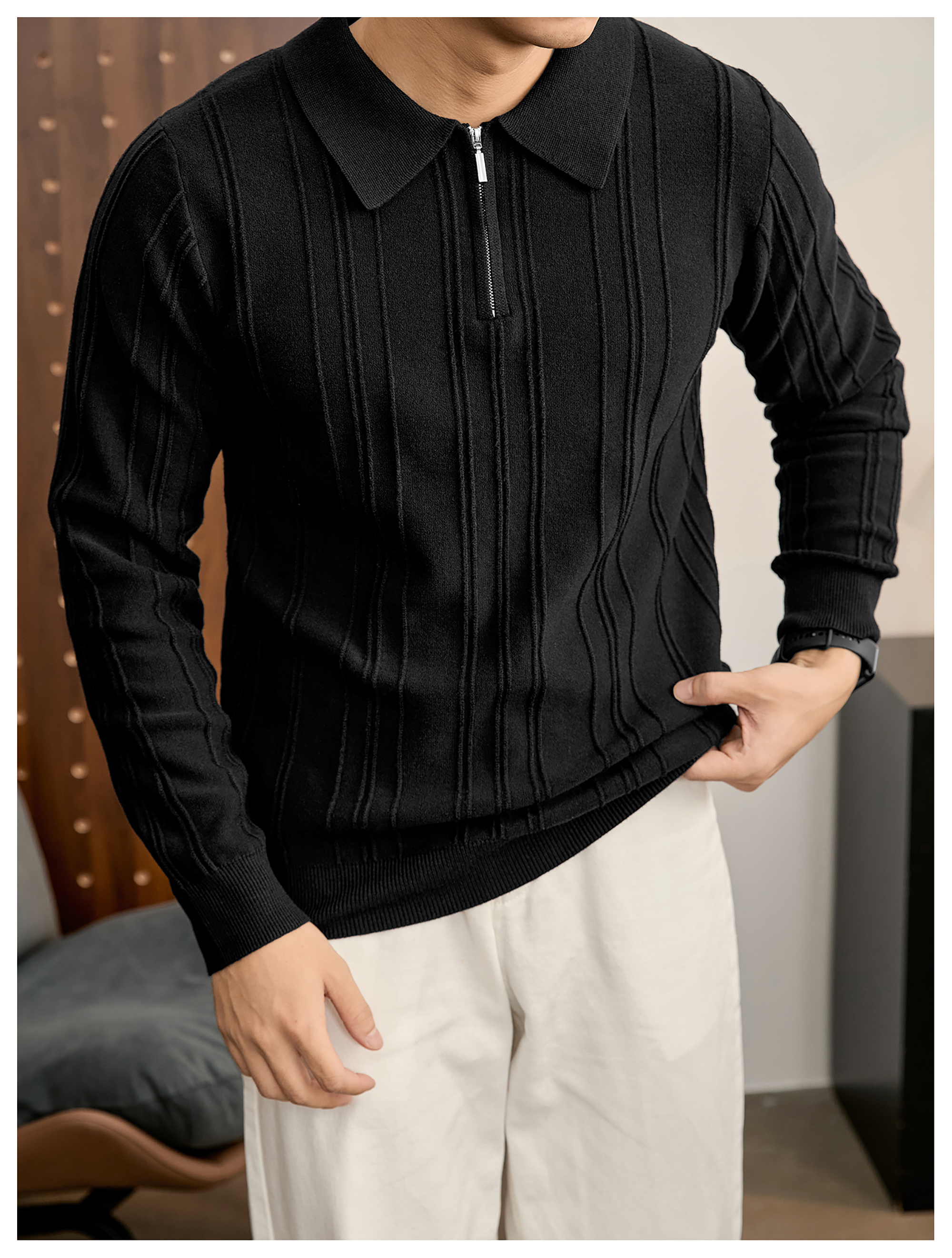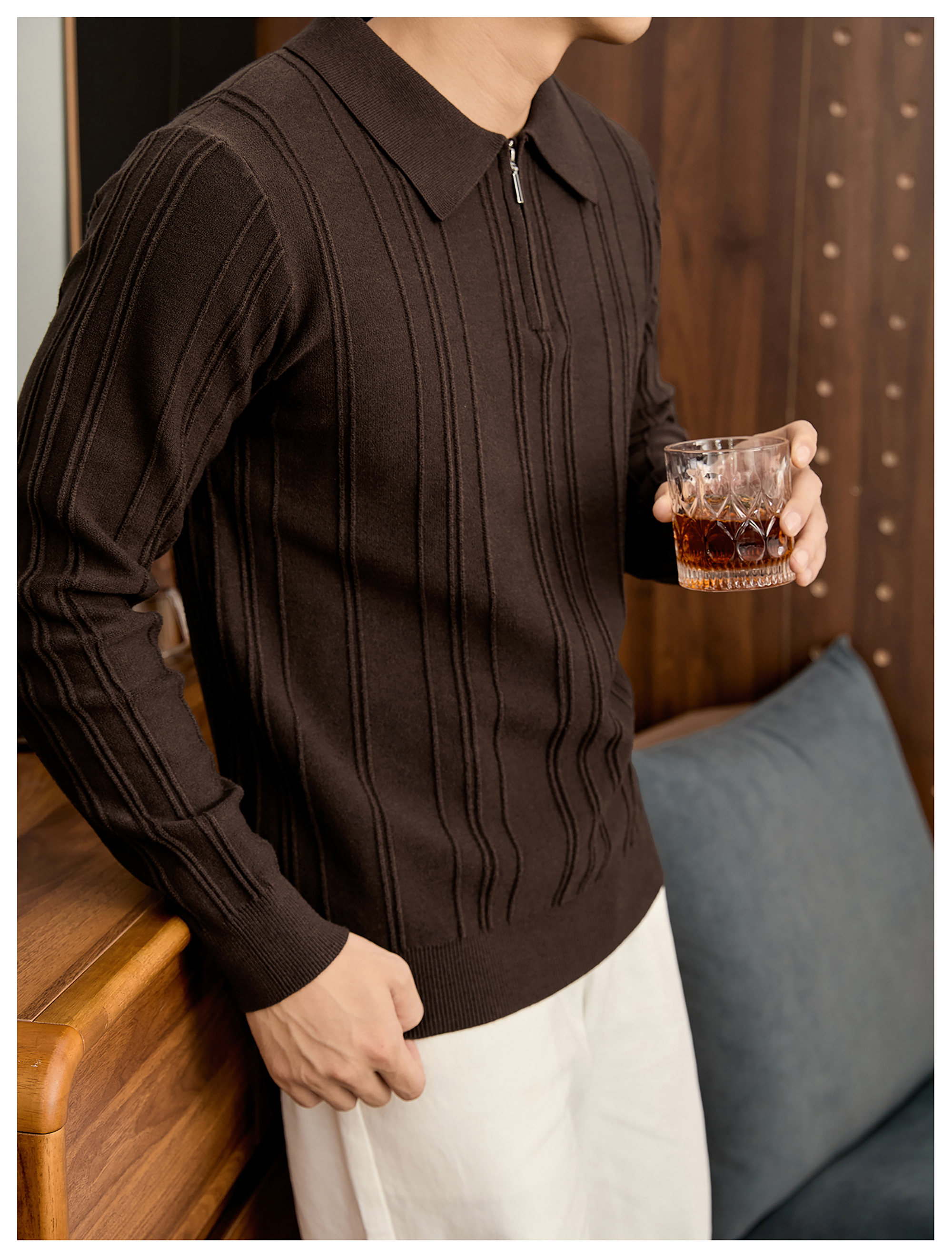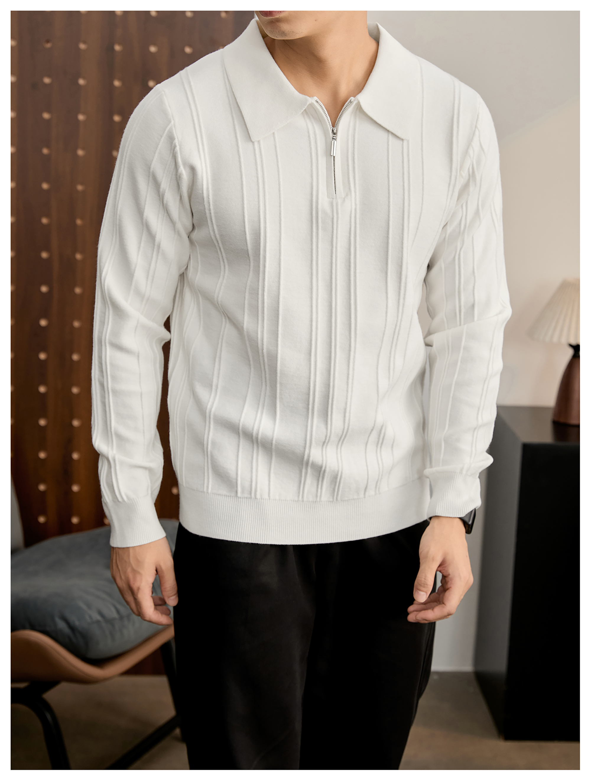 復古老錢半拉鍊翻領針織衫男秋冬豎紋肌理提花抗起球POLO衫