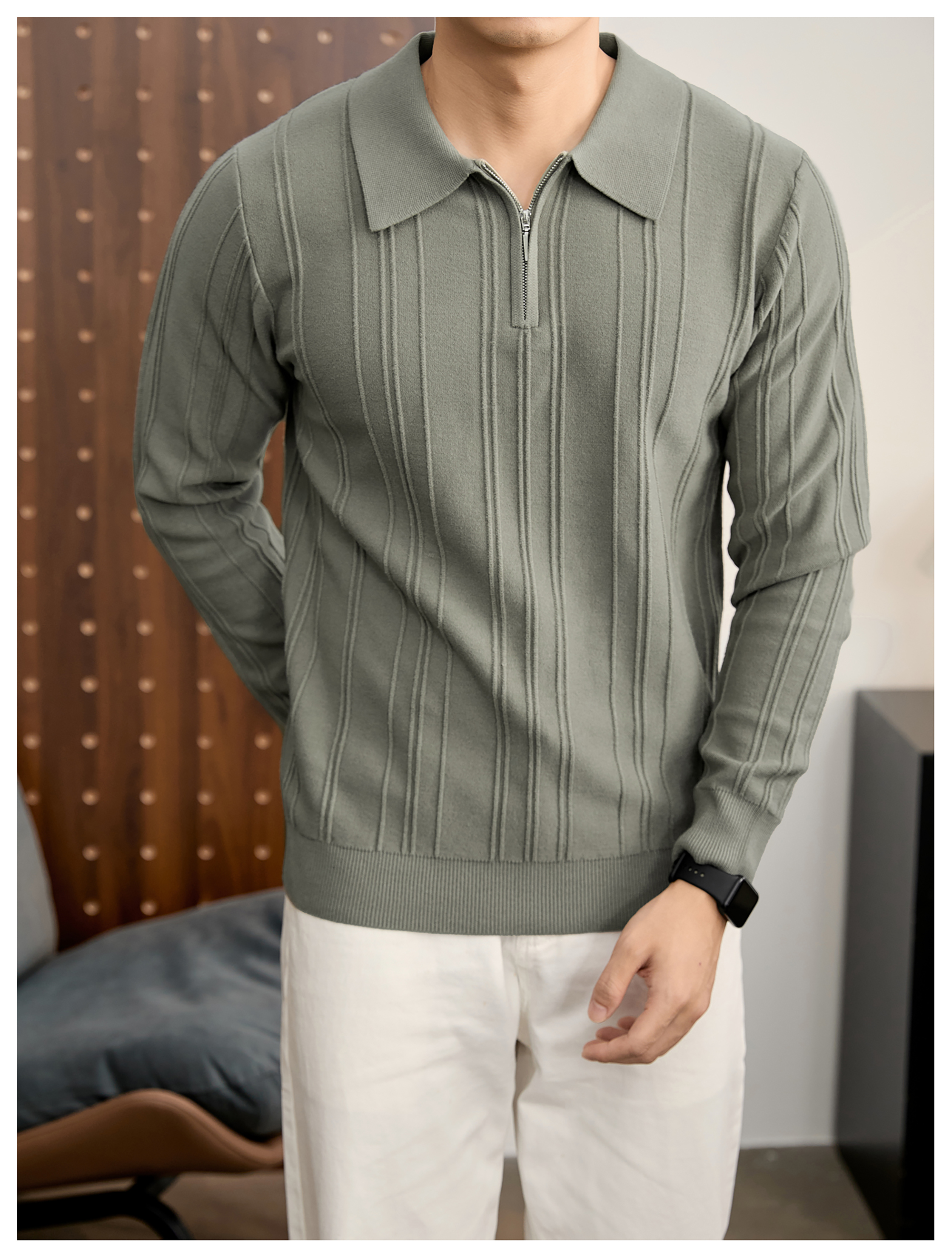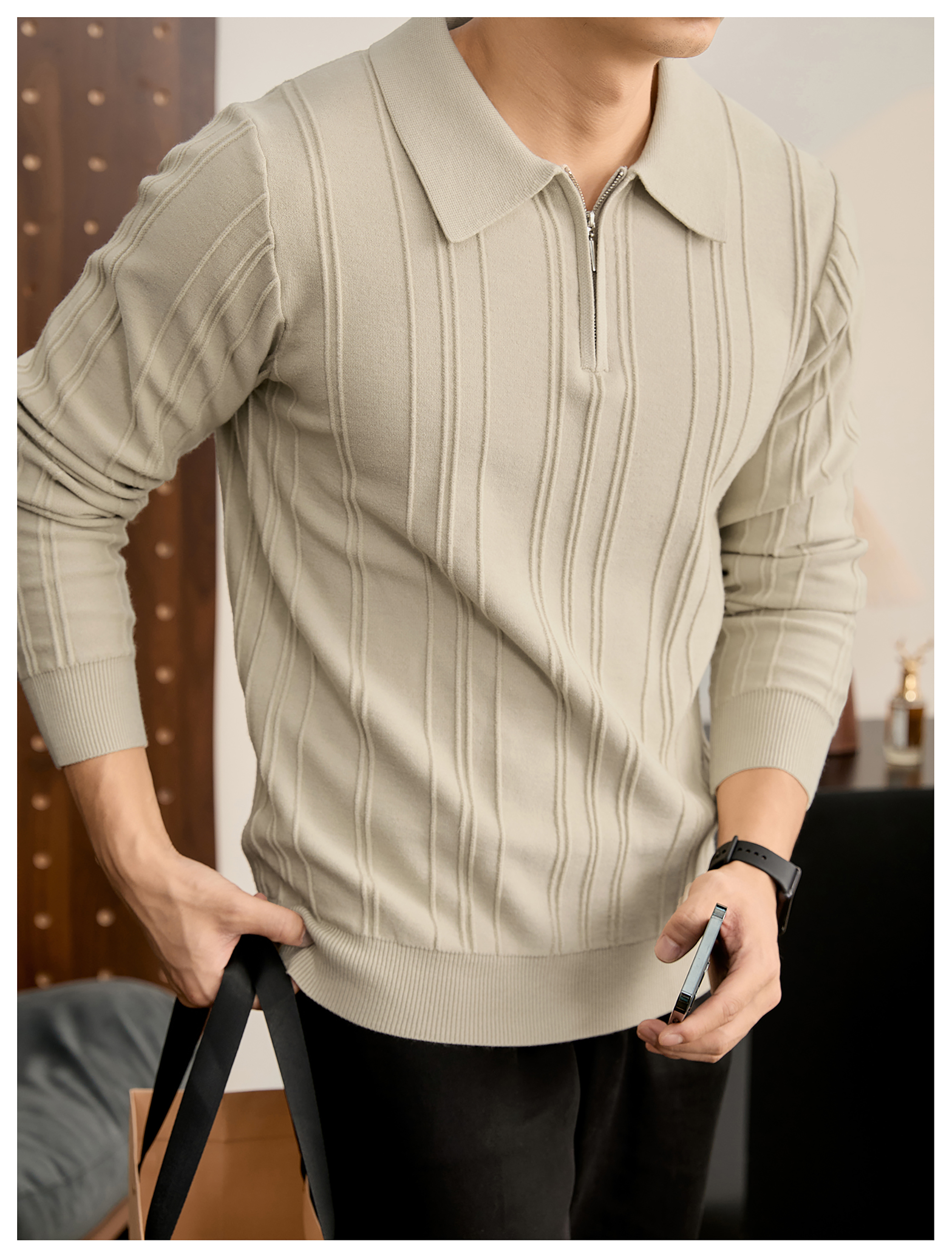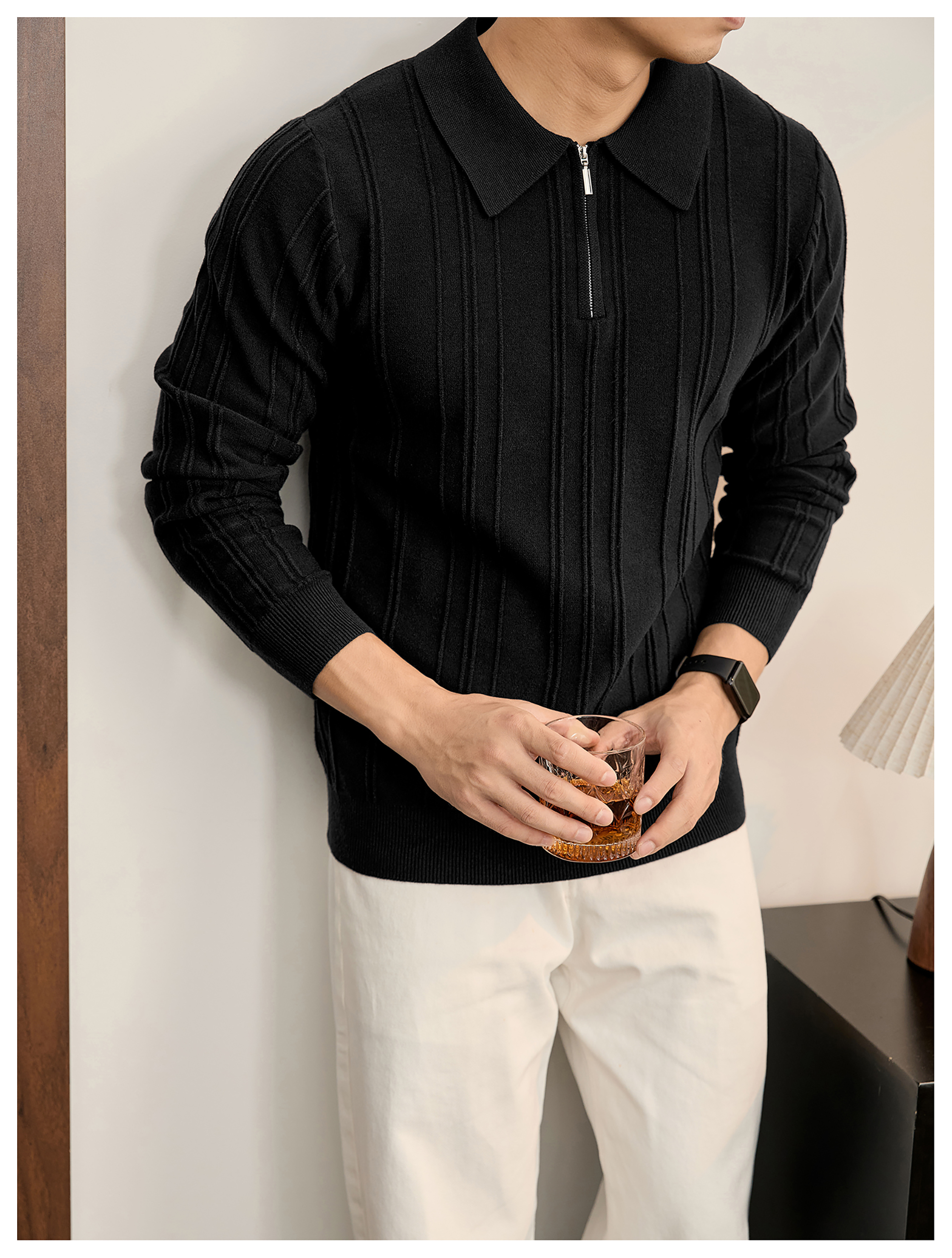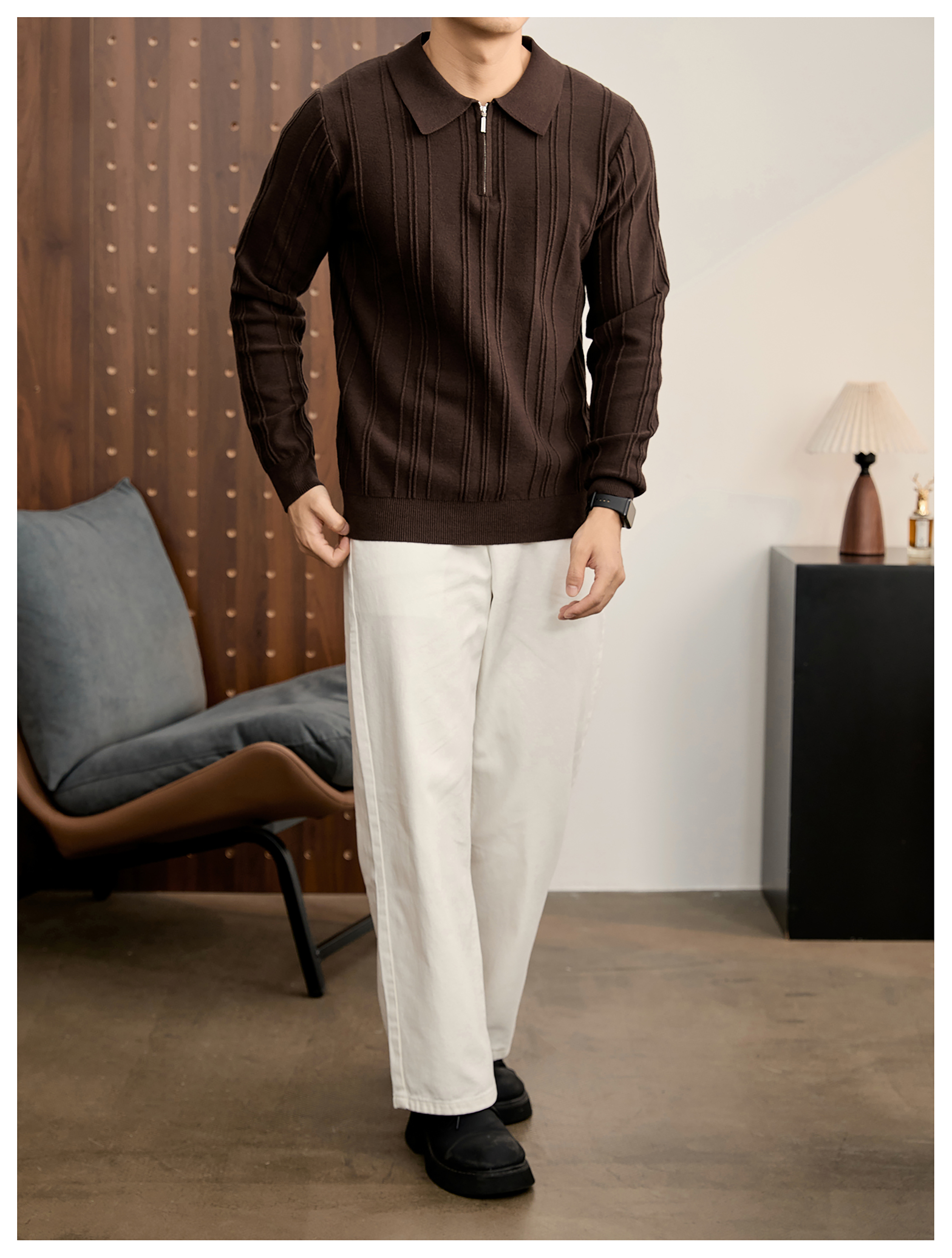 復古老錢半拉鍊翻領針織衫男秋冬豎紋肌理提花抗起球POLO衫