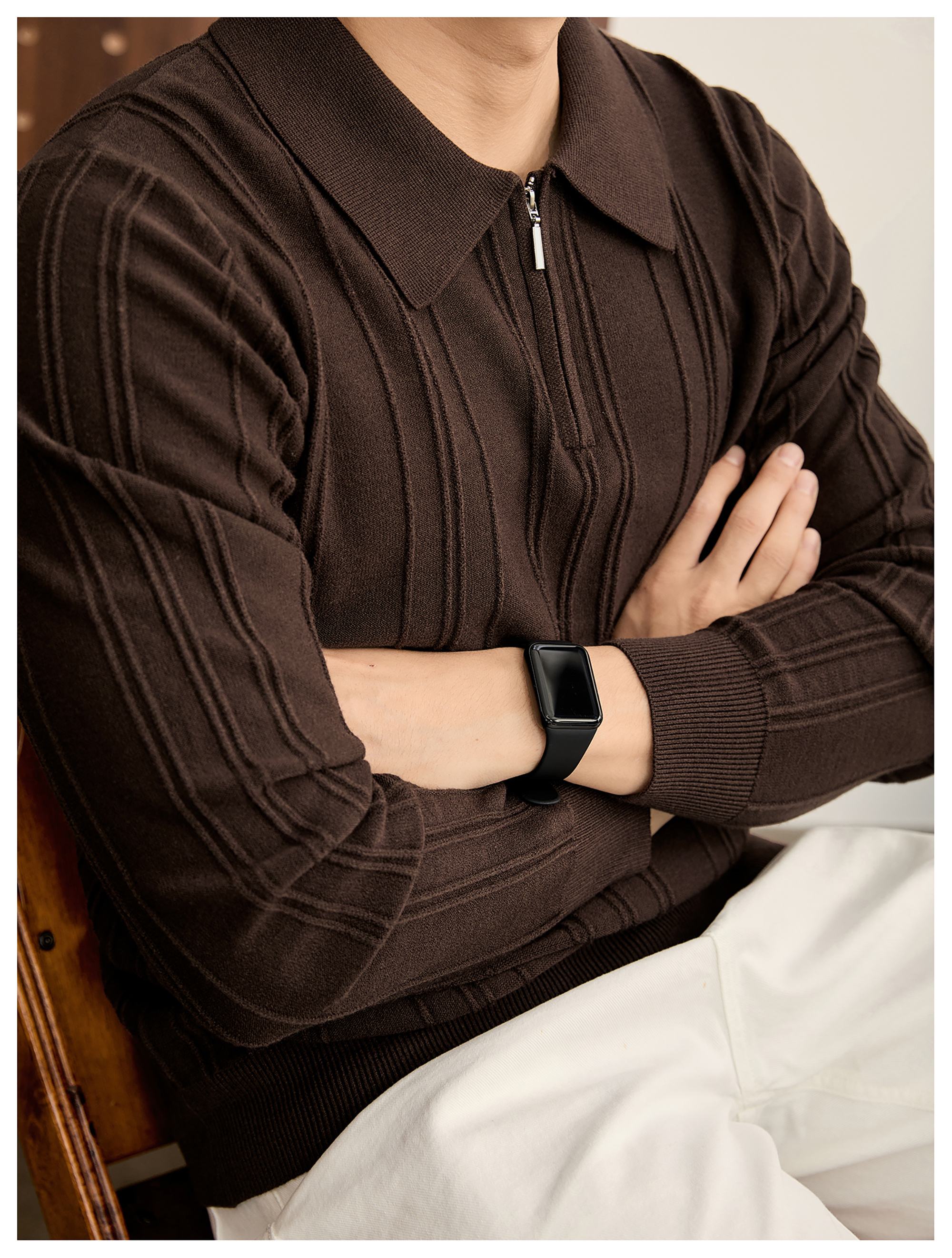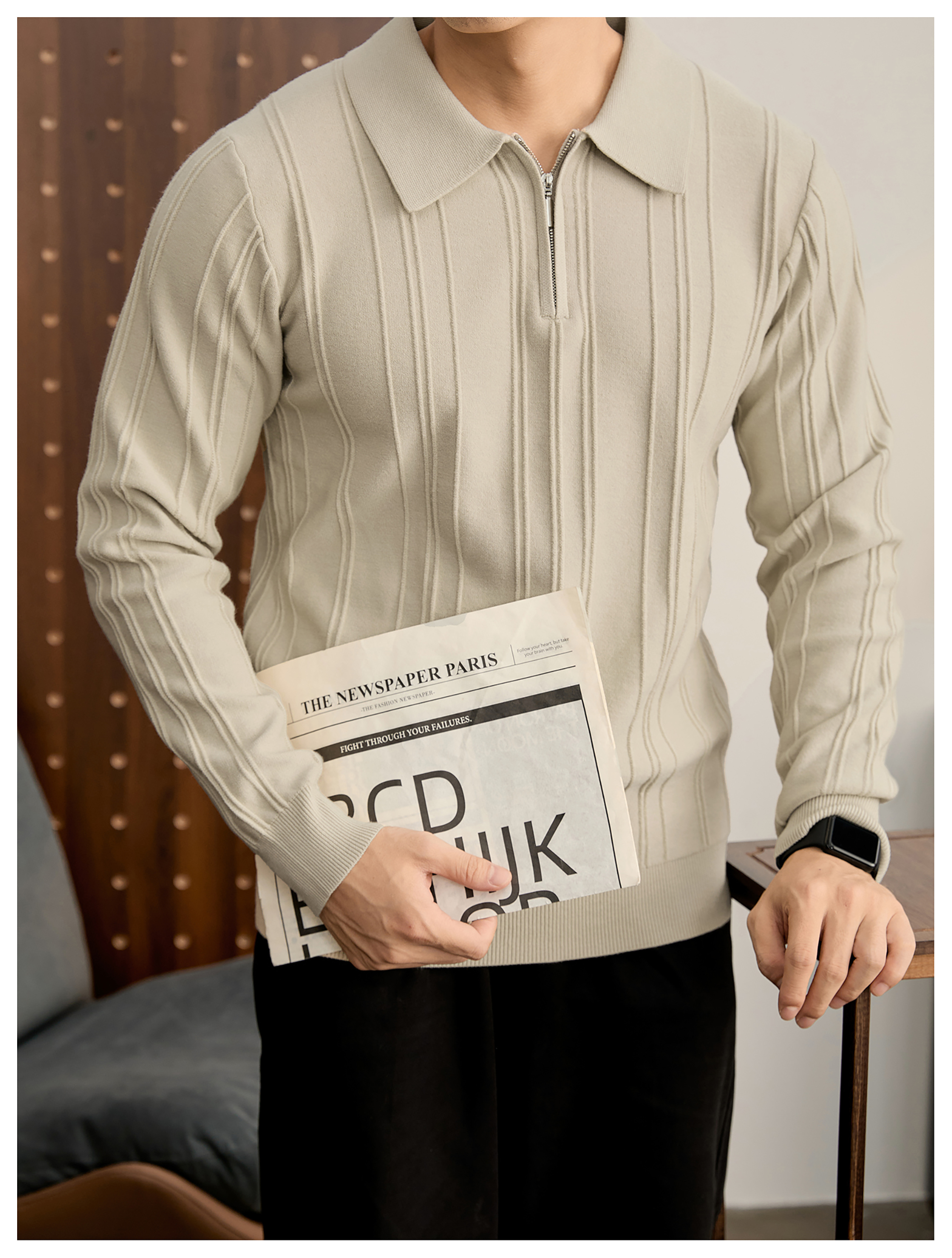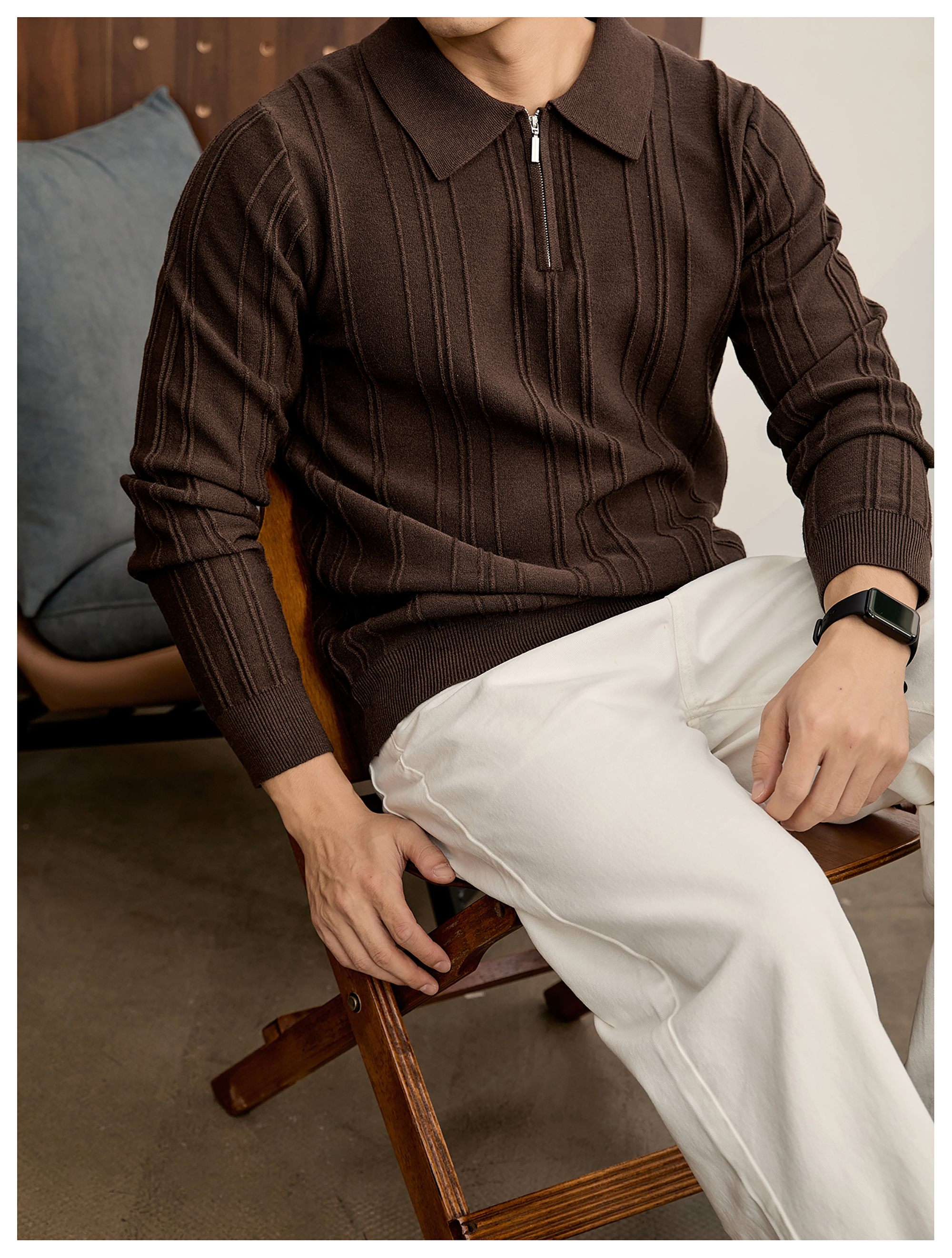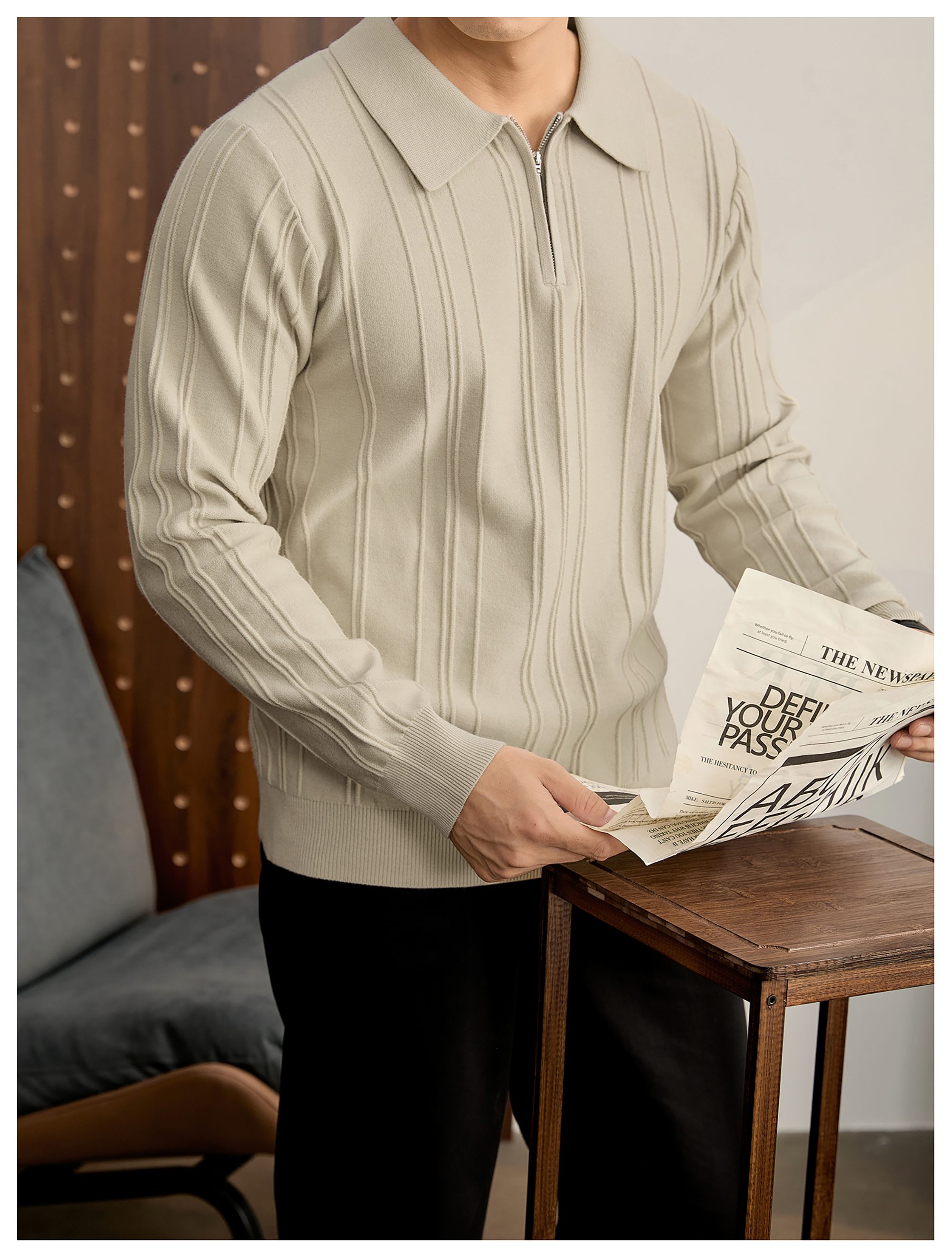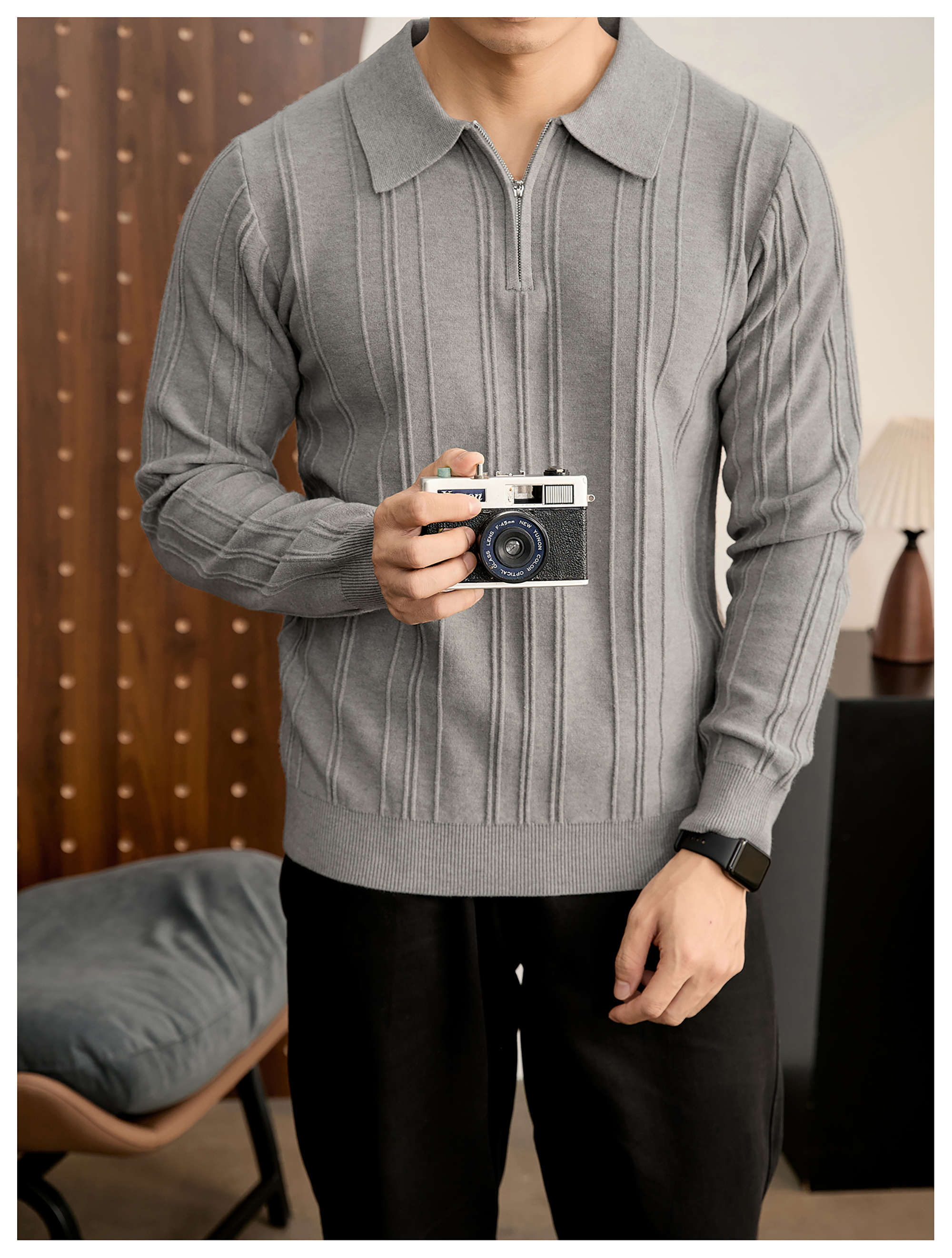 復古老錢半拉鍊翻領針織衫男秋冬豎紋肌理提花抗起球POLO衫