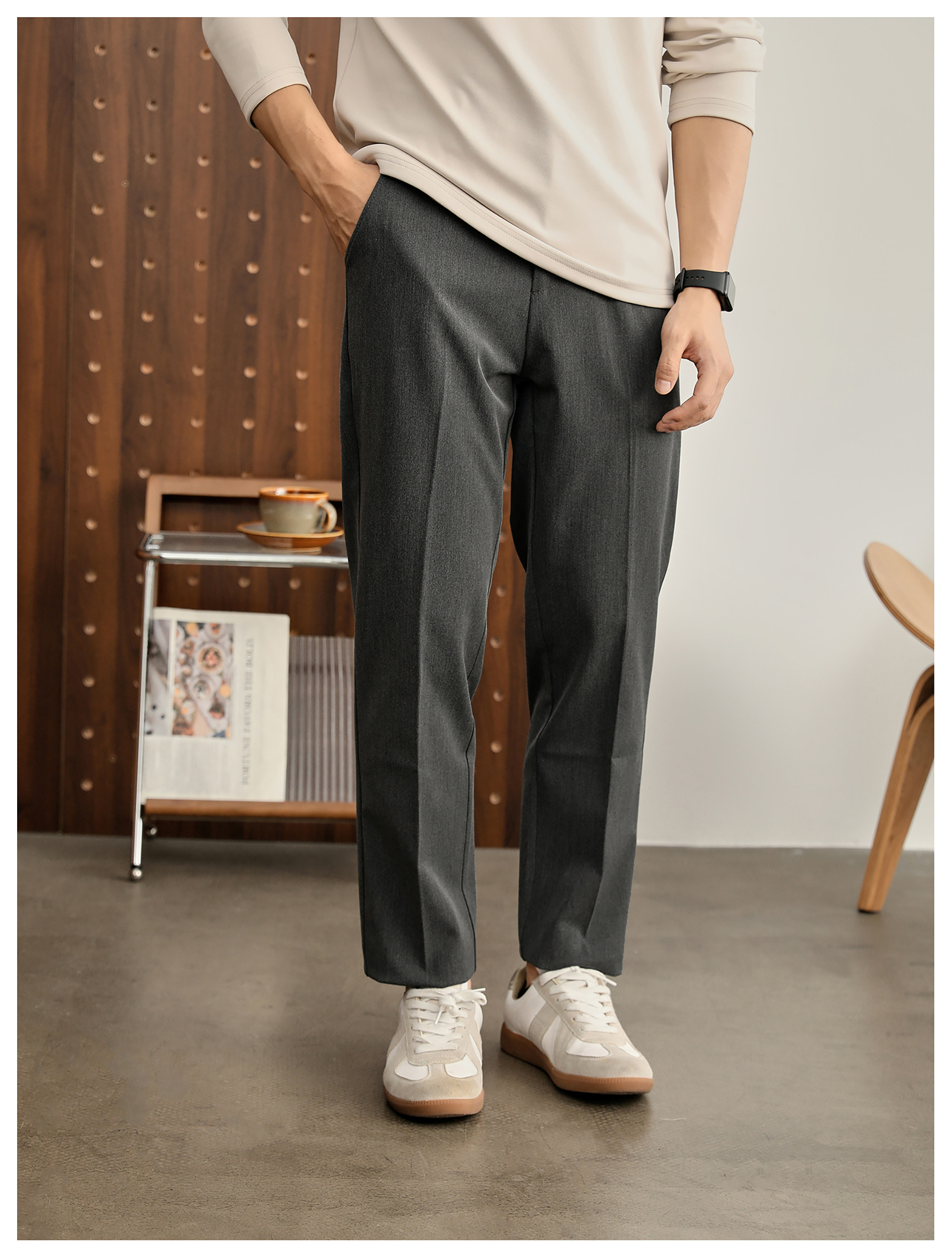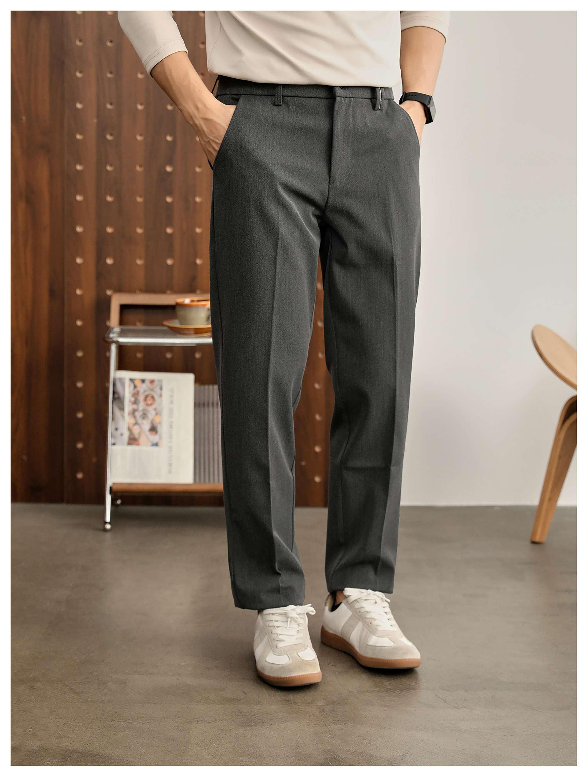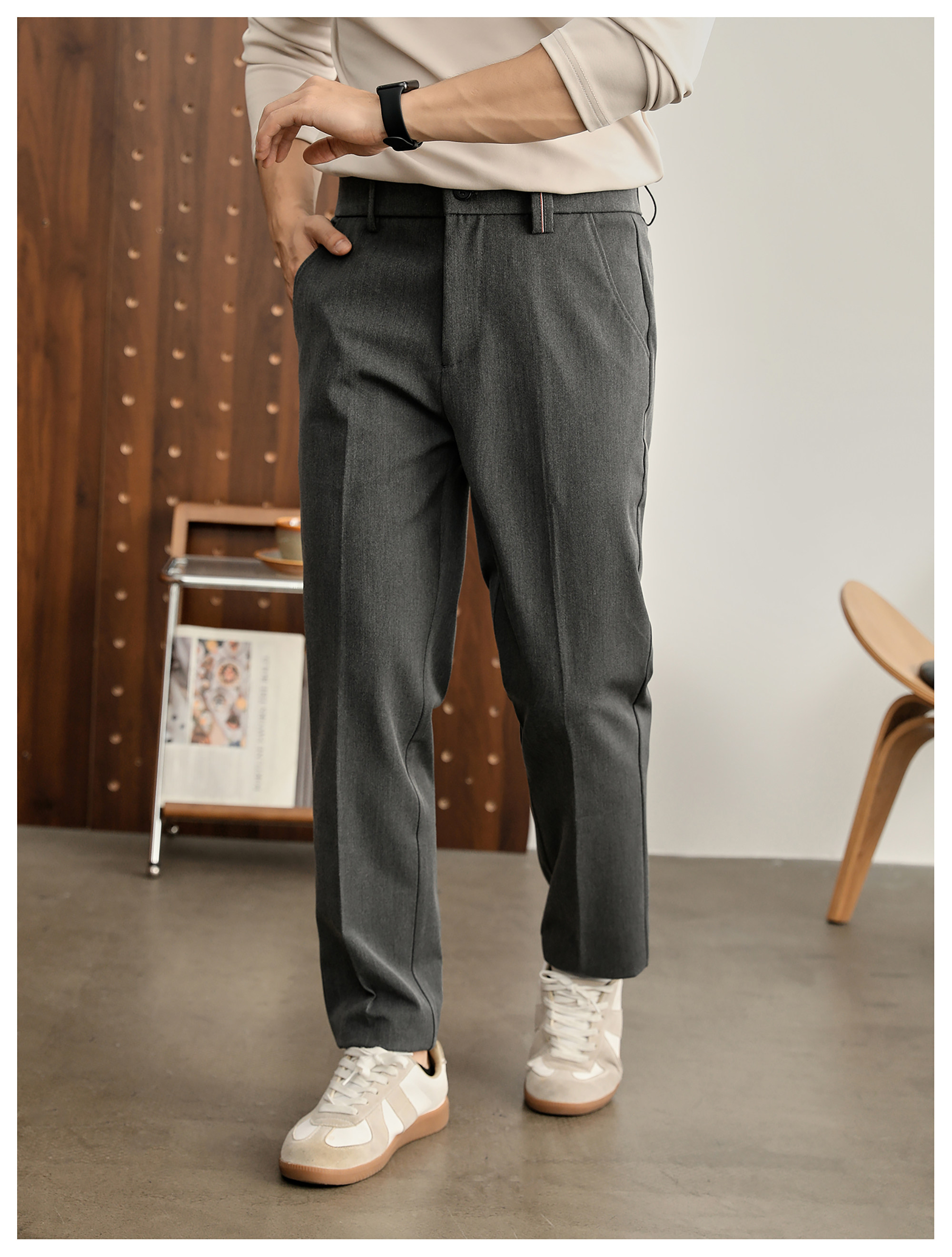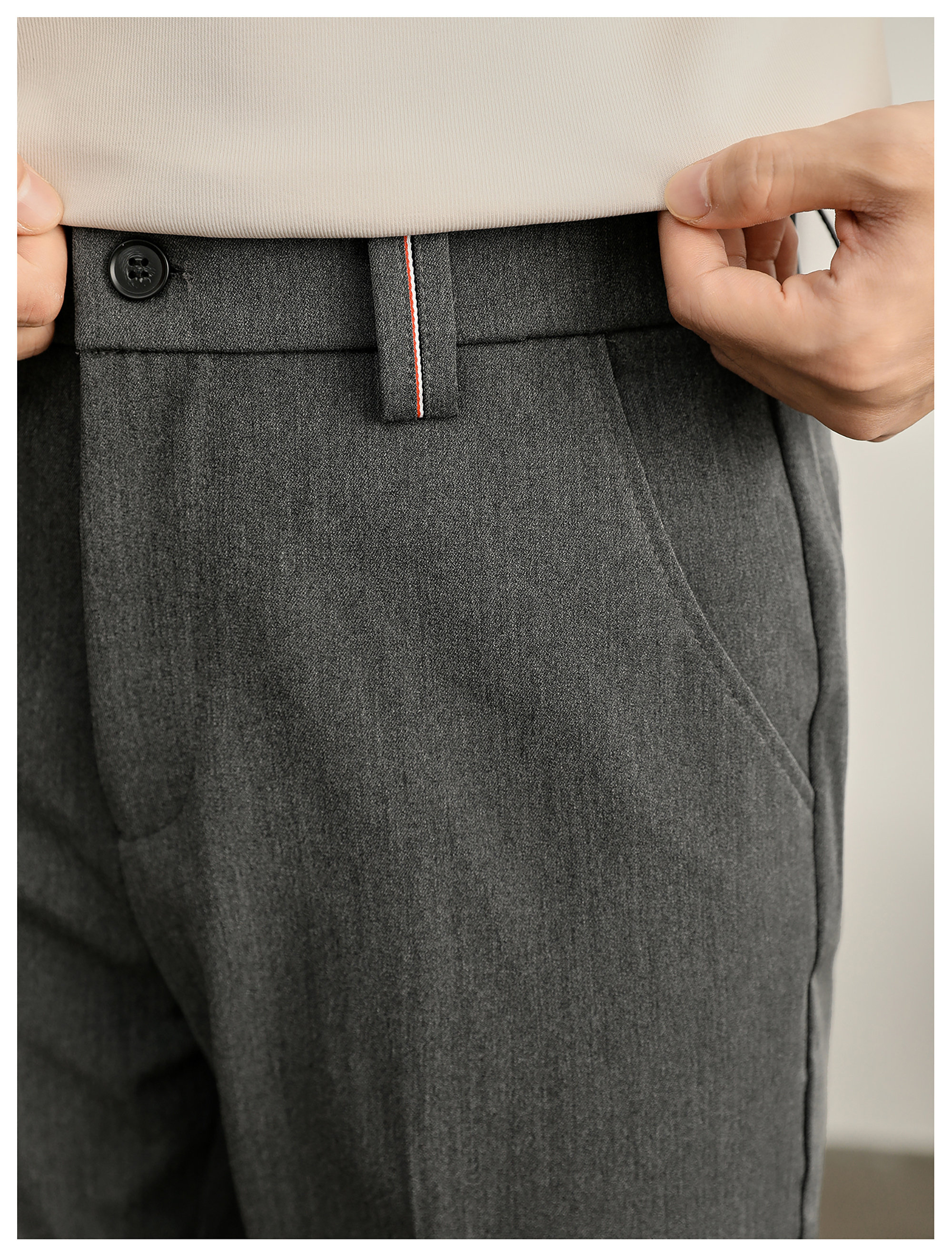時尚極簡細斜紋色紡休閒西褲男腰頭三色線設計抗皺免燙長褲