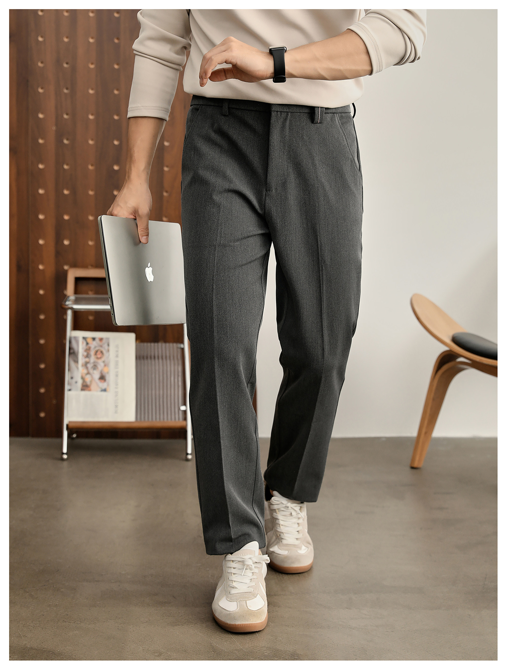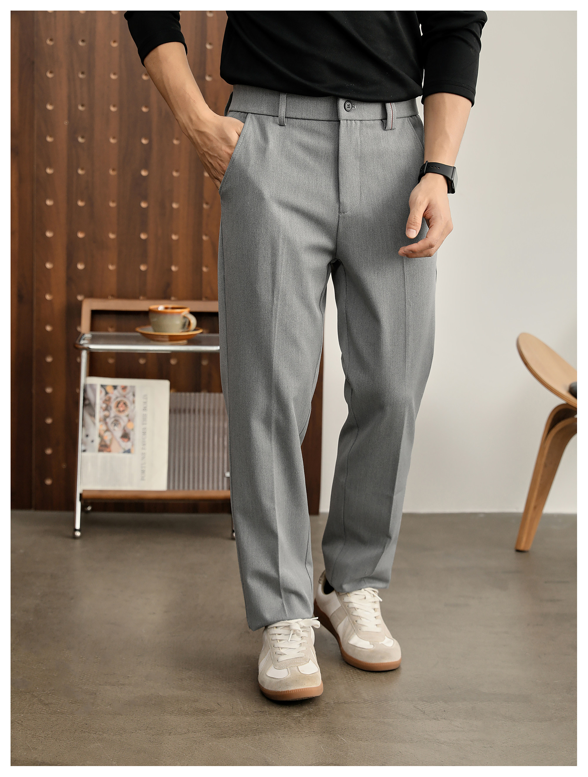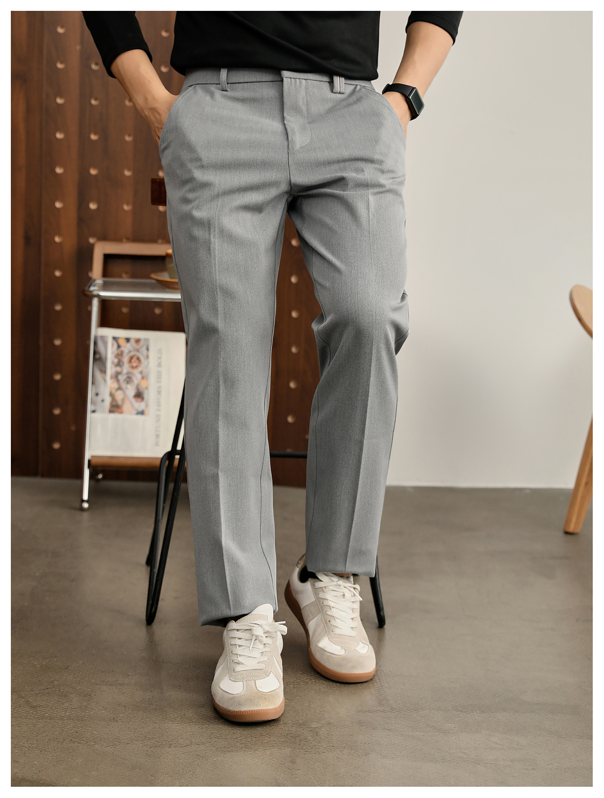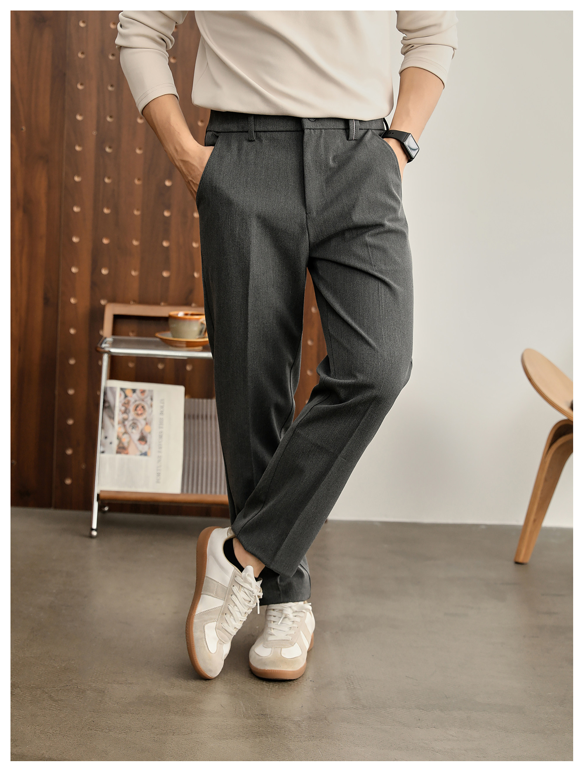 時尚極簡細斜紋色紡休閒西褲男腰頭三色線設計抗皺免燙長褲