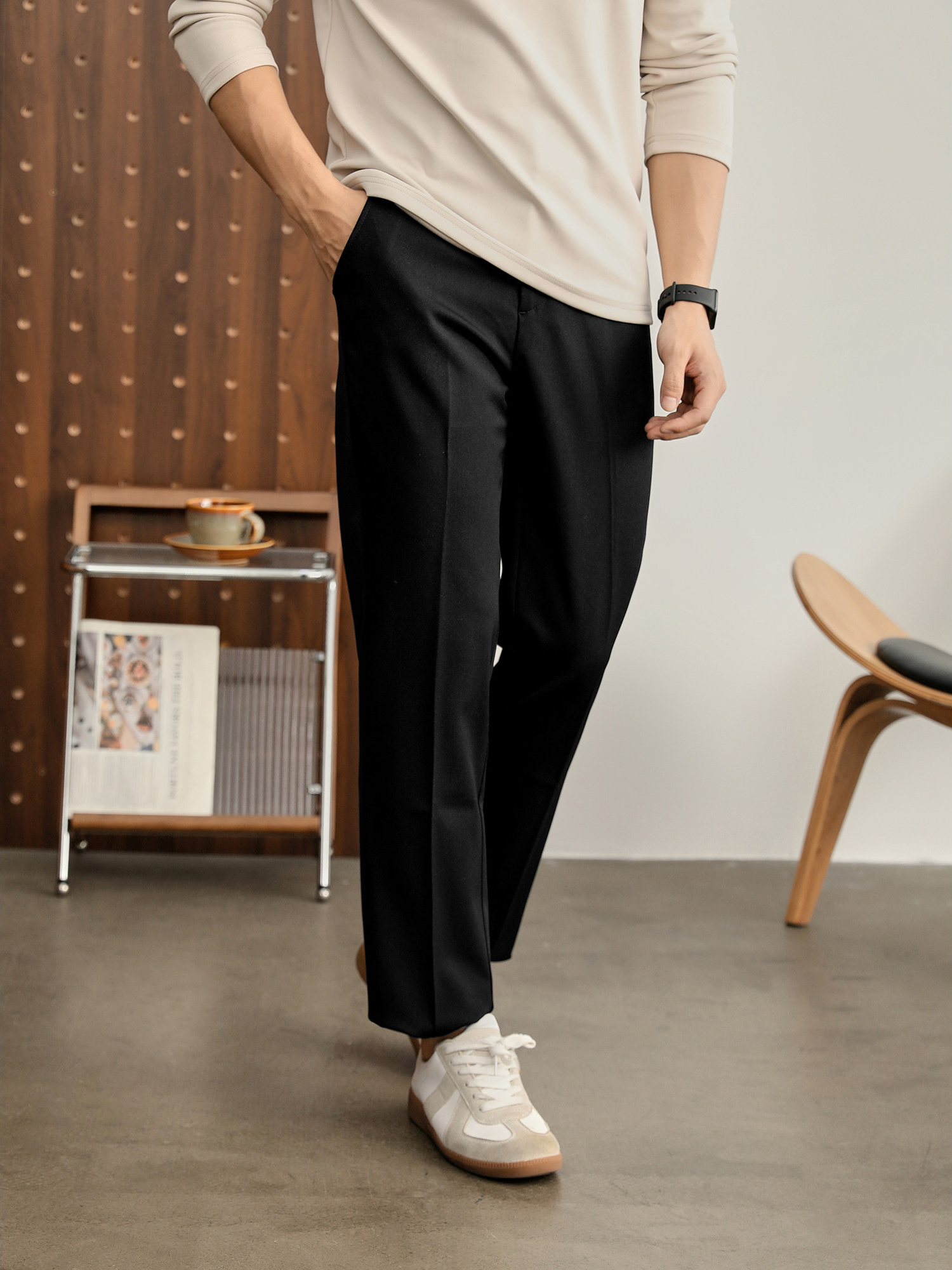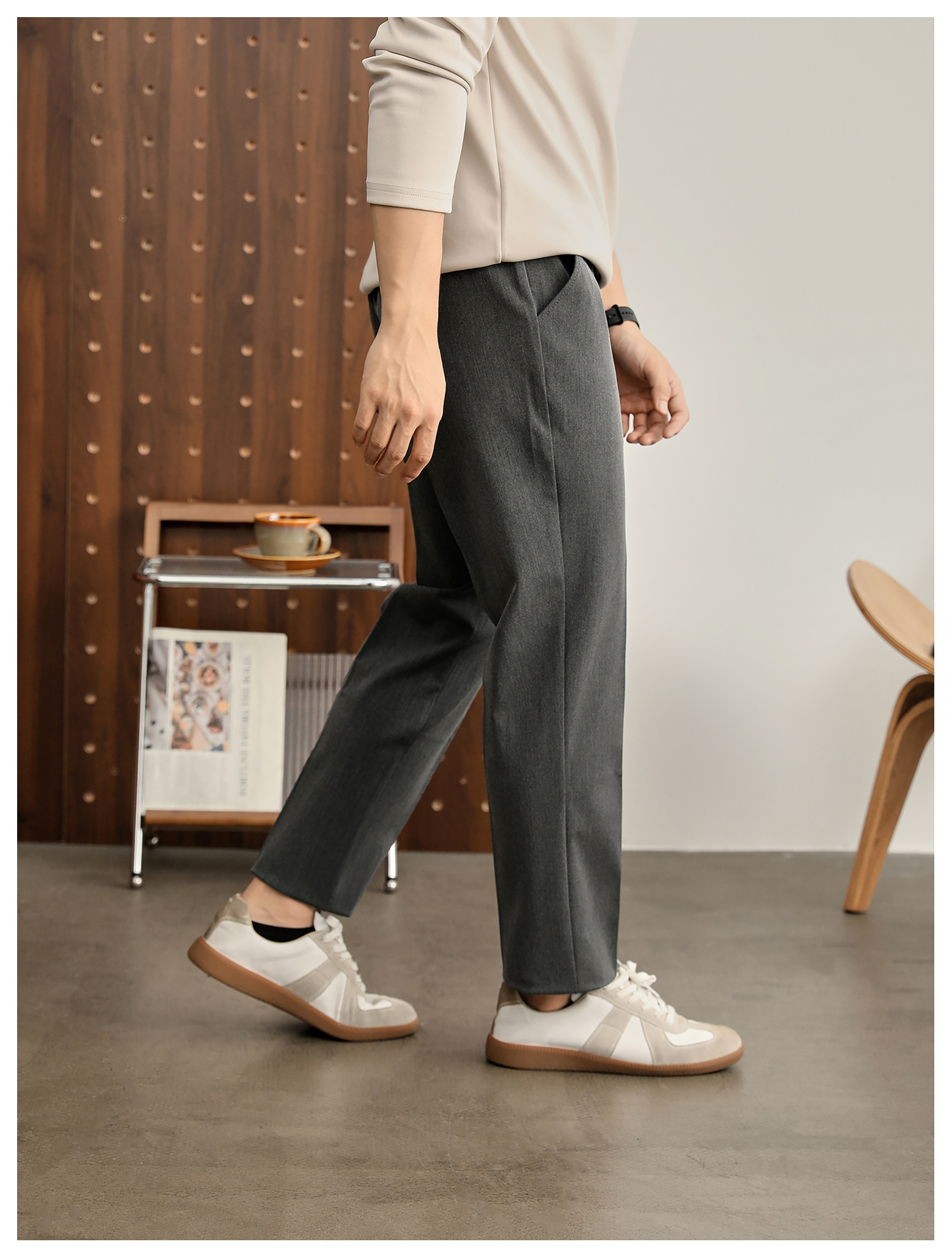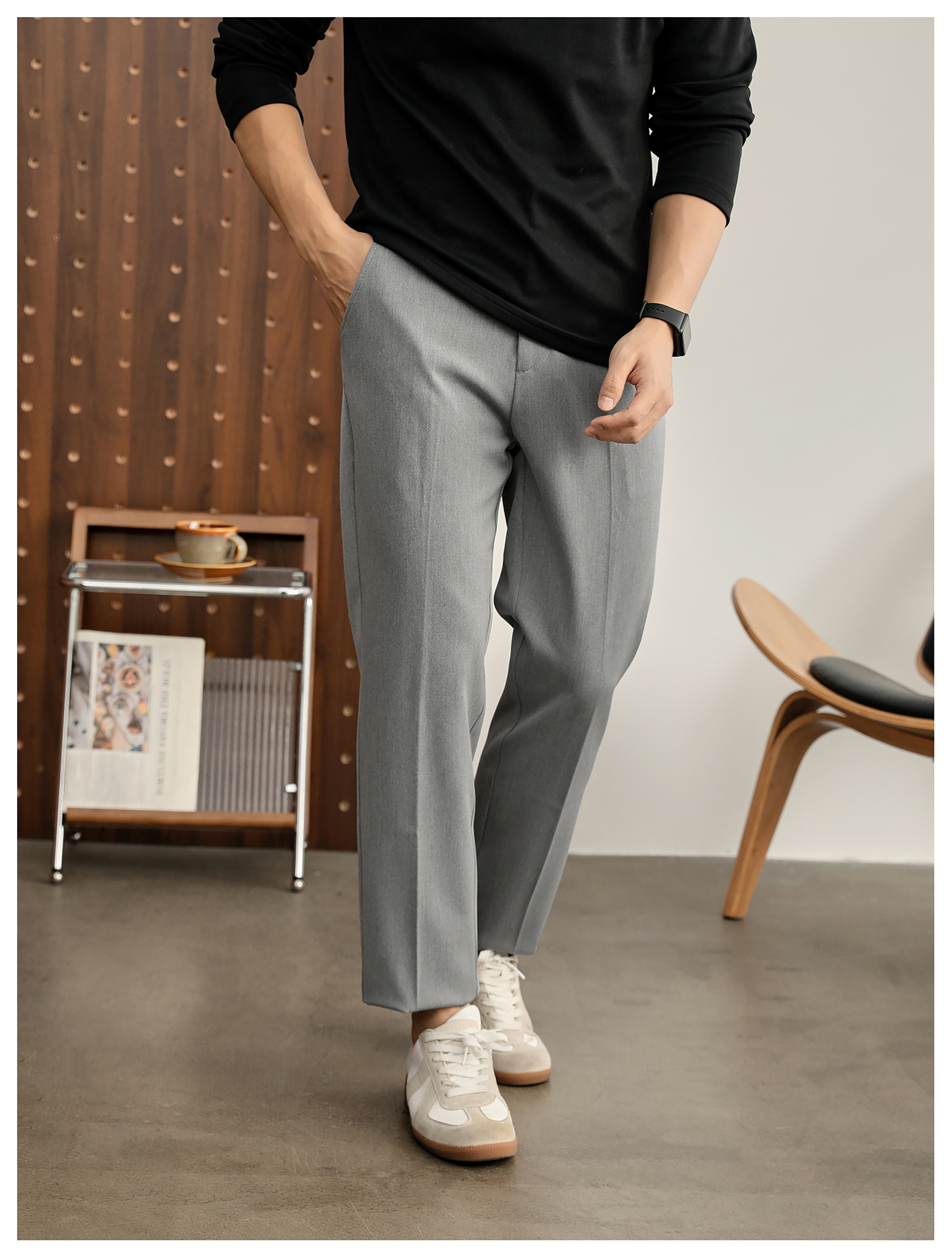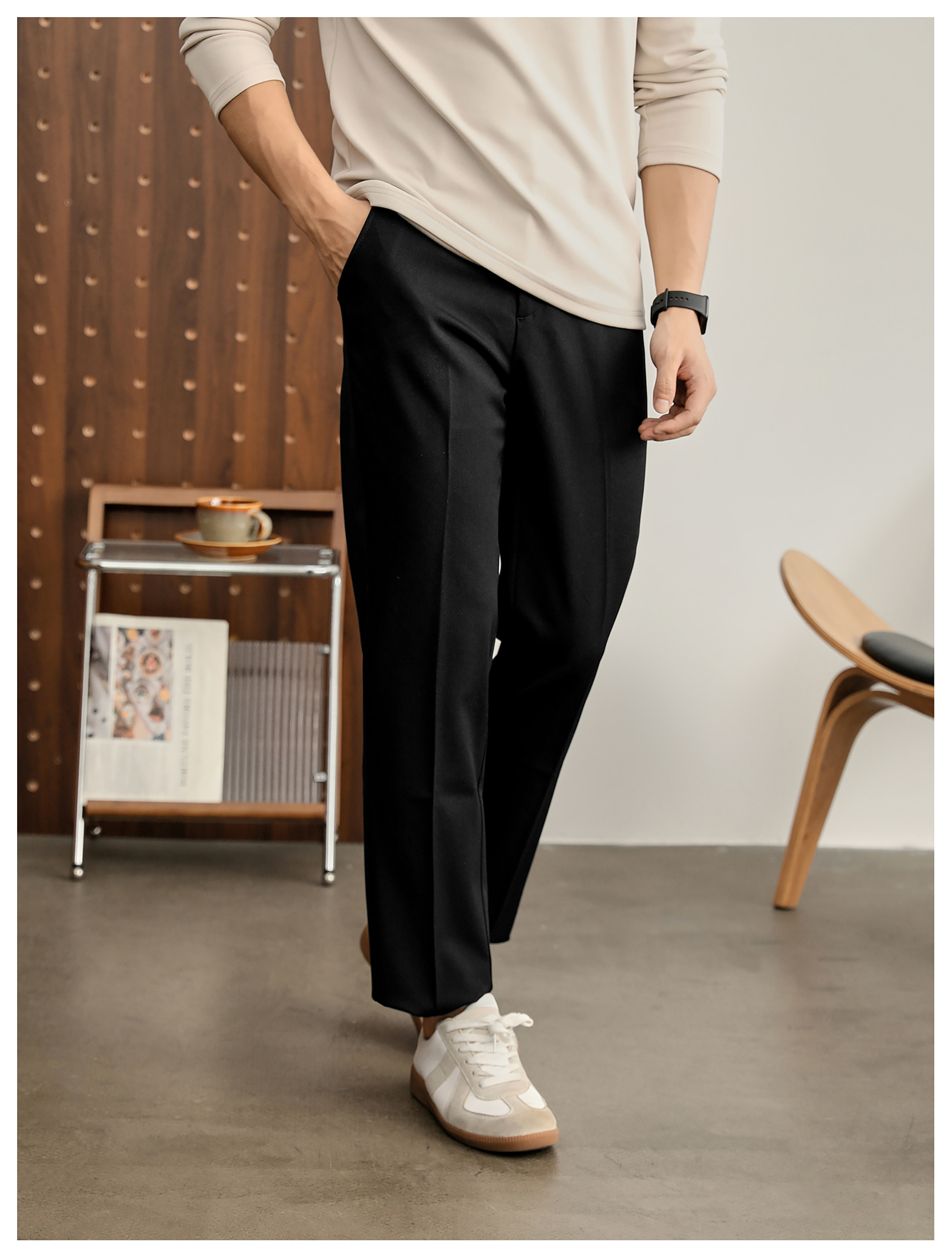 時尚極簡細斜紋色紡休閒西褲男腰頭三色線設計抗皺免燙長褲