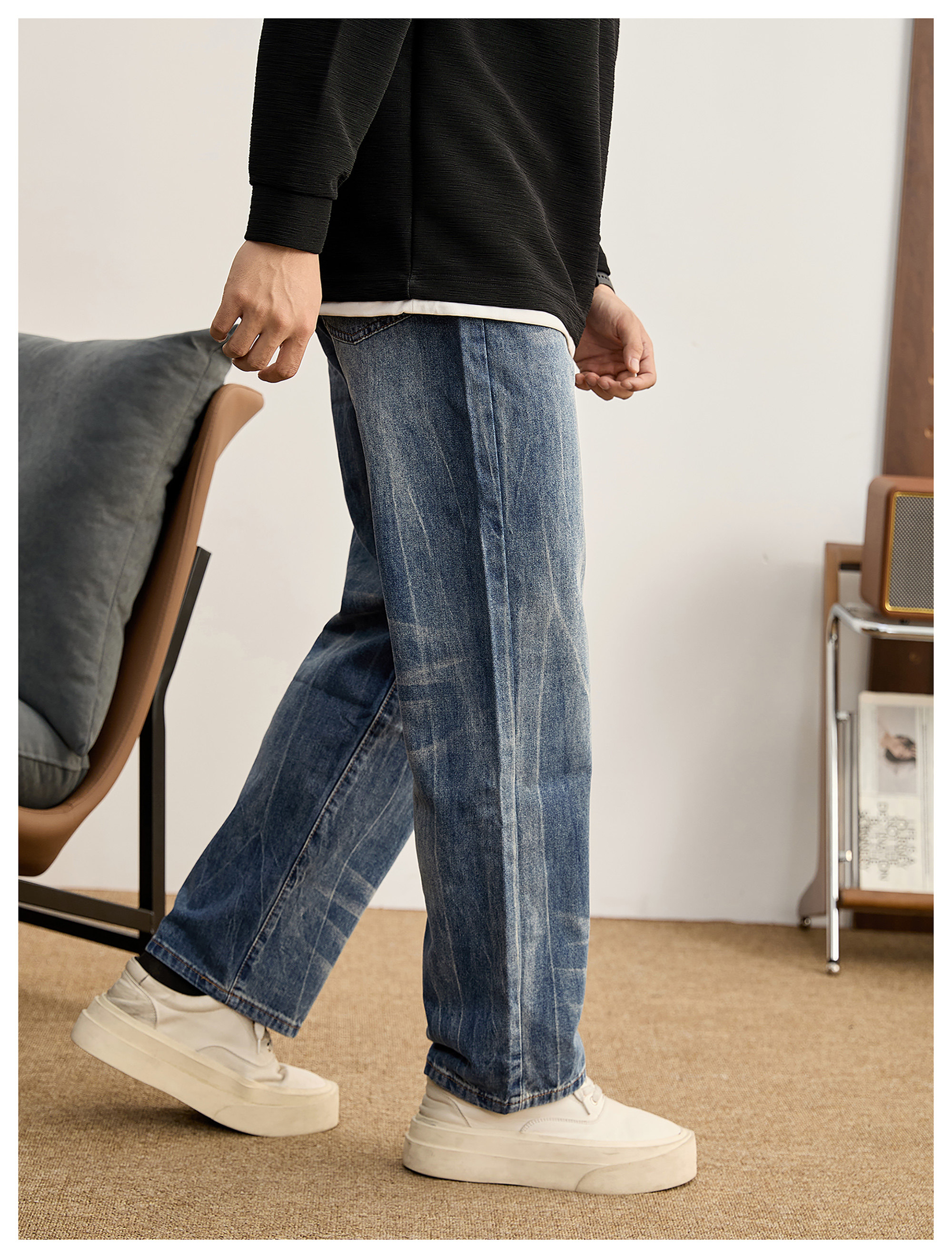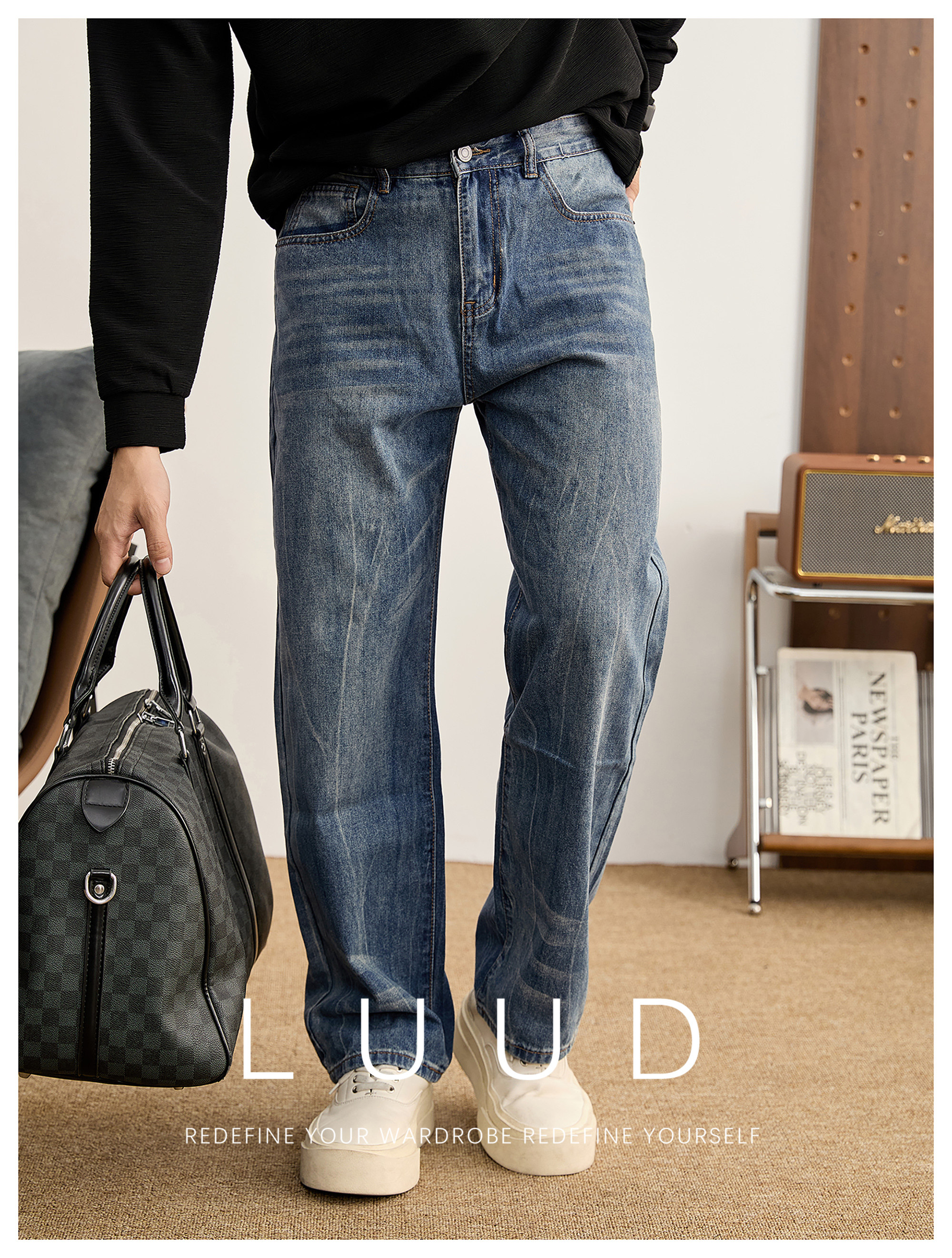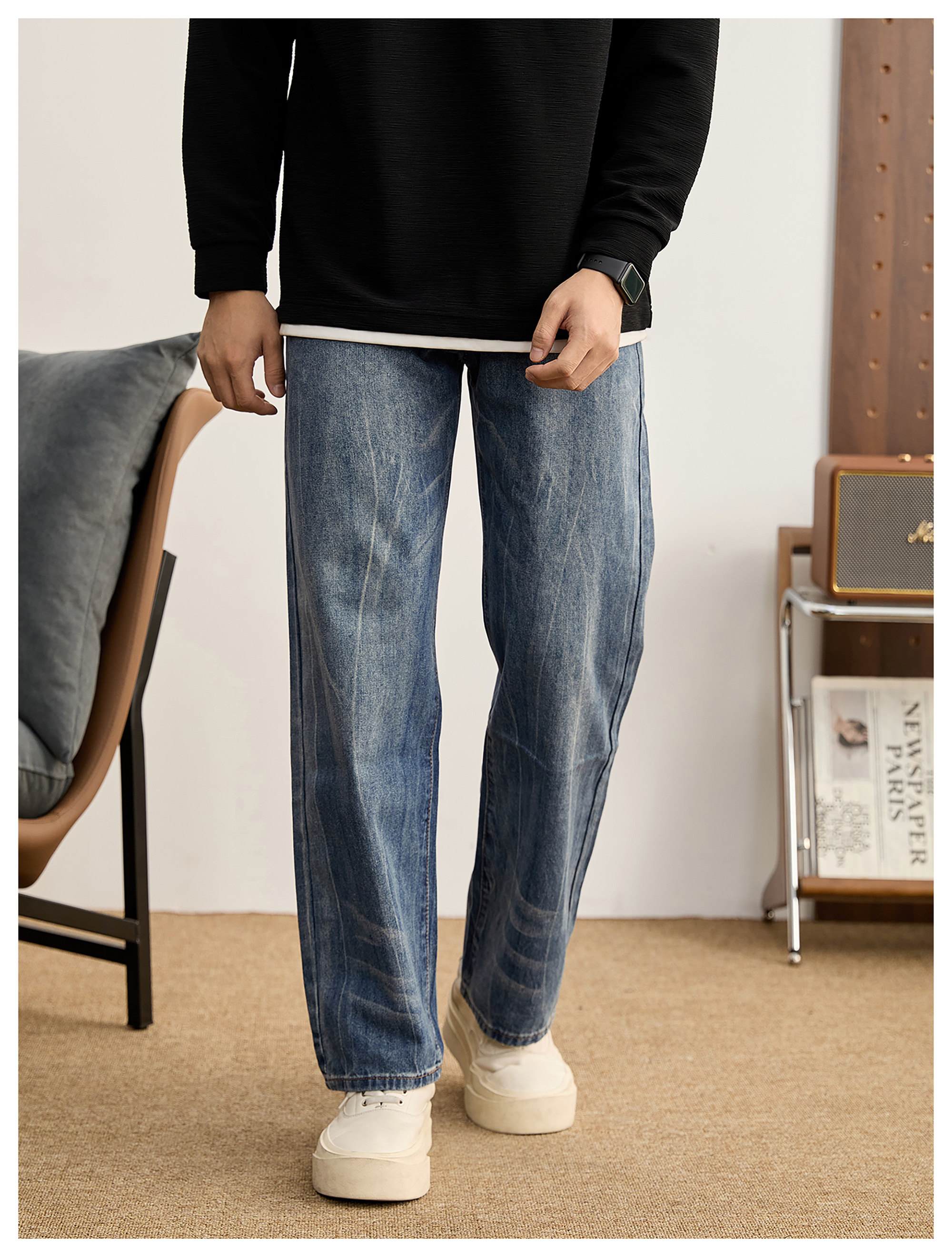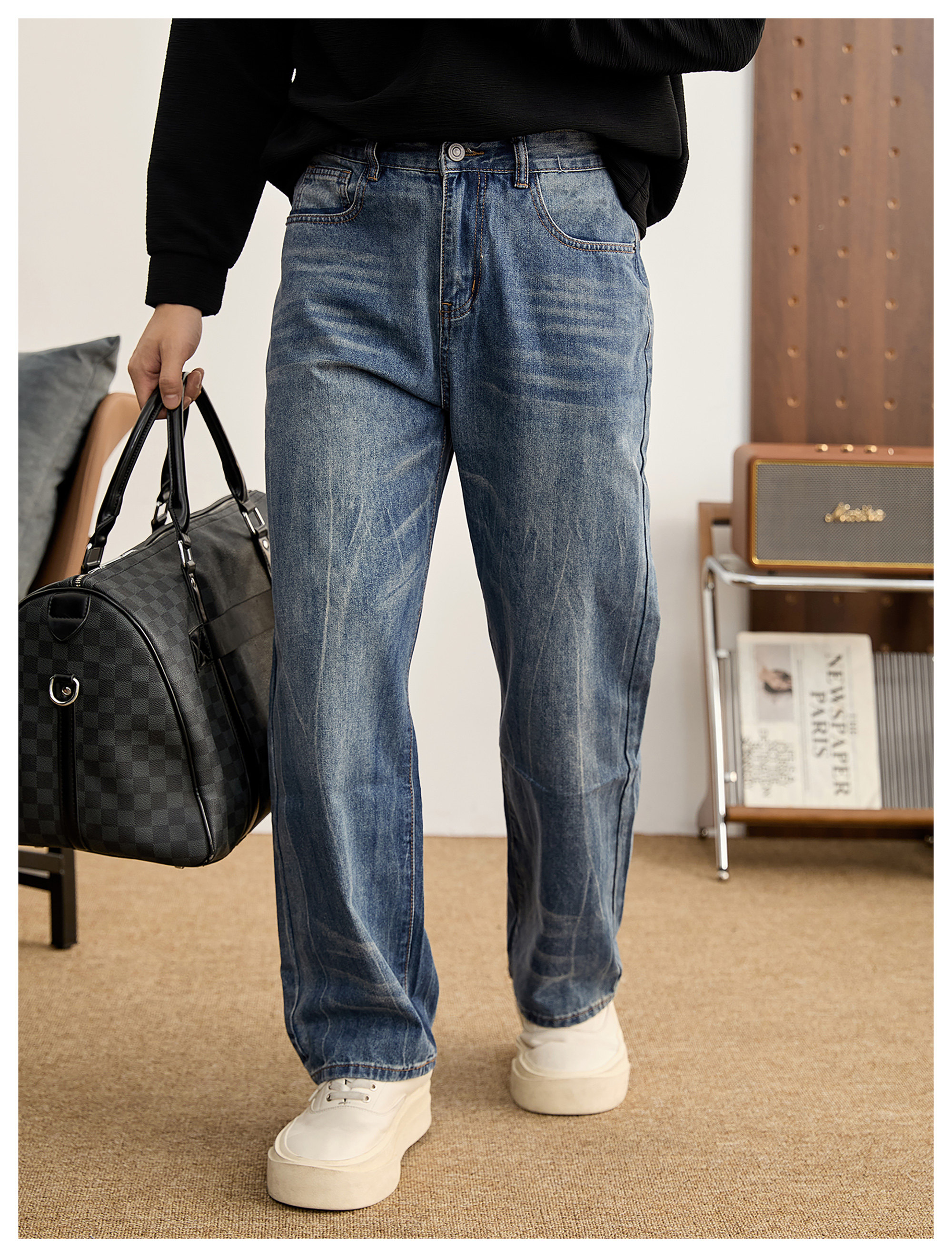 水洗做舊磨白男士牛仔褲不規則裂紋脈絡立體裁剪直筒長褲子