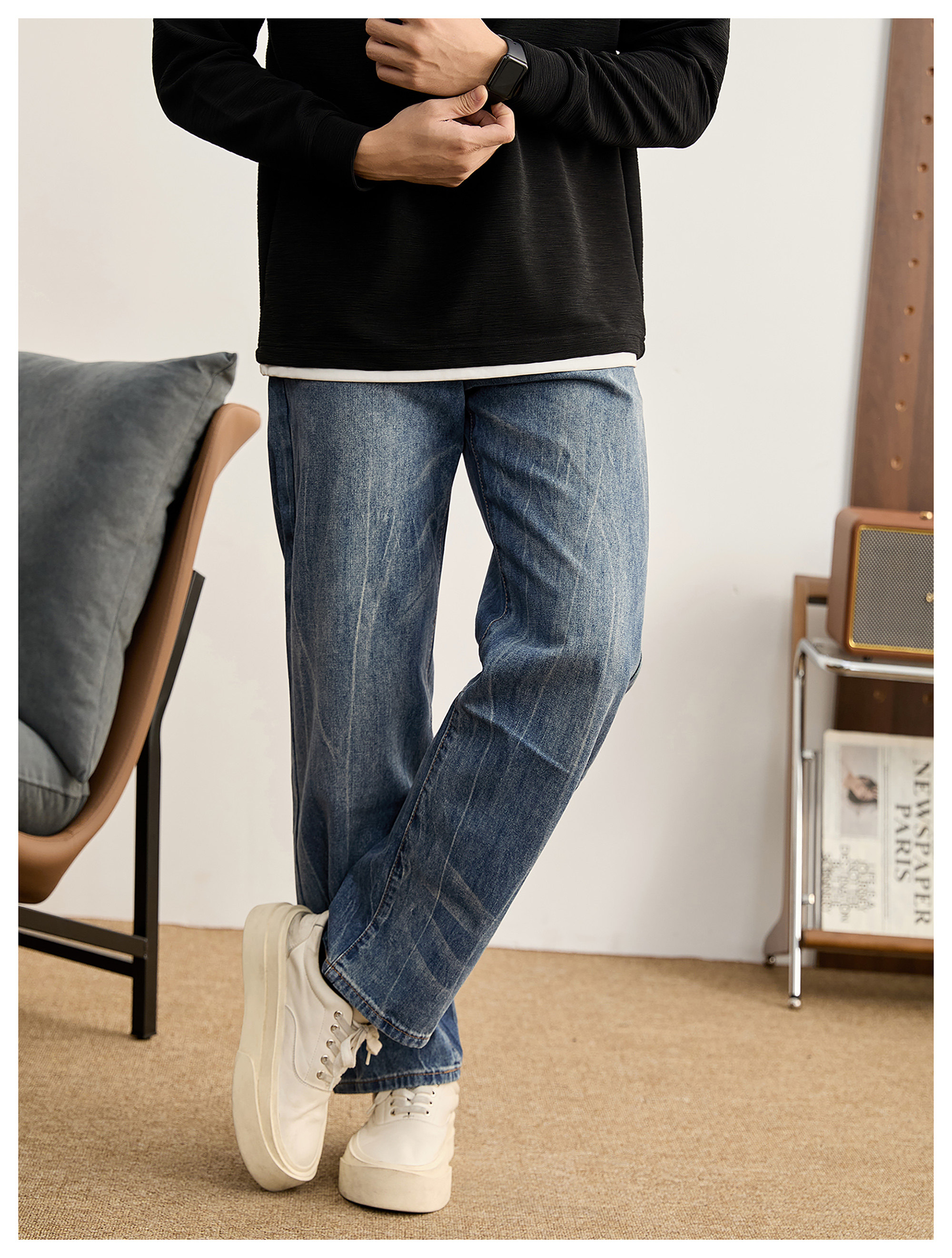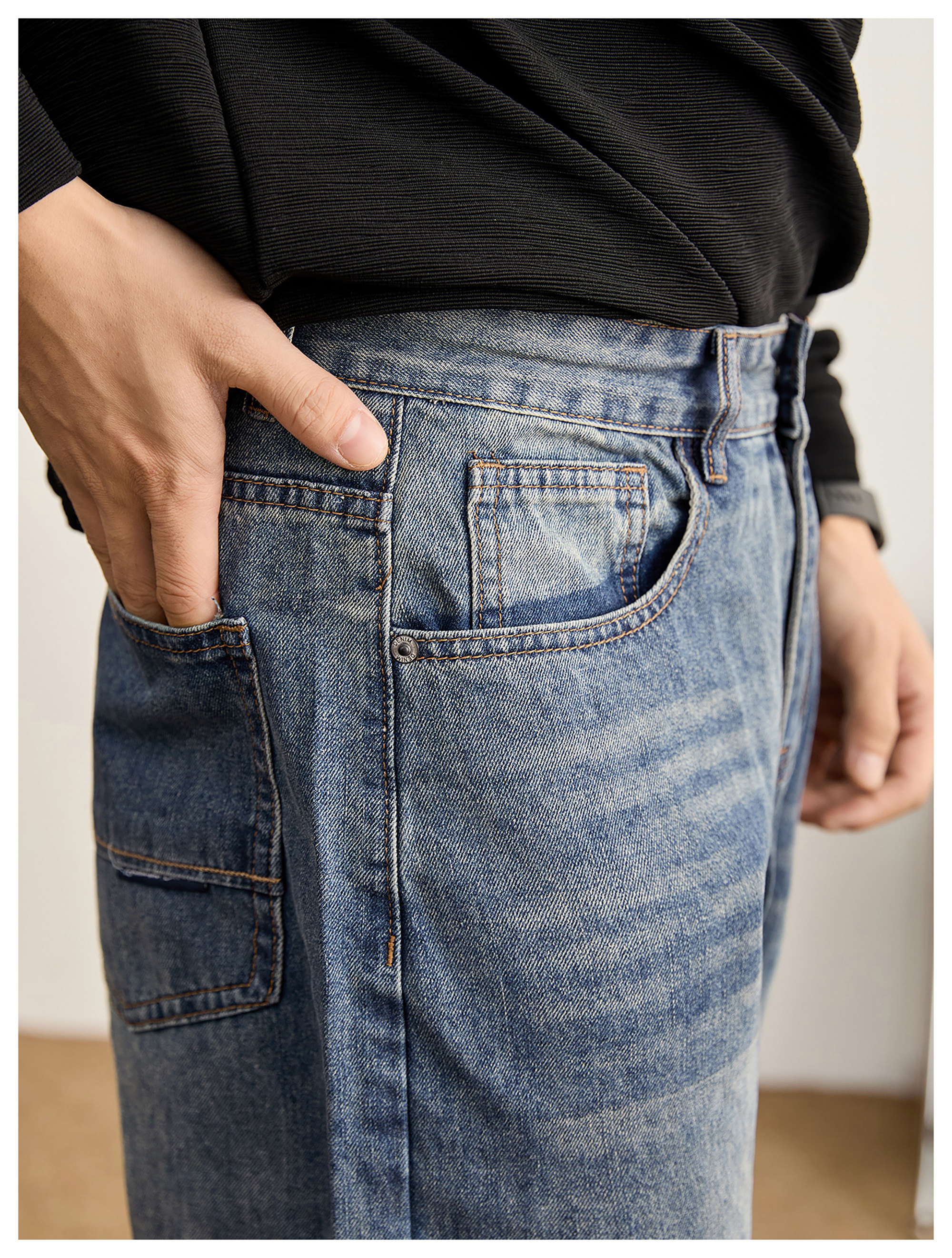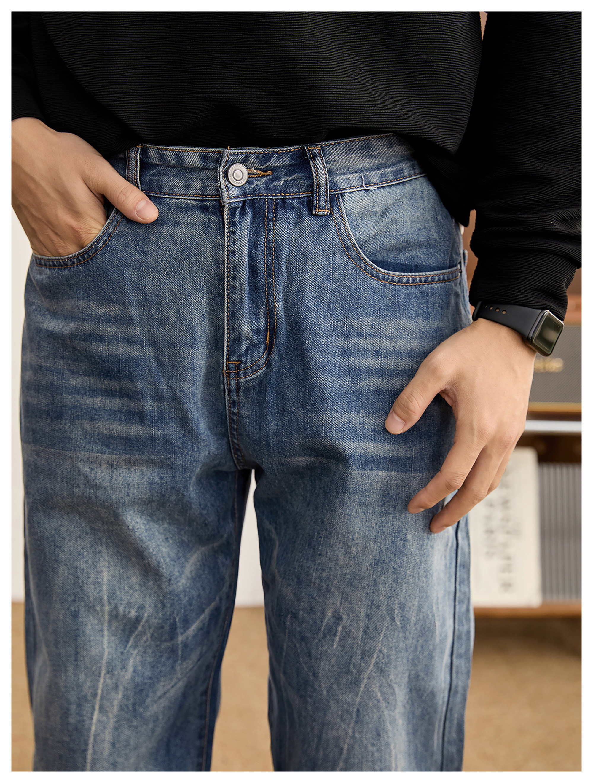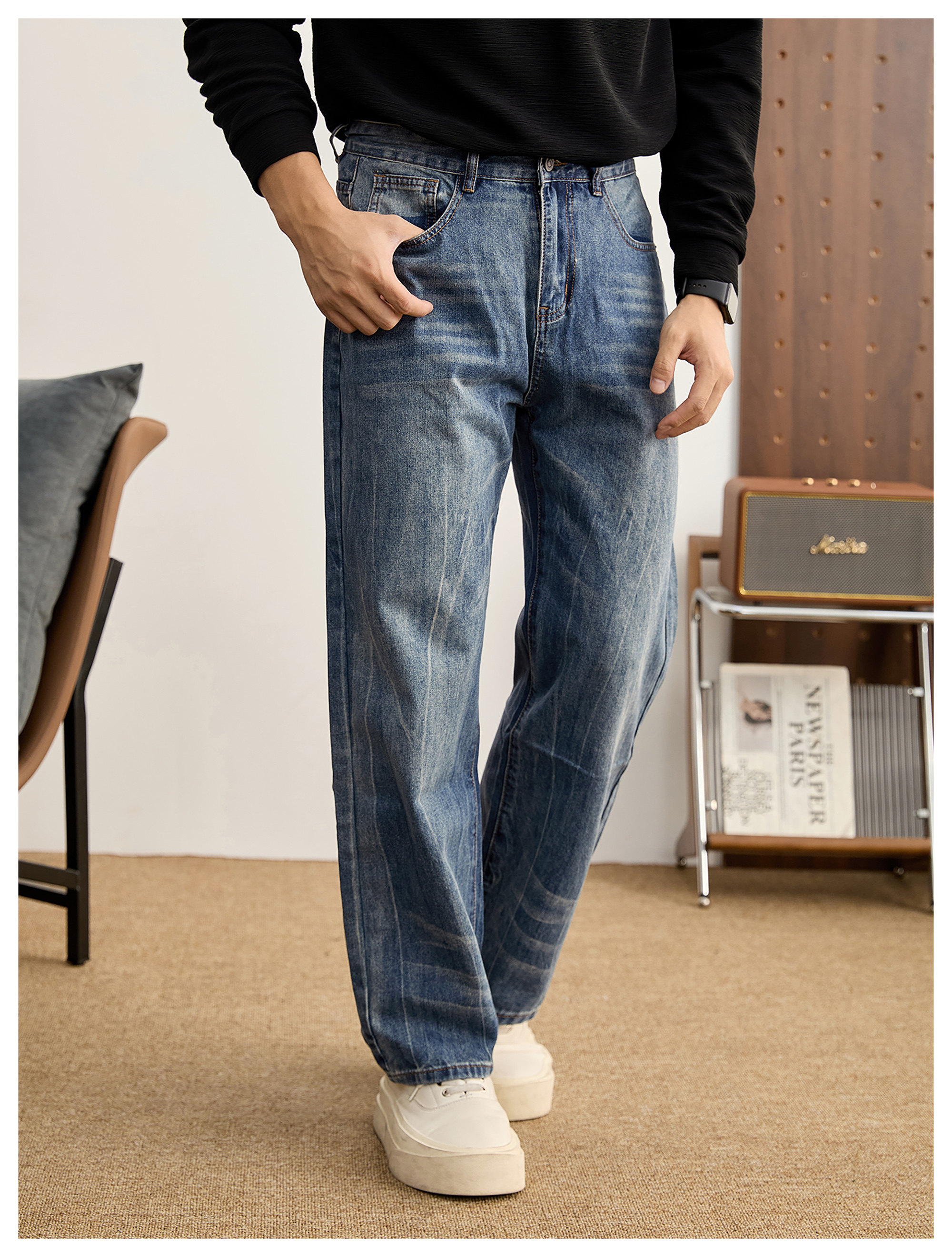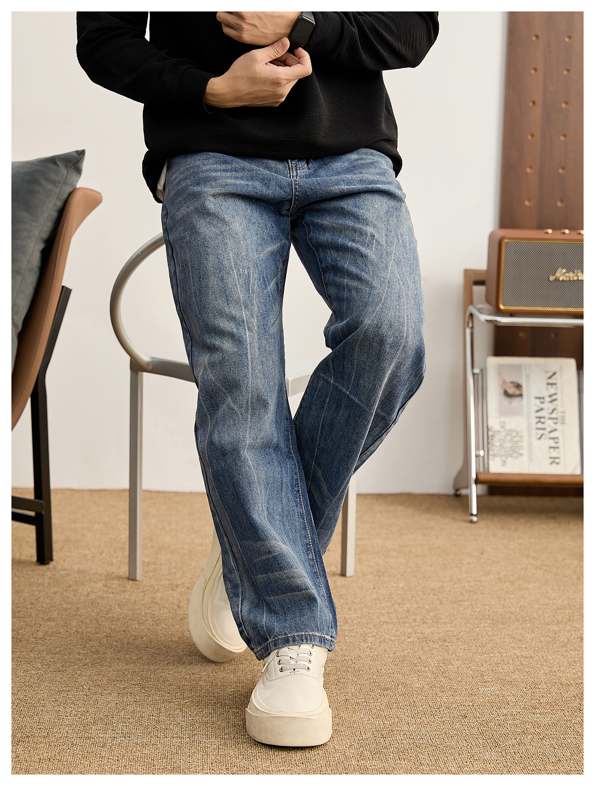 水洗做舊磨白男士牛仔褲不規則裂紋脈絡立體裁剪直筒長褲子