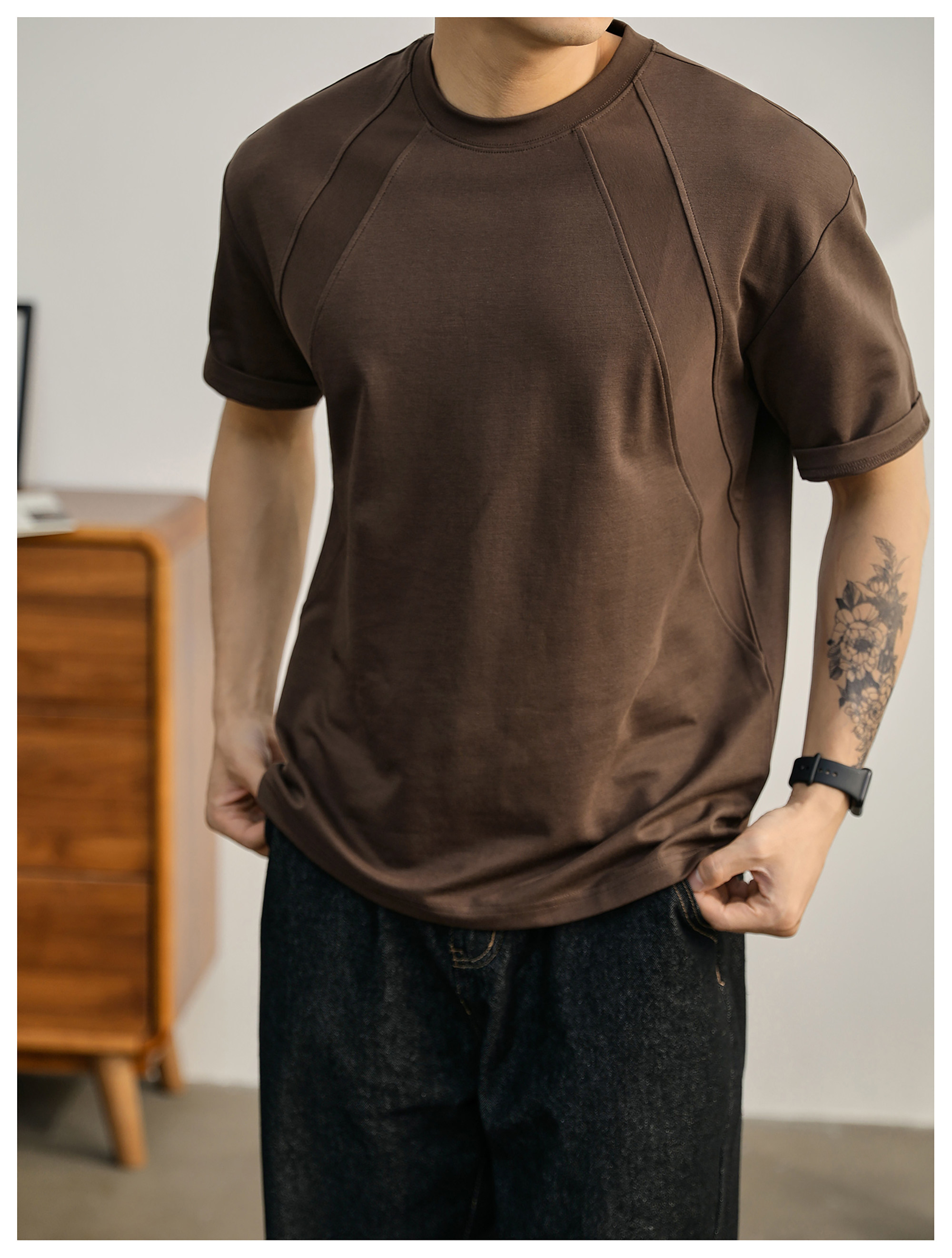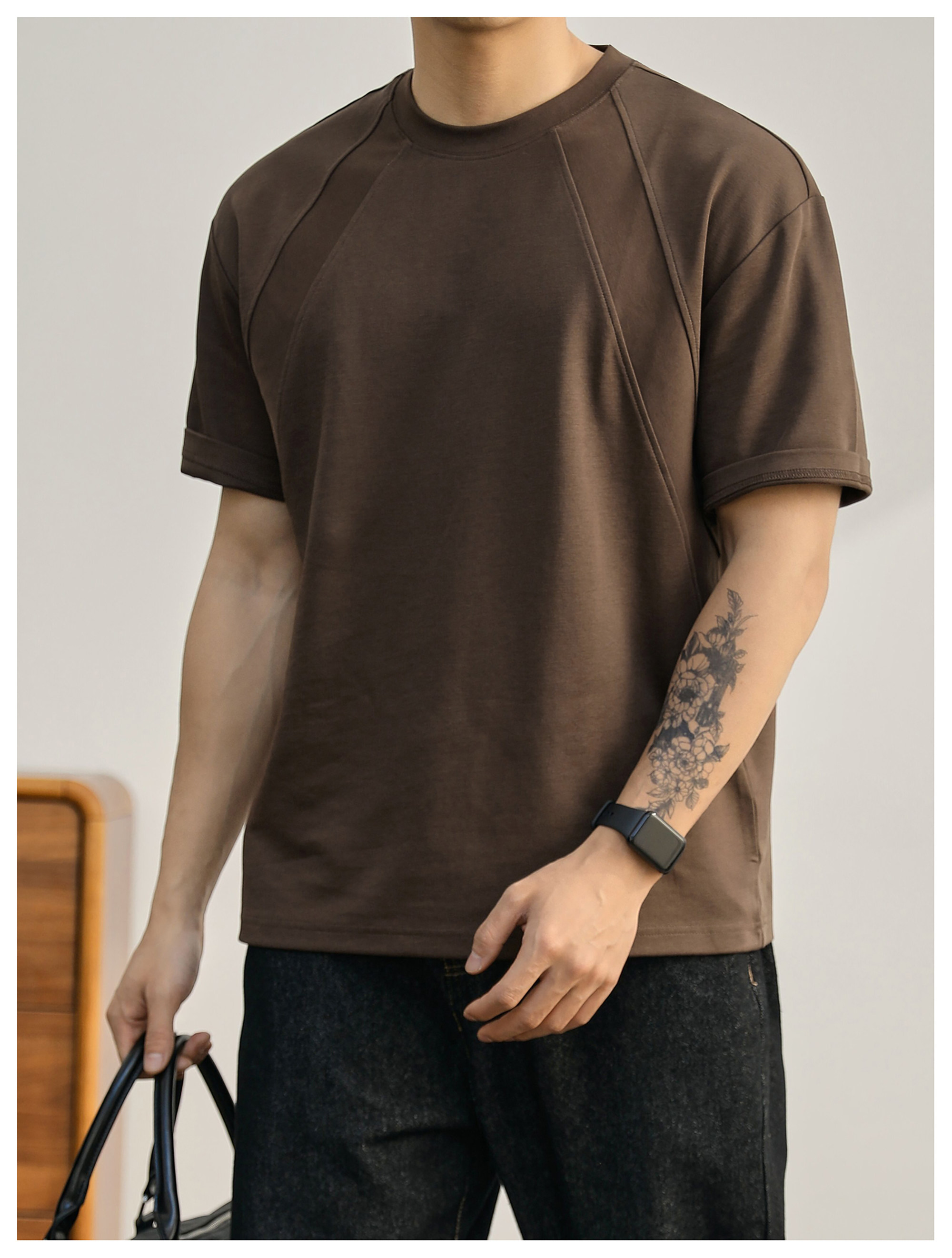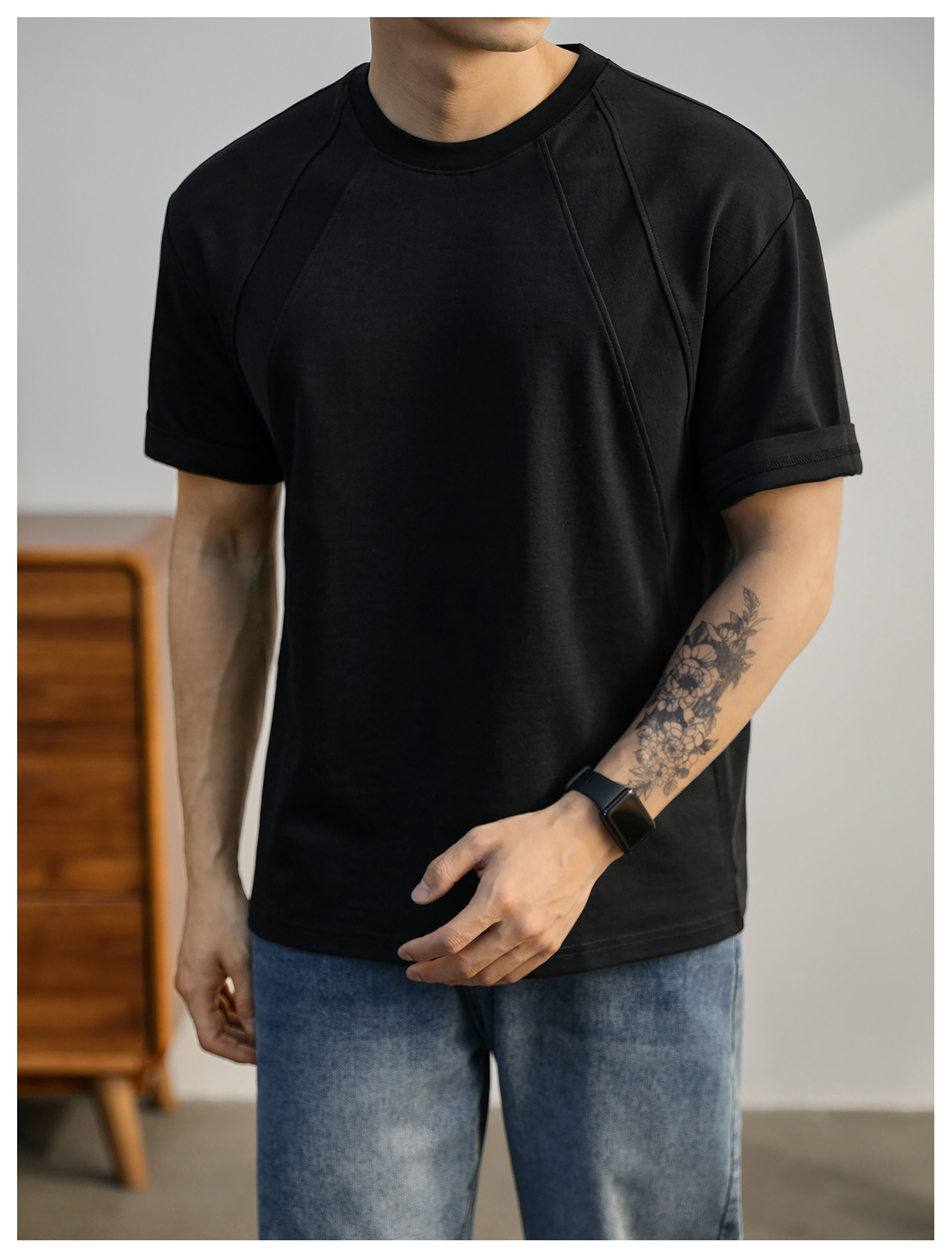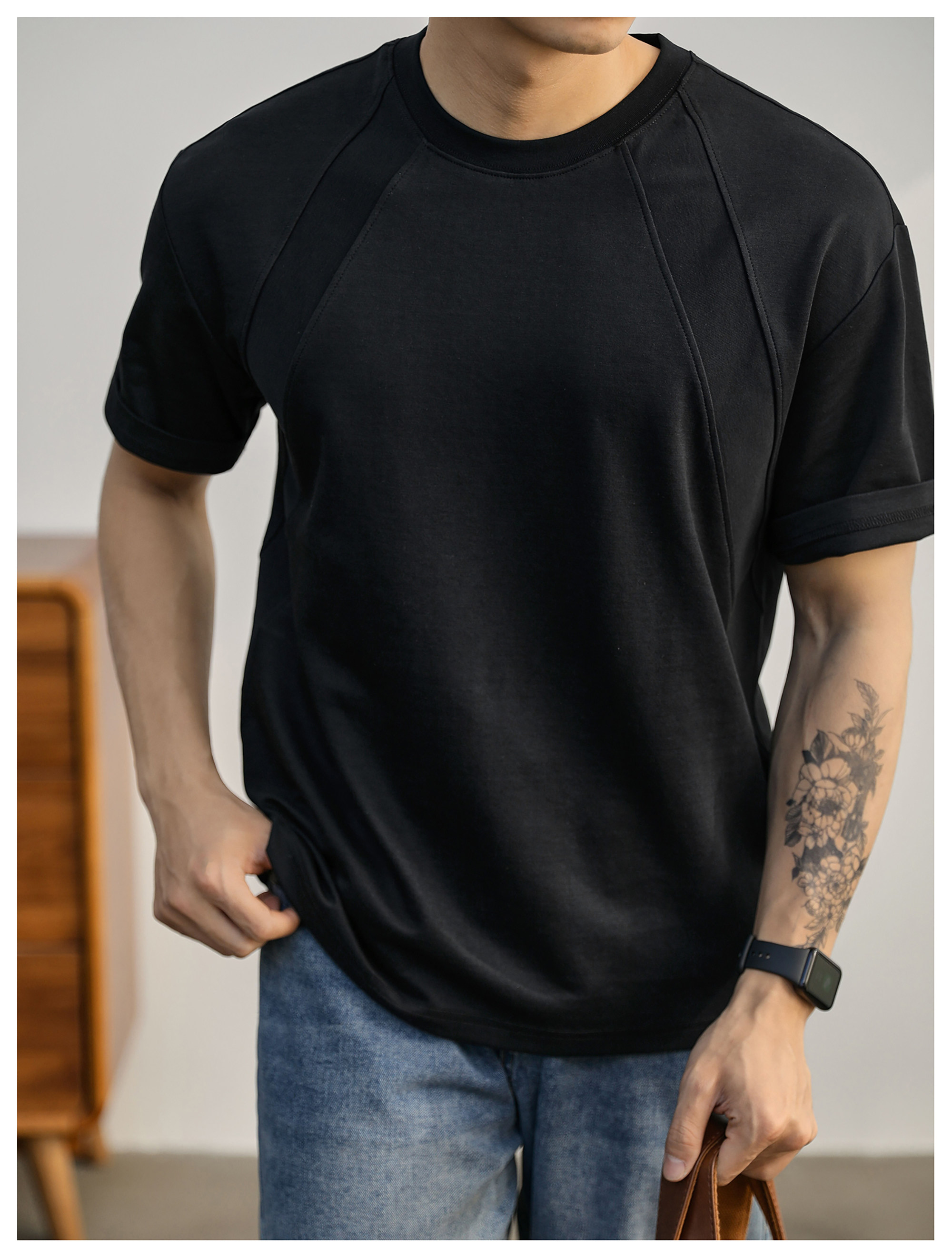 潮牌痞帥高級感T恤男士夏季美式拼接微寬半袖解構挺括T恤