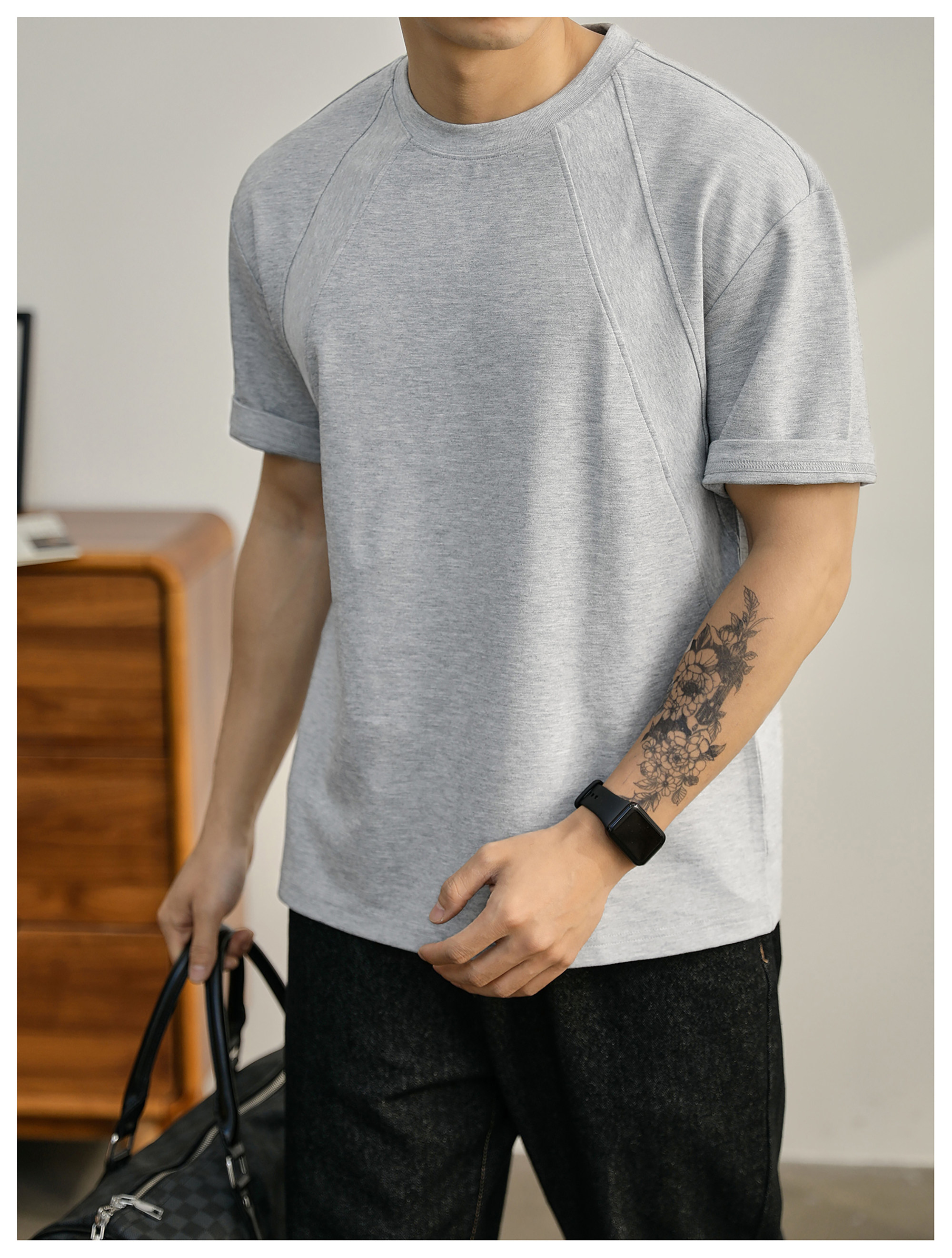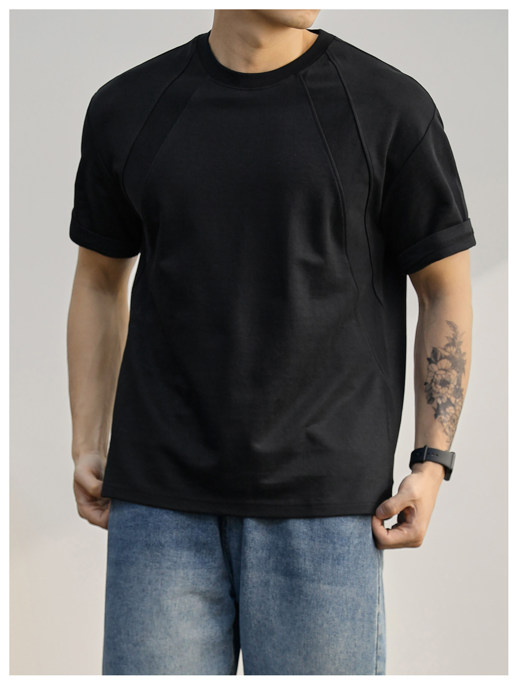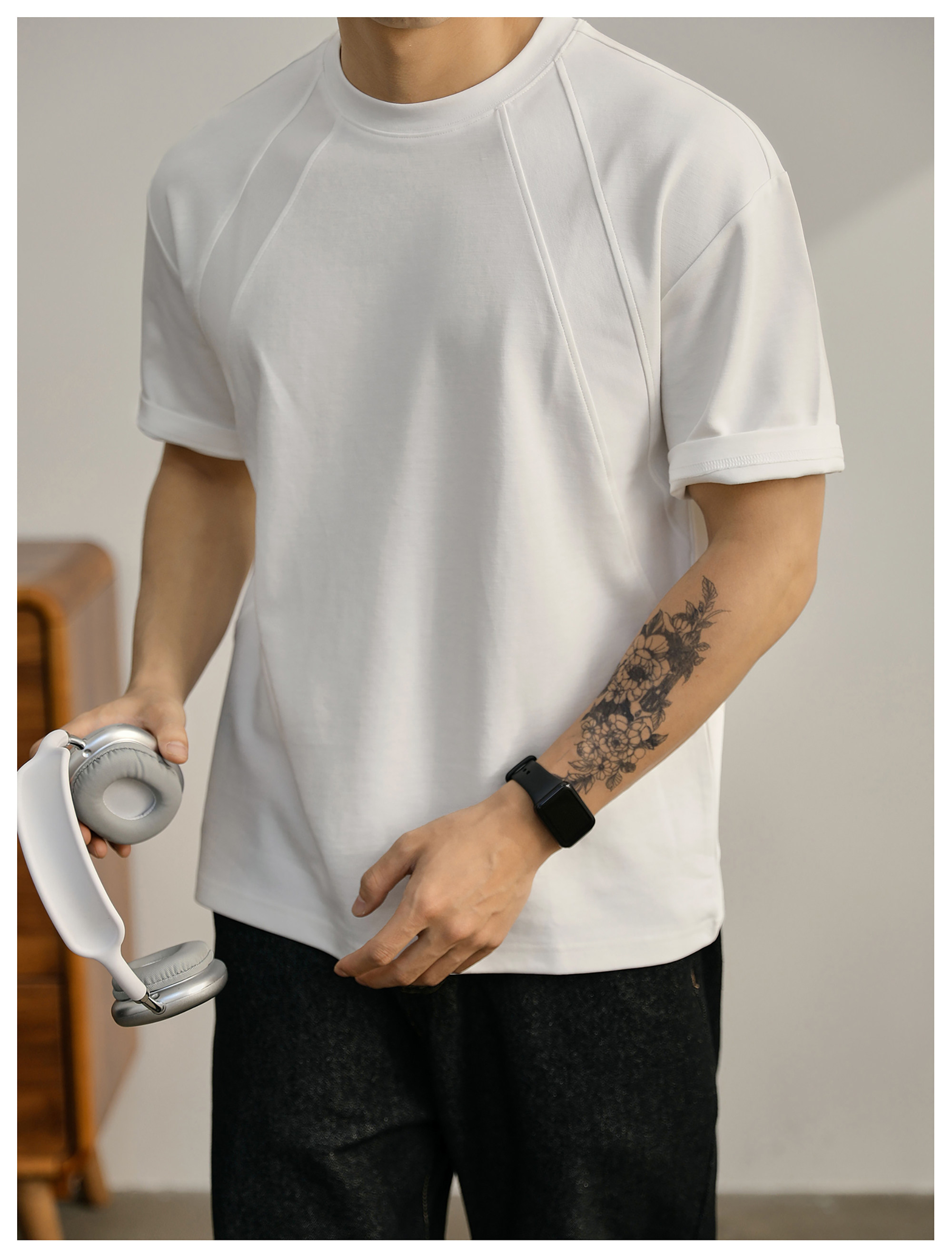 潮牌痞帥高級感T恤男士夏季美式拼接微寬半袖解構挺括T恤