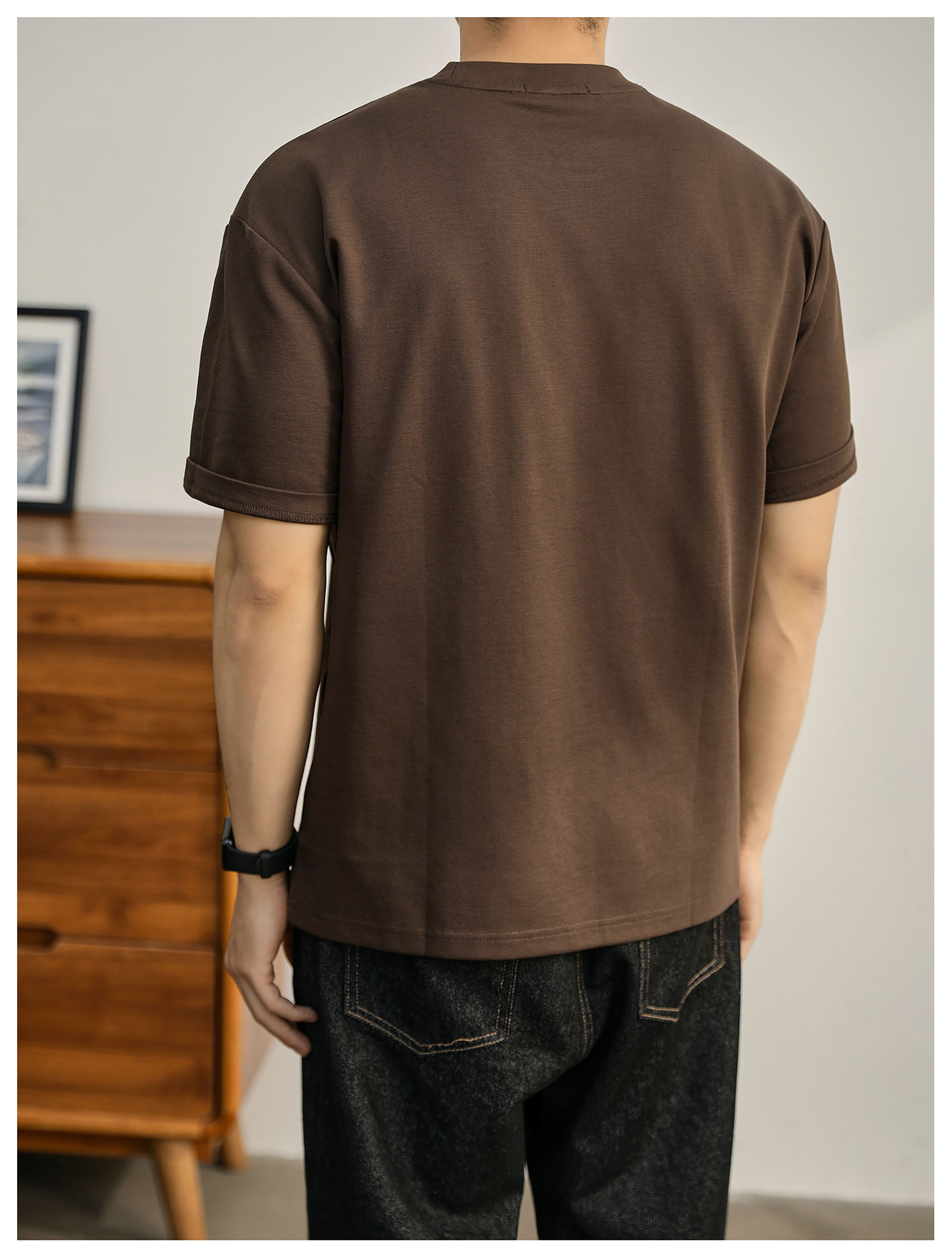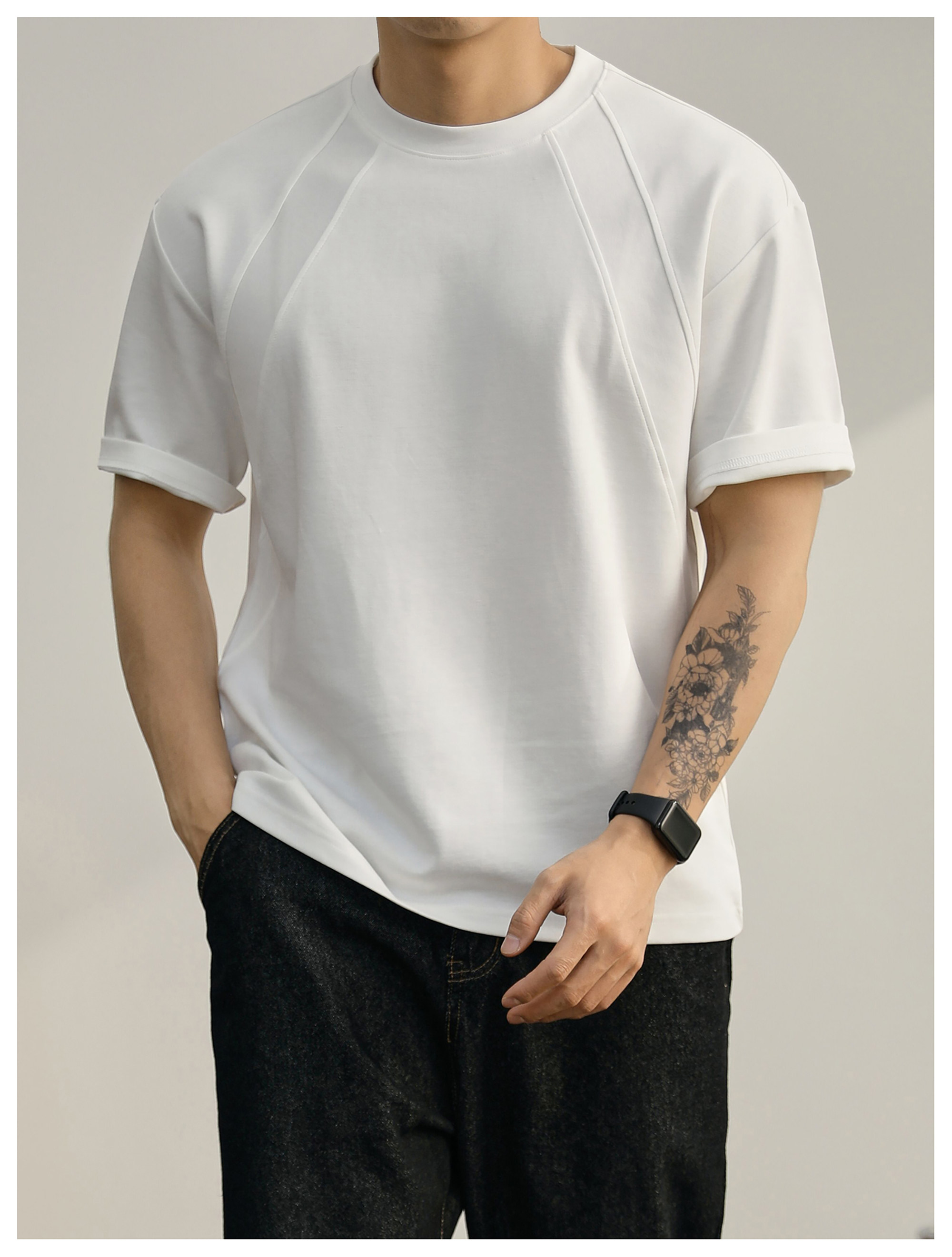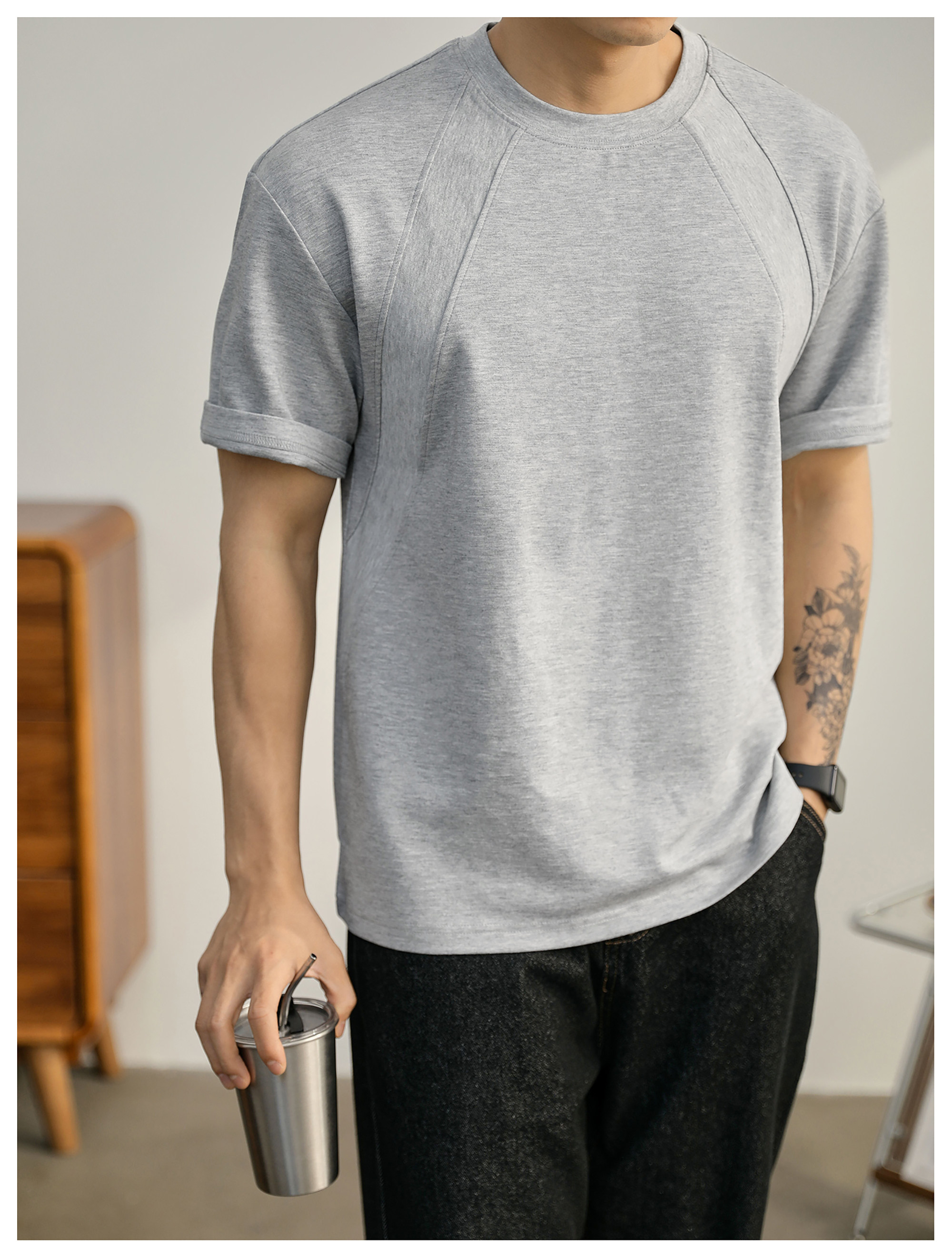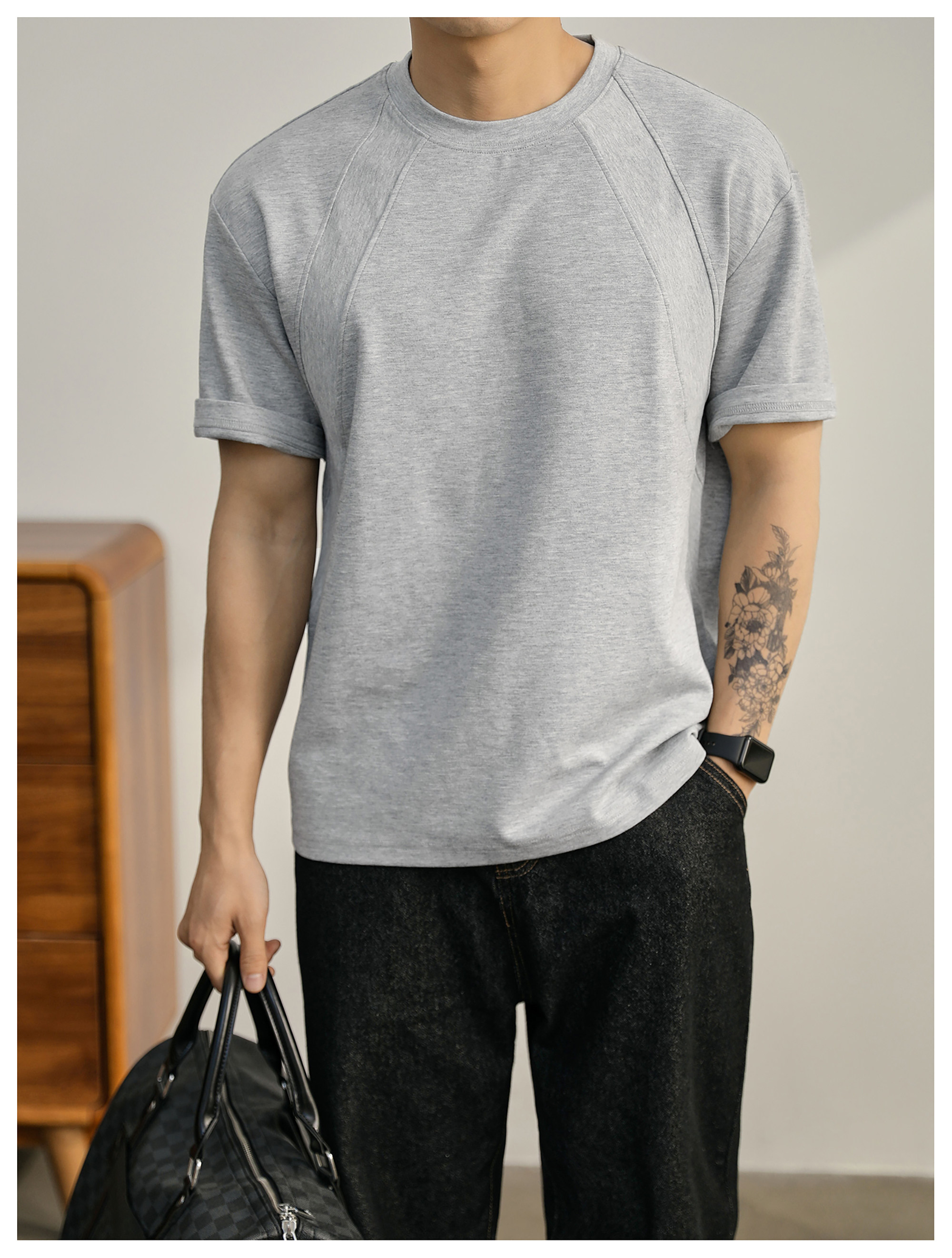 潮牌痞帥高級感T恤男士夏季美式拼接微寬半袖解構挺括T恤