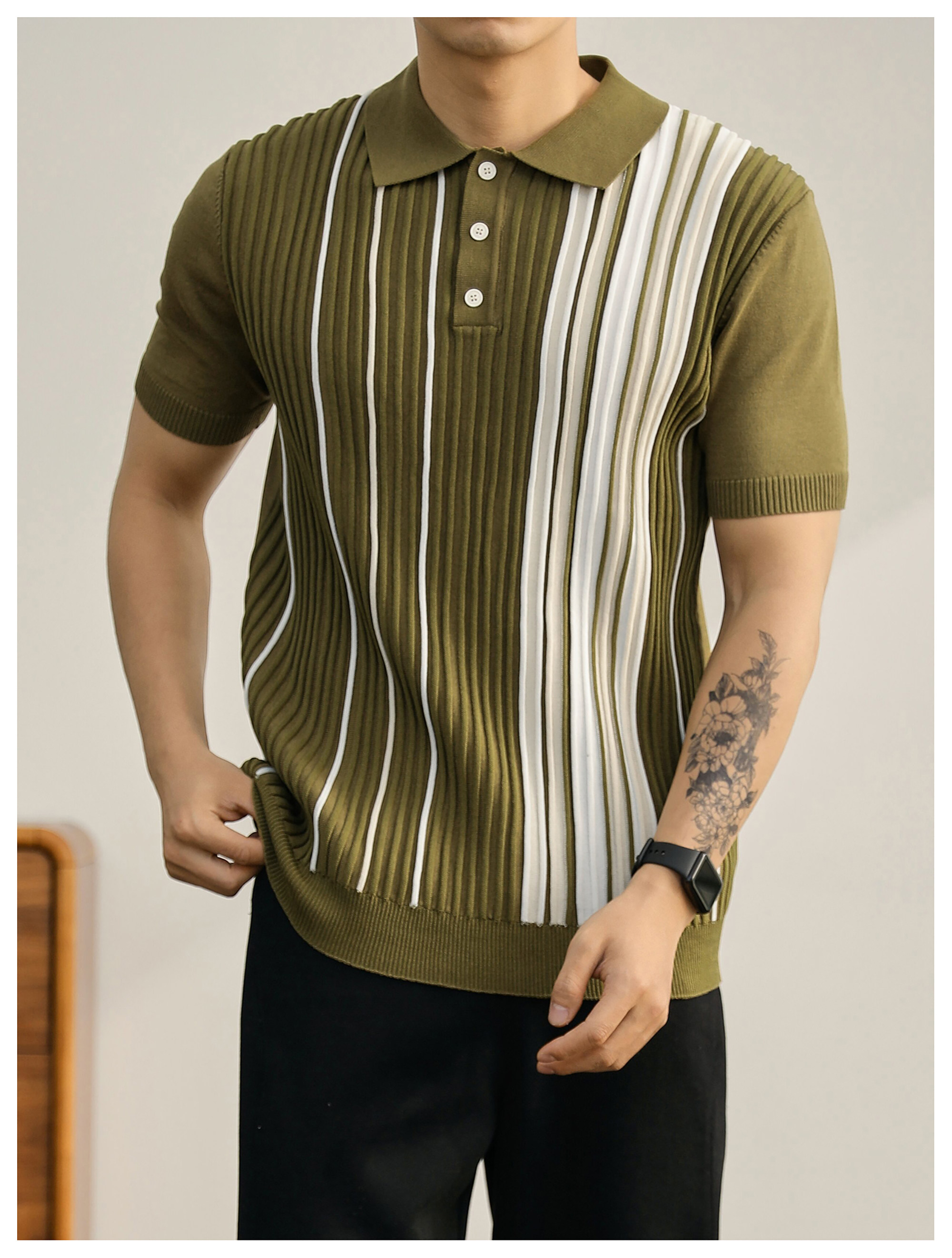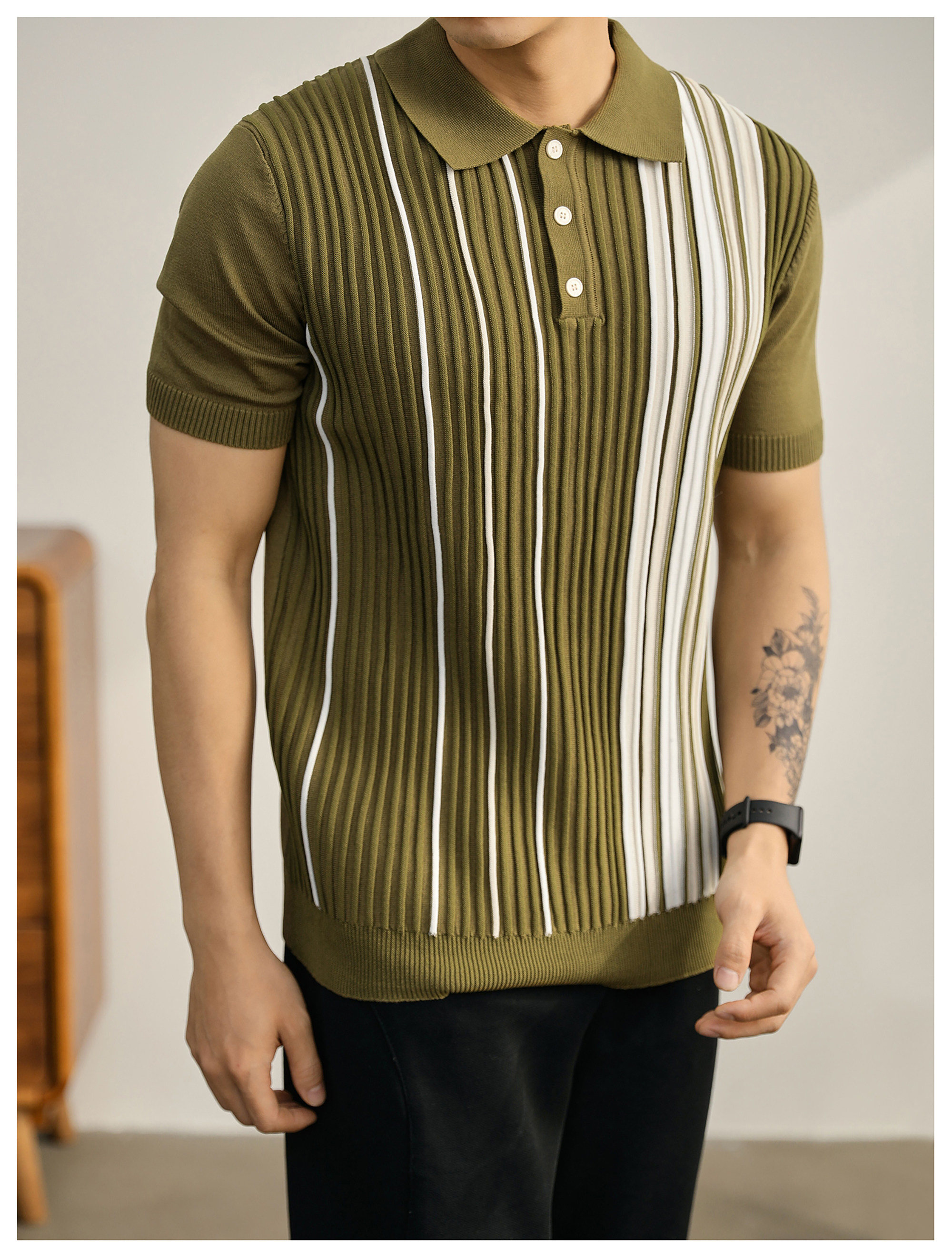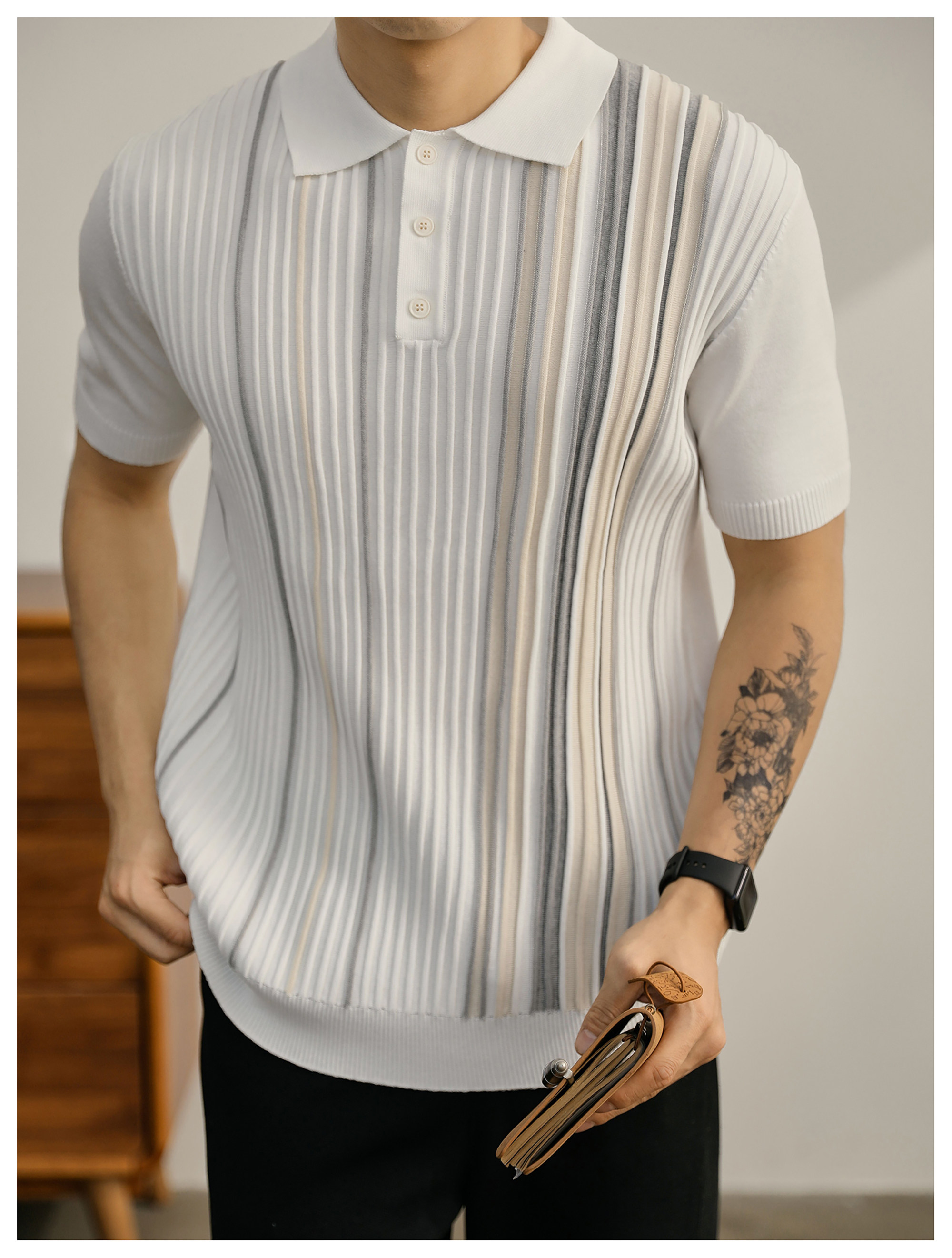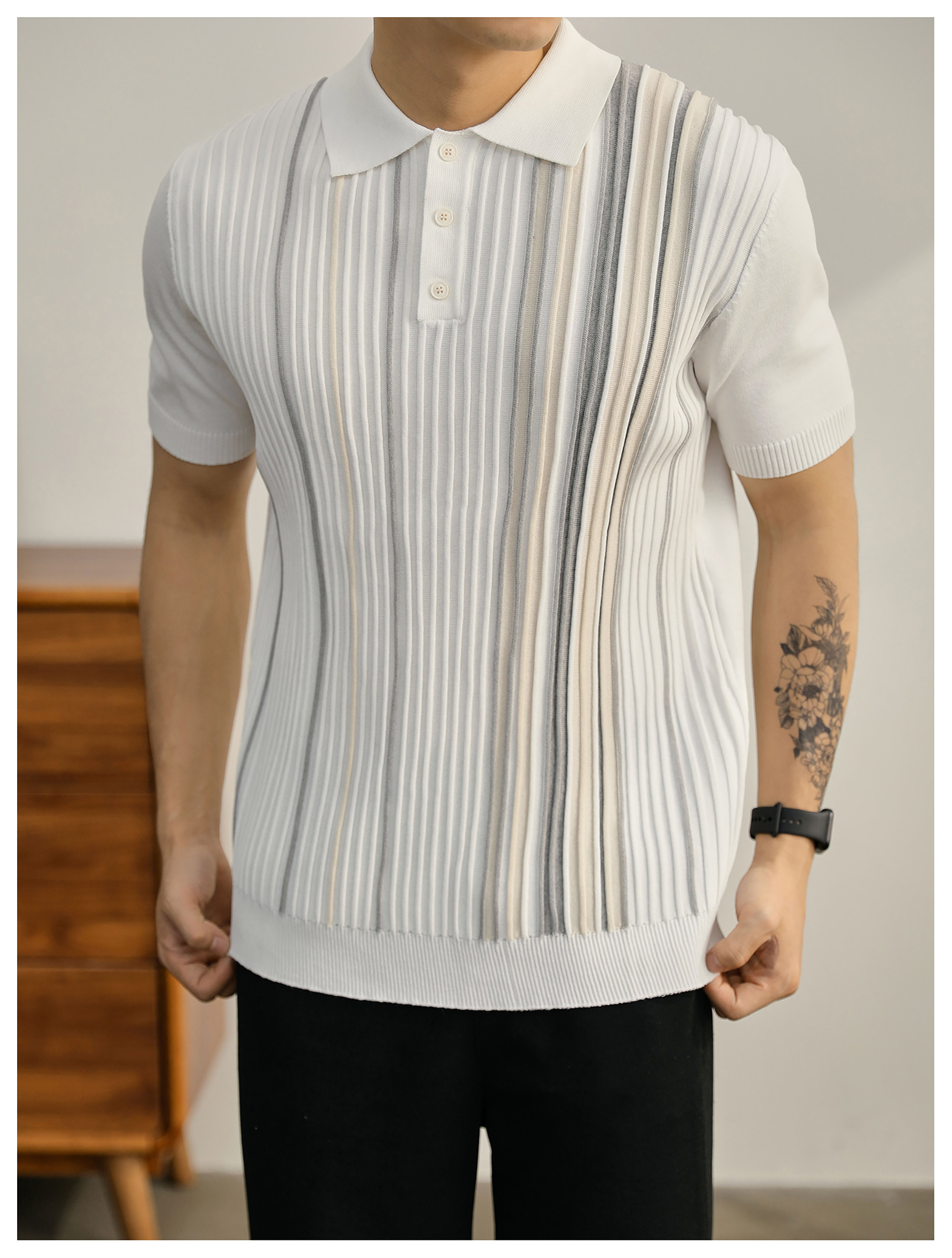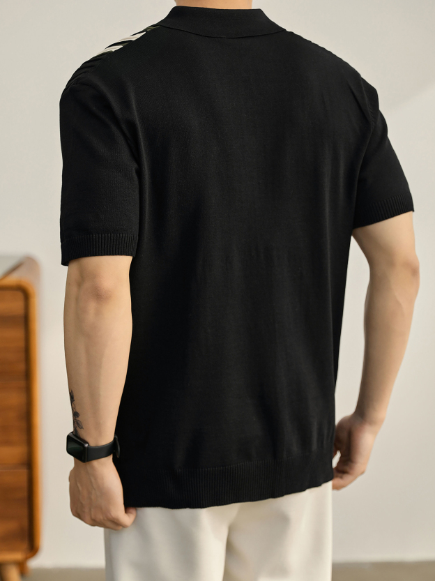 男士輕奢英倫風短袖Polo衫潮流撞色坑條紋理修身針織保羅衫