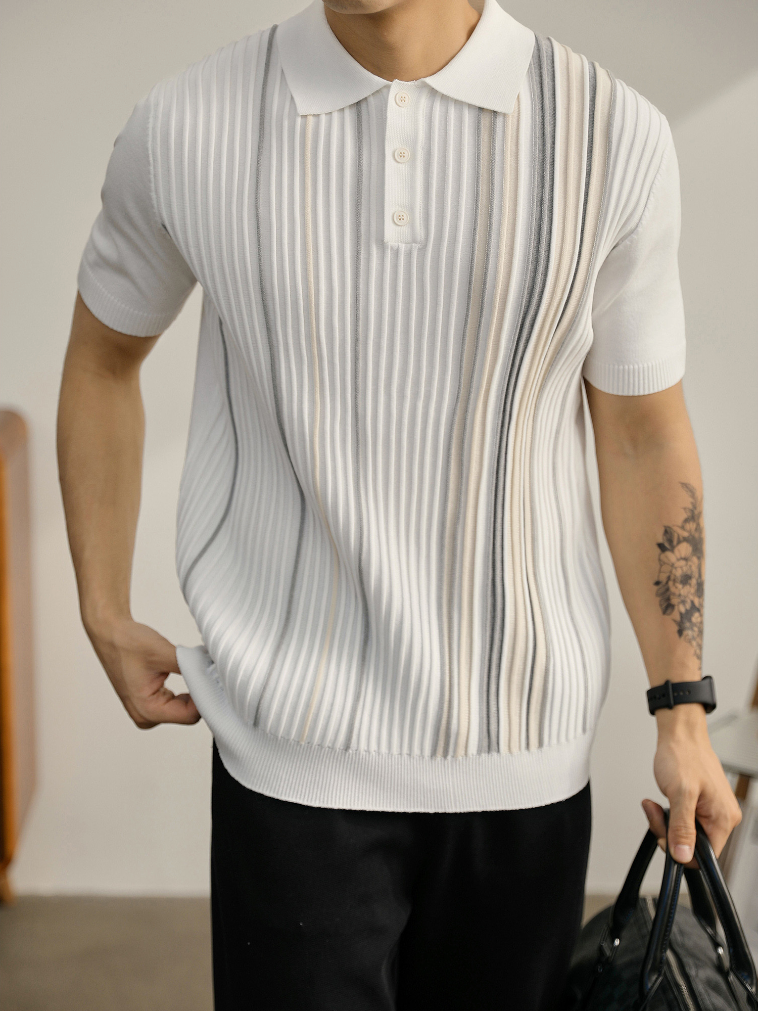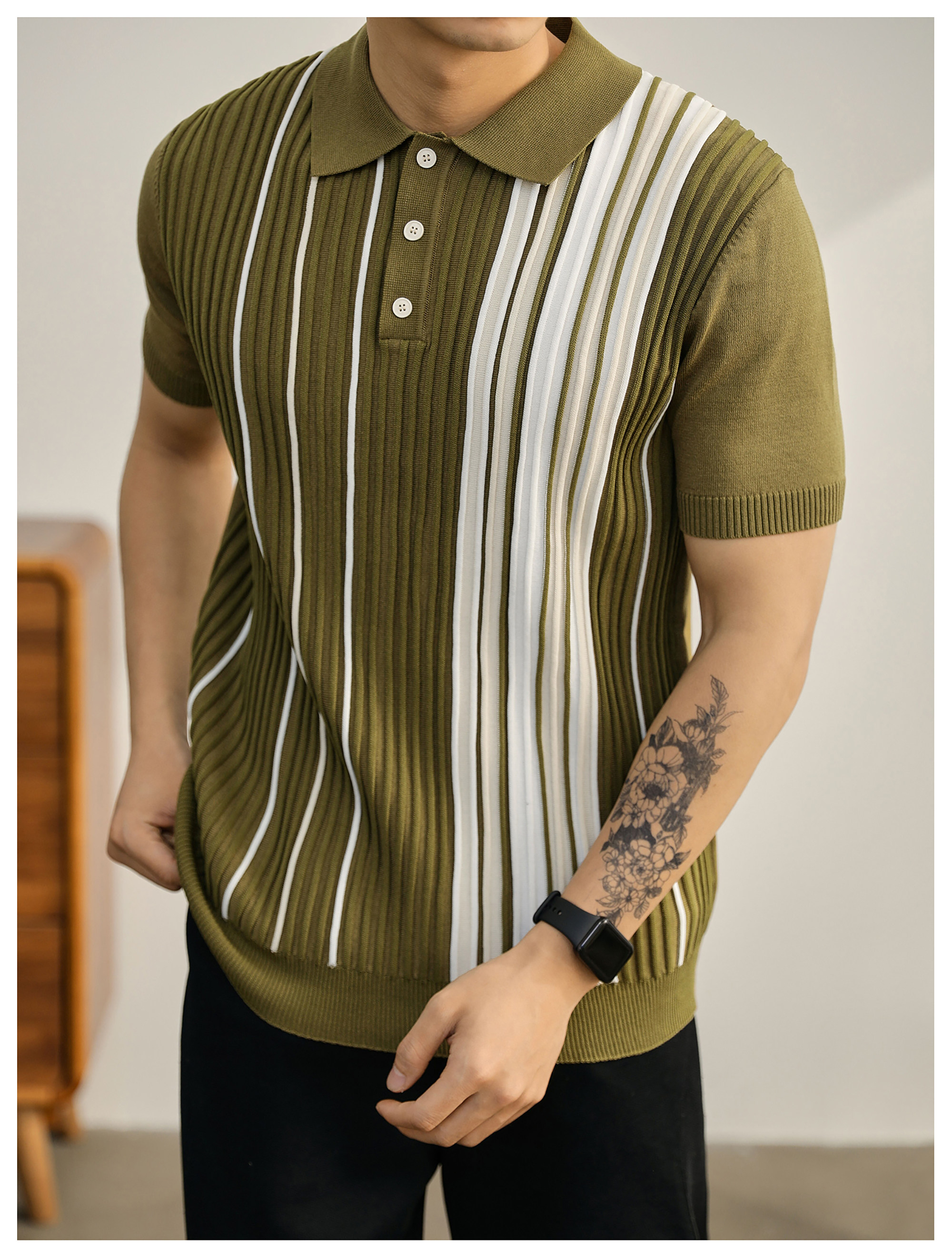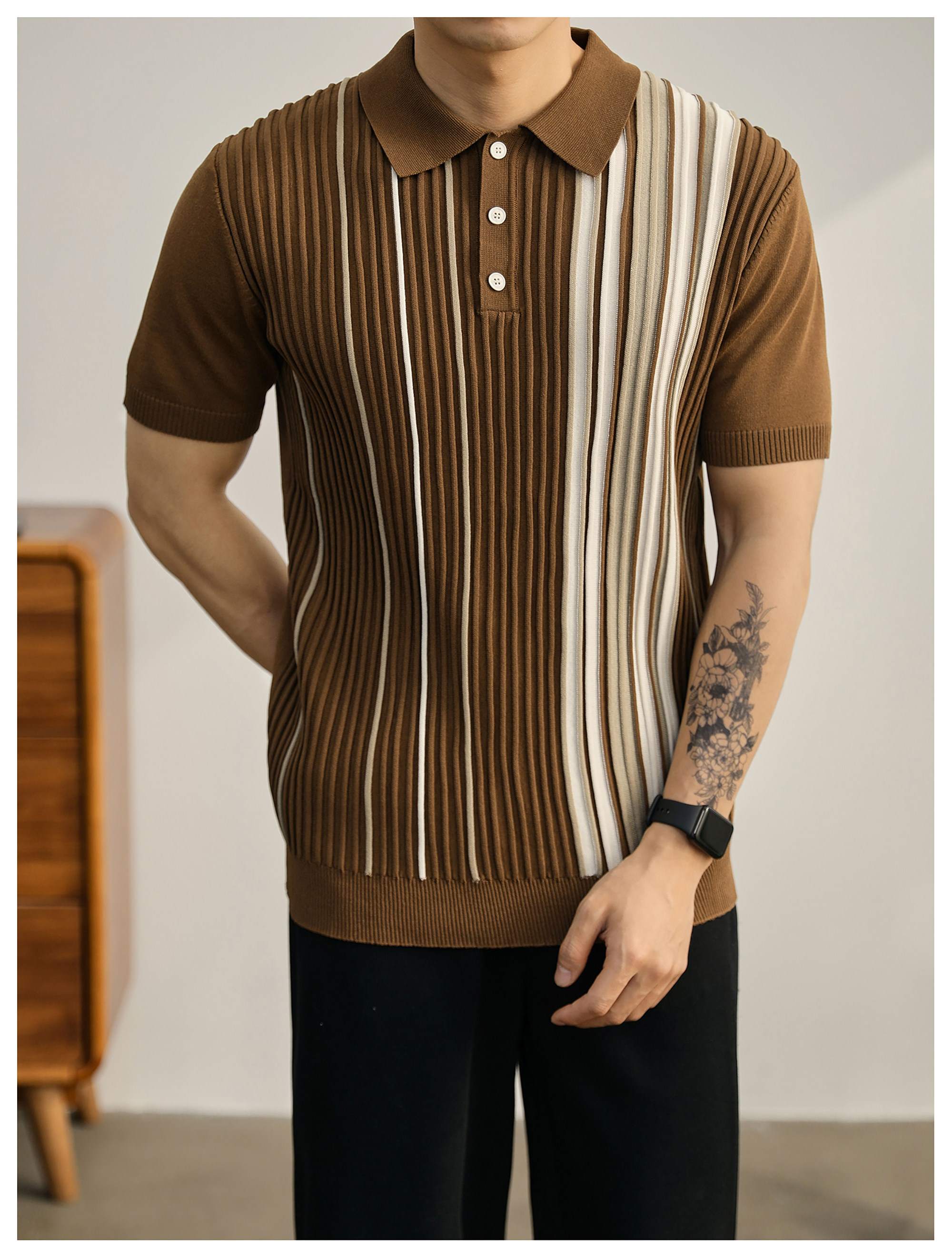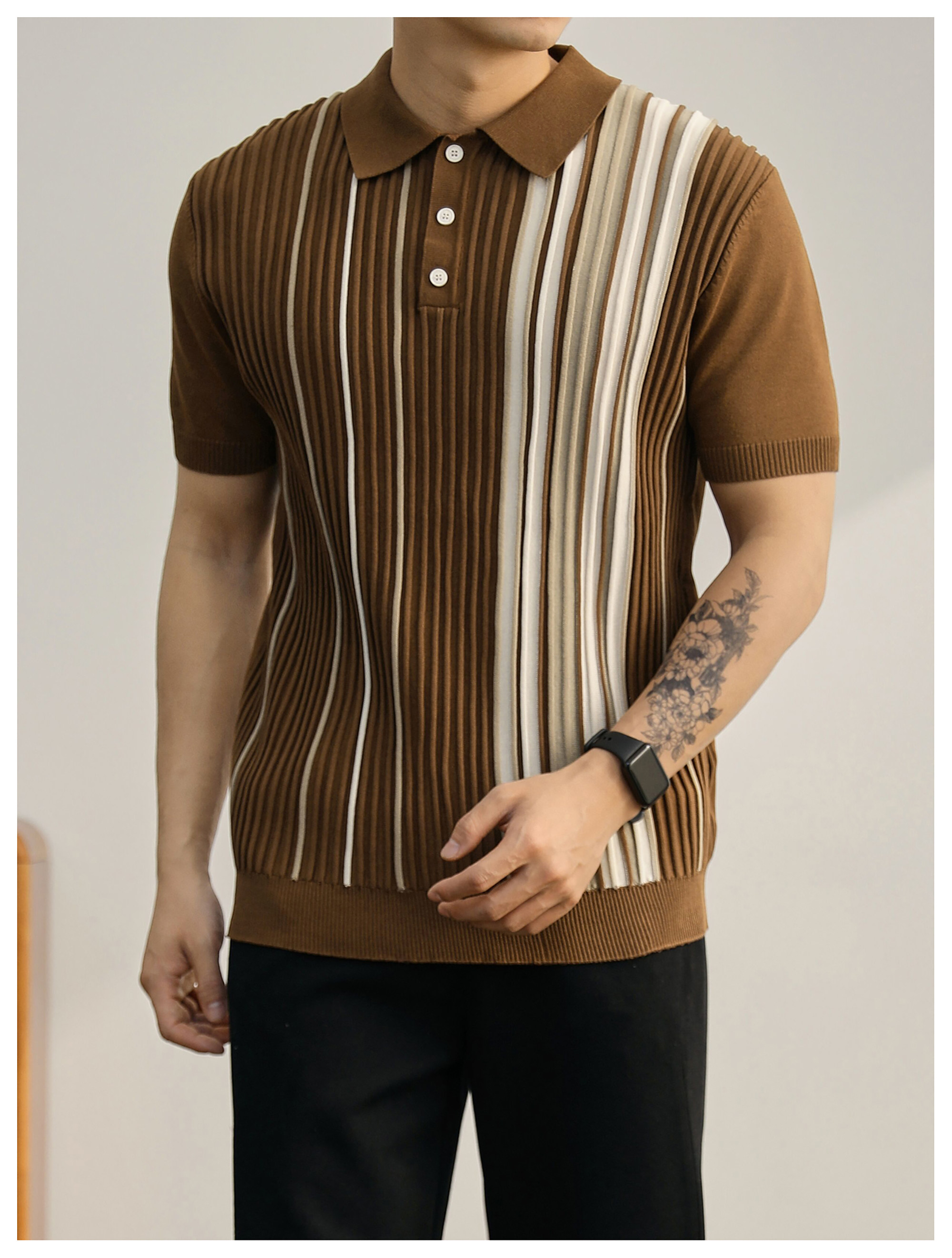 男士輕奢英倫風短袖Polo衫潮流撞色坑條紋理修身針織保羅衫