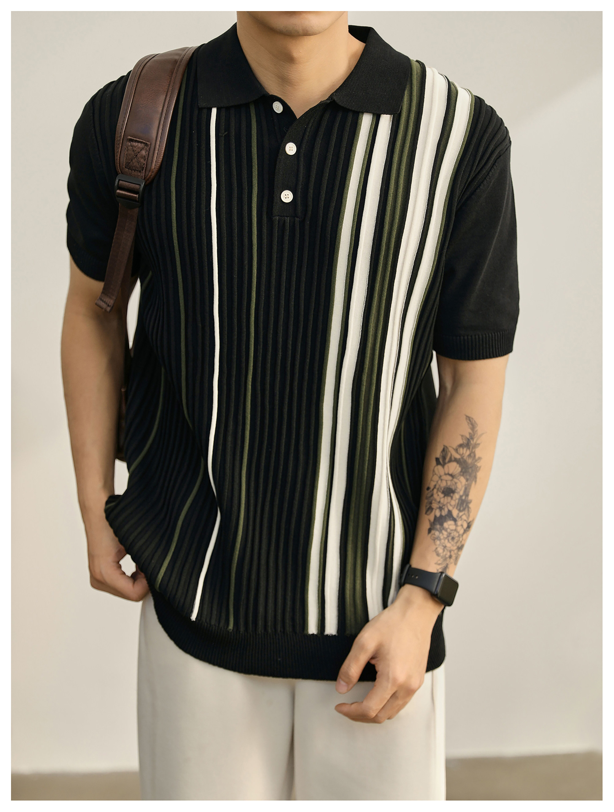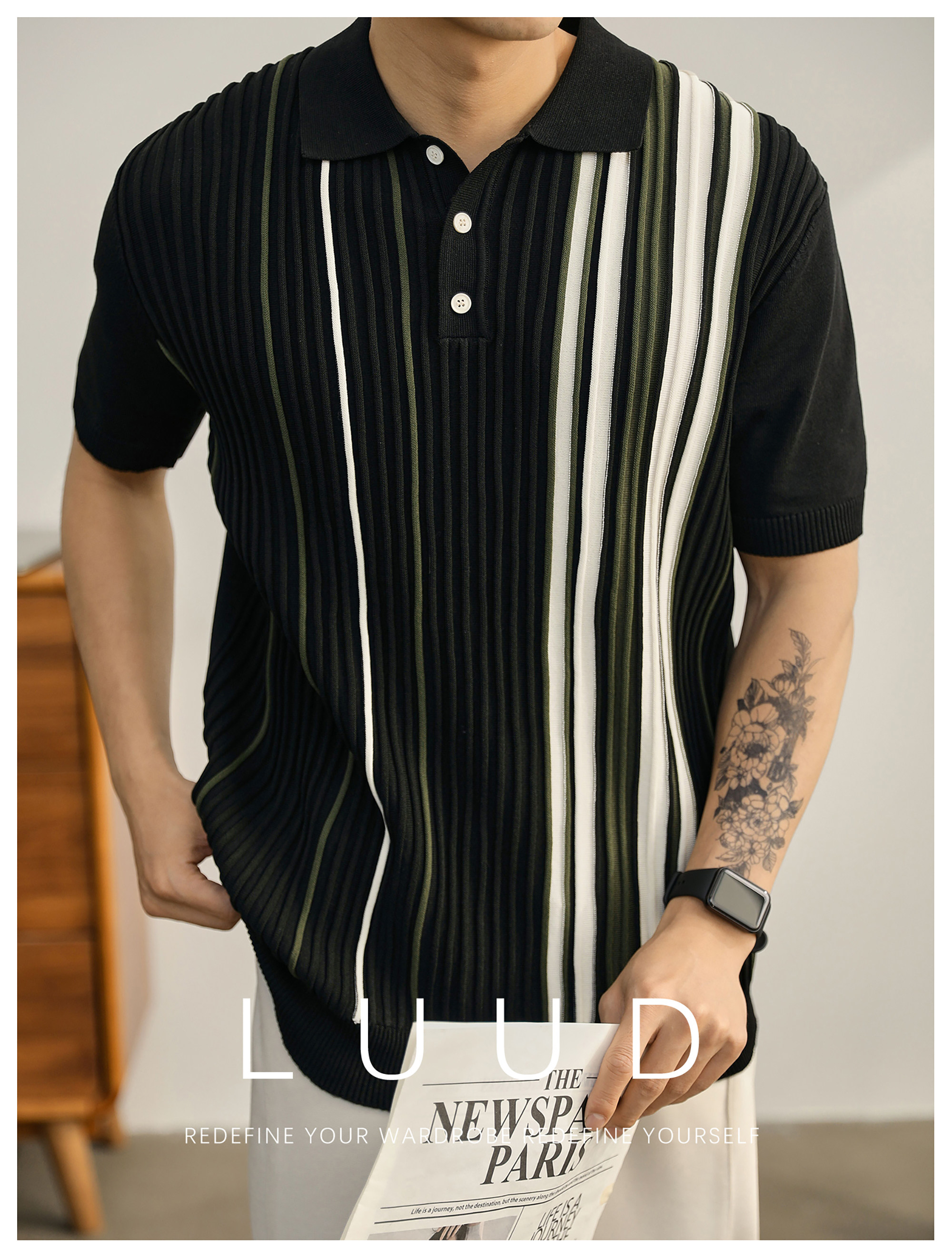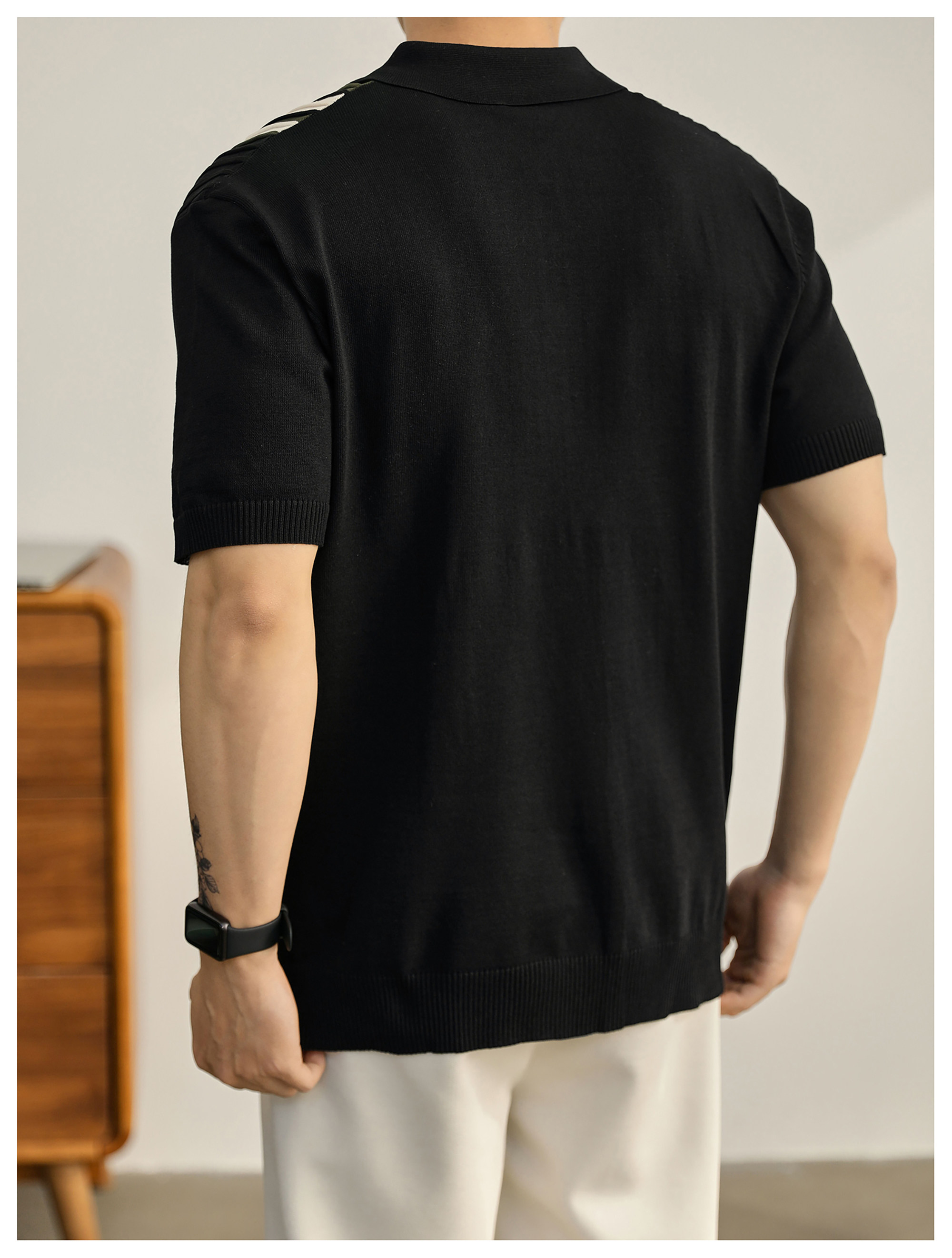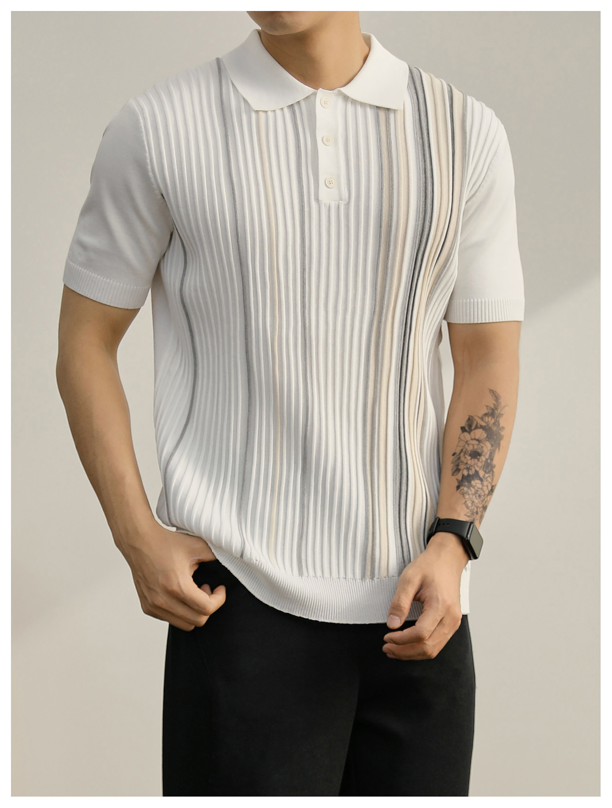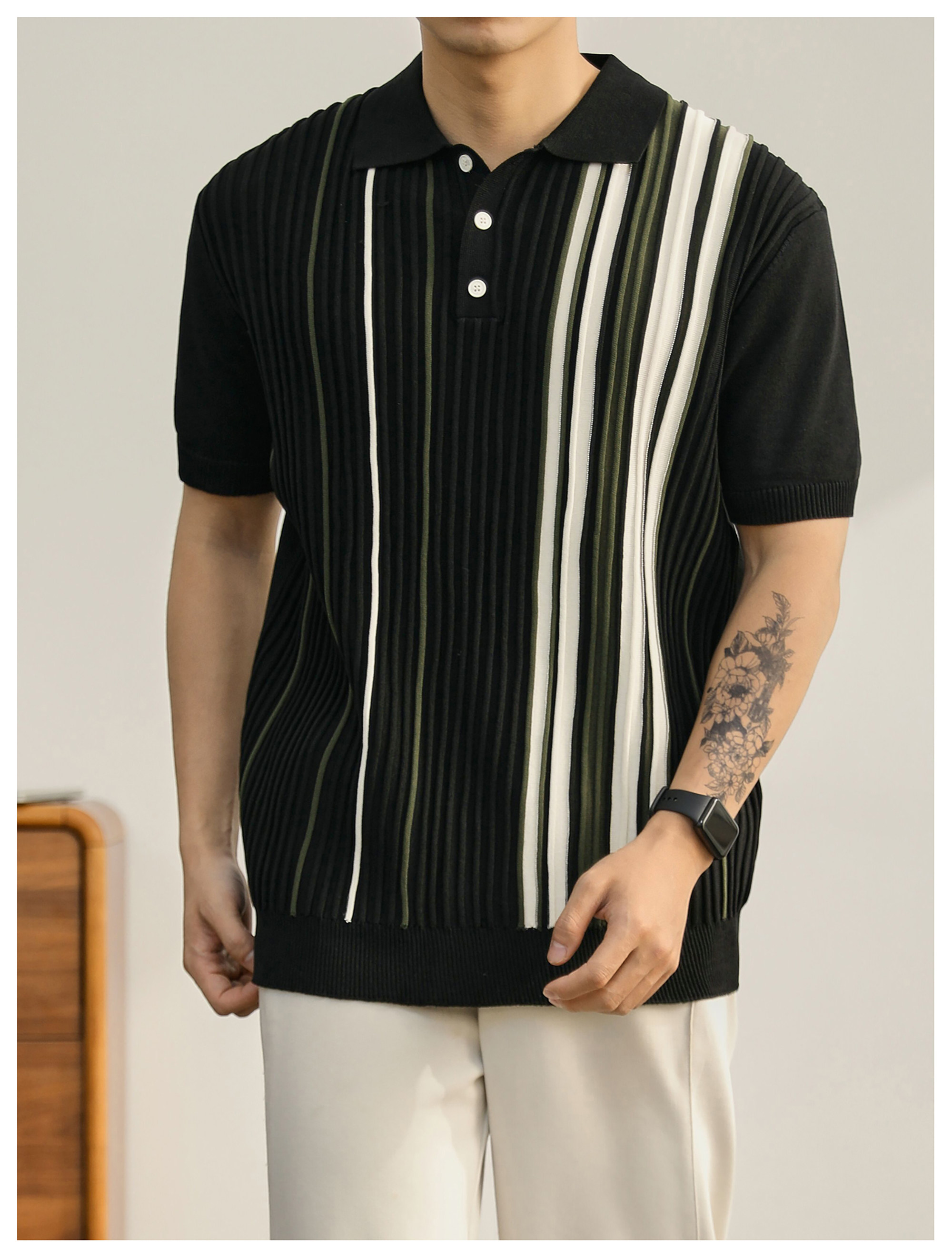 男士輕奢英倫風短袖Polo衫潮流撞色坑條紋理修身針織保羅衫