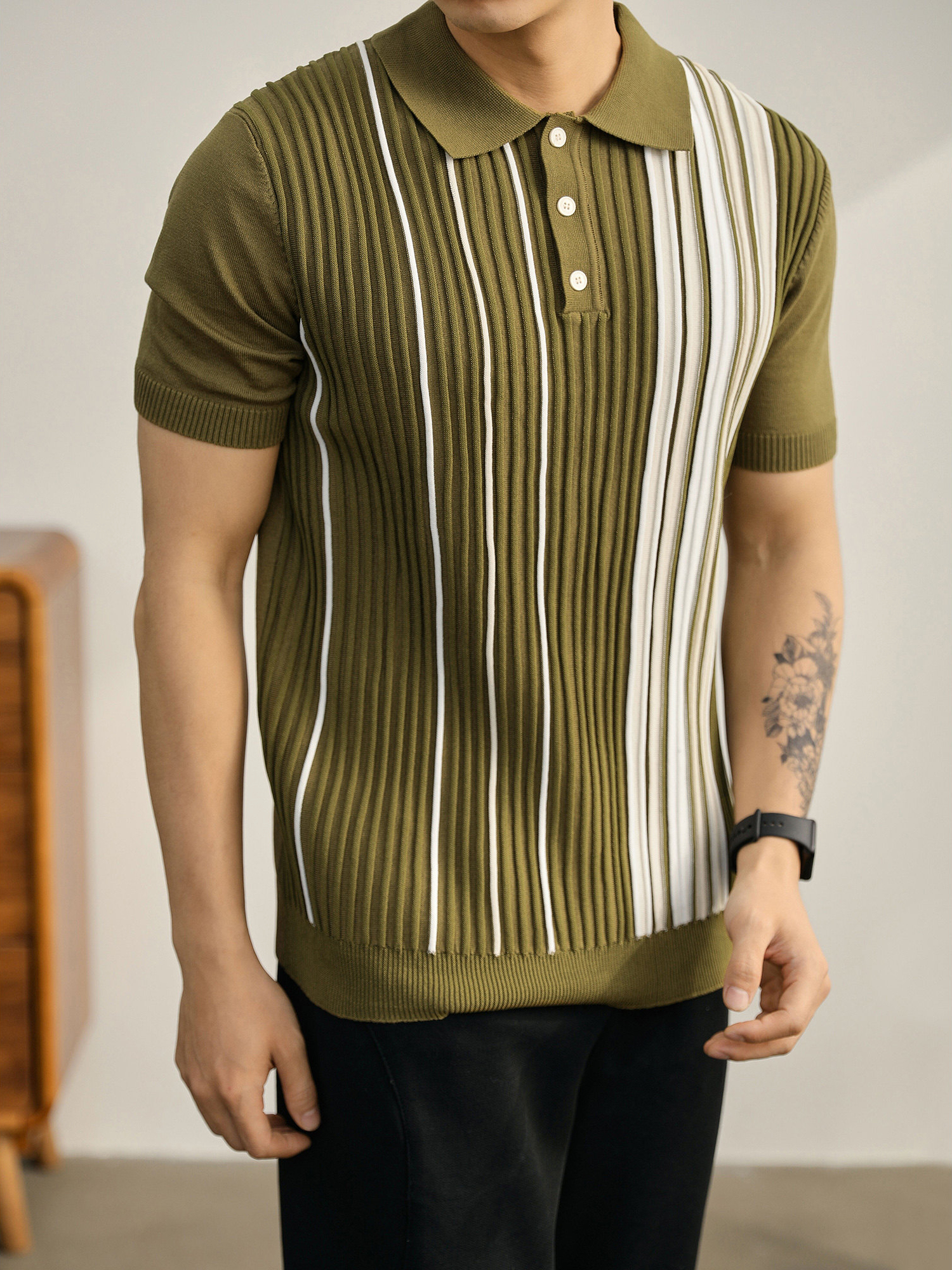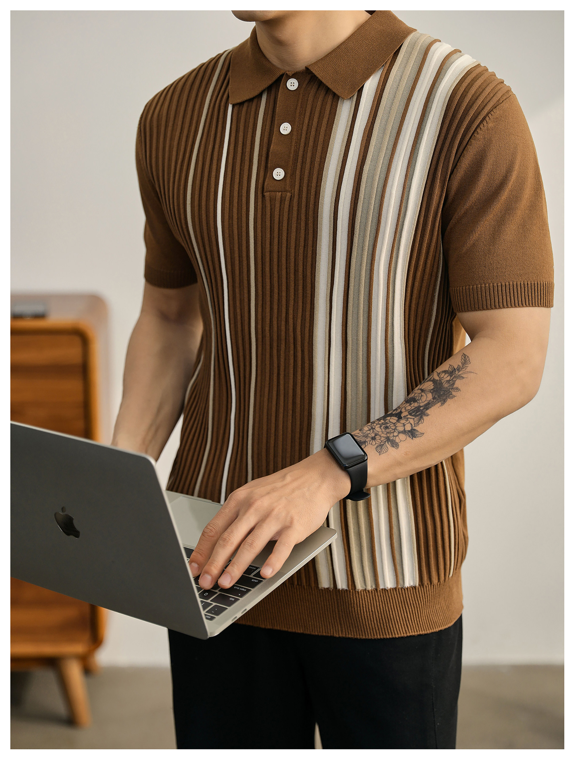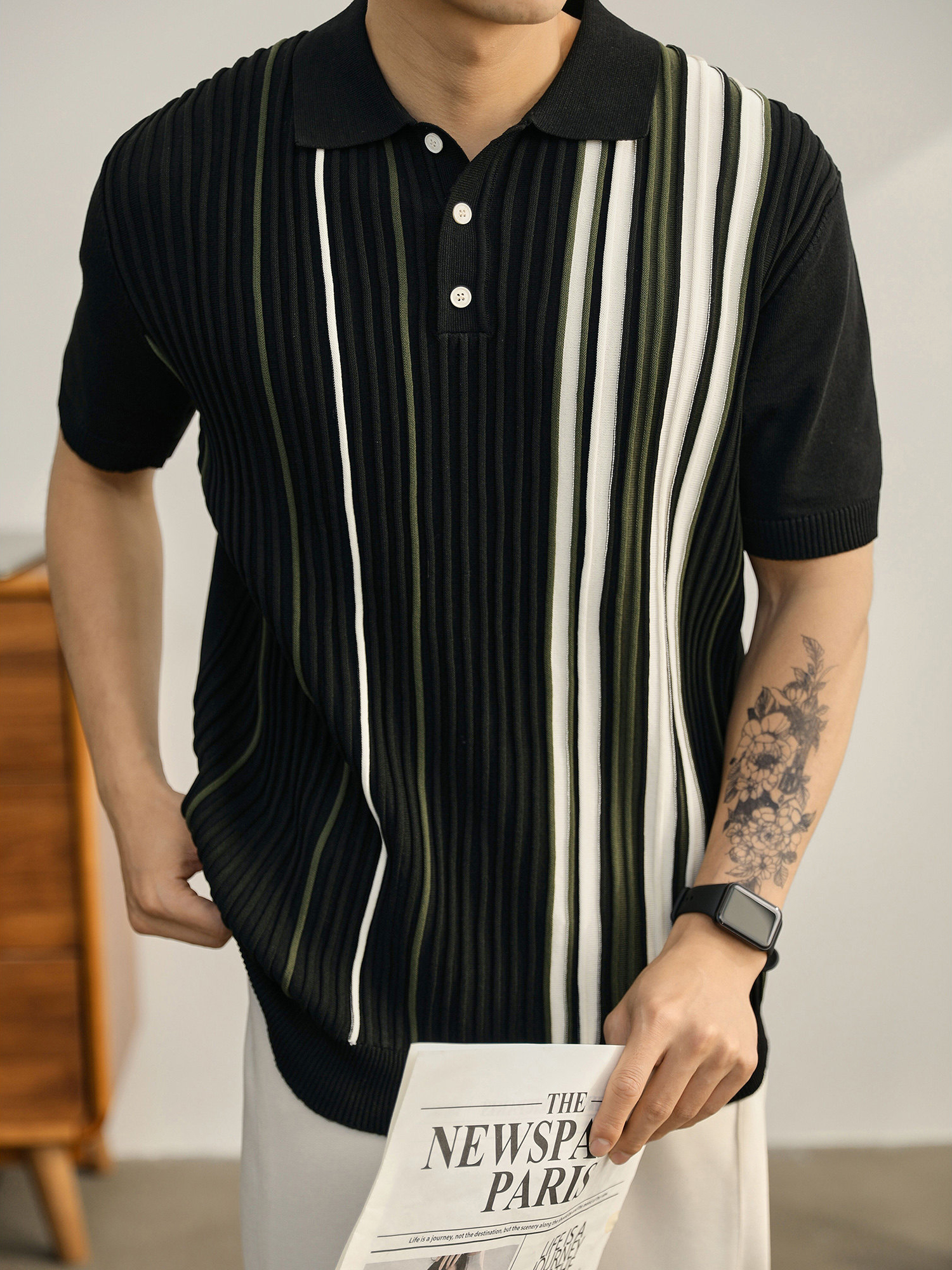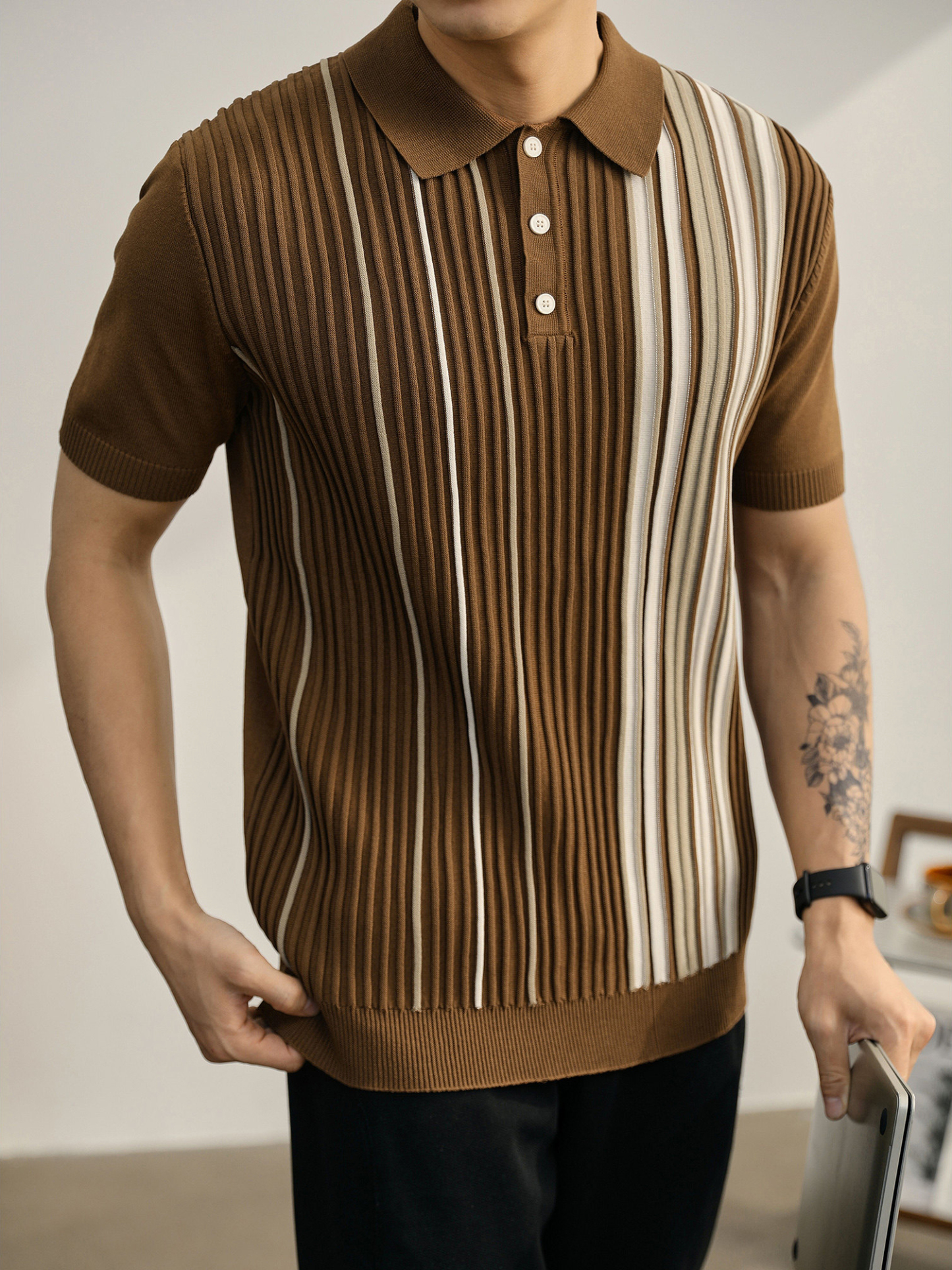 男士輕奢英倫風短袖Polo衫潮流撞色坑條紋理修身針織保羅衫