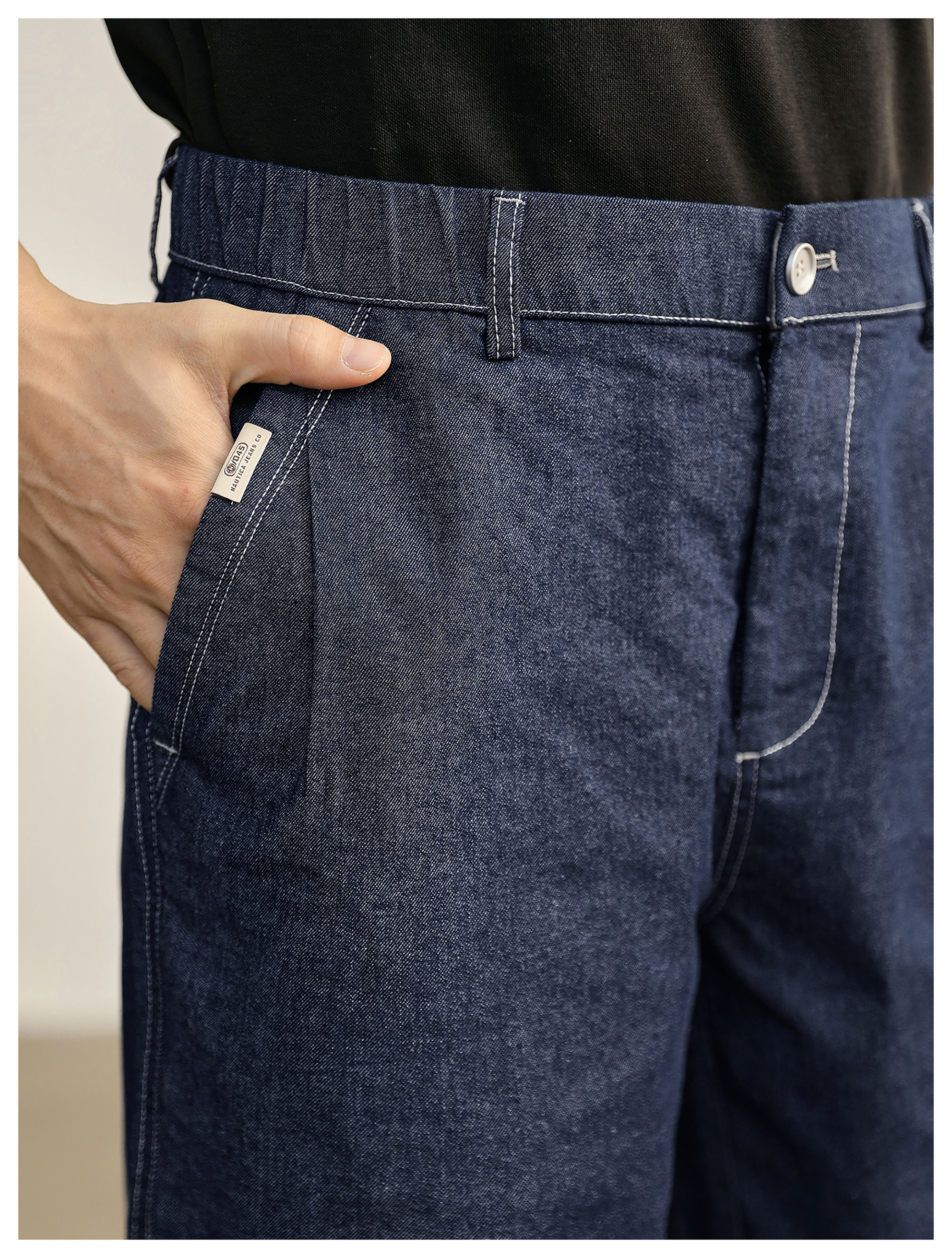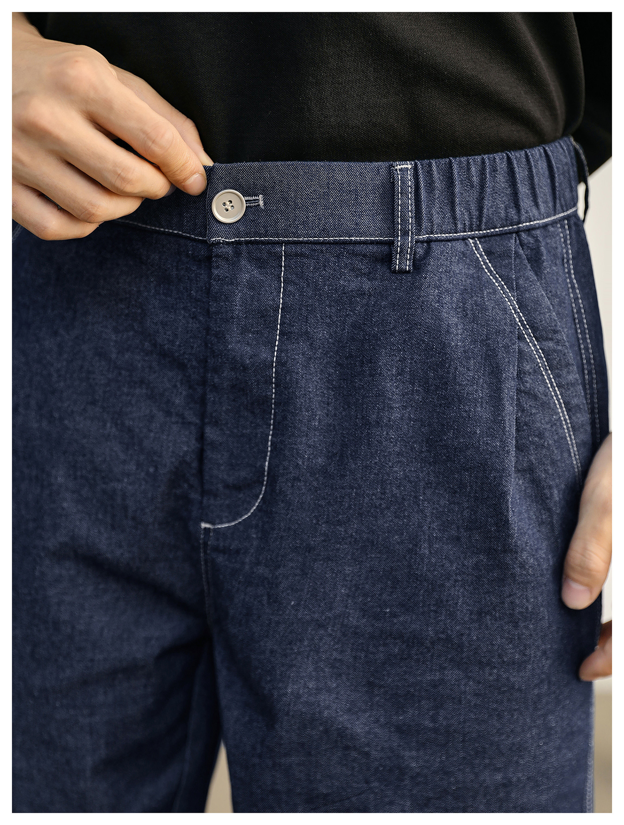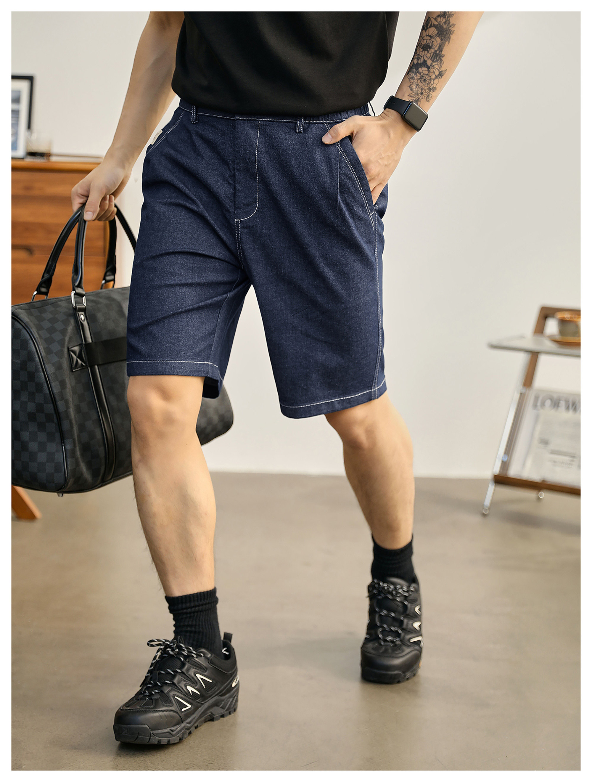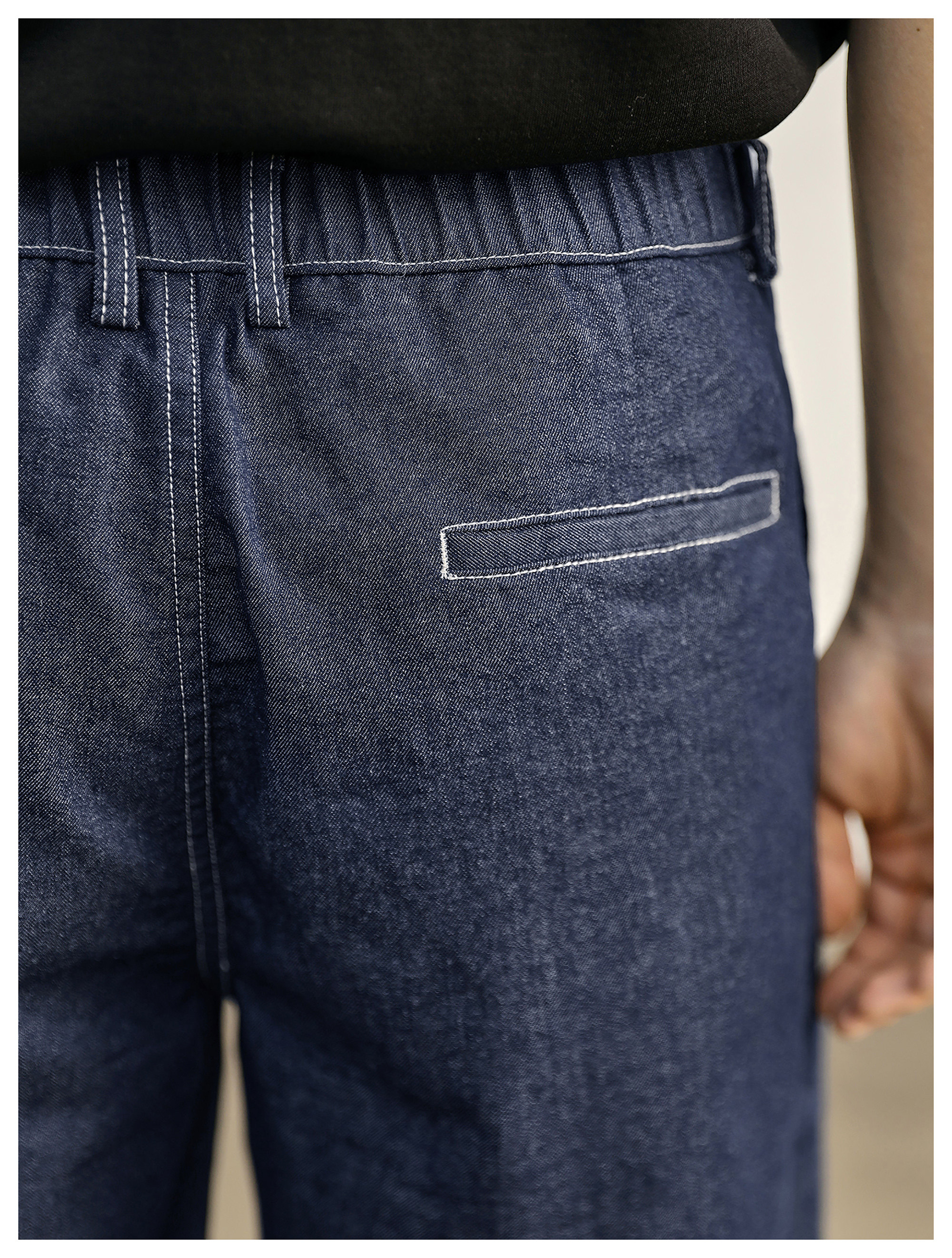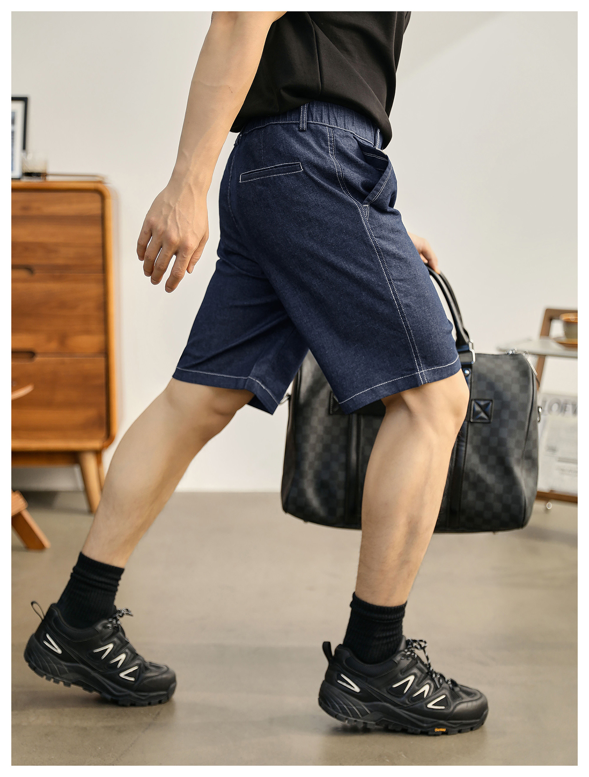 痞帥牛仔藍色直筒短褲男復古百搭立體休閒褲子半鬆緊腰中褲