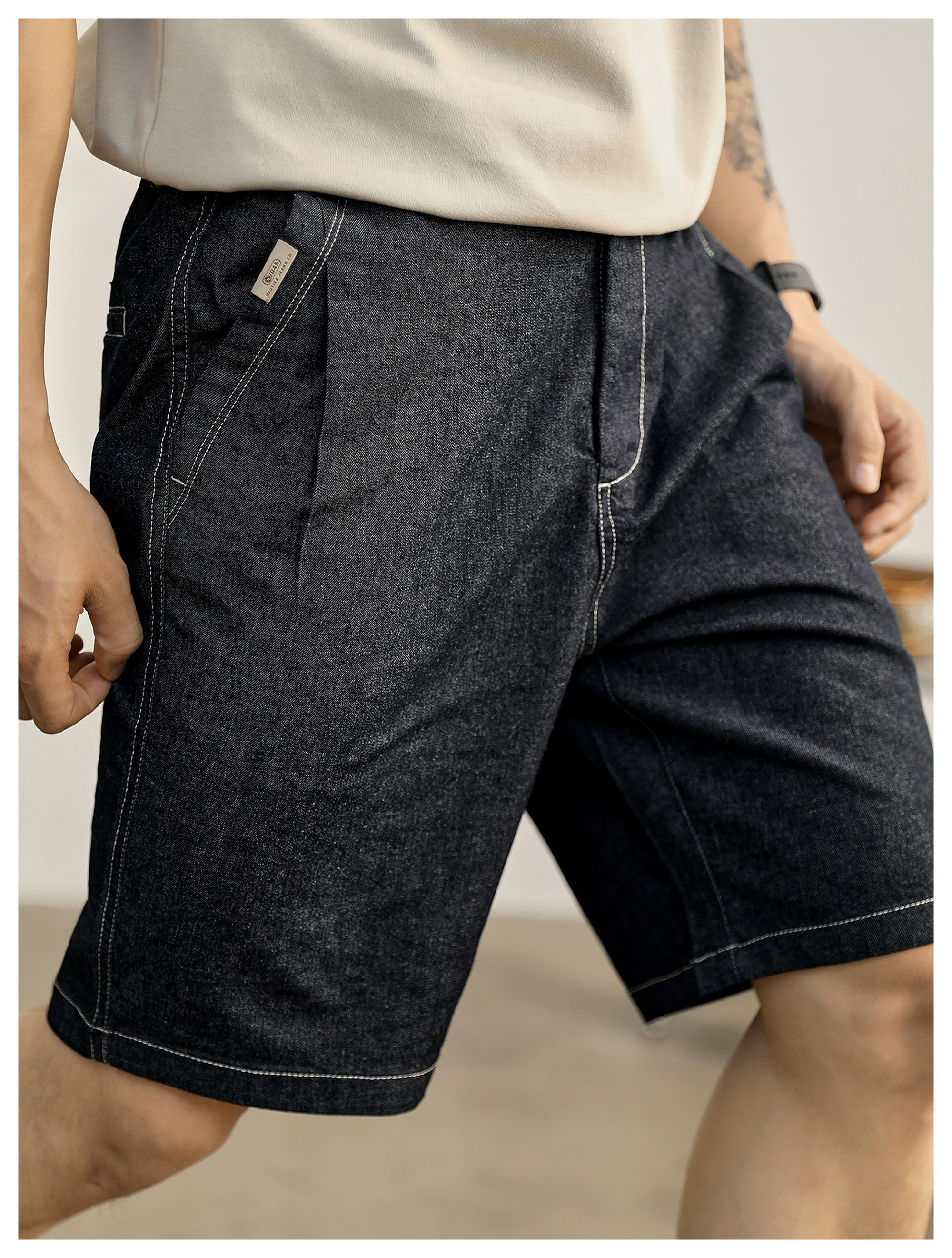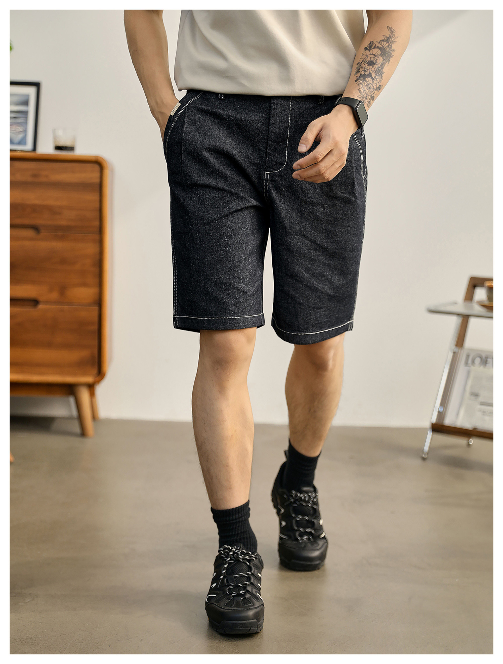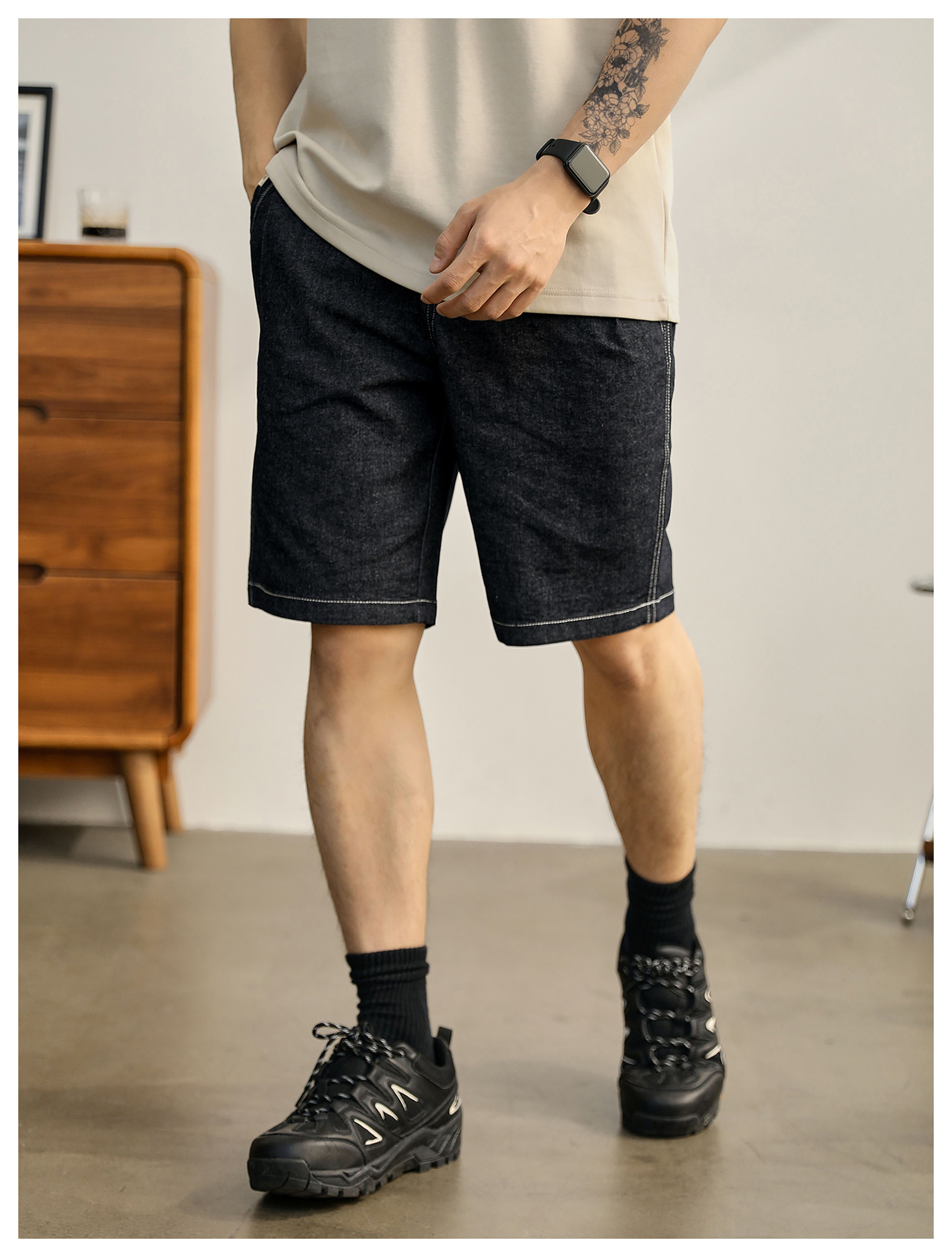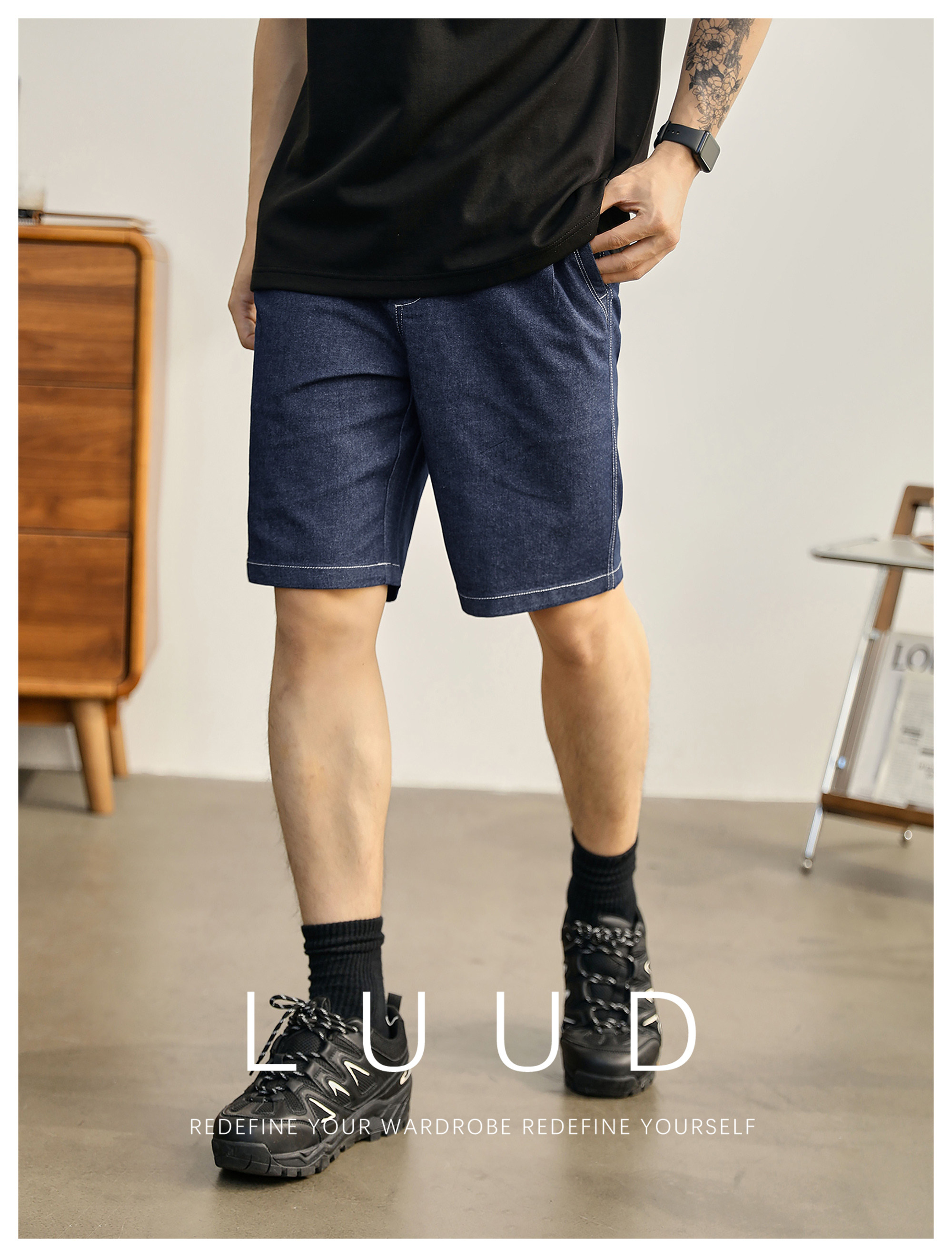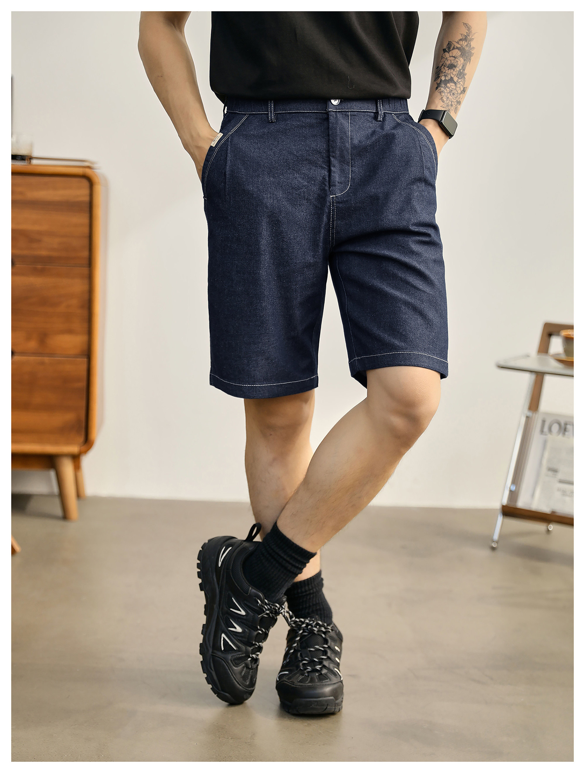 痞帥牛仔藍色直筒短褲男復古百搭立體休閒褲子半鬆緊腰中褲
