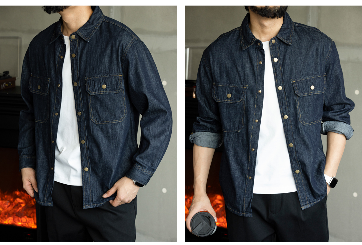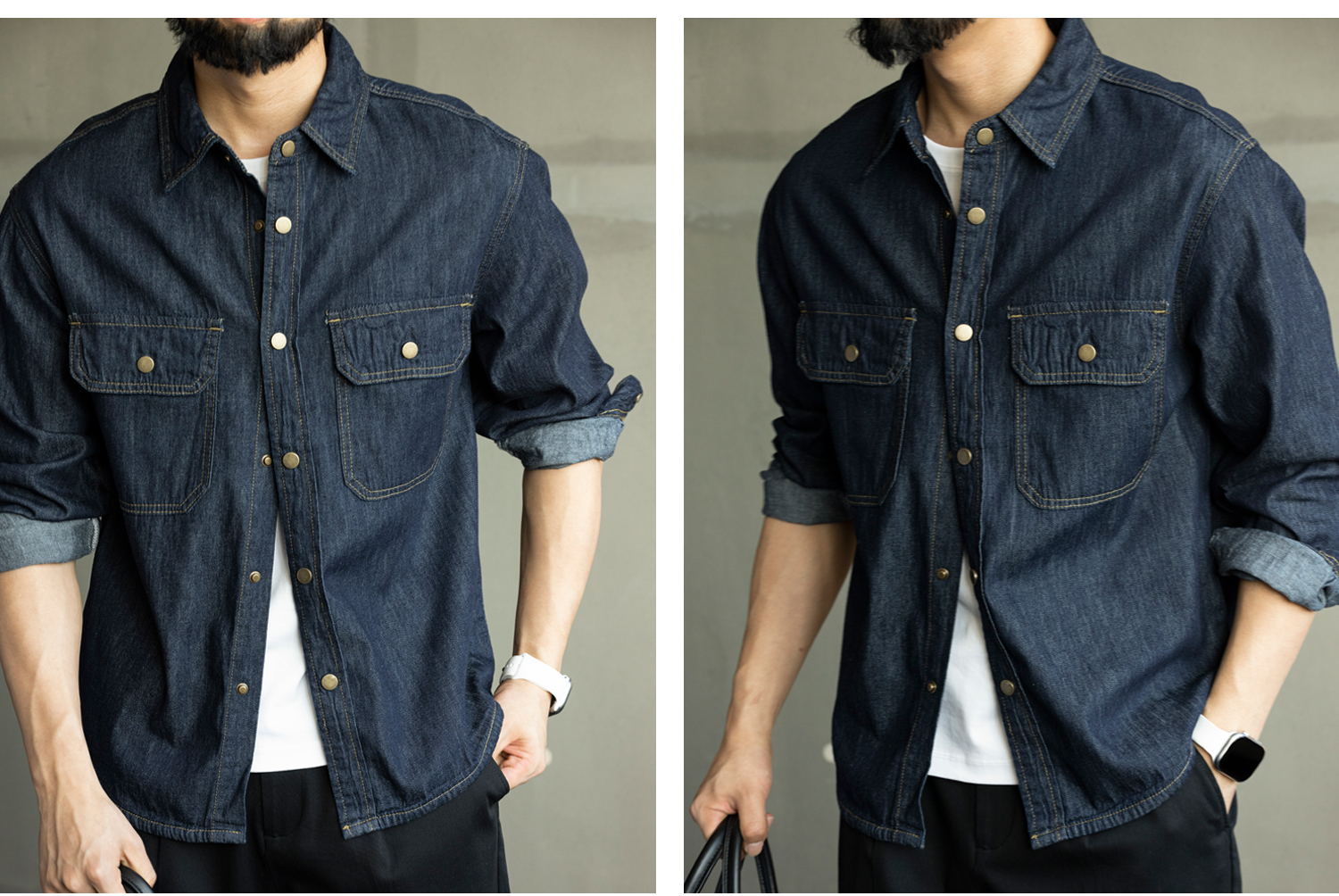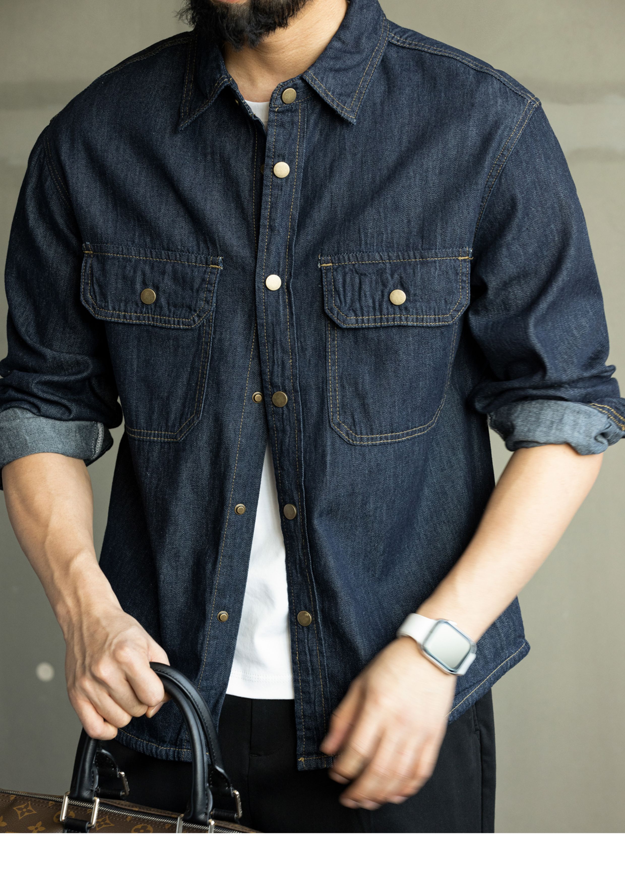 秋季新款原色水洗復古牛仔長袖襯衫男士寬鬆純棉高級簡約襯衣外套