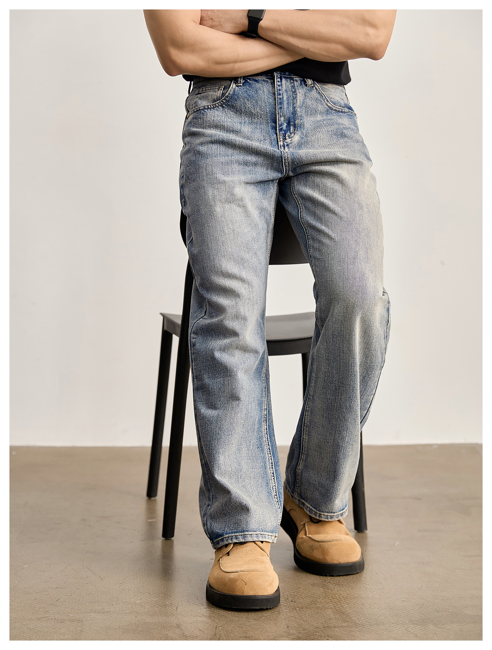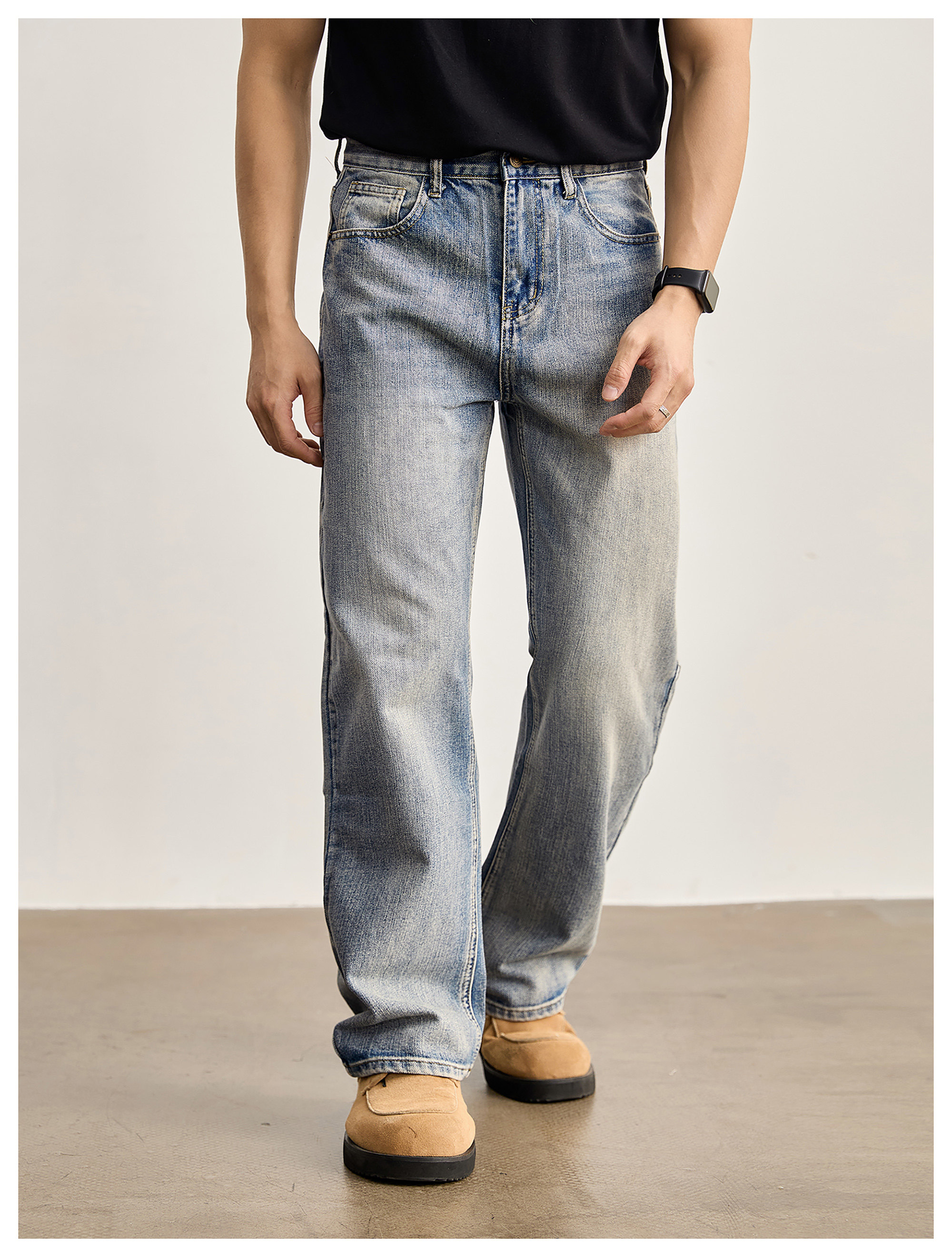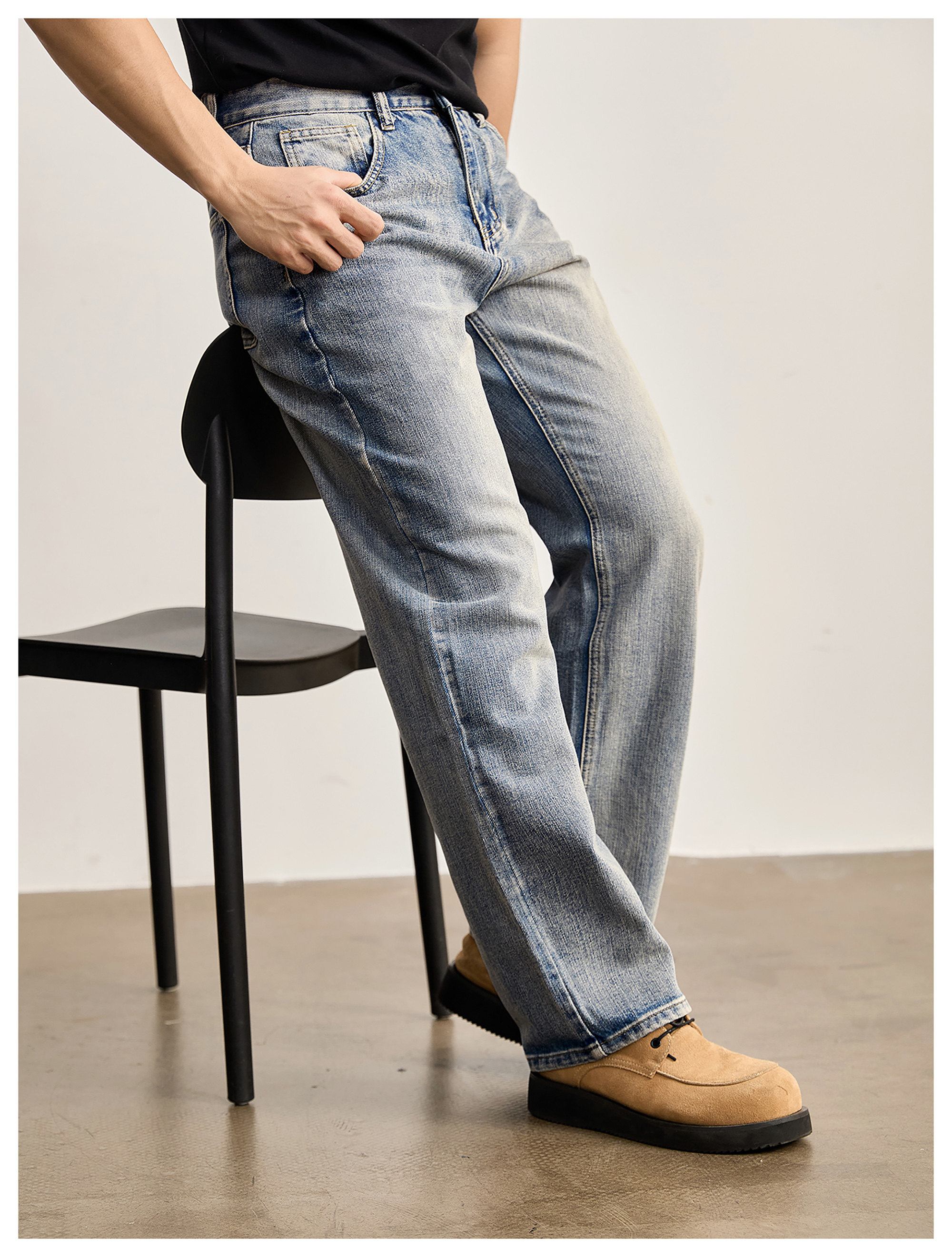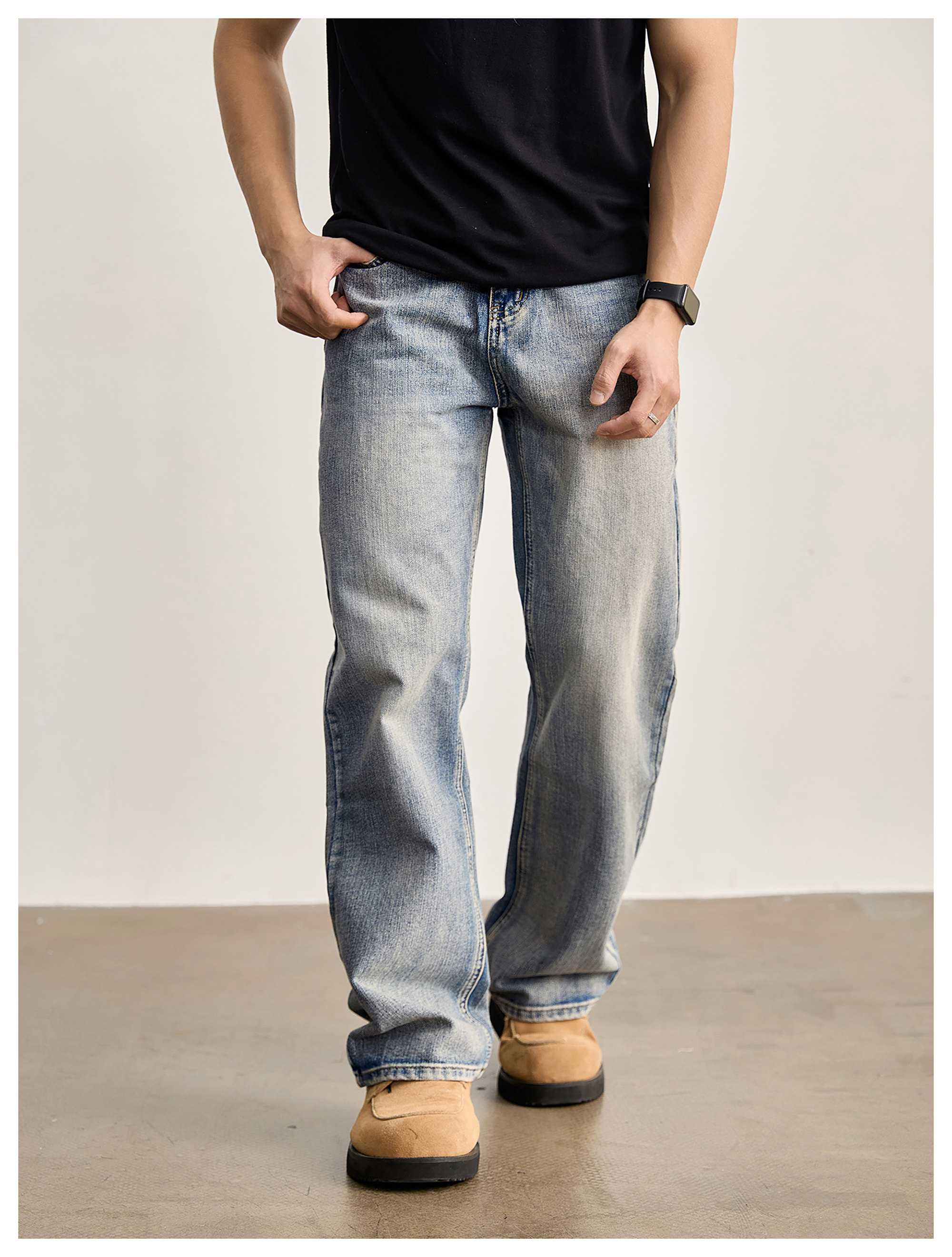 竹節藍貓須復古直筒牛仔褲男美式潮流水洗做舊休閒長褲春夏
