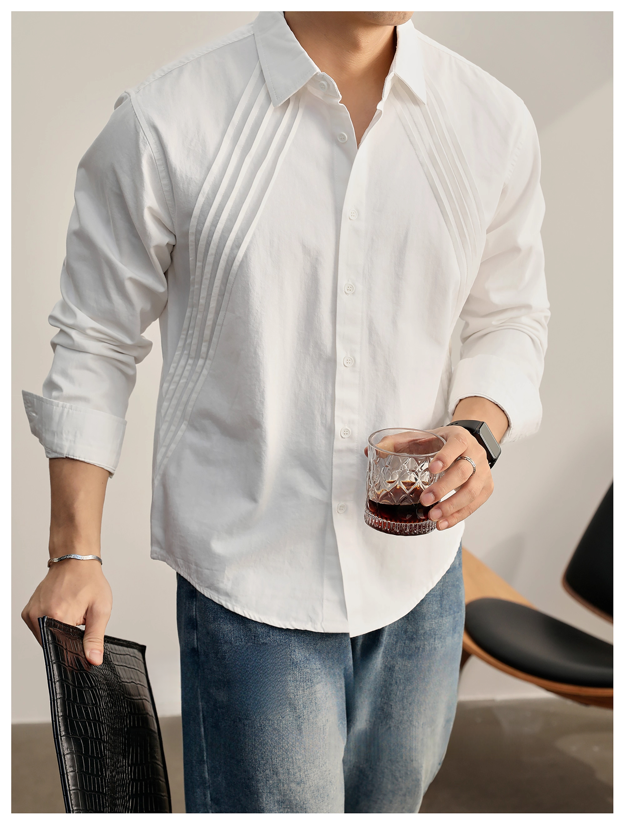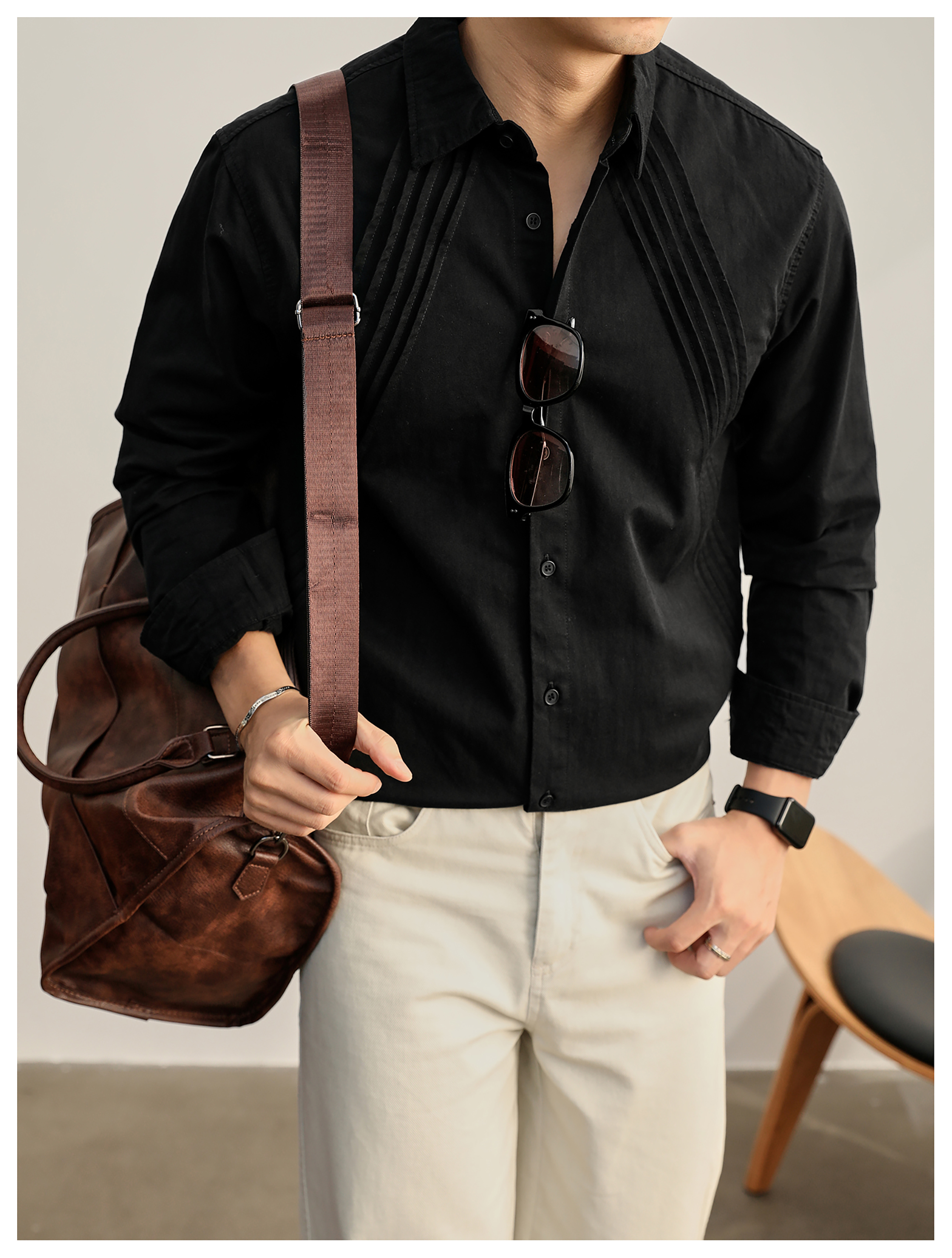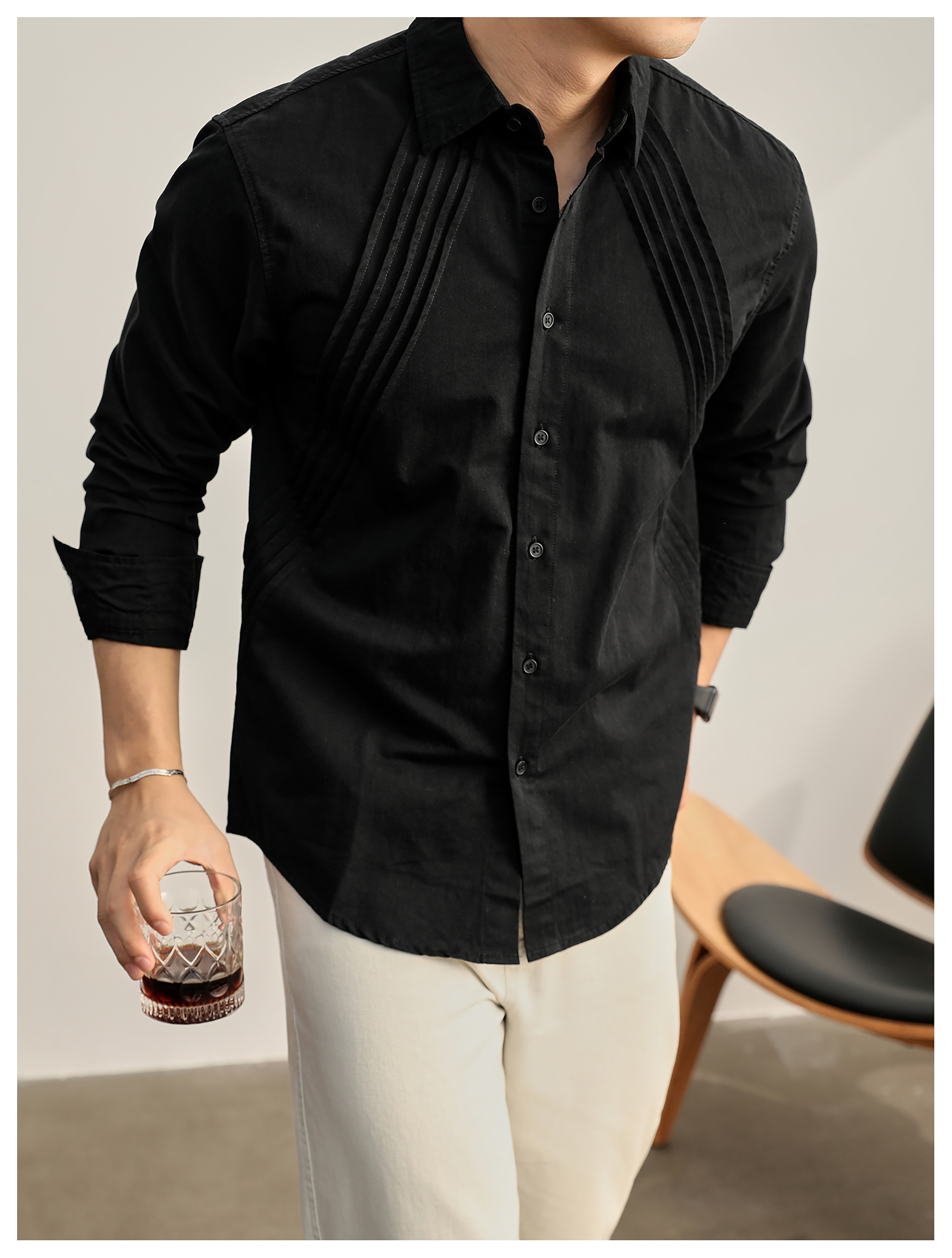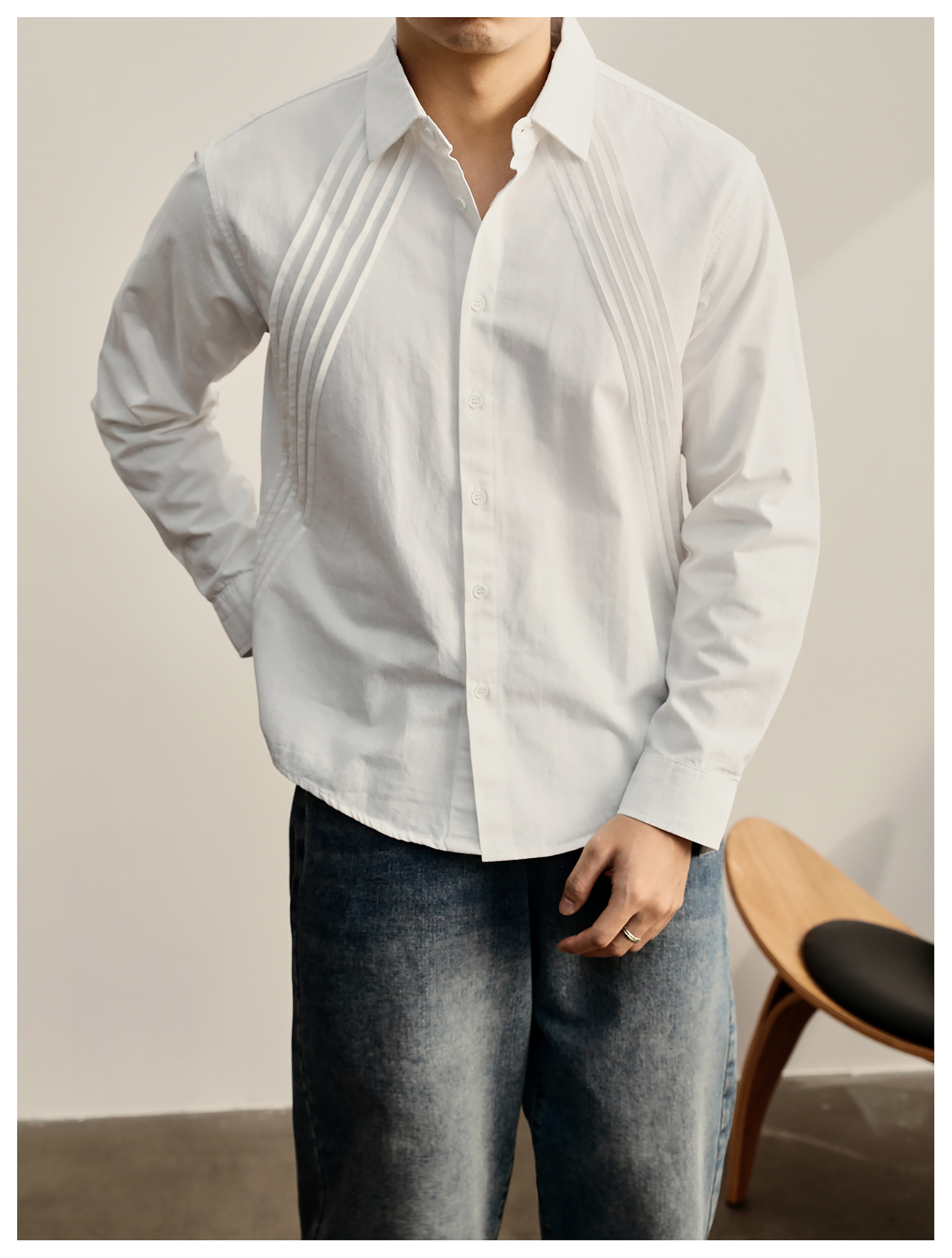 純色個性壓褶長袖襯衫100%純棉水洗挺括外穿百搭慵懶風襯衣