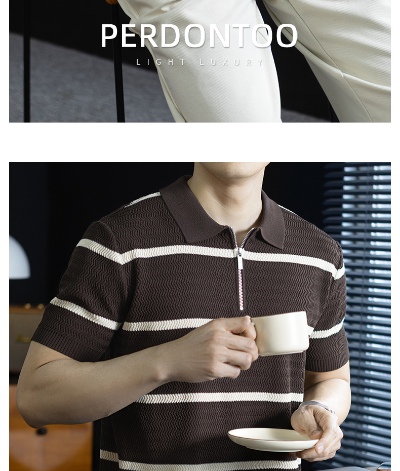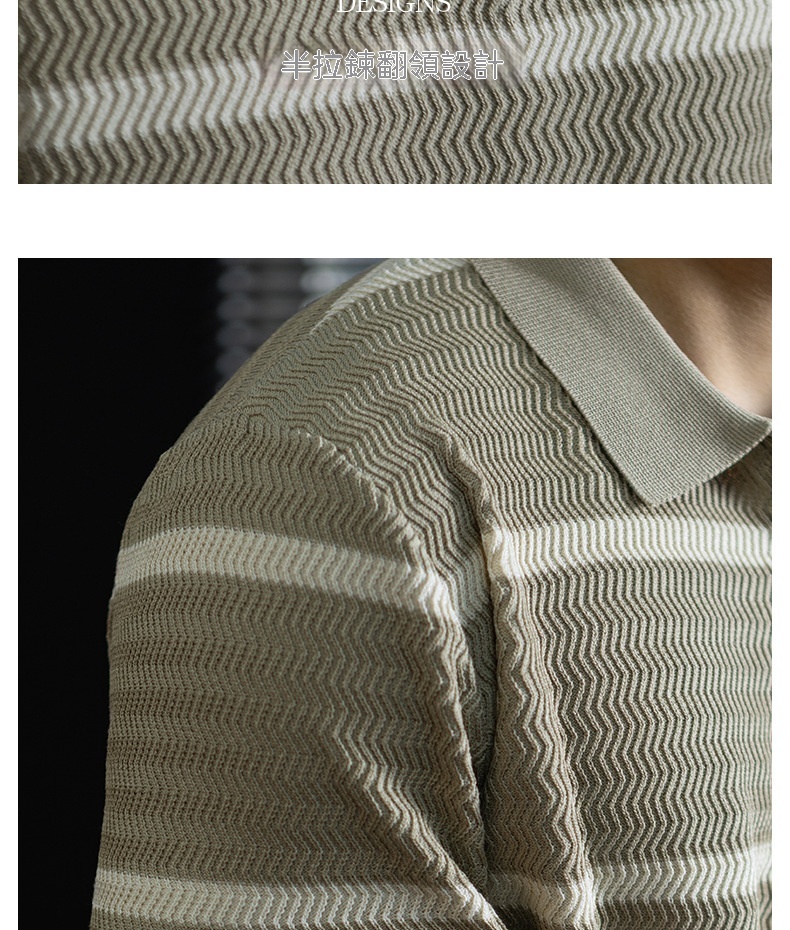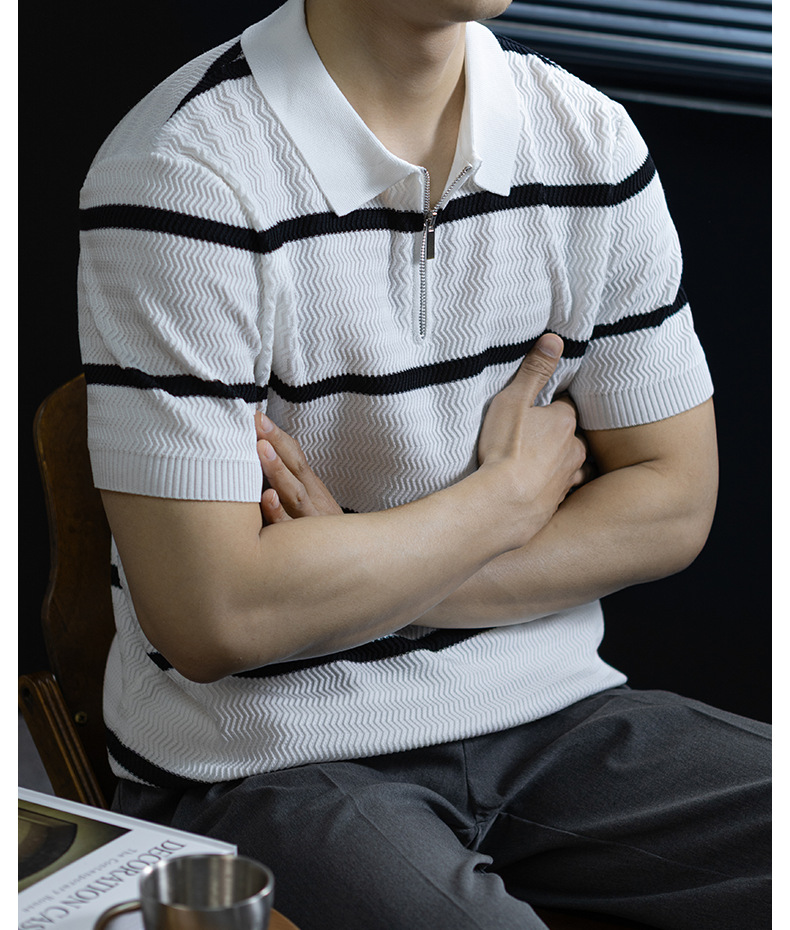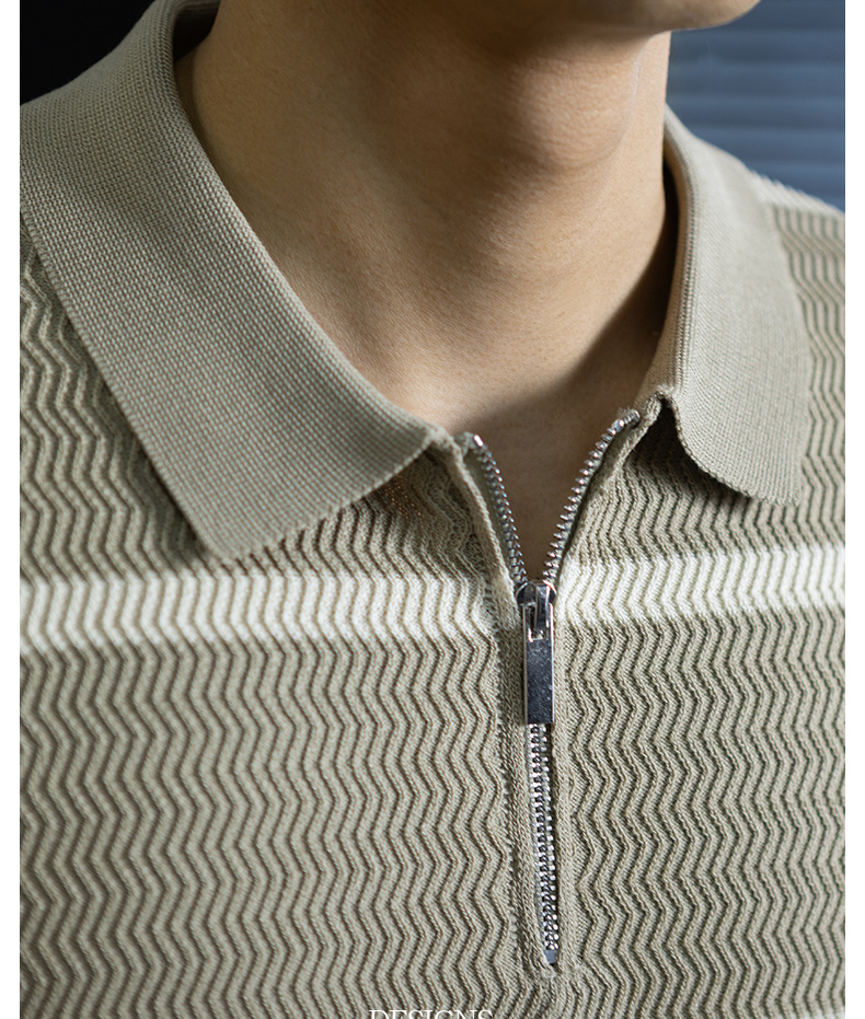 美式復古風!輕奢撞色條紋針織衫男士短袖半拉鍊翻領休閒百搭短袖Polo衫