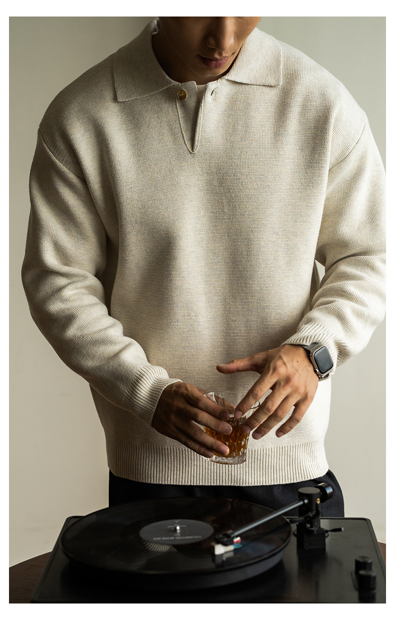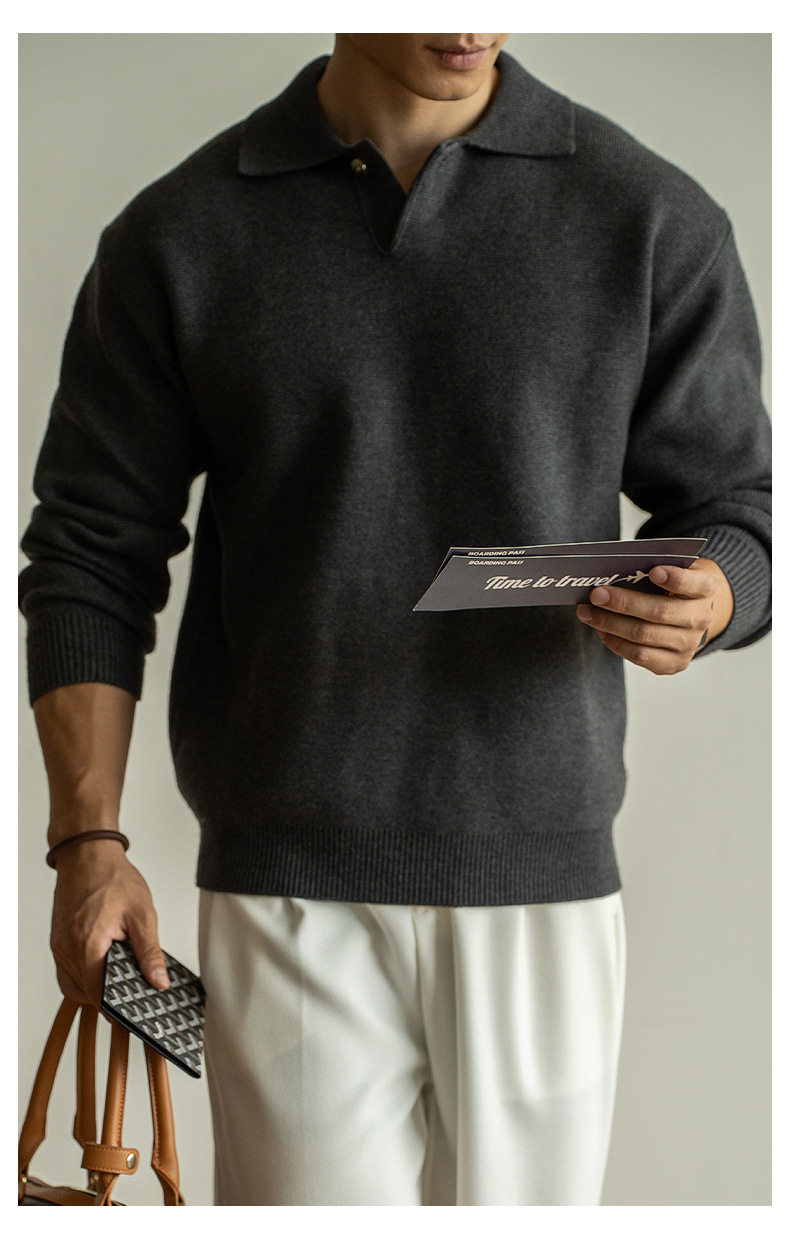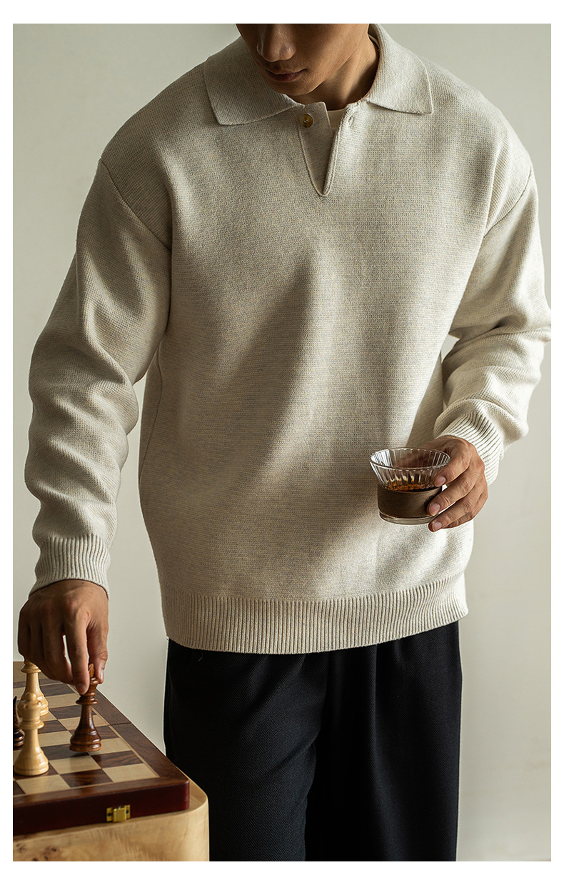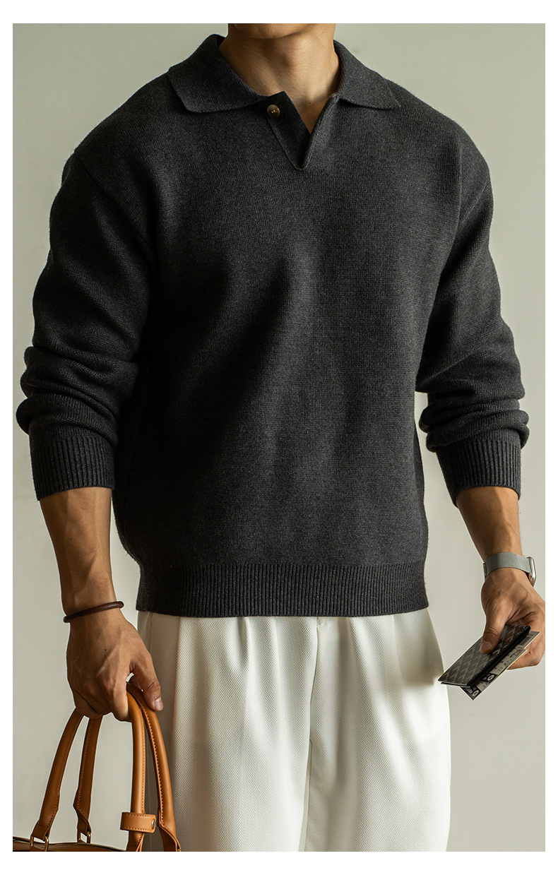 老錢風意式7針米絨翻領半開襟針織衫男士秋冬寬鬆休閒長袖polo衫