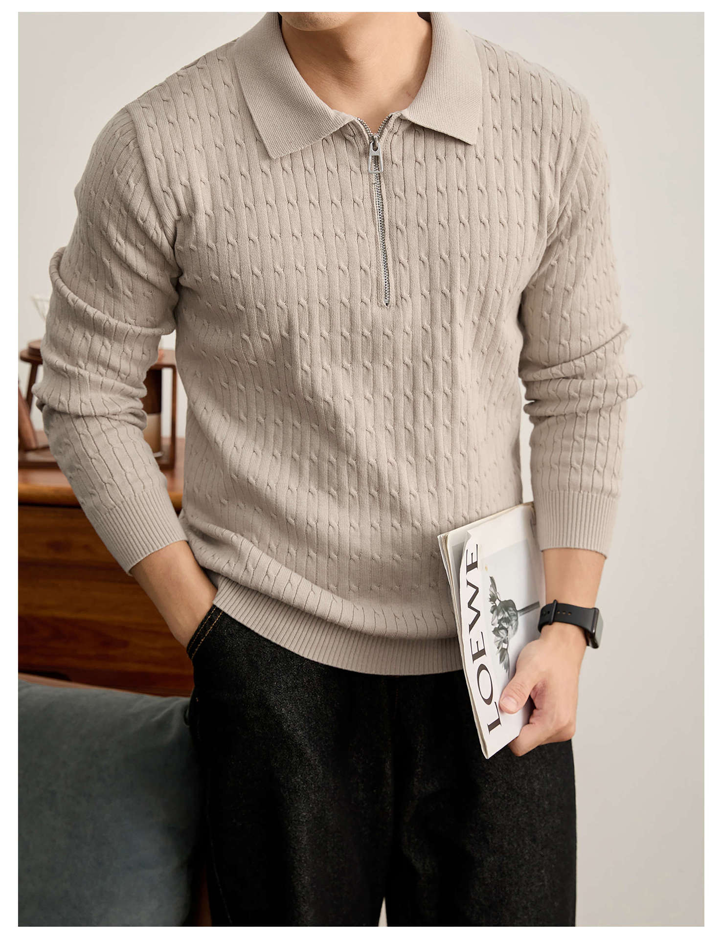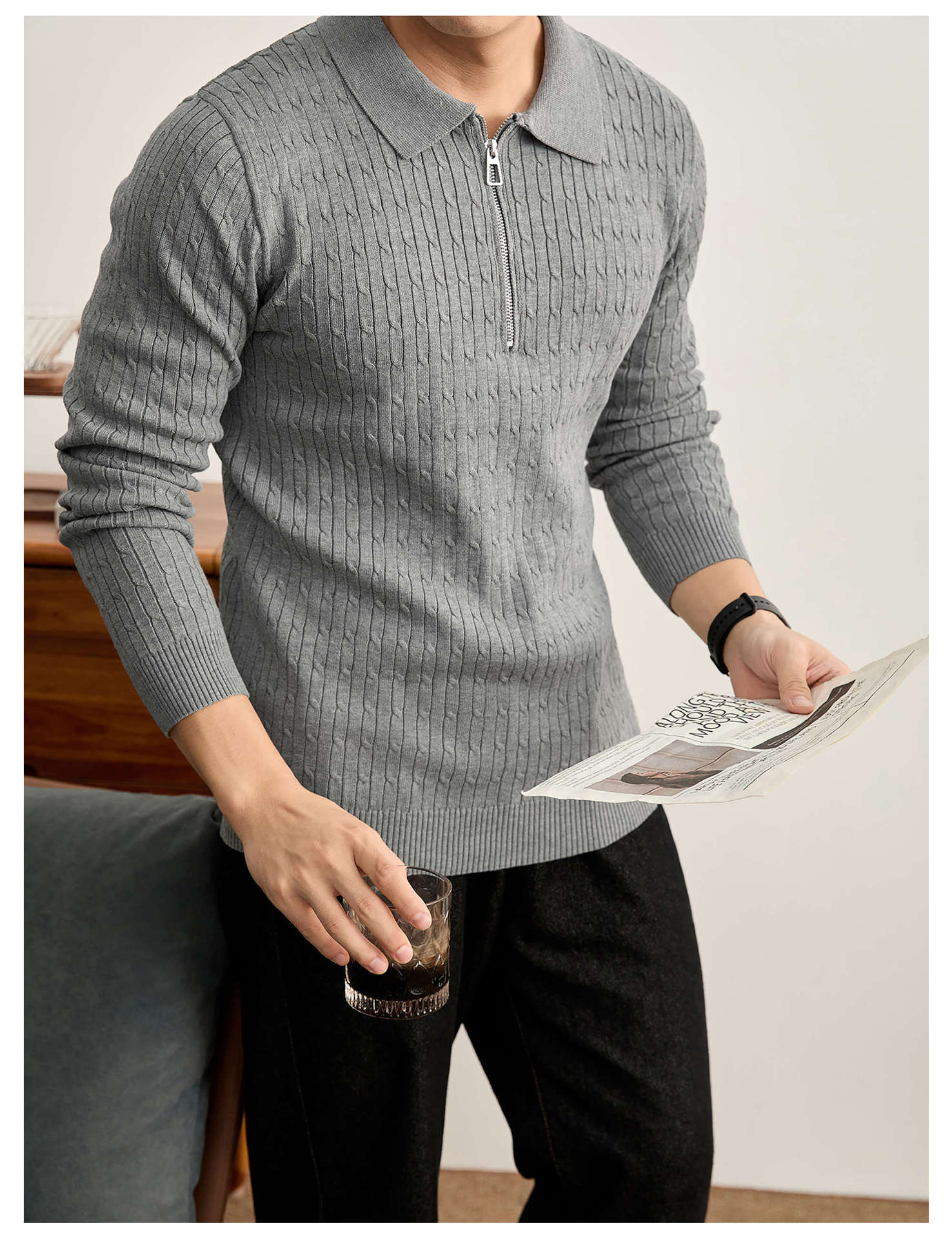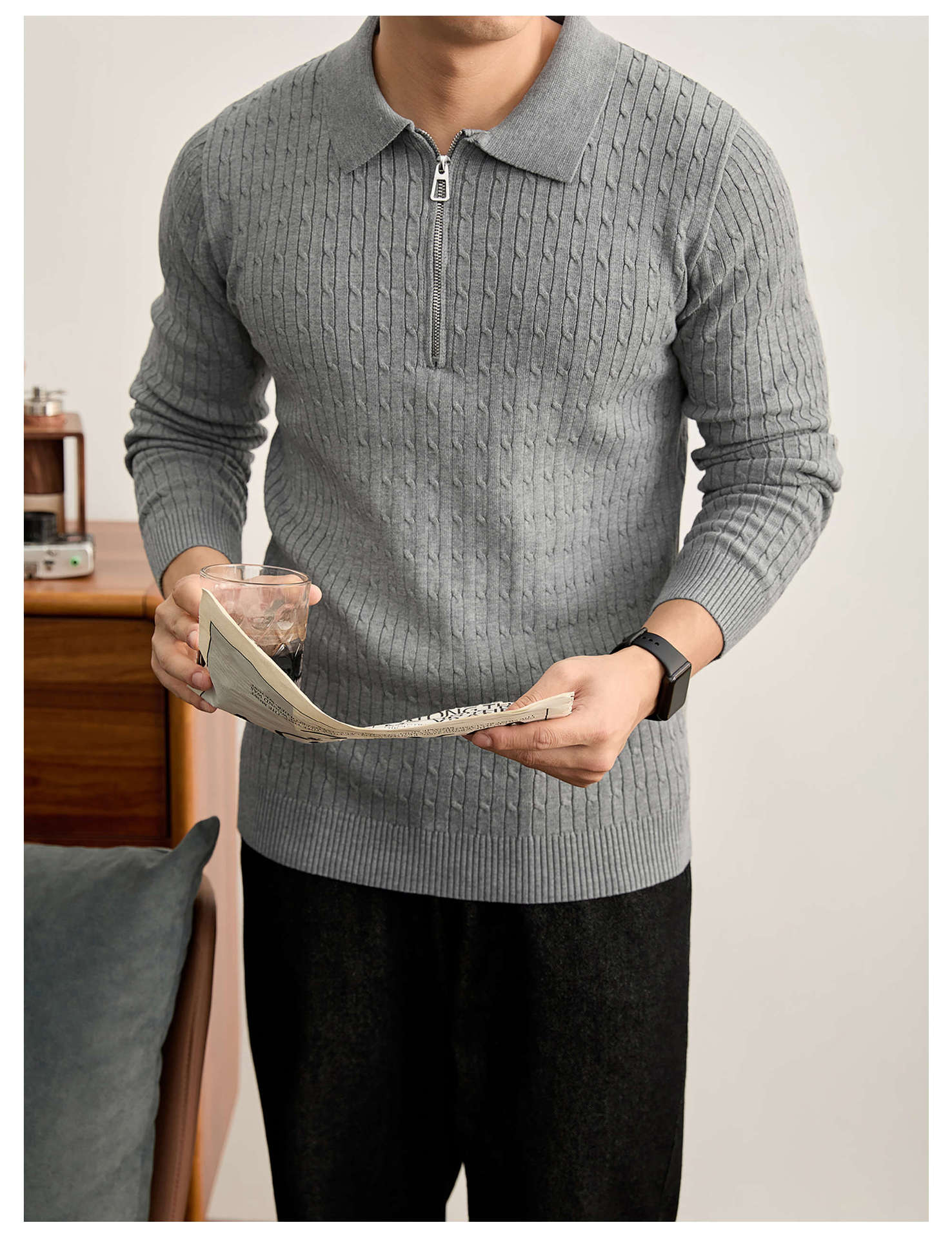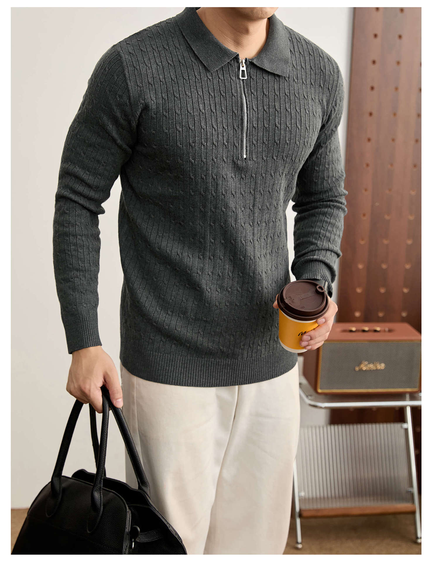 老錢風編織提花紋理長袖毛衣男秋冬修身半拉鍊POLO領針織衫