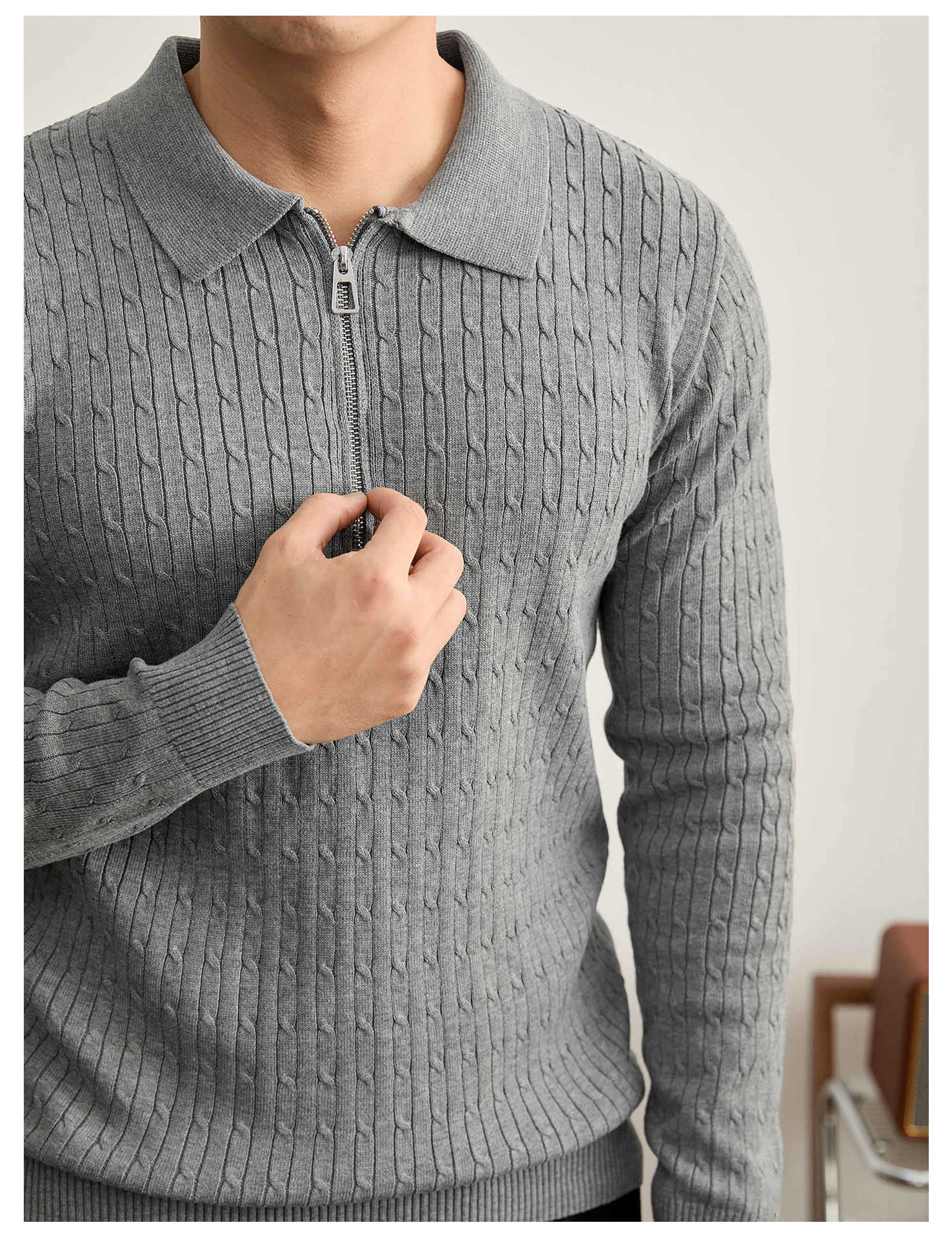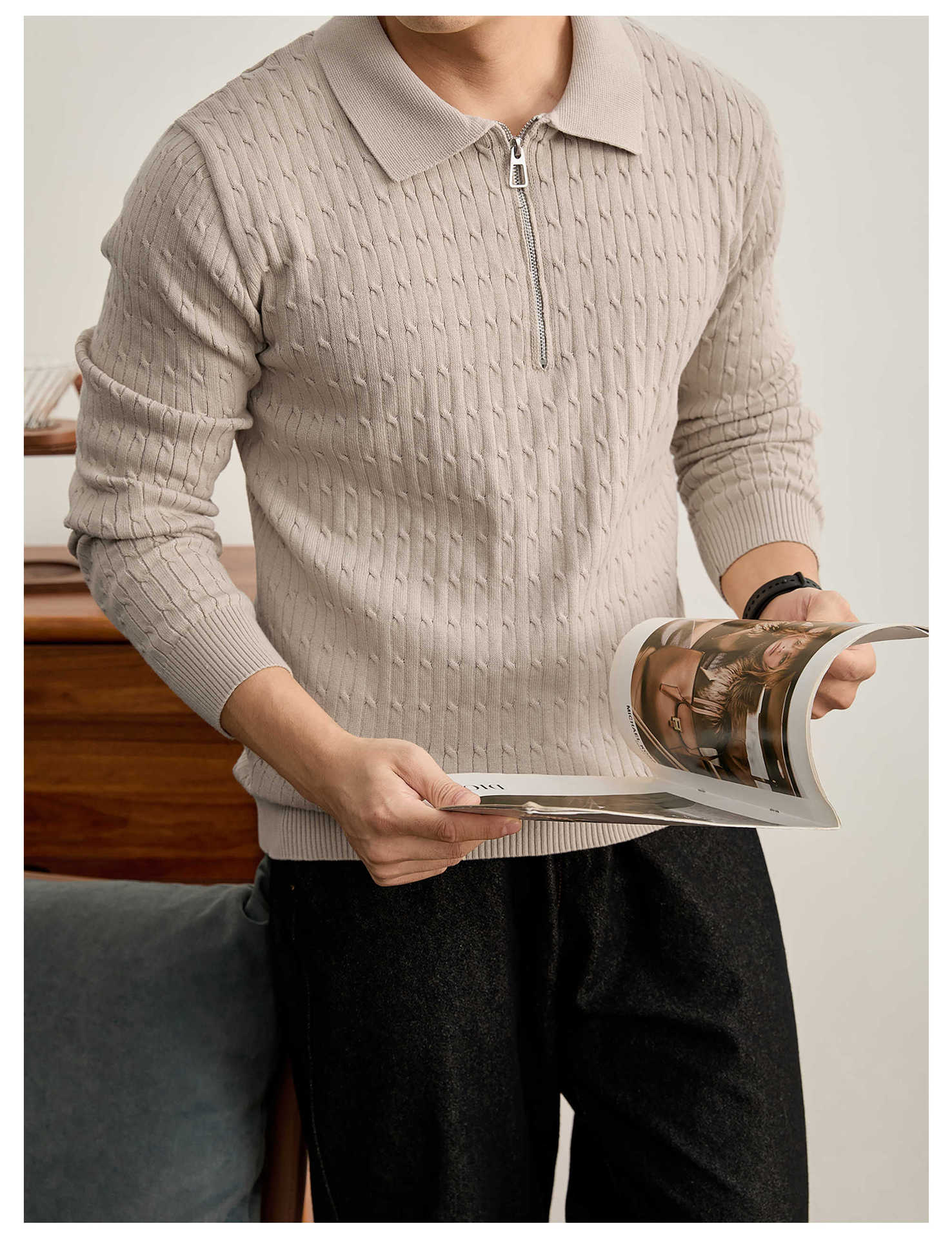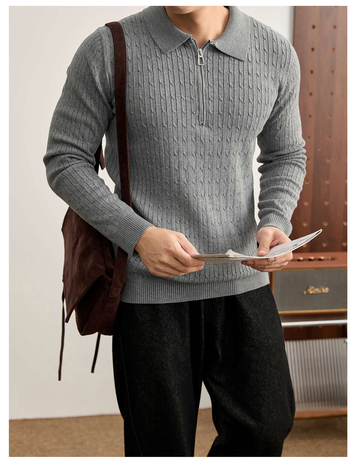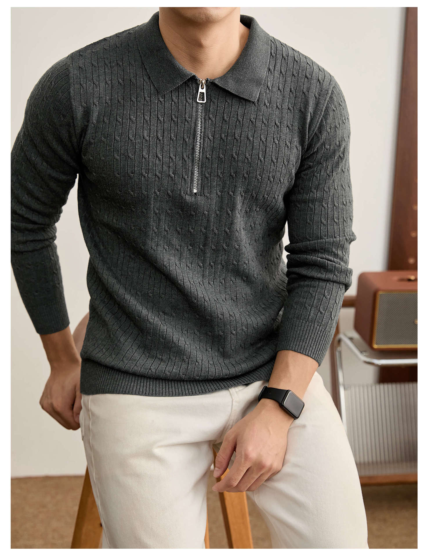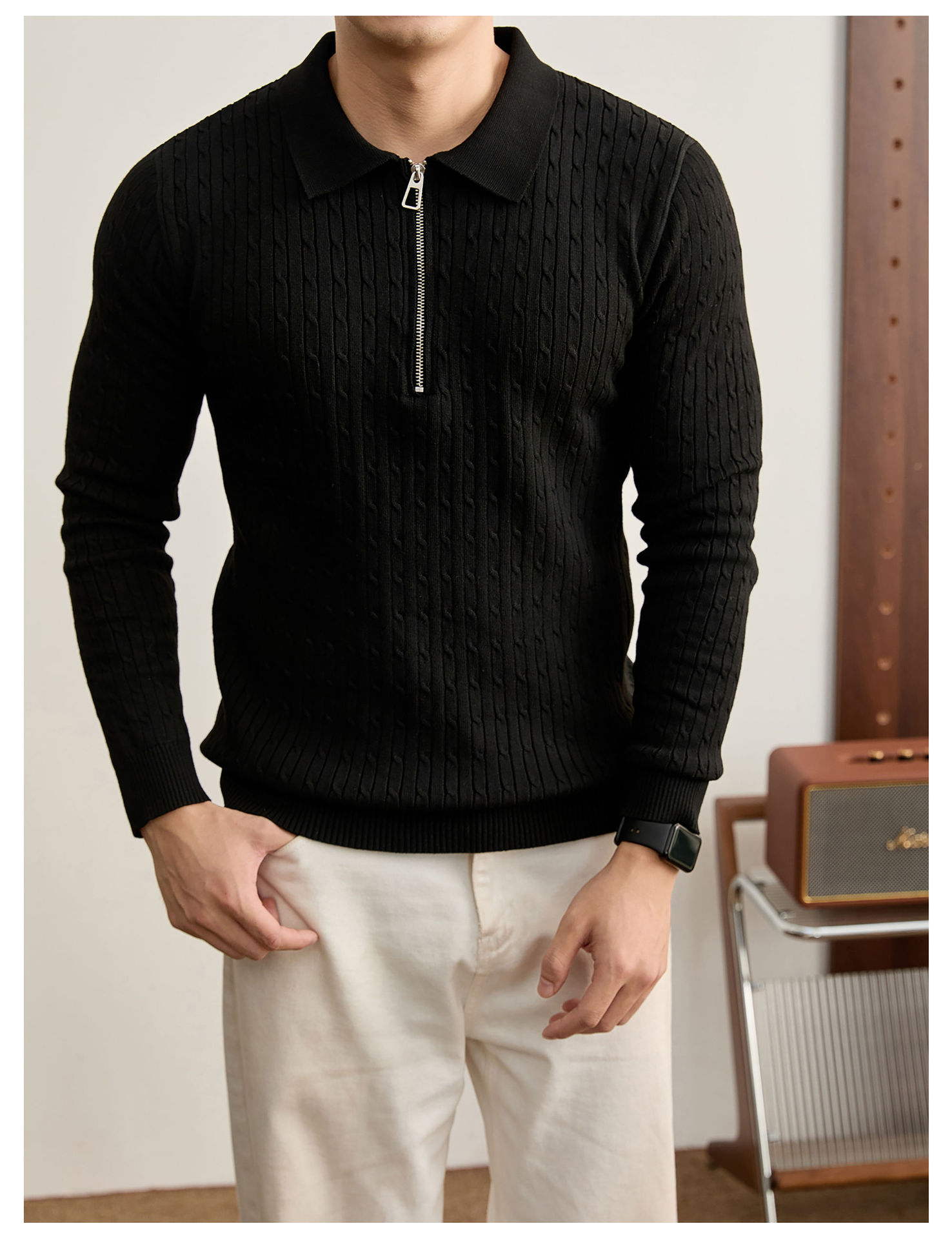 老錢風編織提花紋理長袖毛衣男秋冬修身半拉鍊POLO領針織衫