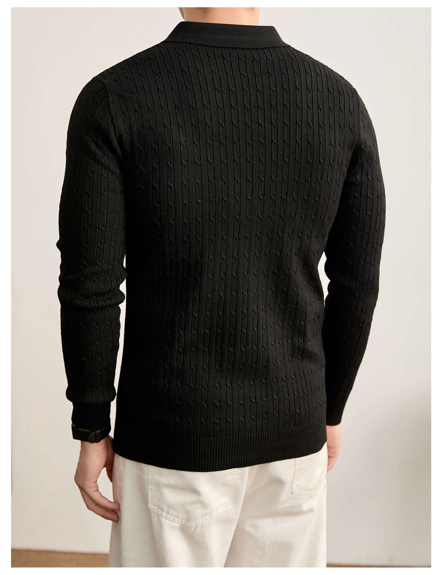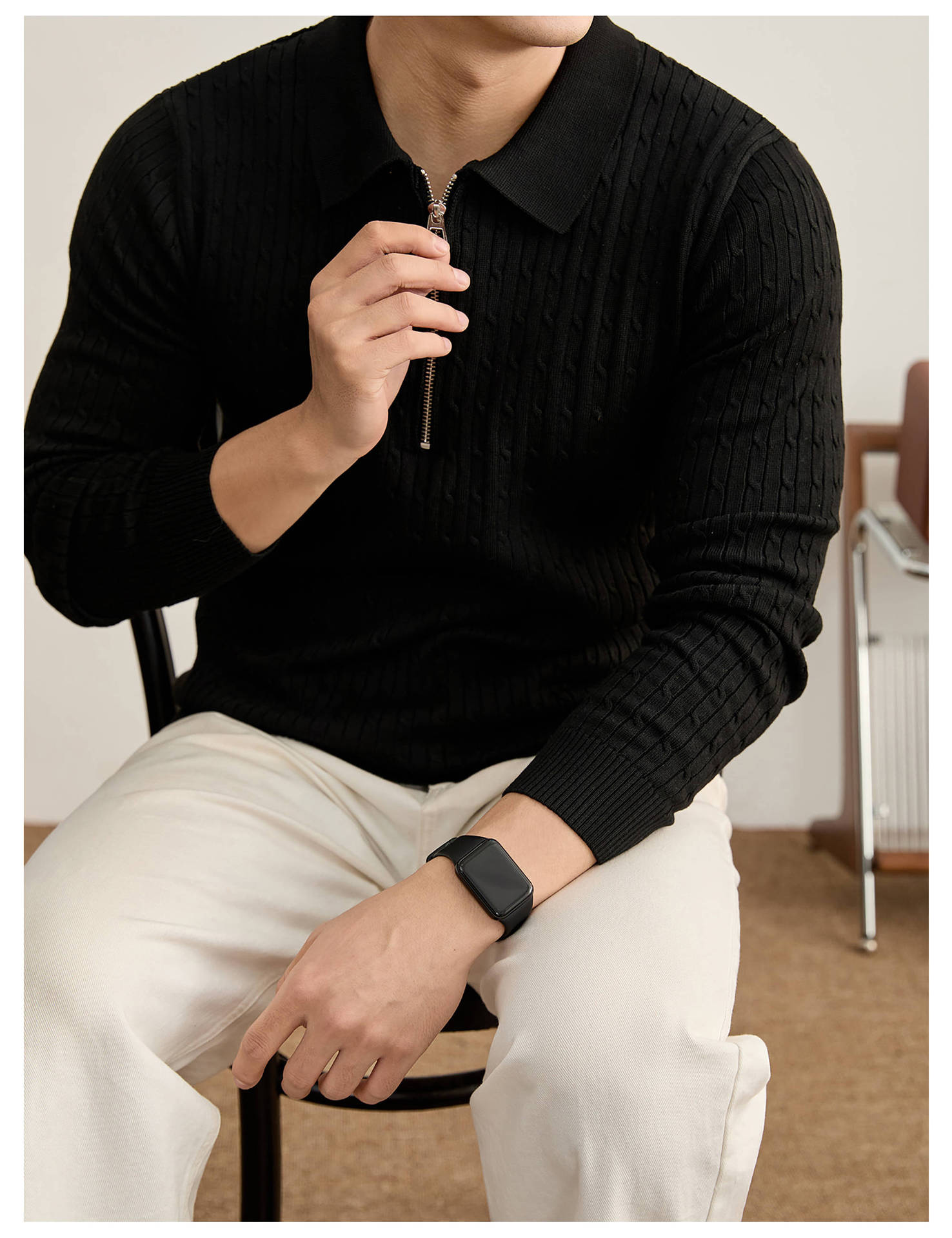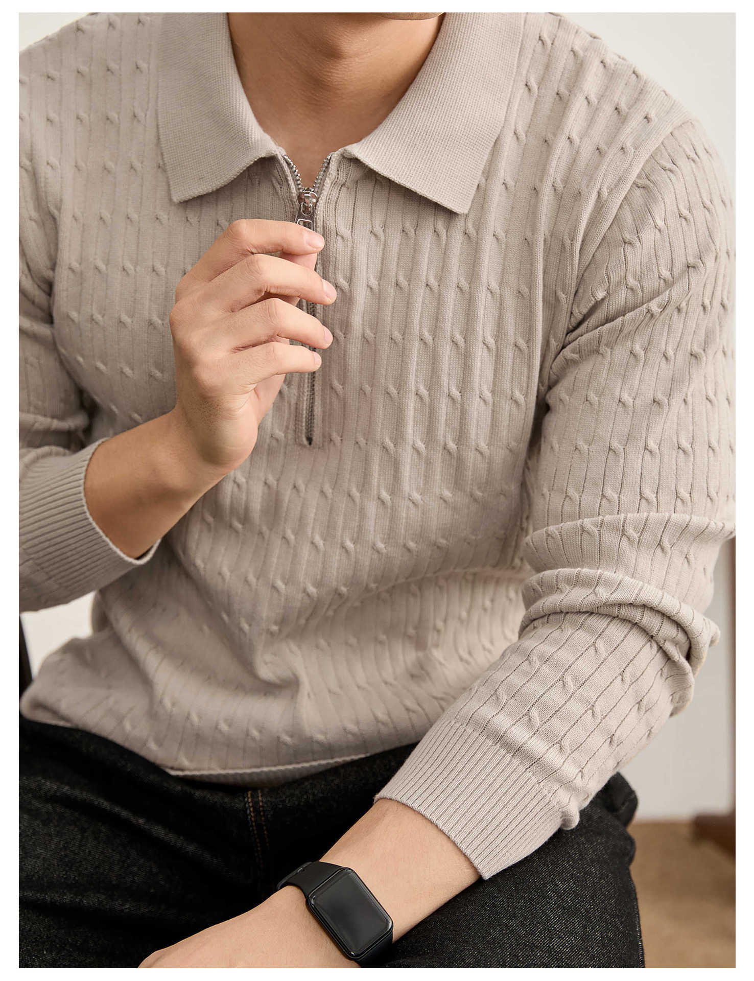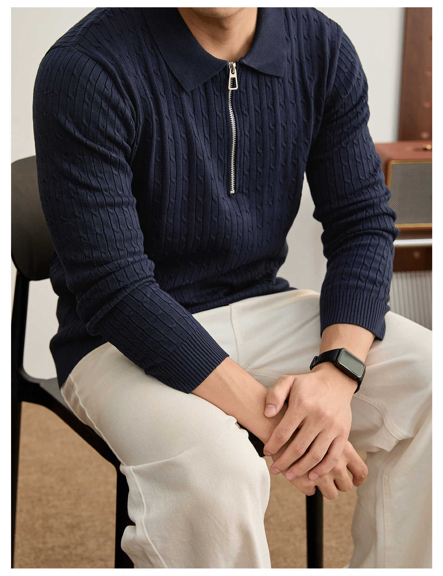 老錢風編織提花紋理長袖毛衣男秋冬修身半拉鍊POLO領針織衫