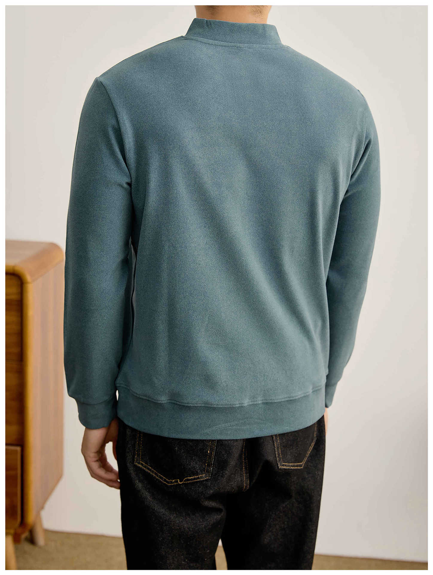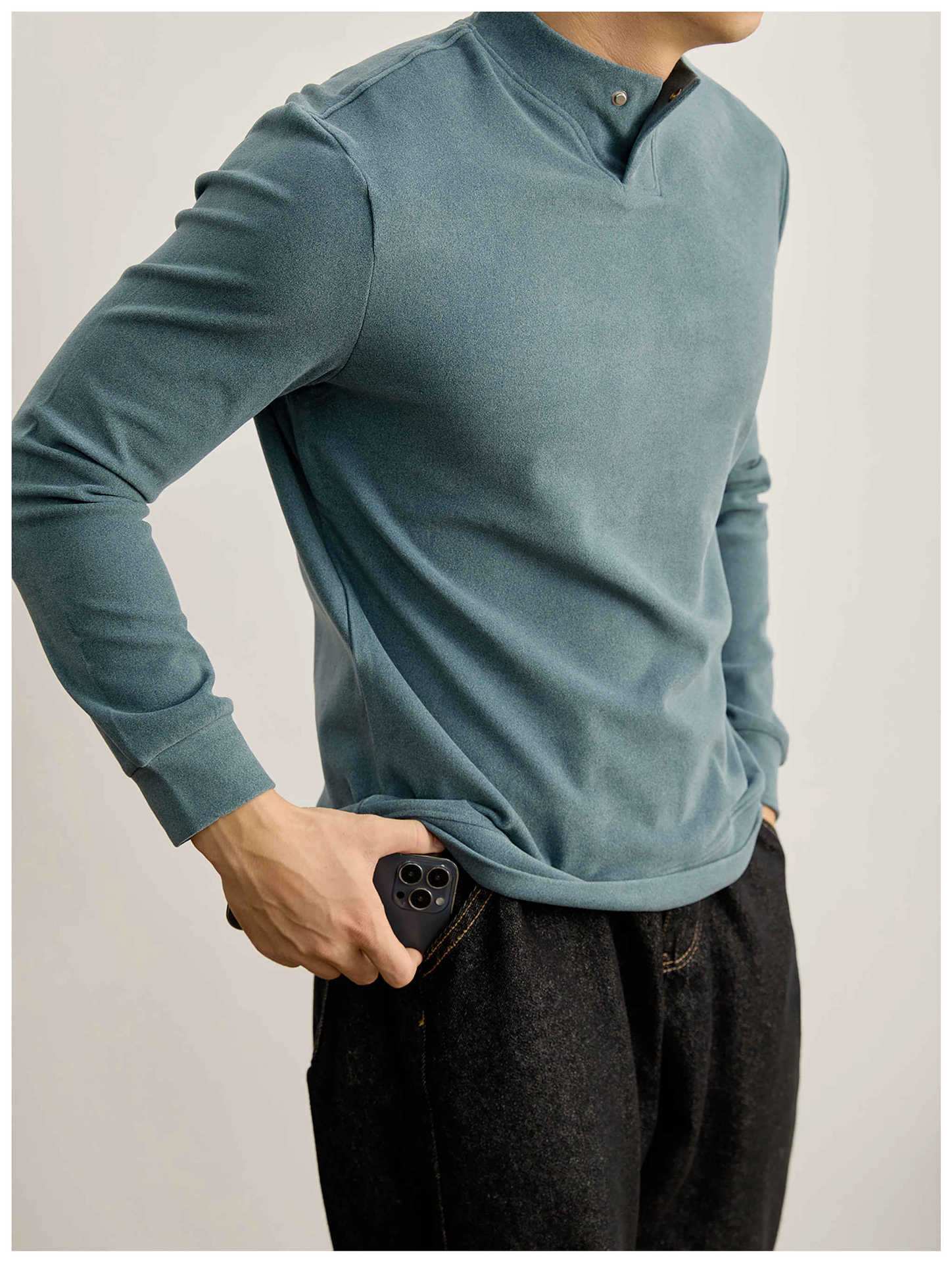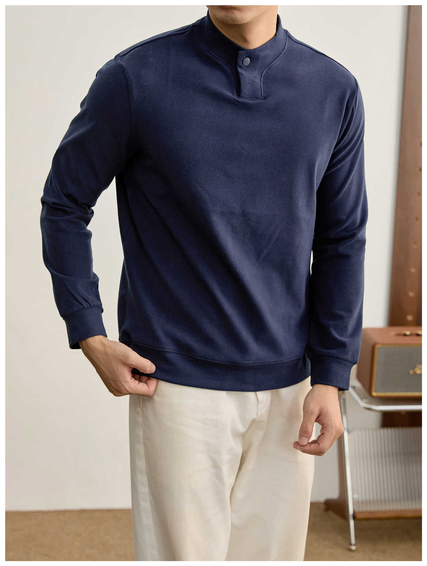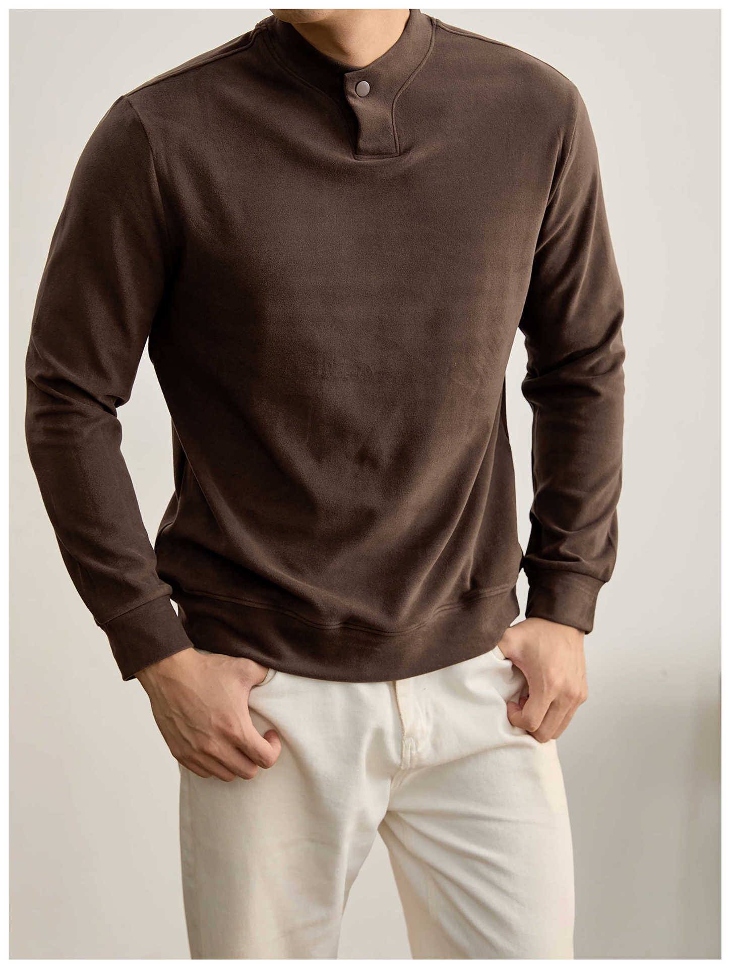 莫蘭迪色系冬季保暖德絨打底衫衛衣復古風一粒扣中領上衣男