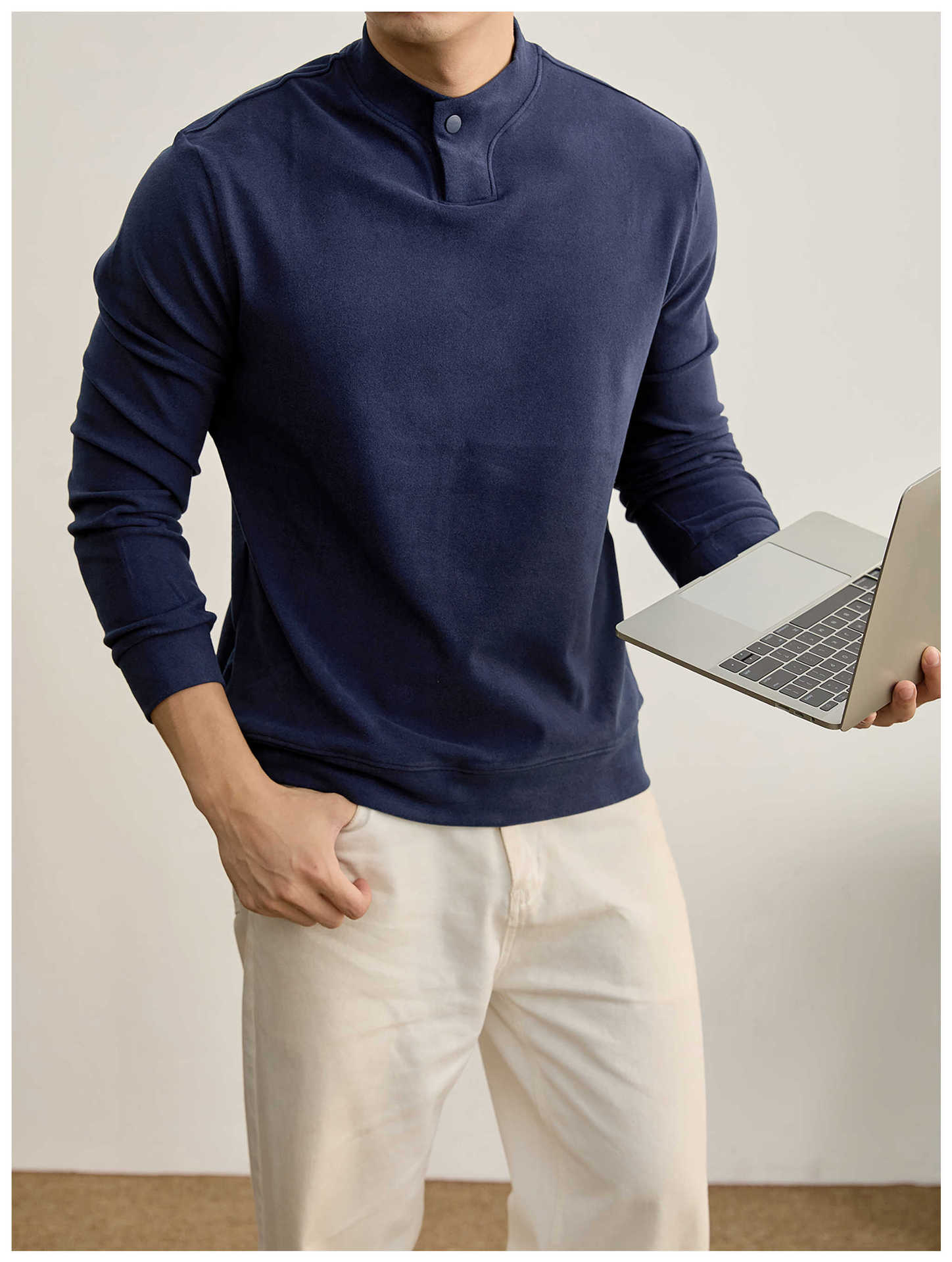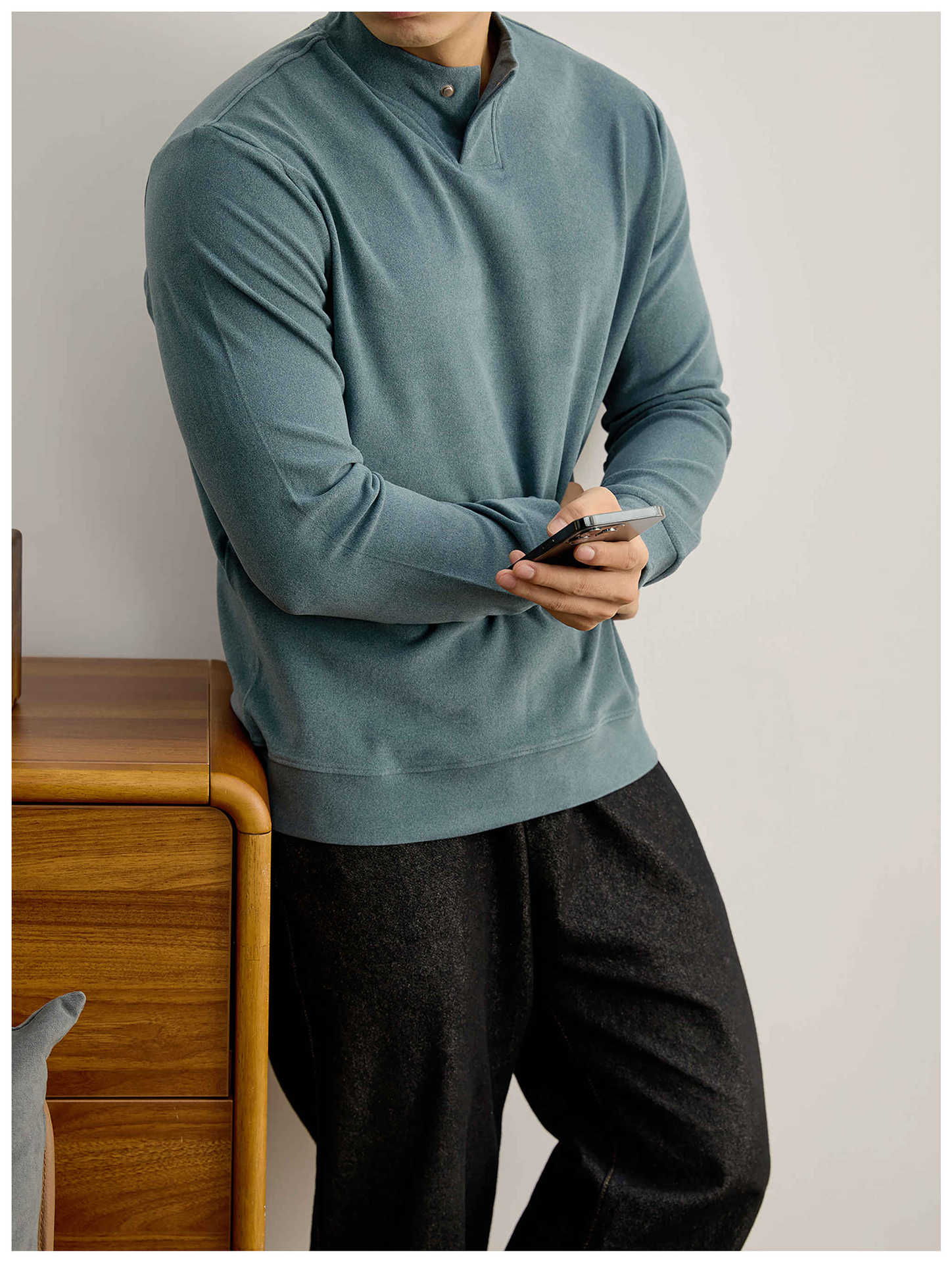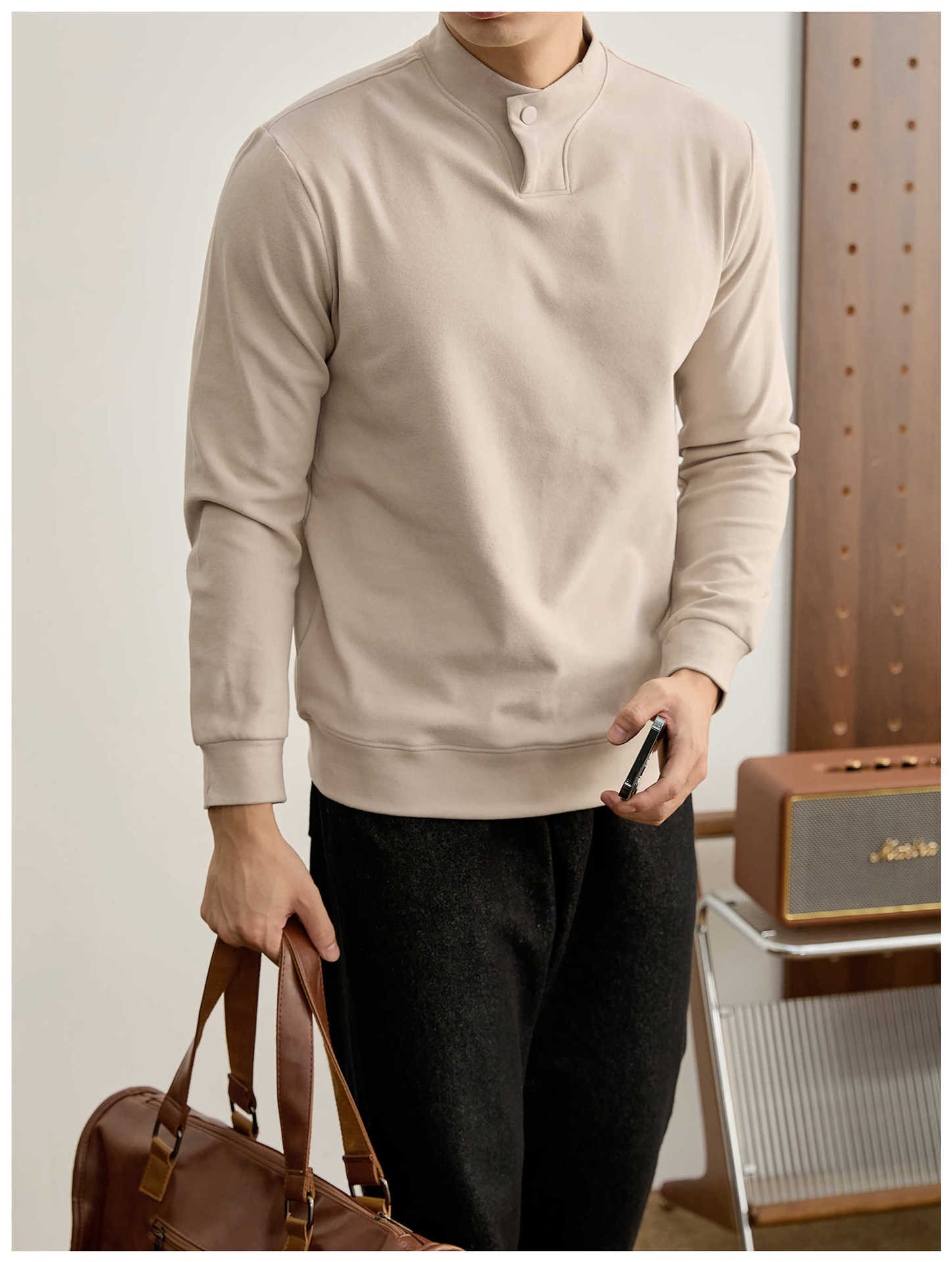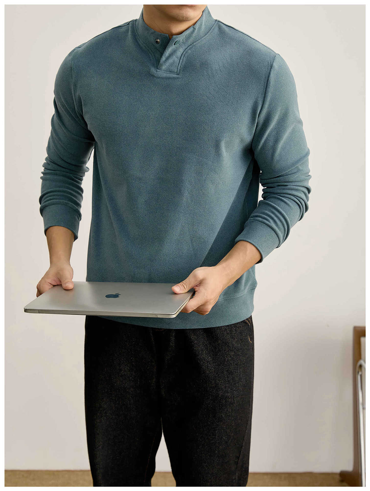 莫蘭迪色系冬季保暖德絨打底衫衛衣復古風一粒扣中領上衣男