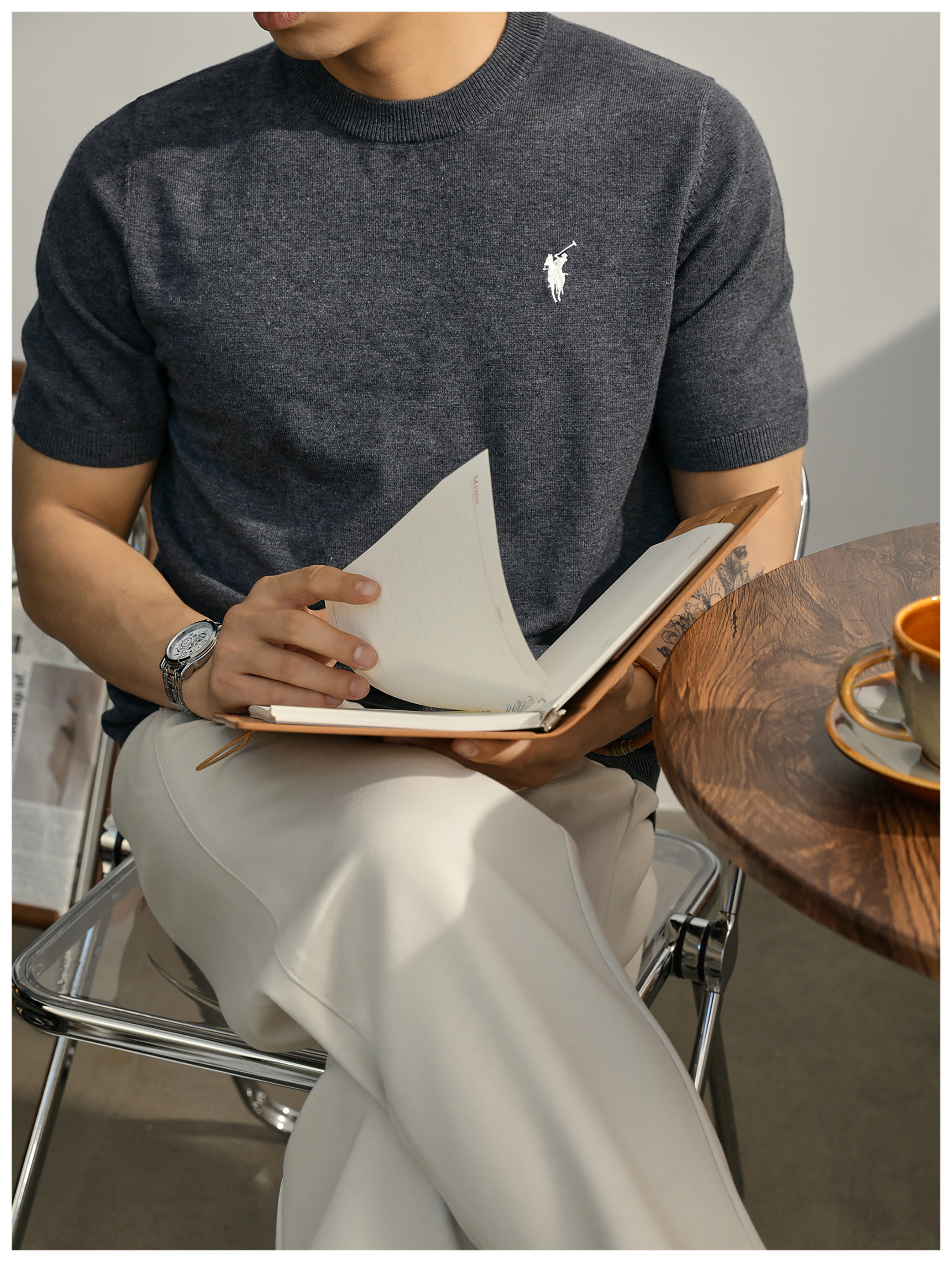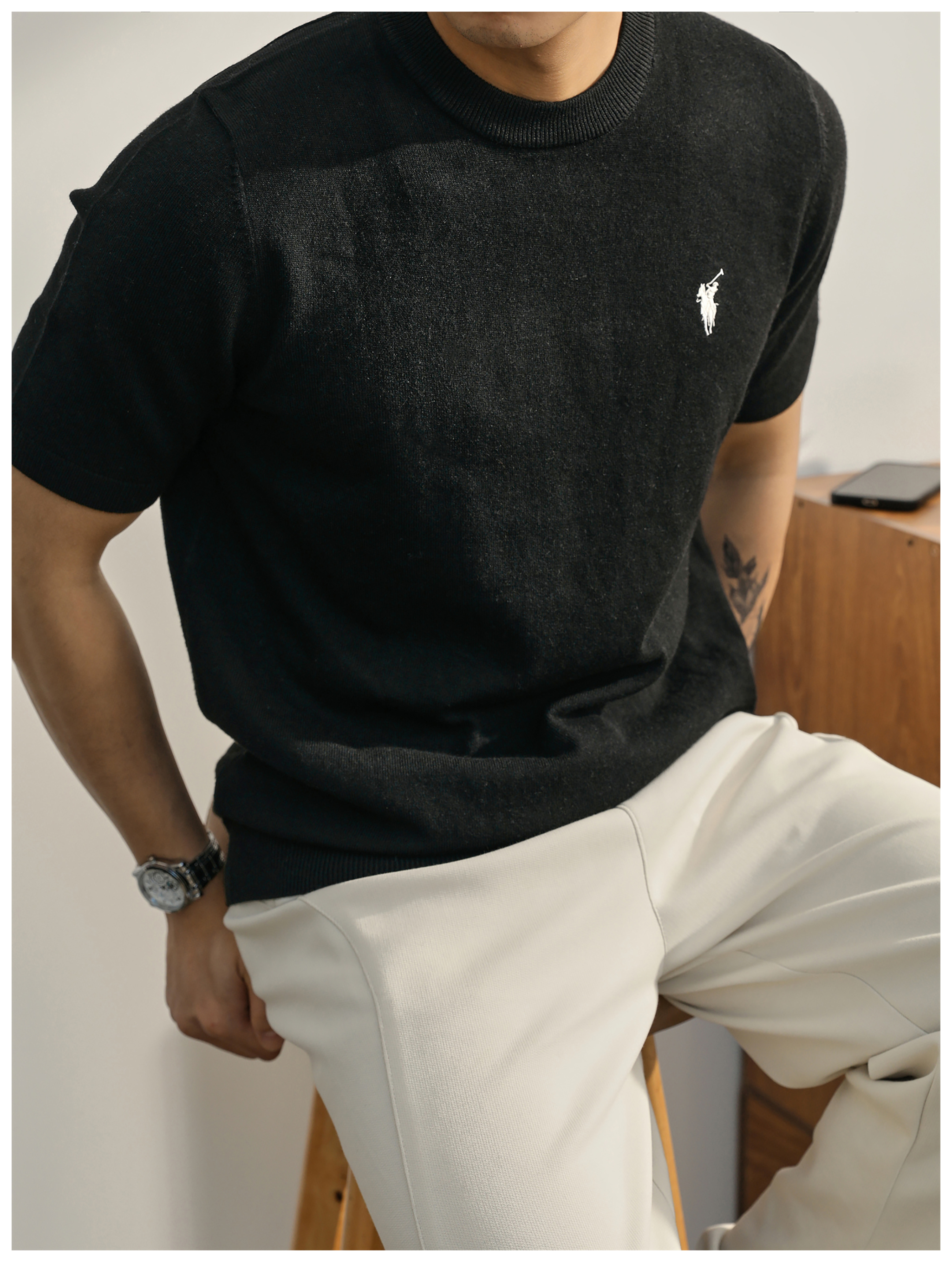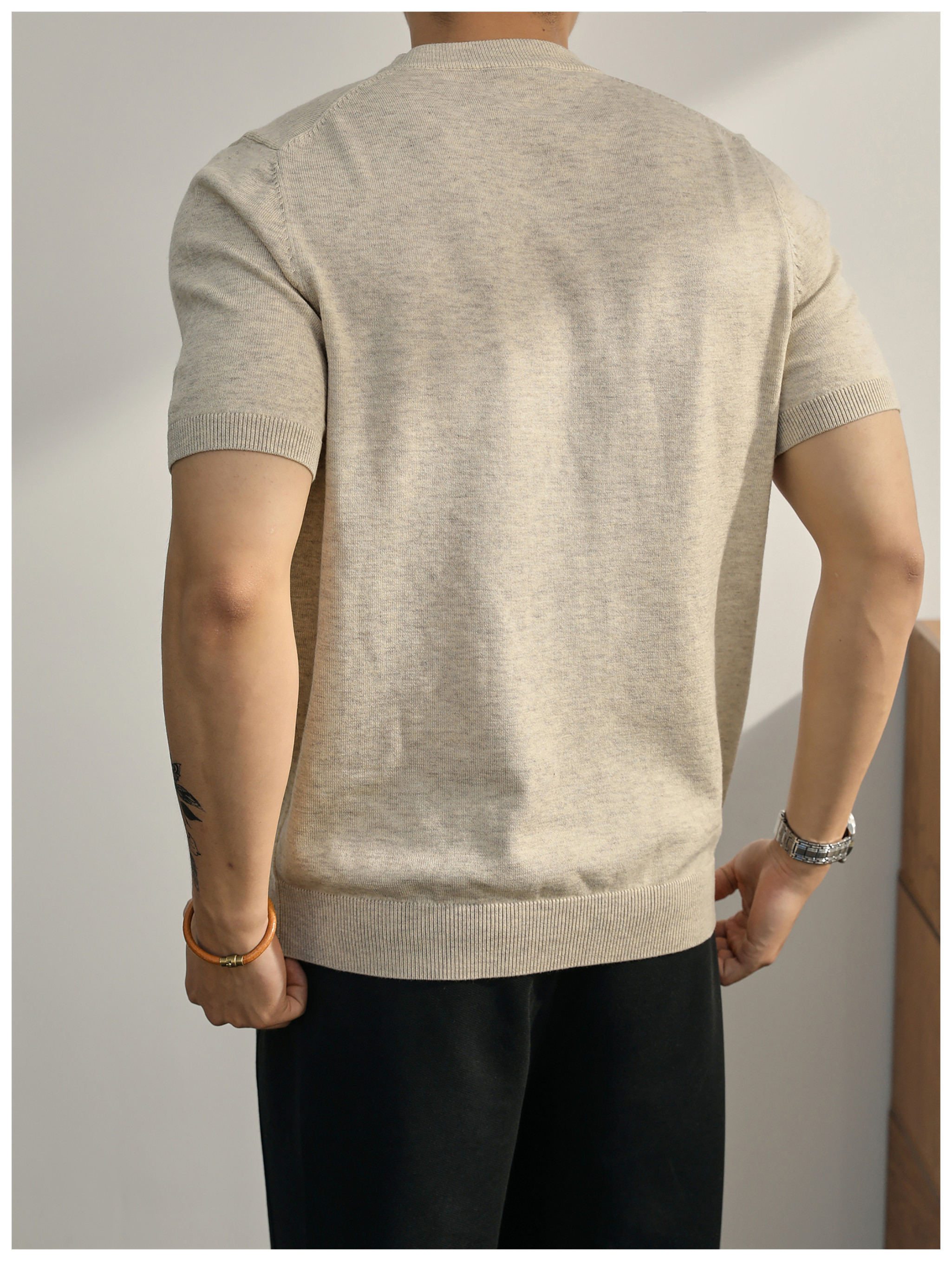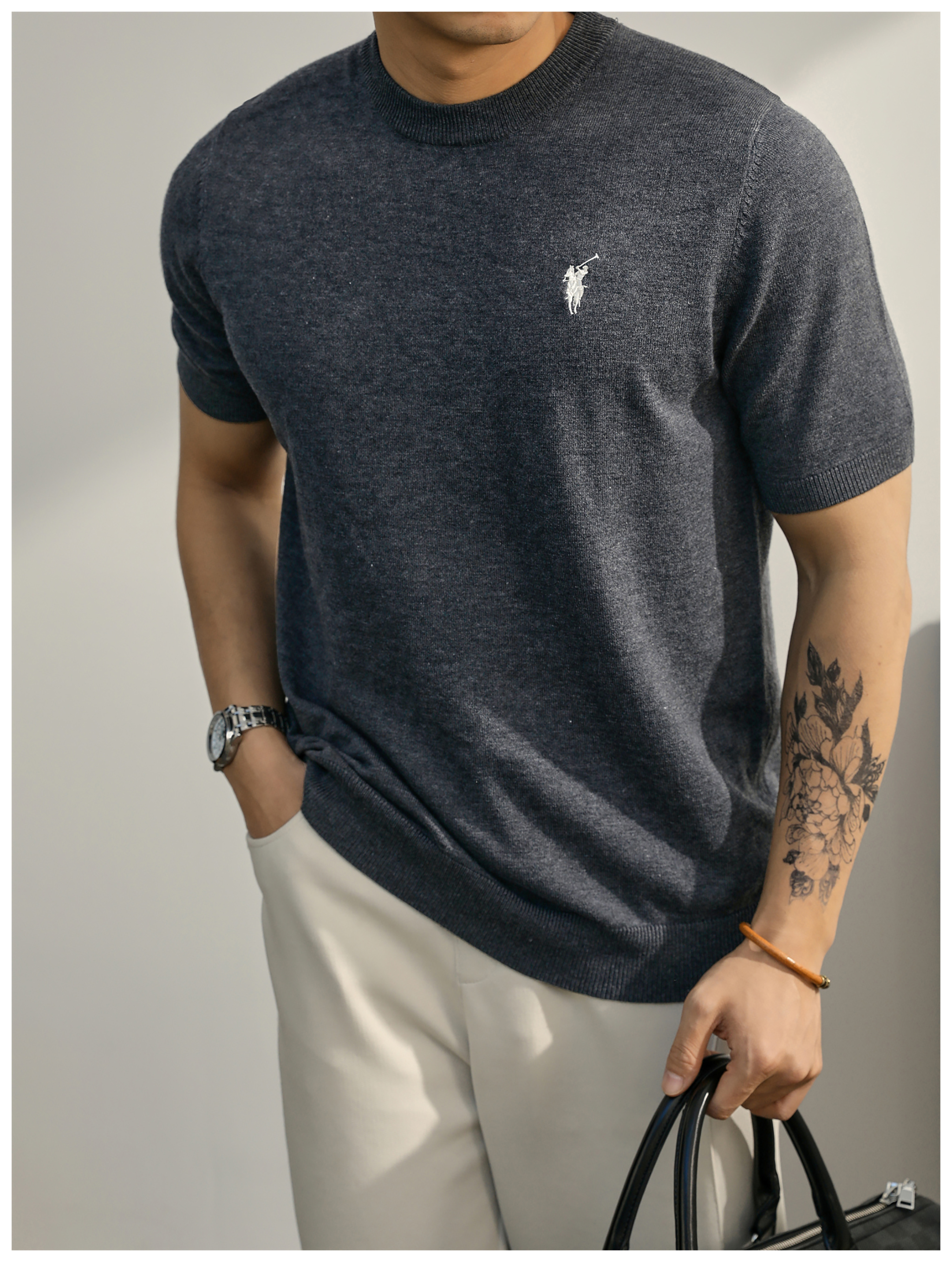 親膚柔順羊毛針織T恤男款都市通勤休閒短袖騎士刺繡圓領體恤