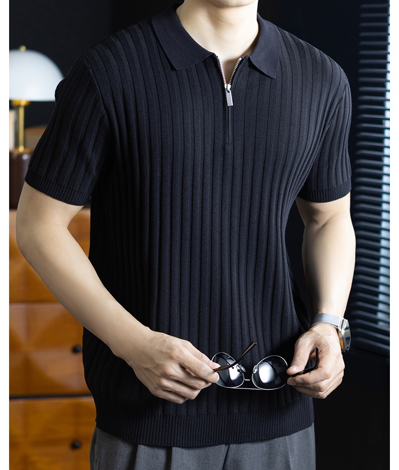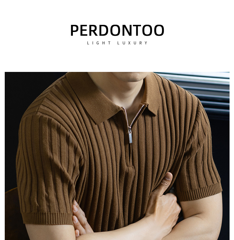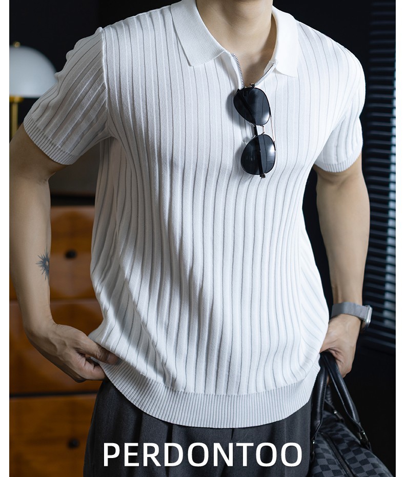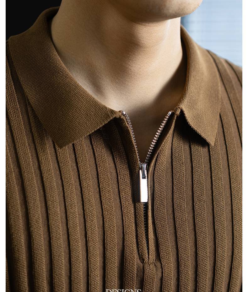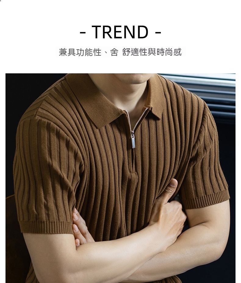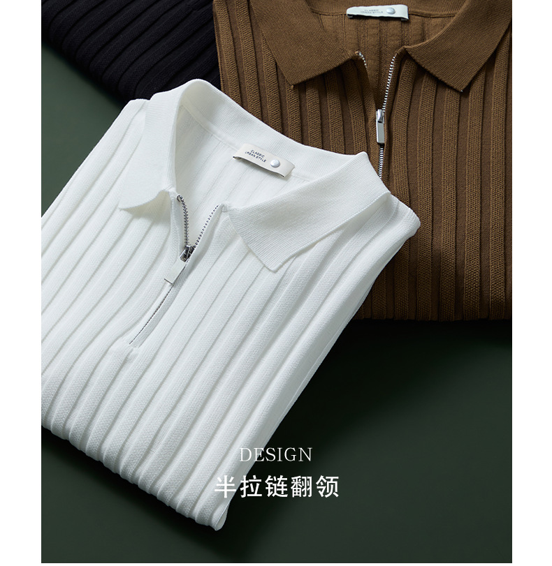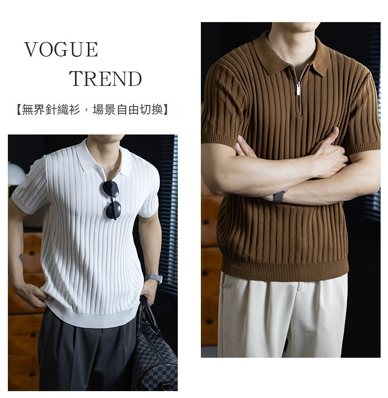 輕奢風~2026夏季新款立體坑條針織衫男半拉鍊翻領短袖t桖儒雅高級
