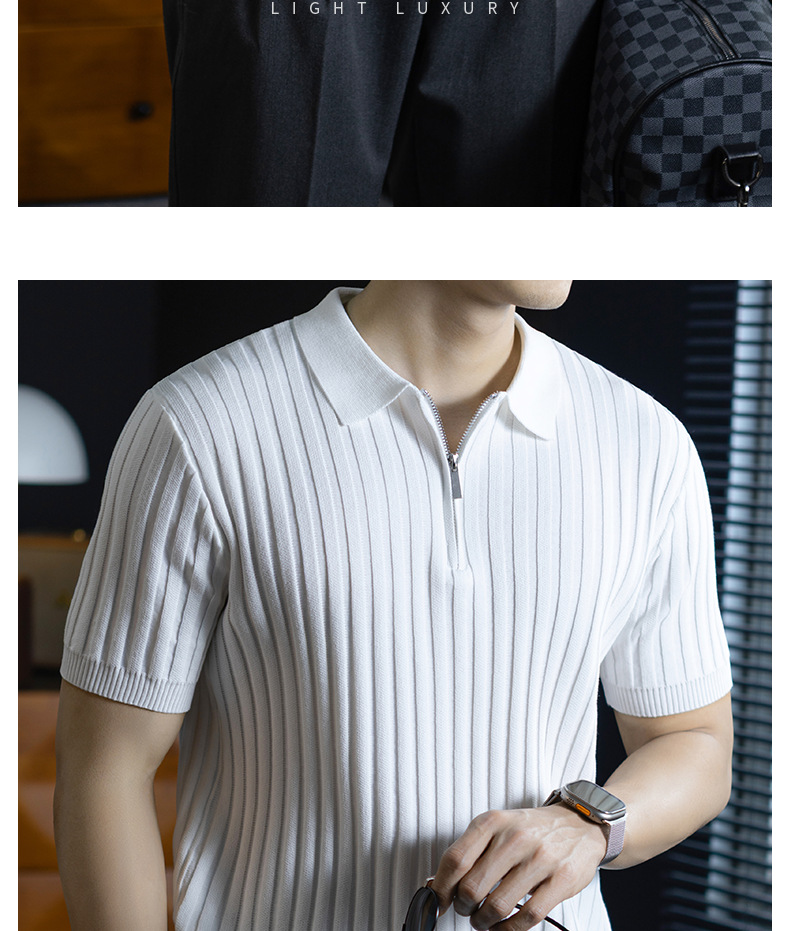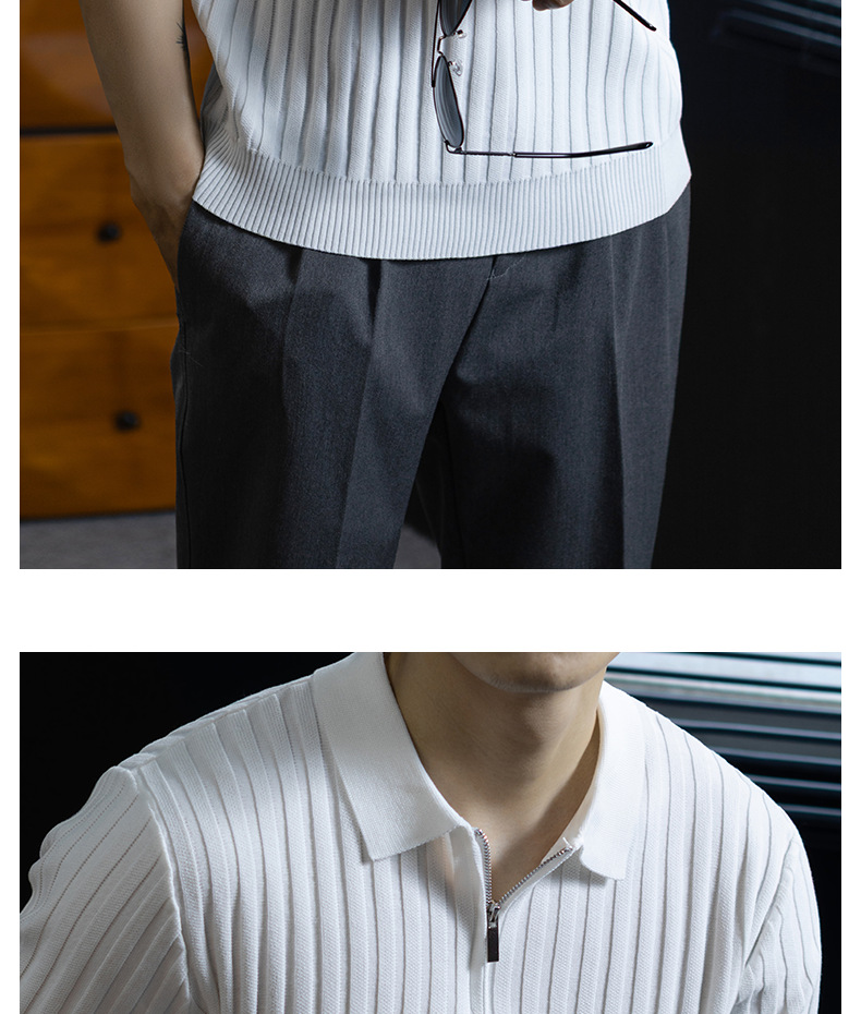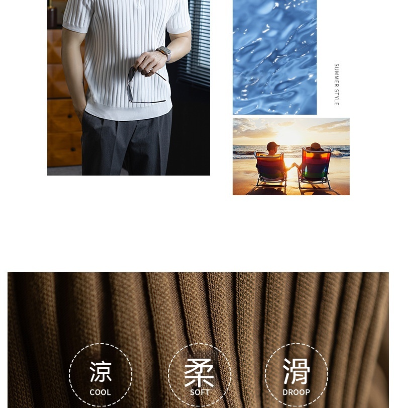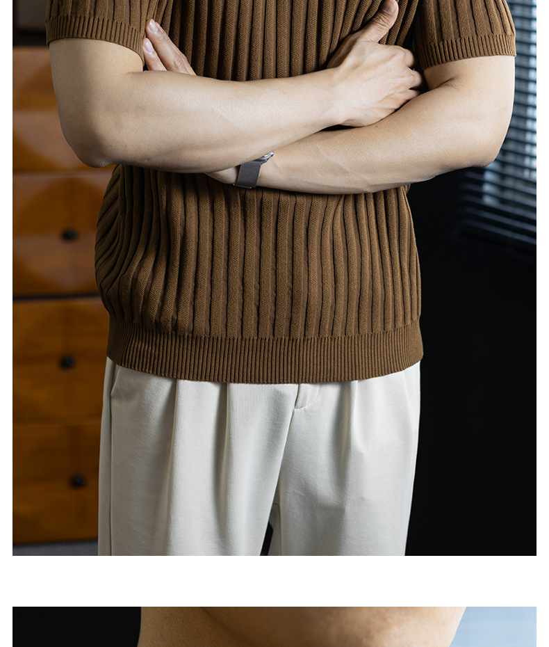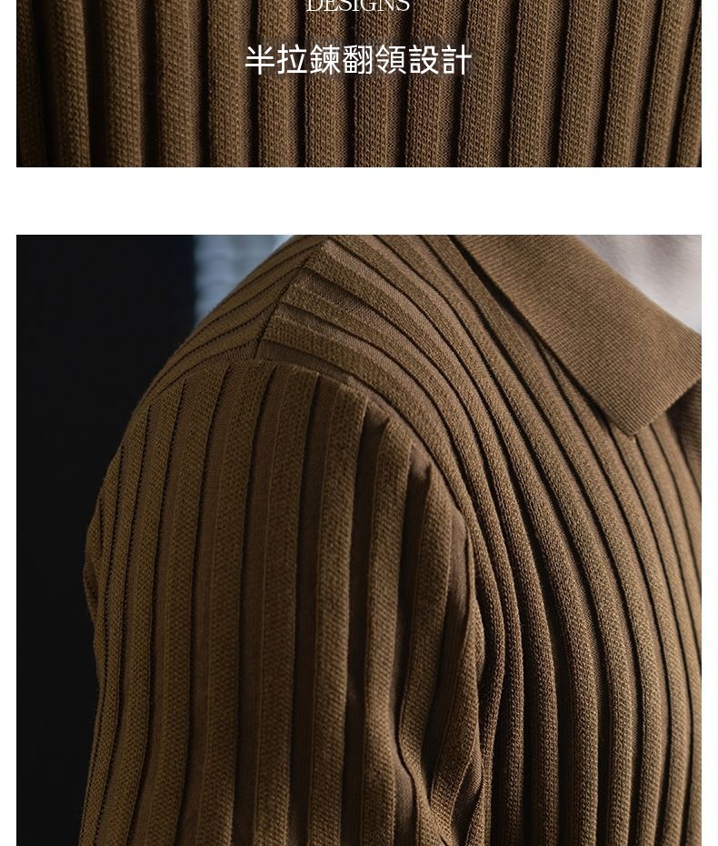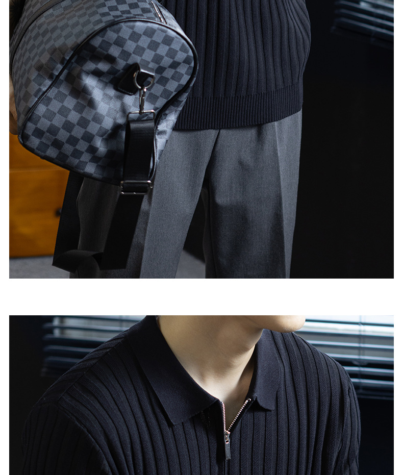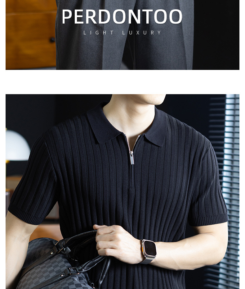 輕奢風~2026夏季新款立體坑條針織衫男半拉鍊翻領短袖t桖儒雅高級