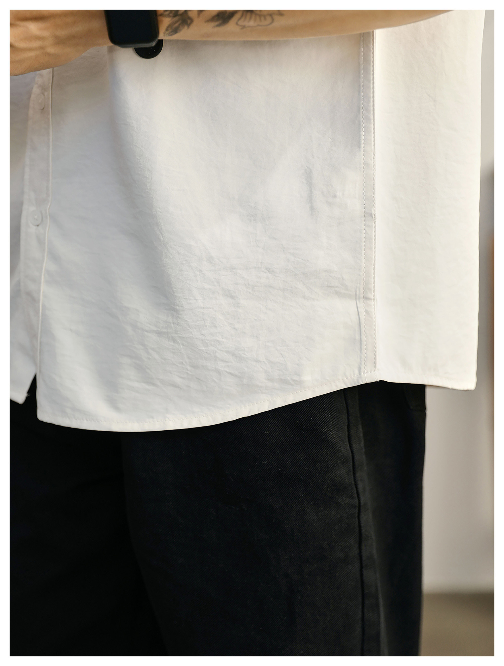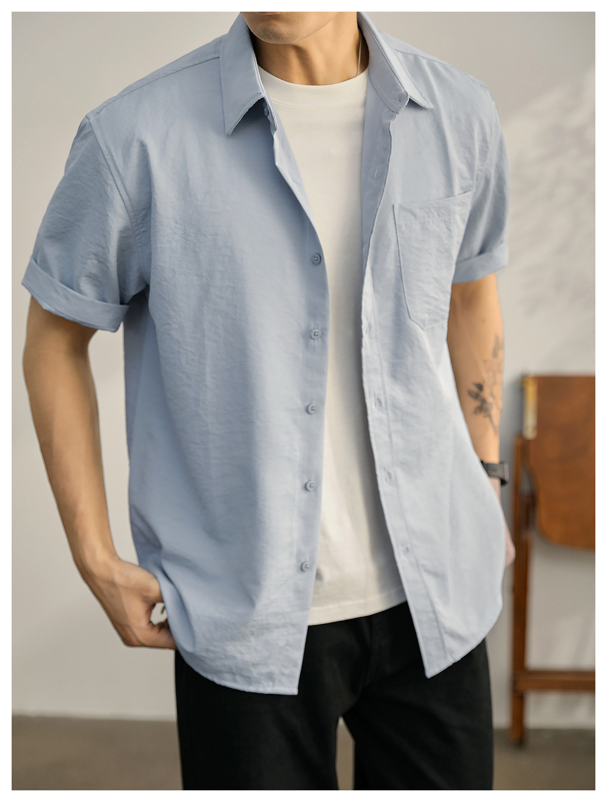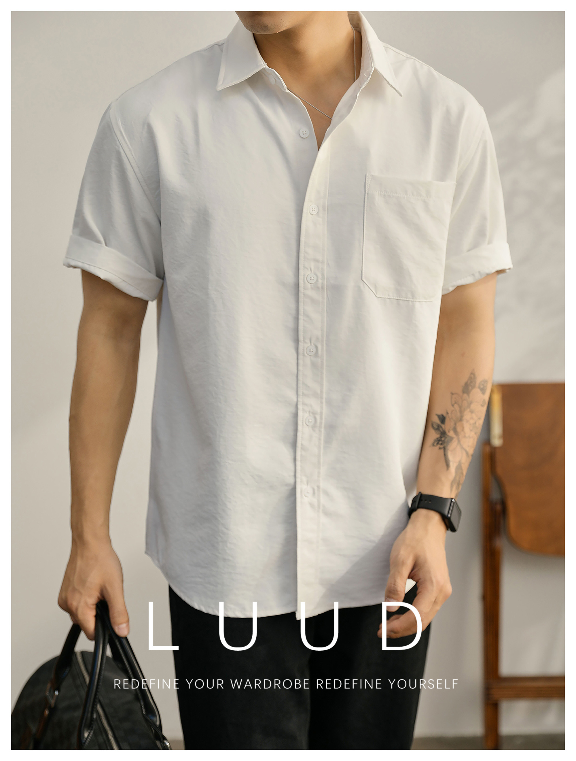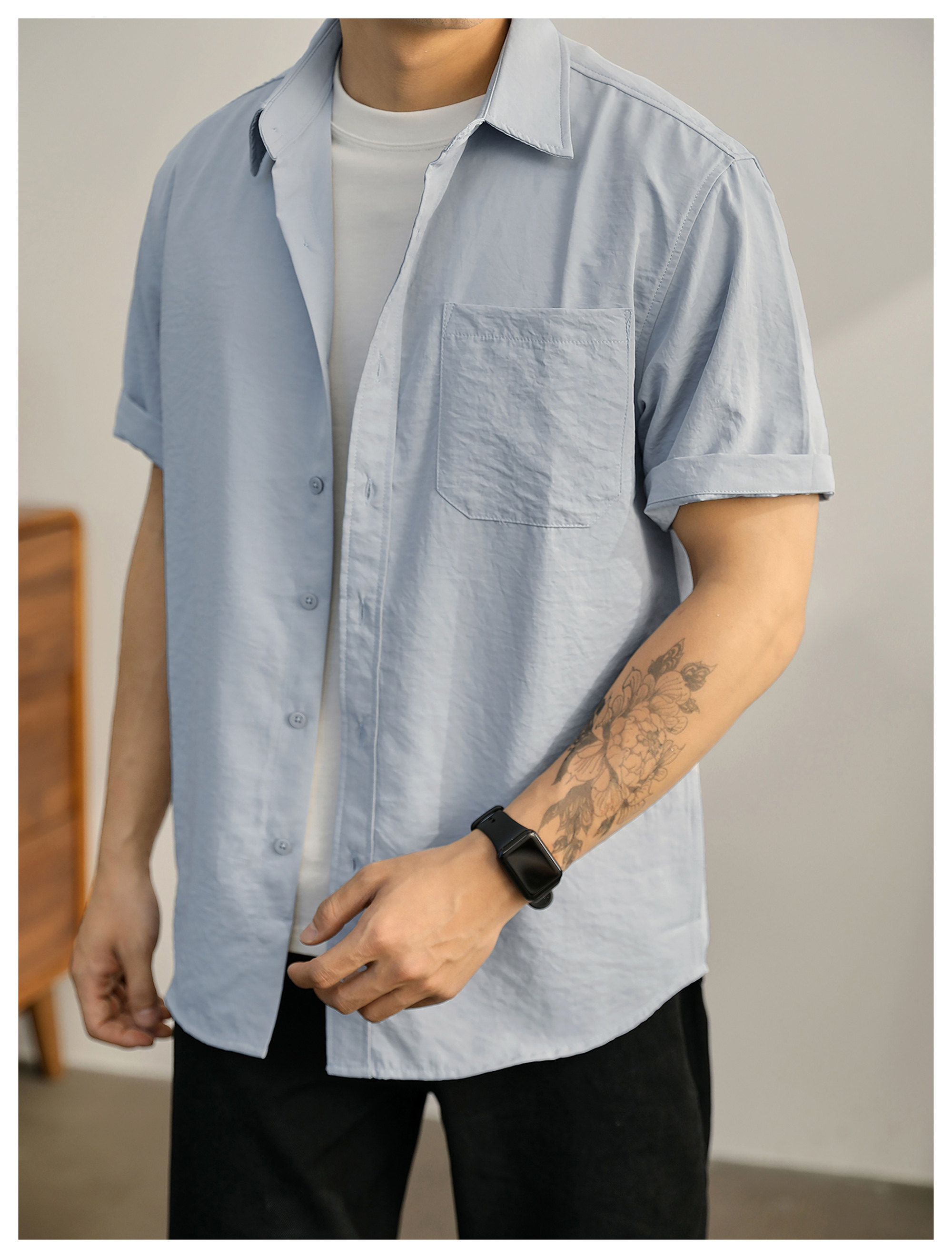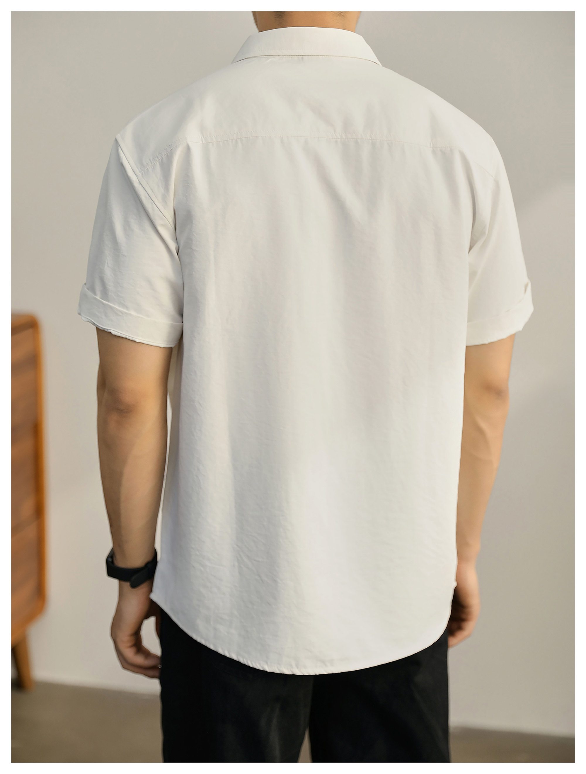 都市休闲感白色净版短袖衬衣男士夏季胸口贴袋圆弧下摆衬衫